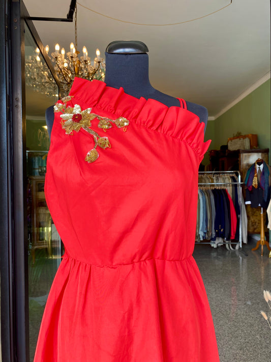 Abito anni ’80 in taffetà rosso – Monospalla con ricamo gioiello