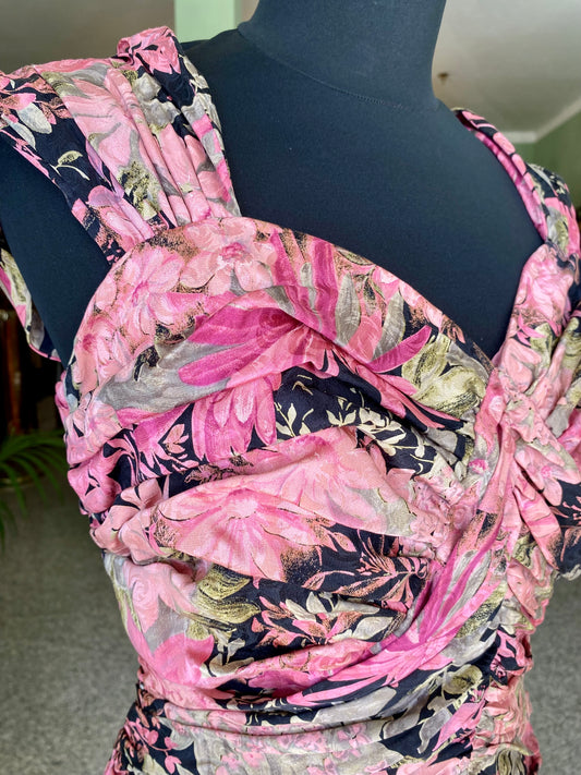 Abito sartoriale anni '80 in pura seta – drappeggio scultoreo e stampa botanica - TG. 42