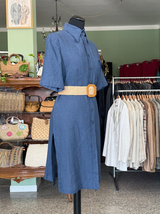 Abito camicia anni ’70 in puro lino blu denim - TG. 40 circa