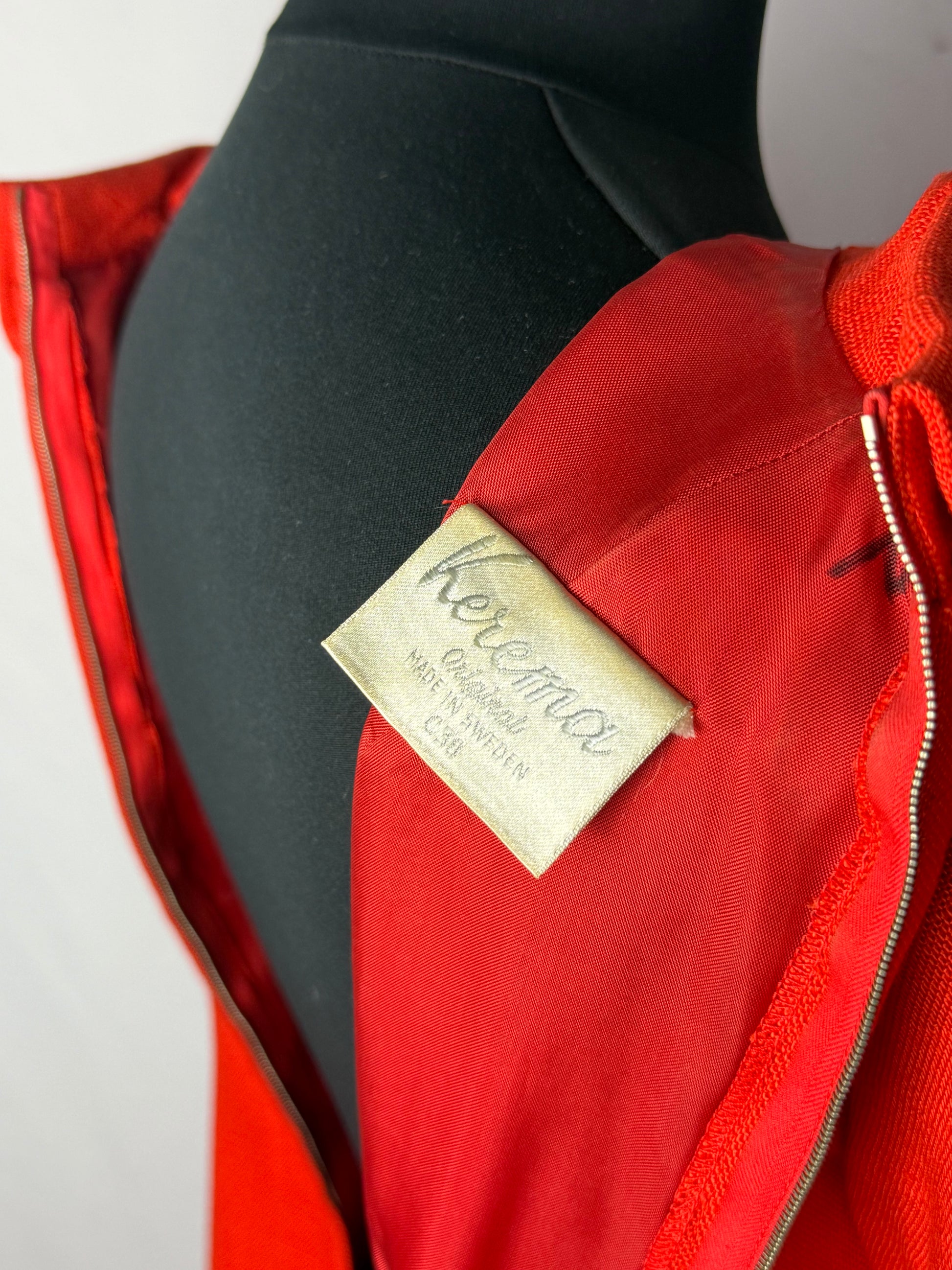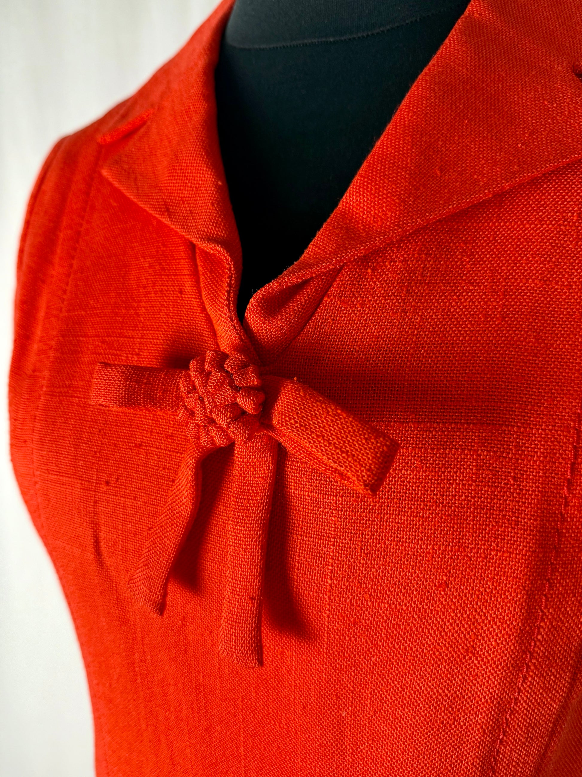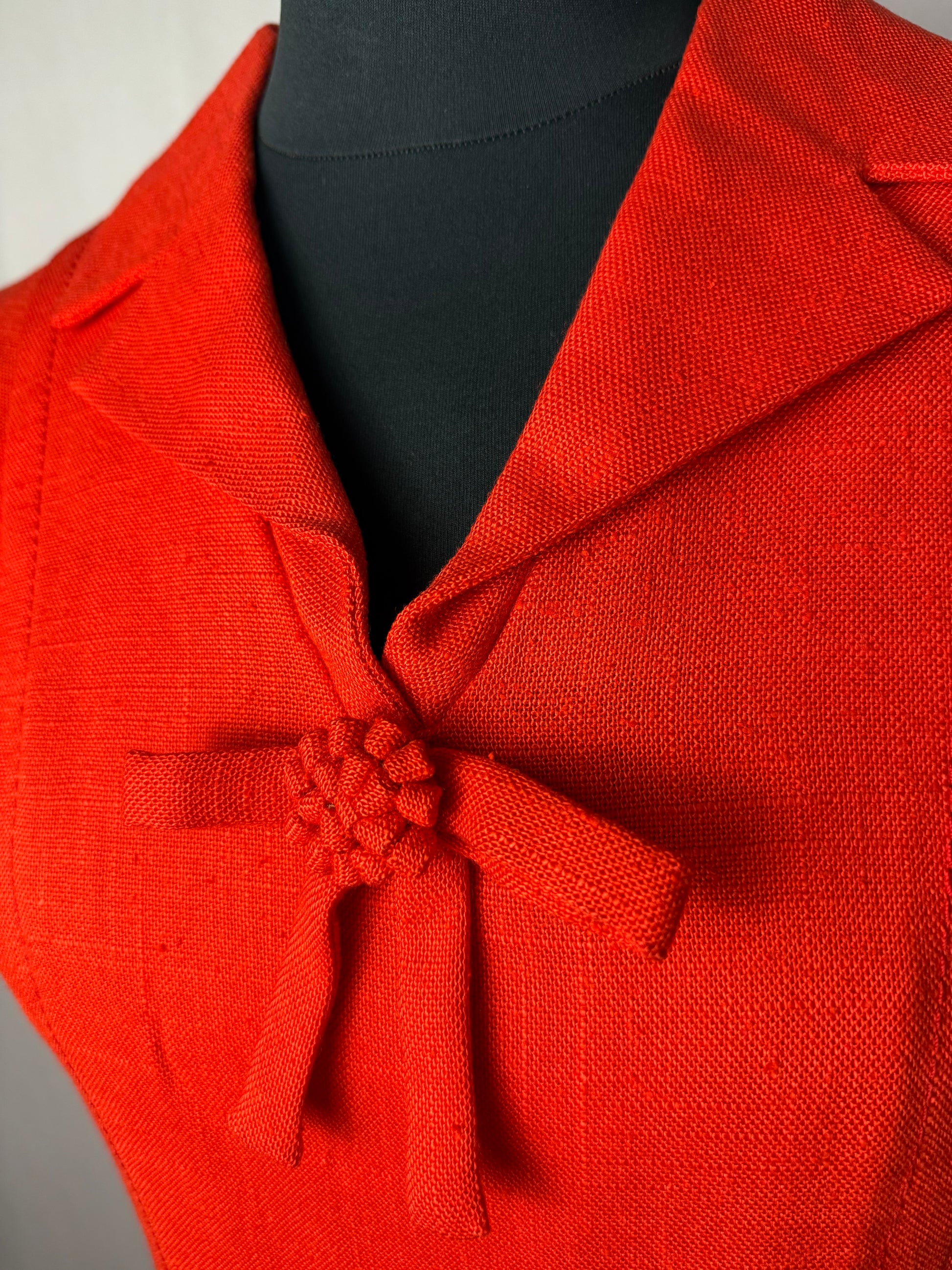 Abito anni ‘60 modello a trapezio con manica corta e colletto a revers, confezionato in tessuto strutturato color rosso scarlatto. Presenta un fiocco decorativo al centro del corpino, elemento distintivo dell’epoca, e pince verticali che scolpiscono delicatamente la figura. Lunghezza al ginocchio, costruzione lineare con cuciture ribattute e tasche laterali a filo. Lo stile minimalista e il taglio netto sono espressione del design razionale tipico del decennio