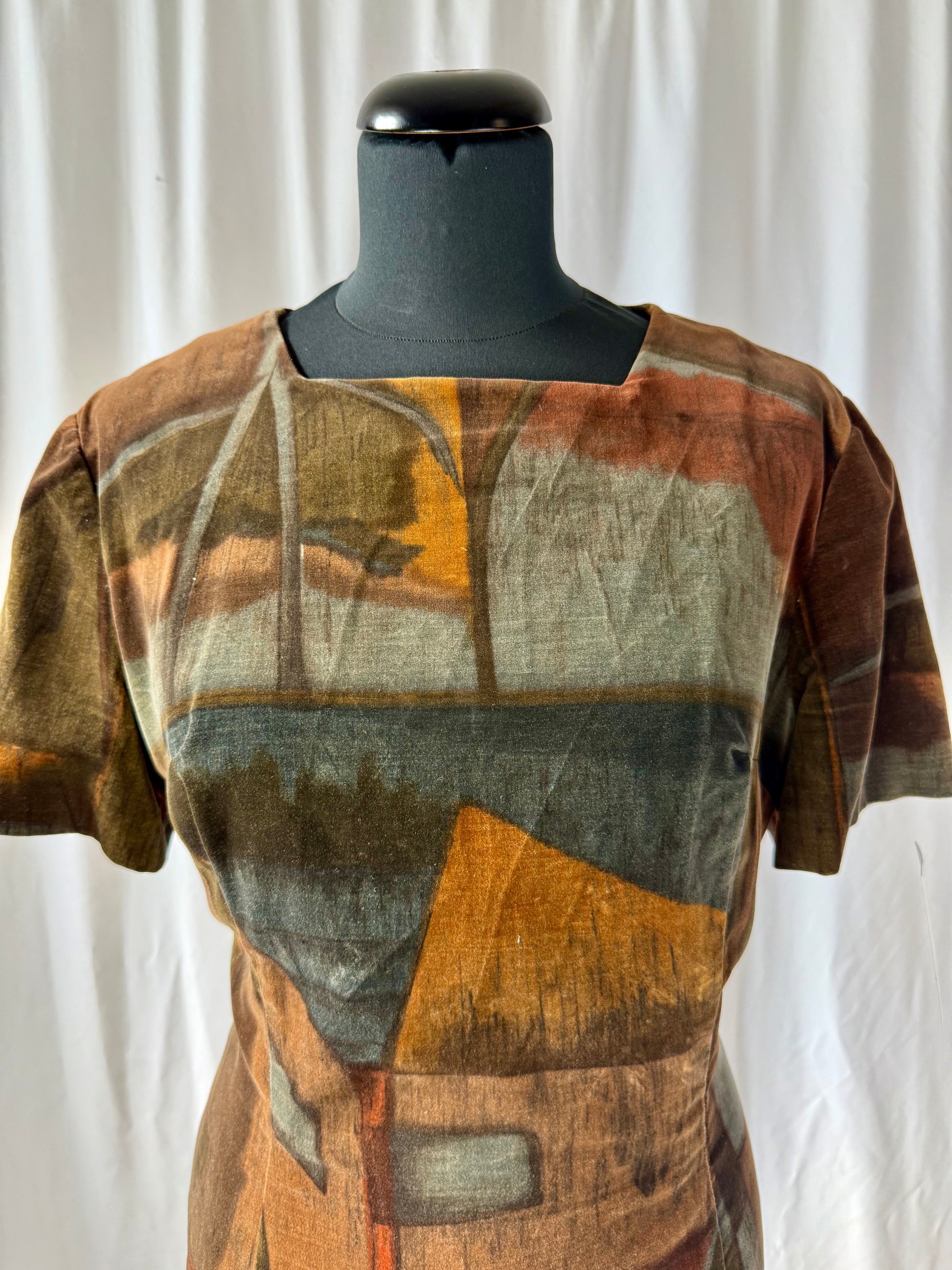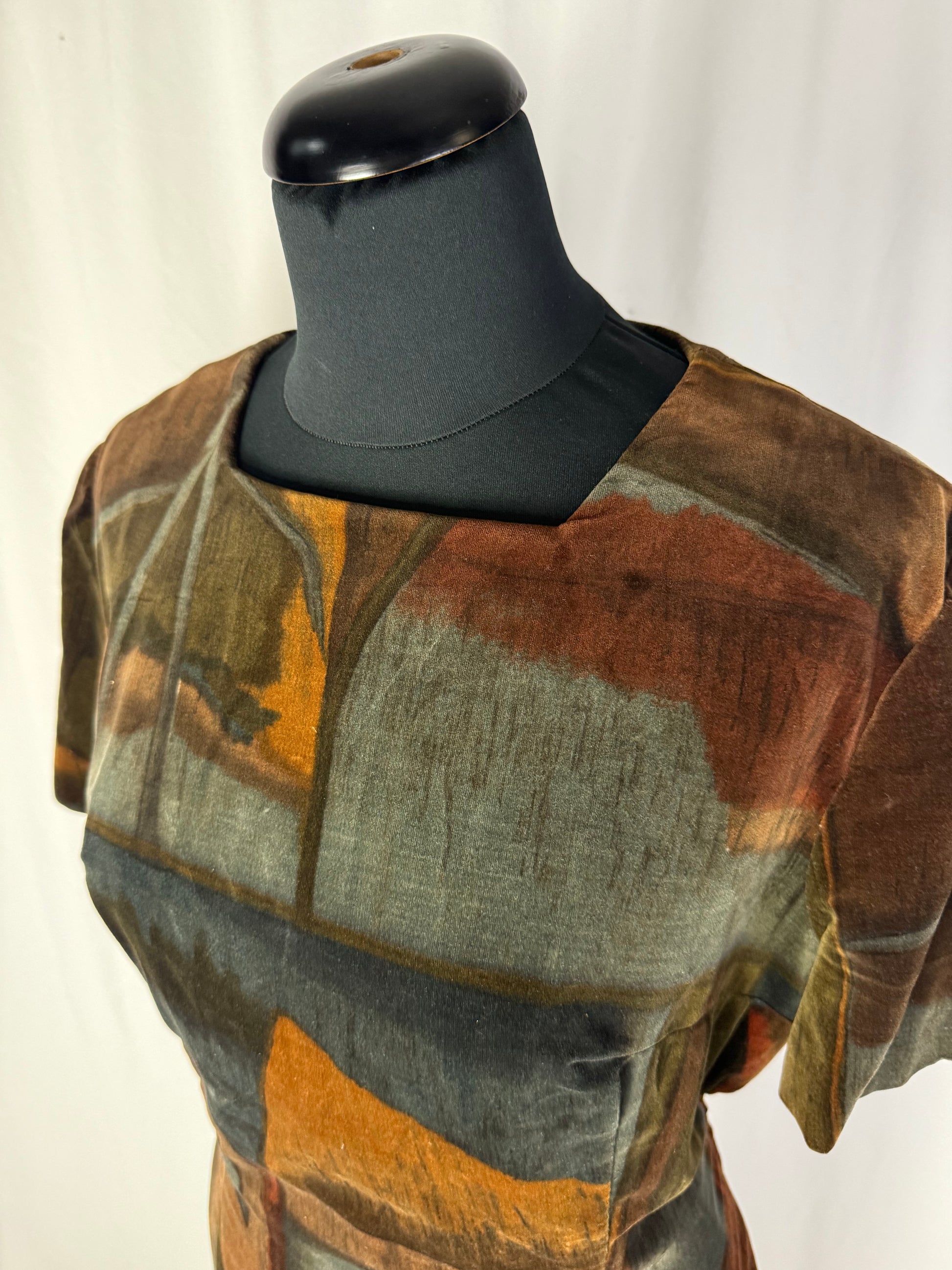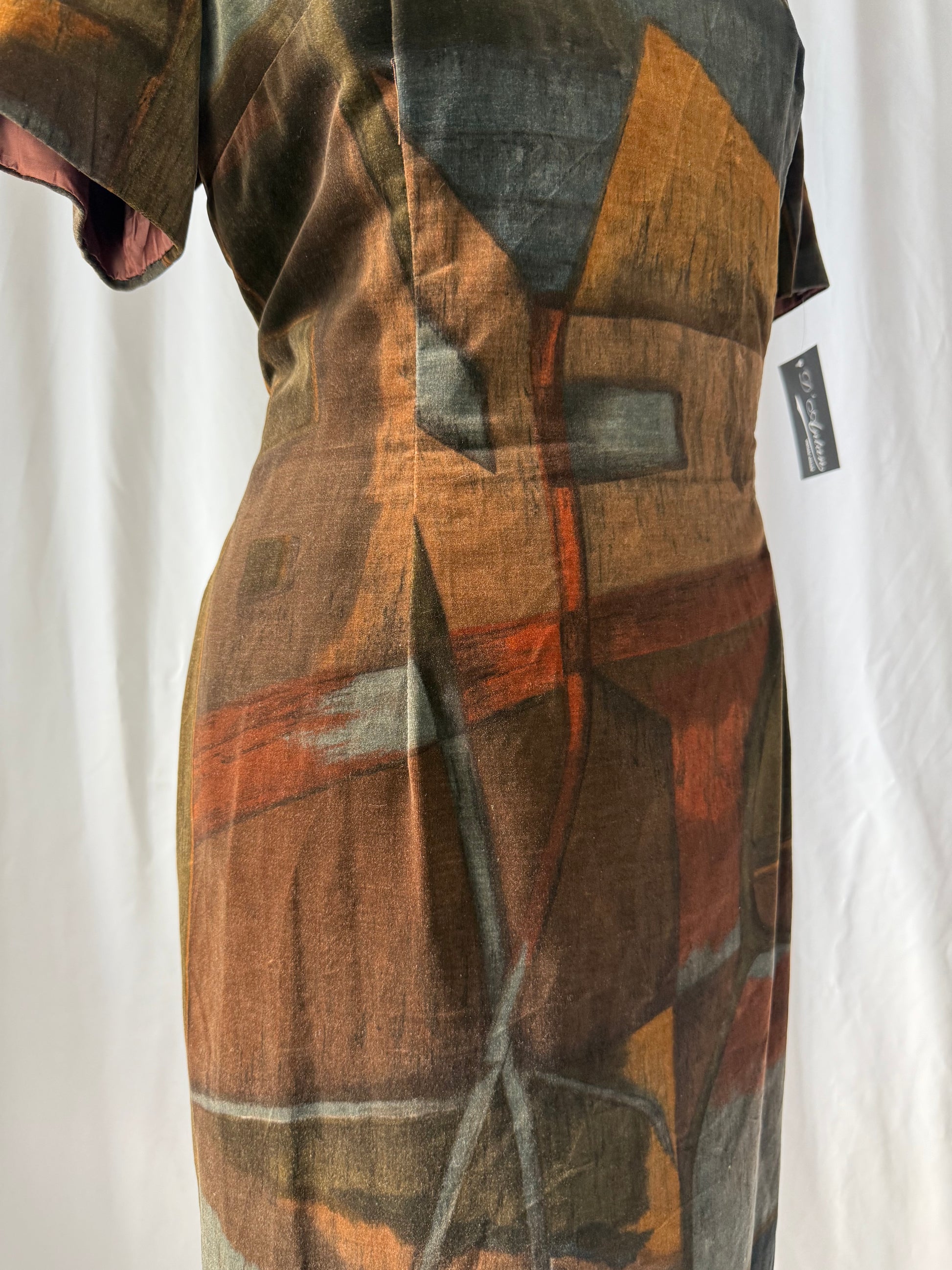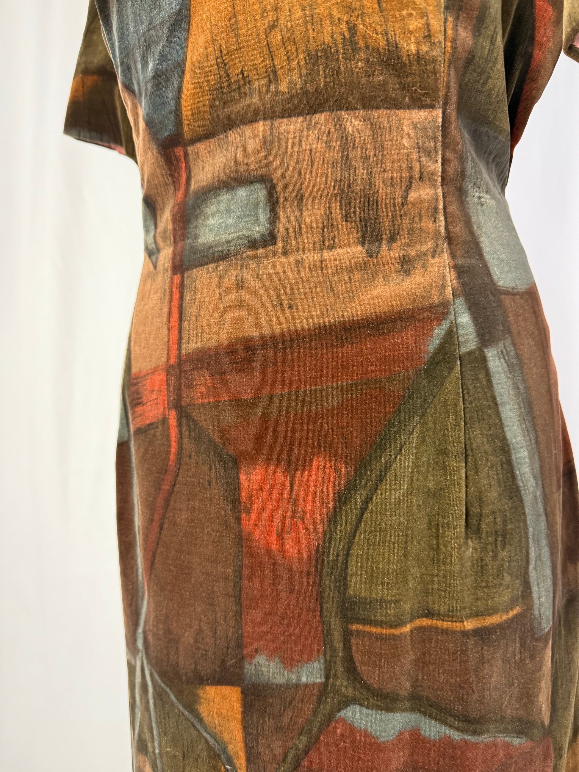 Abito sartoriale anni ‘60 in velluto con stampa geometrica astratta nei toni caldi dell’arancio, marrone e verde scuro. Linea tubino, maniche corte e girocollo semplice. Un capo altamente sofisticato che fascia la silhouette morbidamente con femminilità. Espressione del gusto artistico e sperimentale della moda anni ’60.