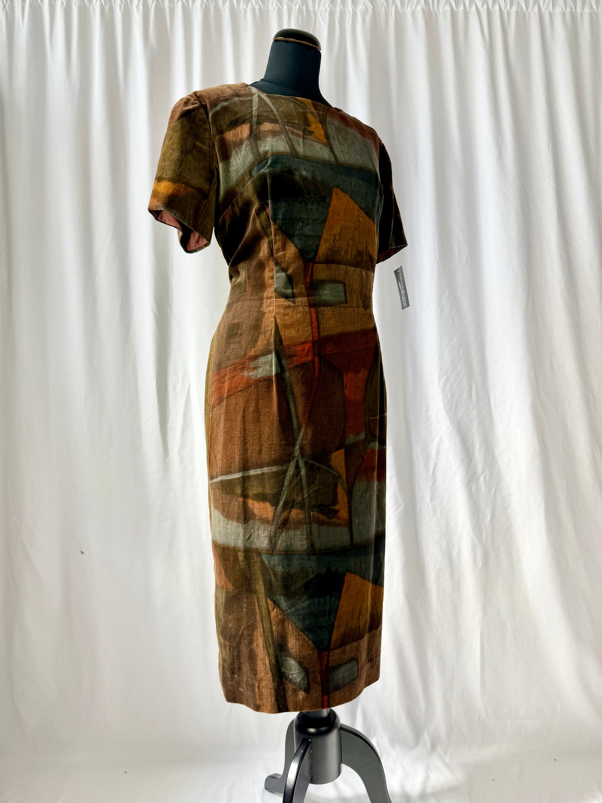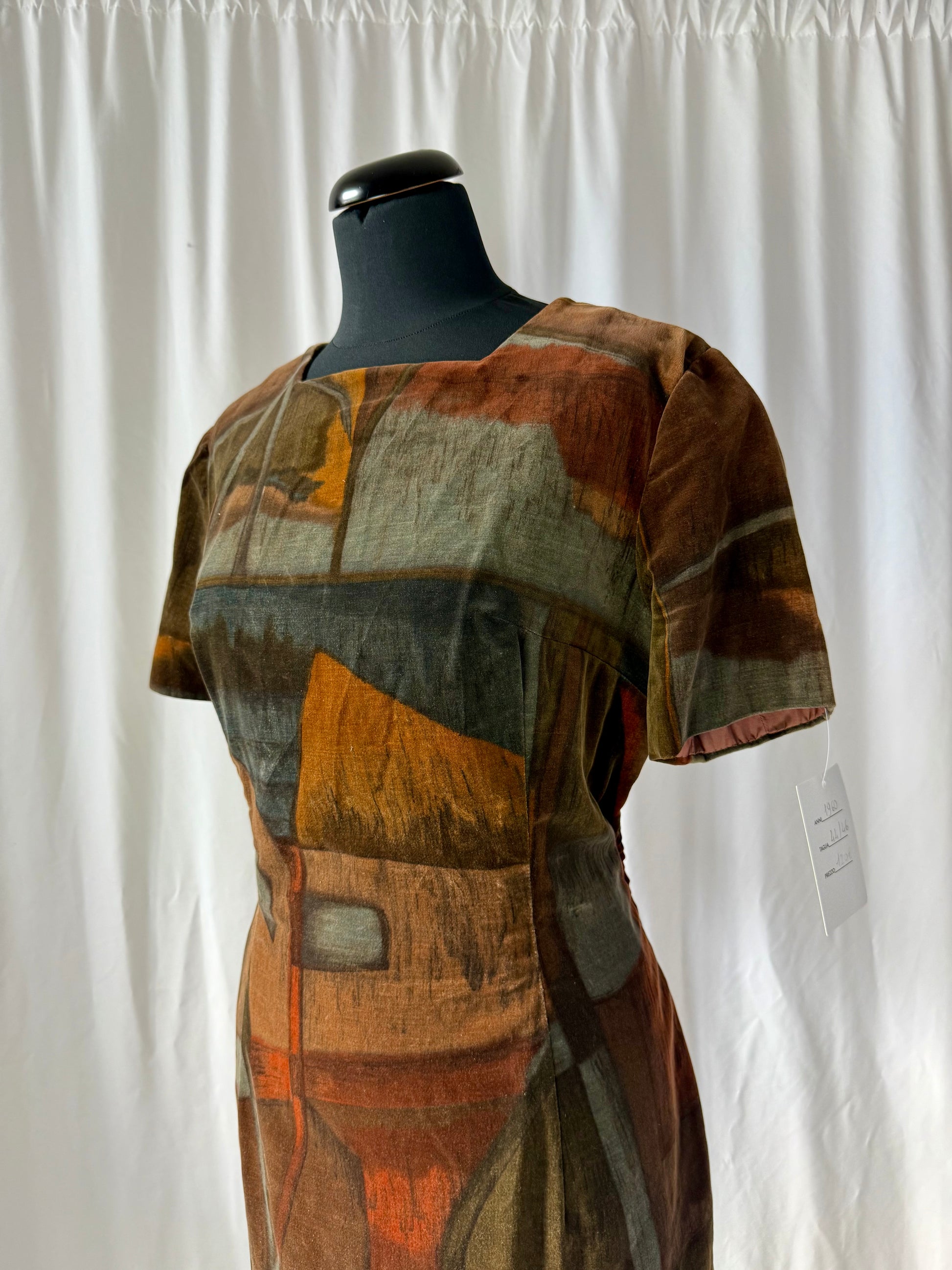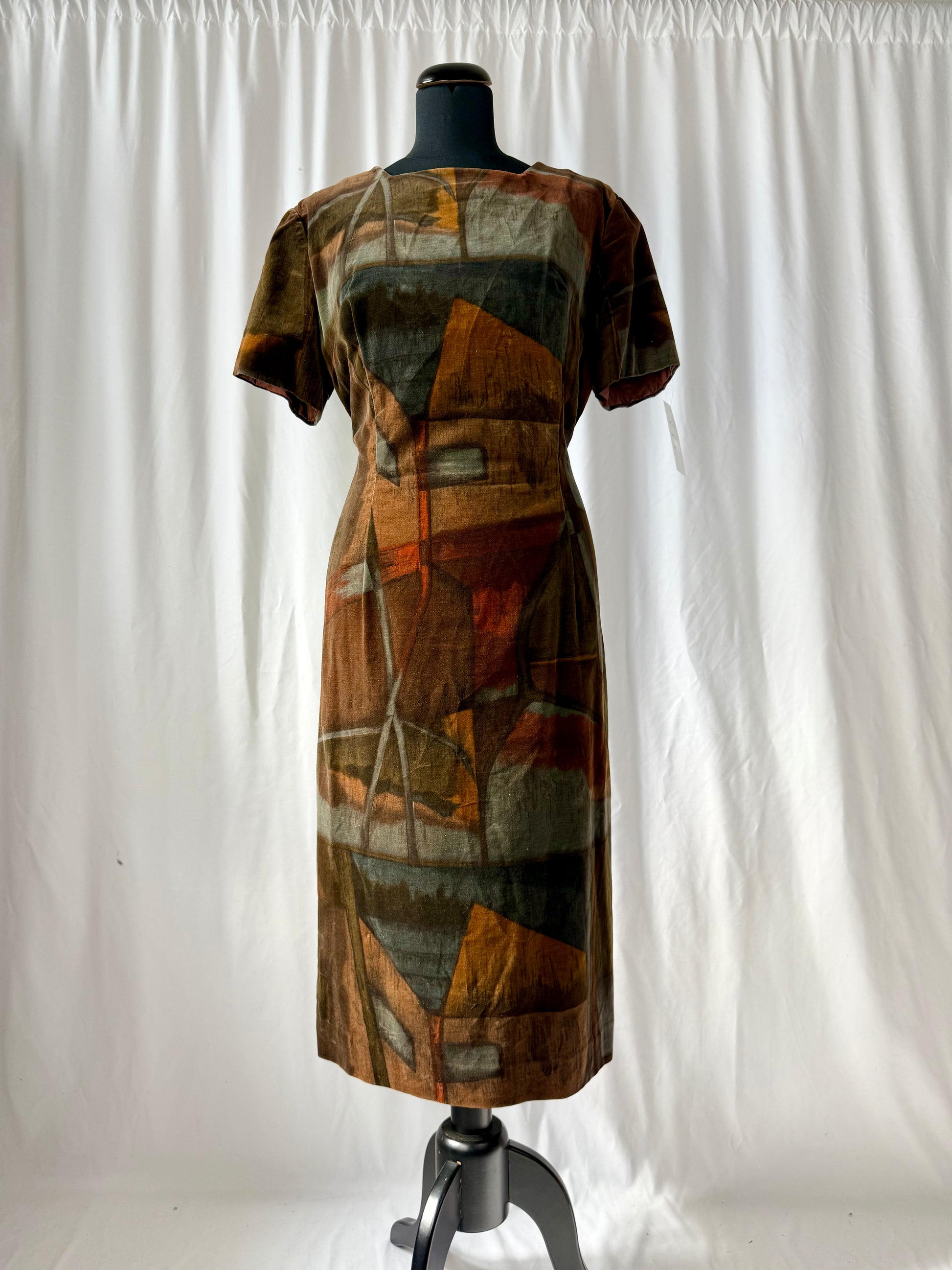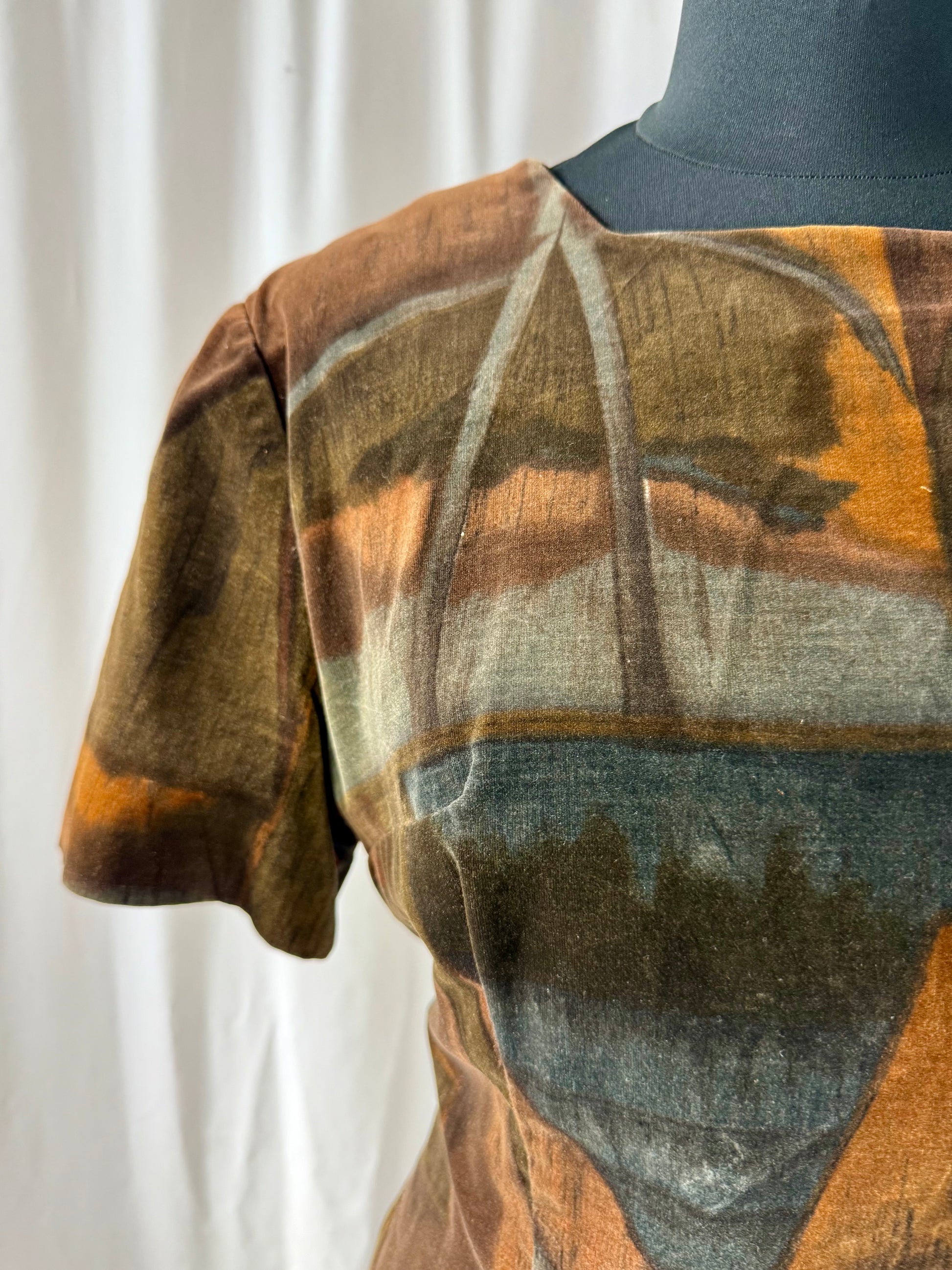 Abito sartoriale anni ‘60 in velluto con stampa geometrica astratta nei toni caldi dell’arancio, marrone e verde scuro. Linea tubino, maniche corte e girocollo semplice. Un capo altamente sofisticato che fascia la silhouette morbidamente con femminilità. Espressione del gusto artistico e sperimentale della moda anni ’60.