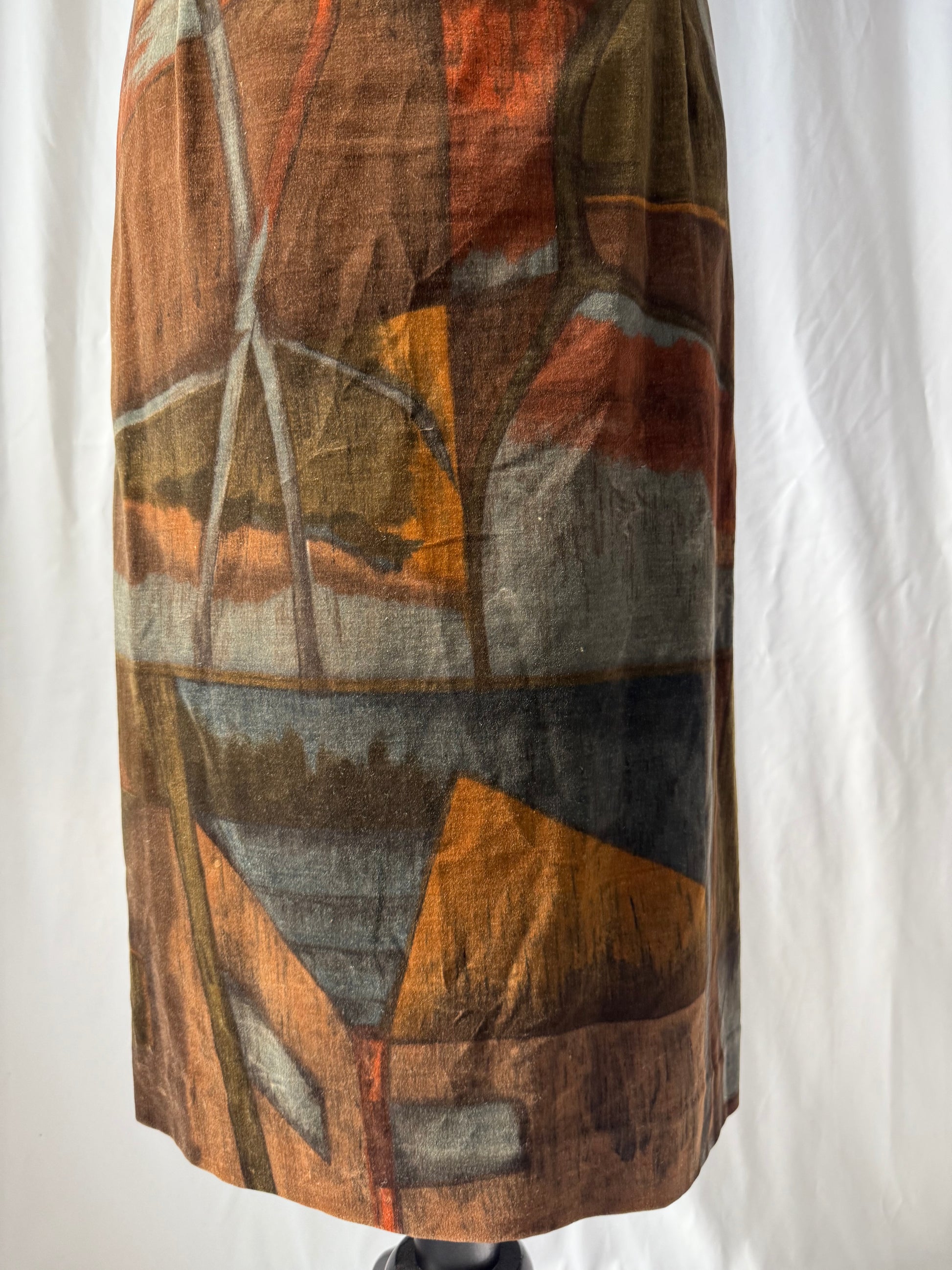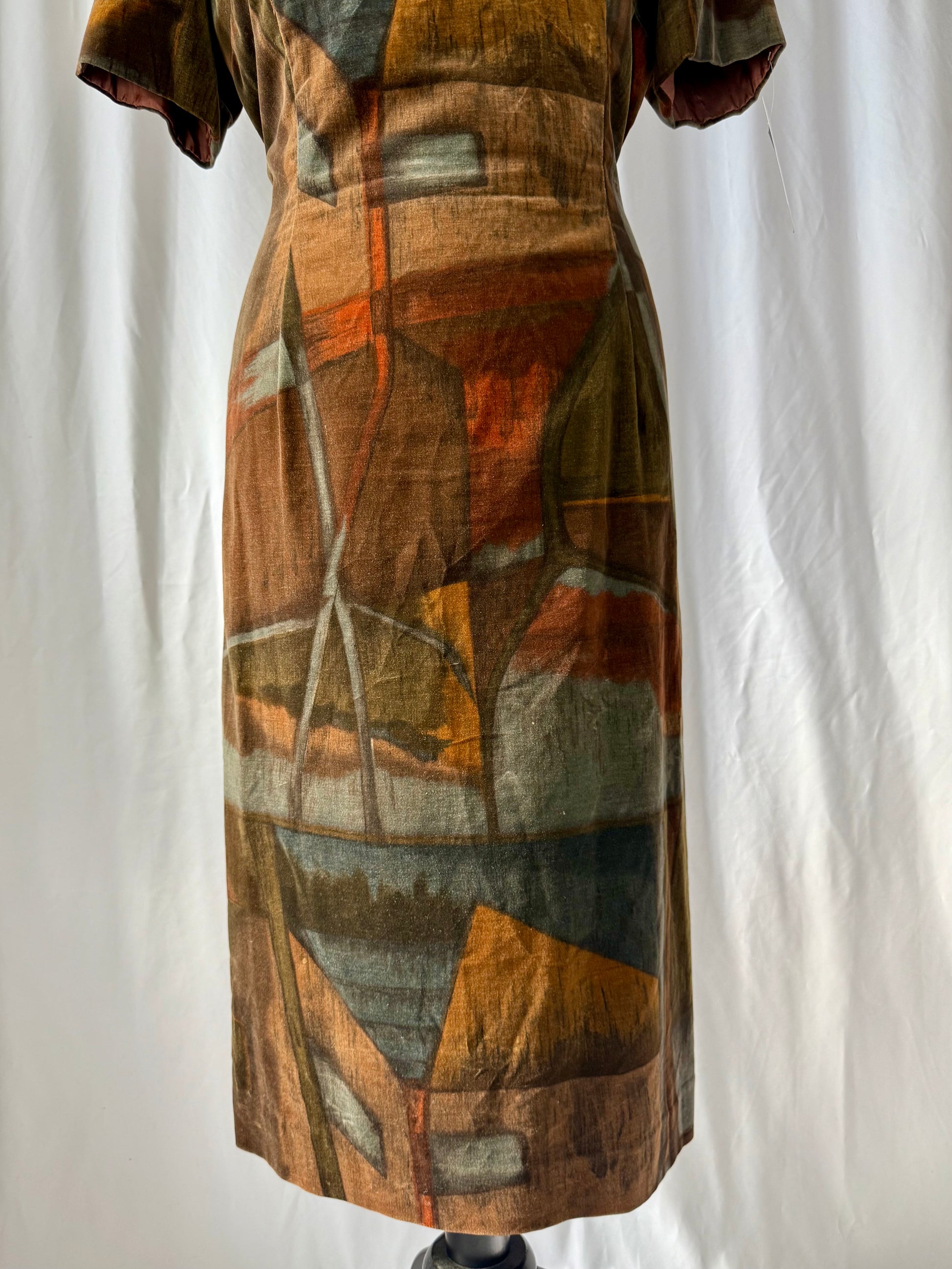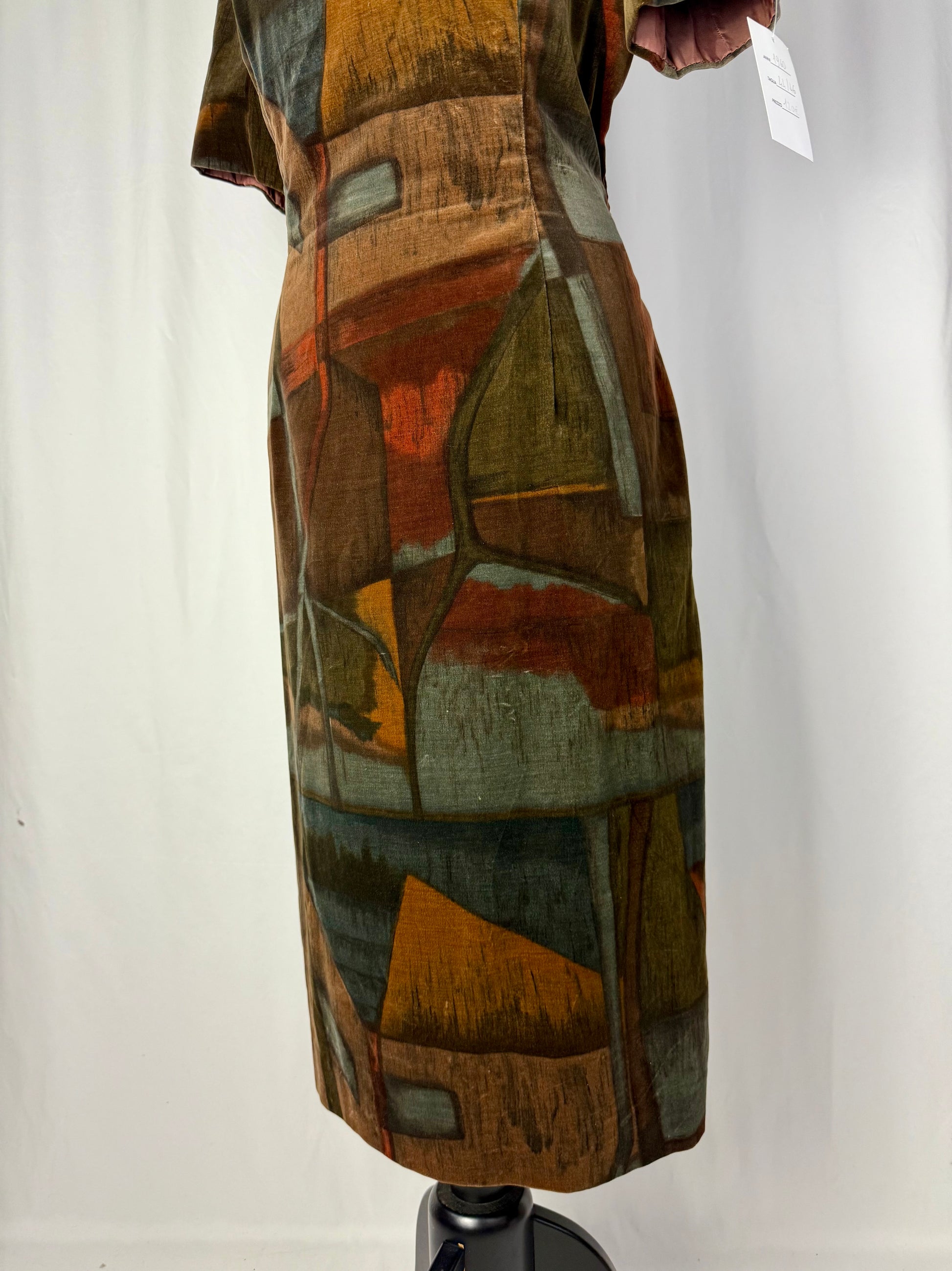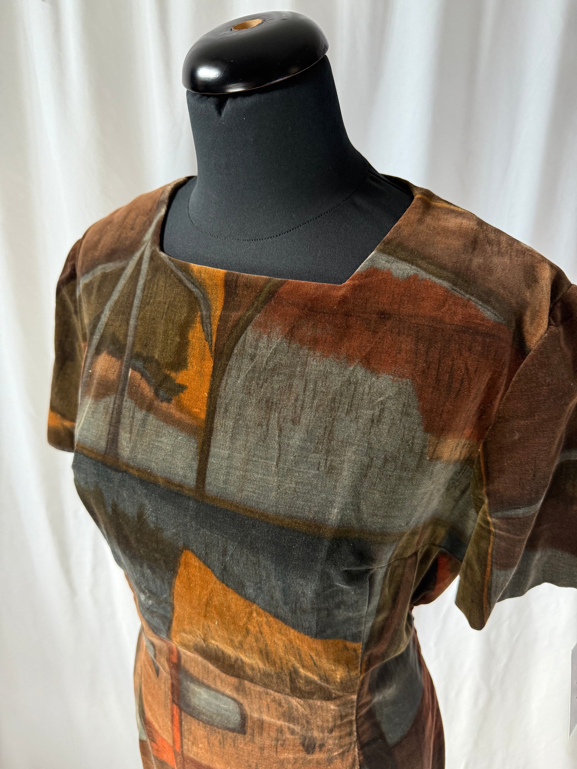Abito sartoriale anni ‘60 in velluto con stampa geometrica astratta nei toni caldi dell’arancio, marrone e verde scuro. Linea tubino, maniche corte e girocollo semplice. Un capo altamente sofisticato che fascia la silhouette morbidamente con femminilità. Espressione del gusto artistico e sperimentale della moda anni ’60.