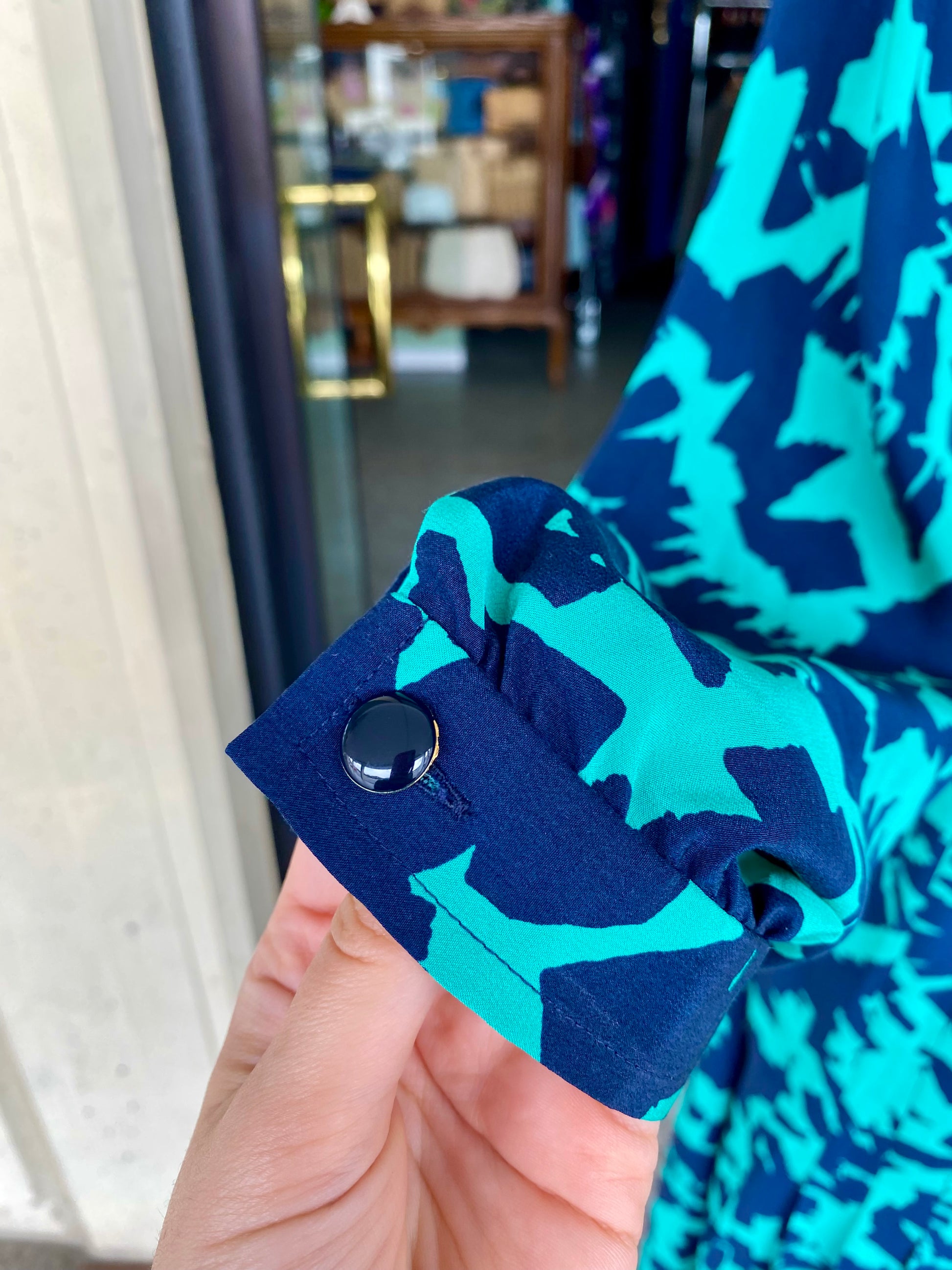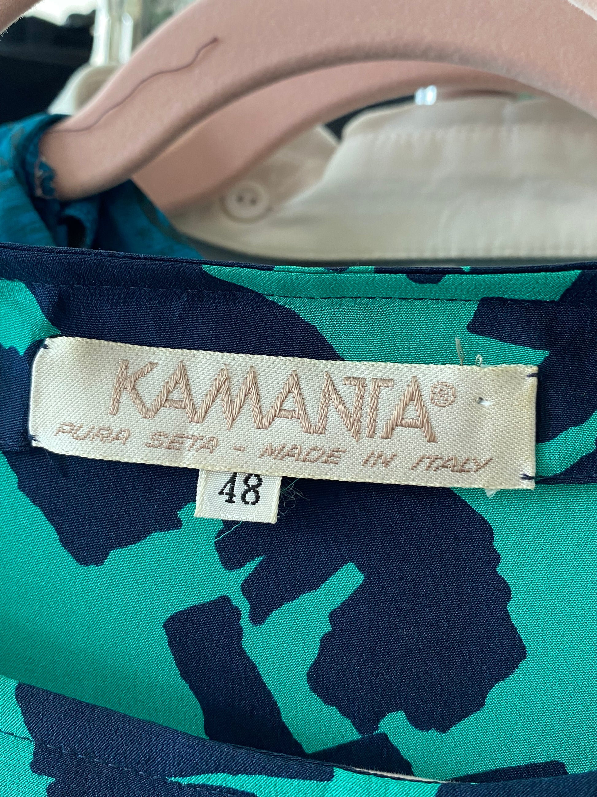 Affascinante abito originale anni ’80 firmato Kamanta – Made in Italy, realizzato in pura seta leggera e fluida, con una vivace stampa astratta nei toni del blu navy e verde acqua. Il taglio è longuette, con maniche a kimono morbide e ampie, che donano al capo un’allure sofisticata e rilassata.