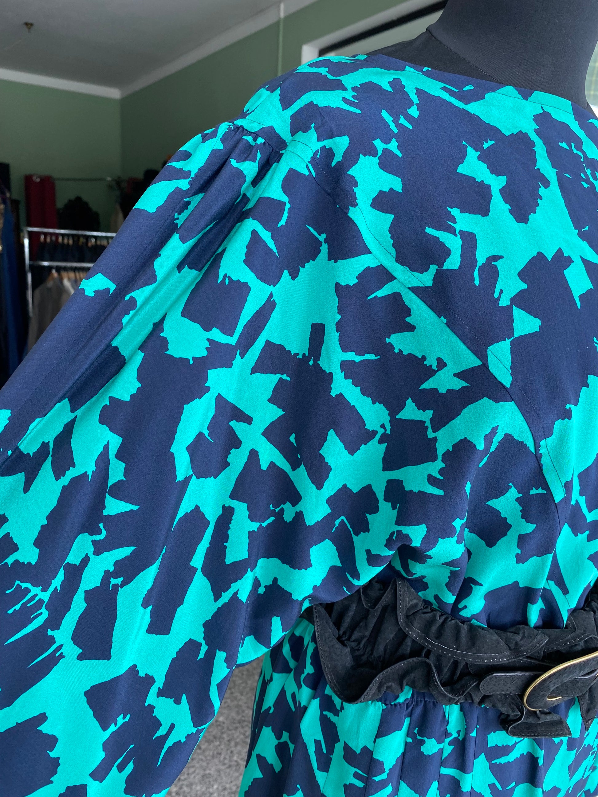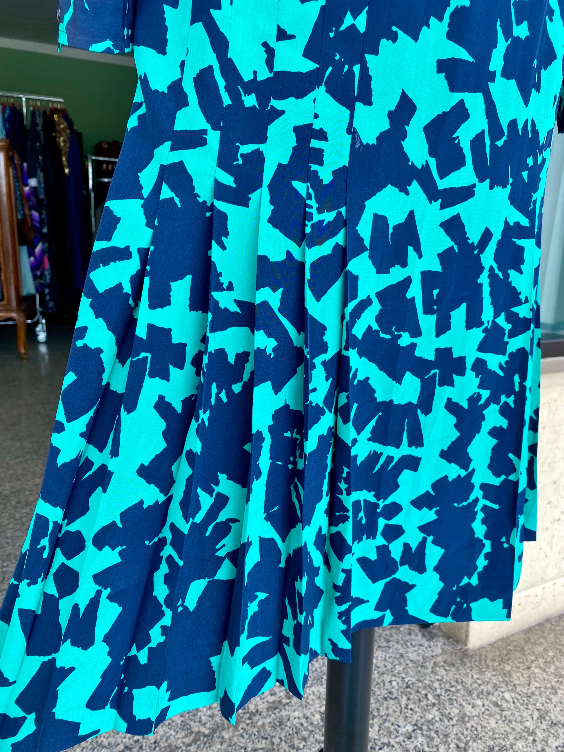 Abito longuette anni ’80 in pura seta – stampa astratta blu e verde - TG. 48/50 circa