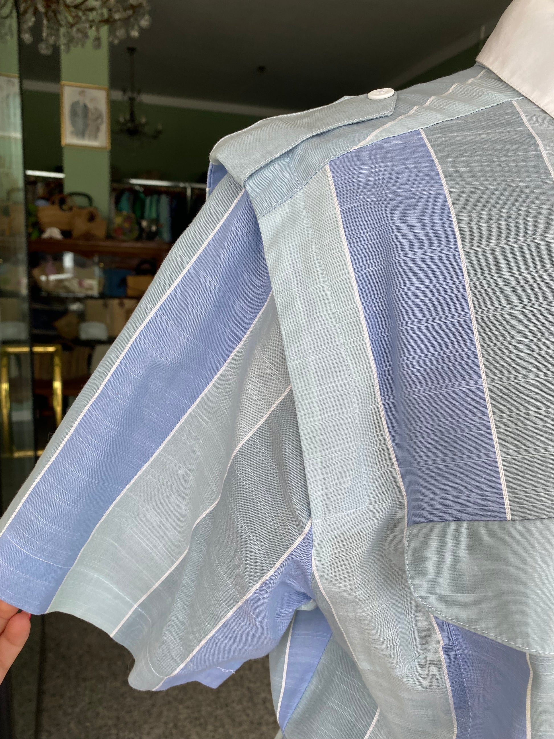 Fresco abito chemisier in 100% cotone con fantasia a righe verticali nei toni del celeste e azzurro polvere. Modello con spalle strutturate e pattine decorative sul petto, colletto bianco a contrasto e cintura coordinata in vita.