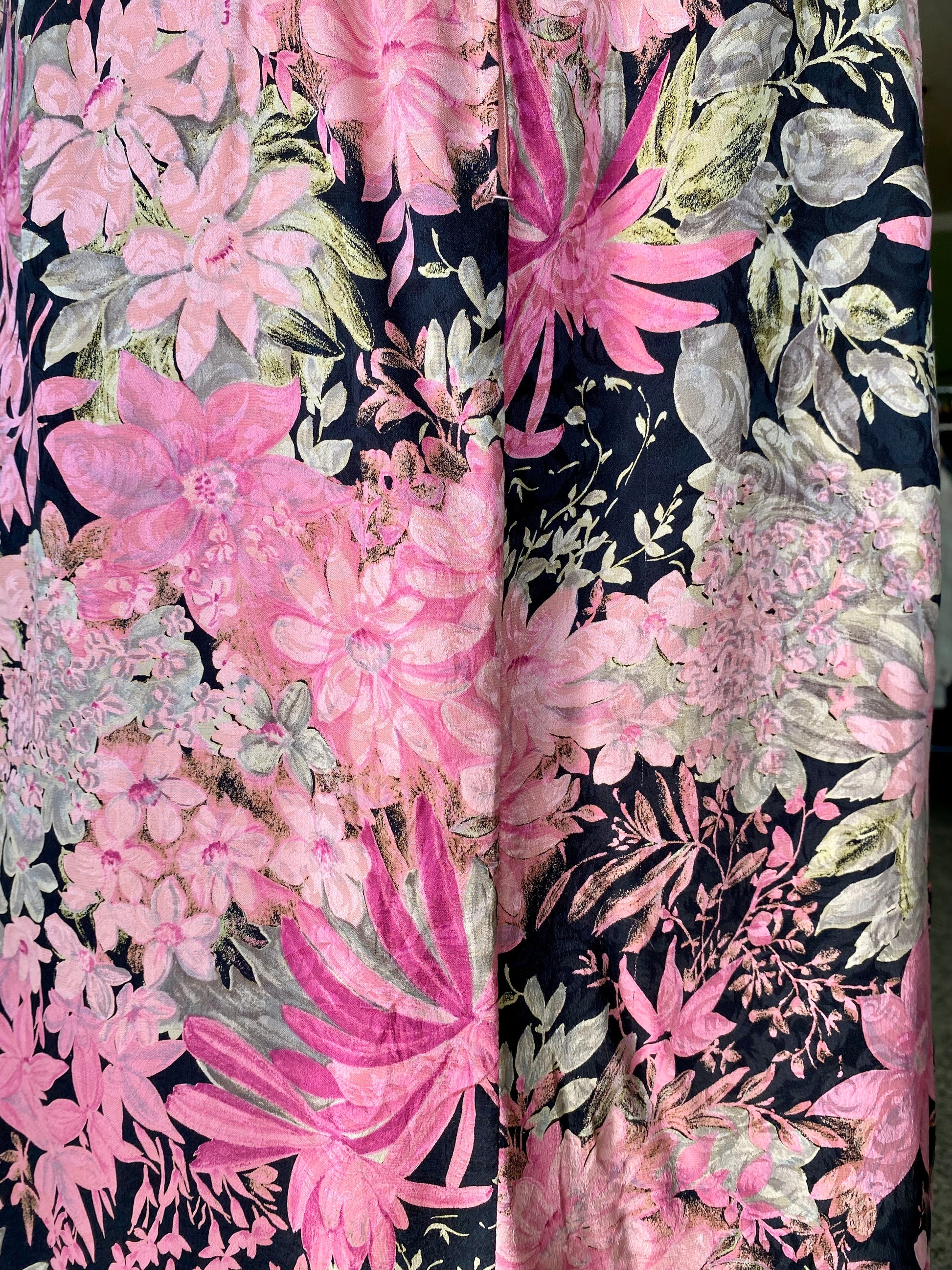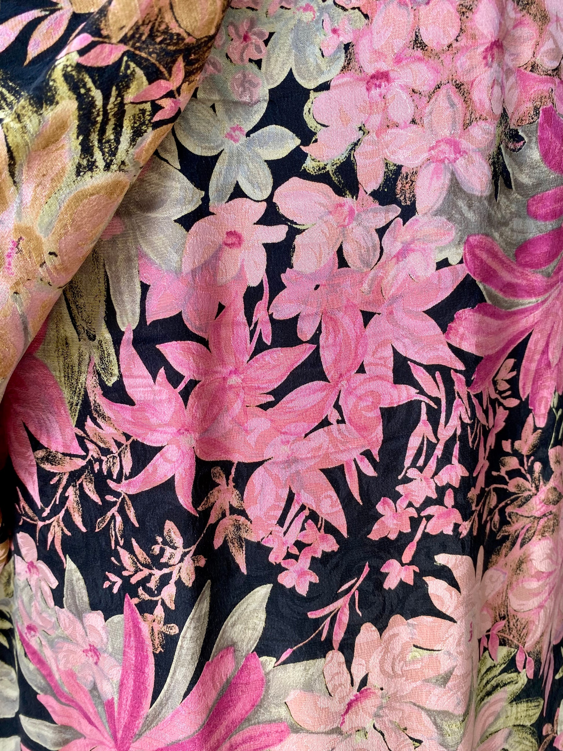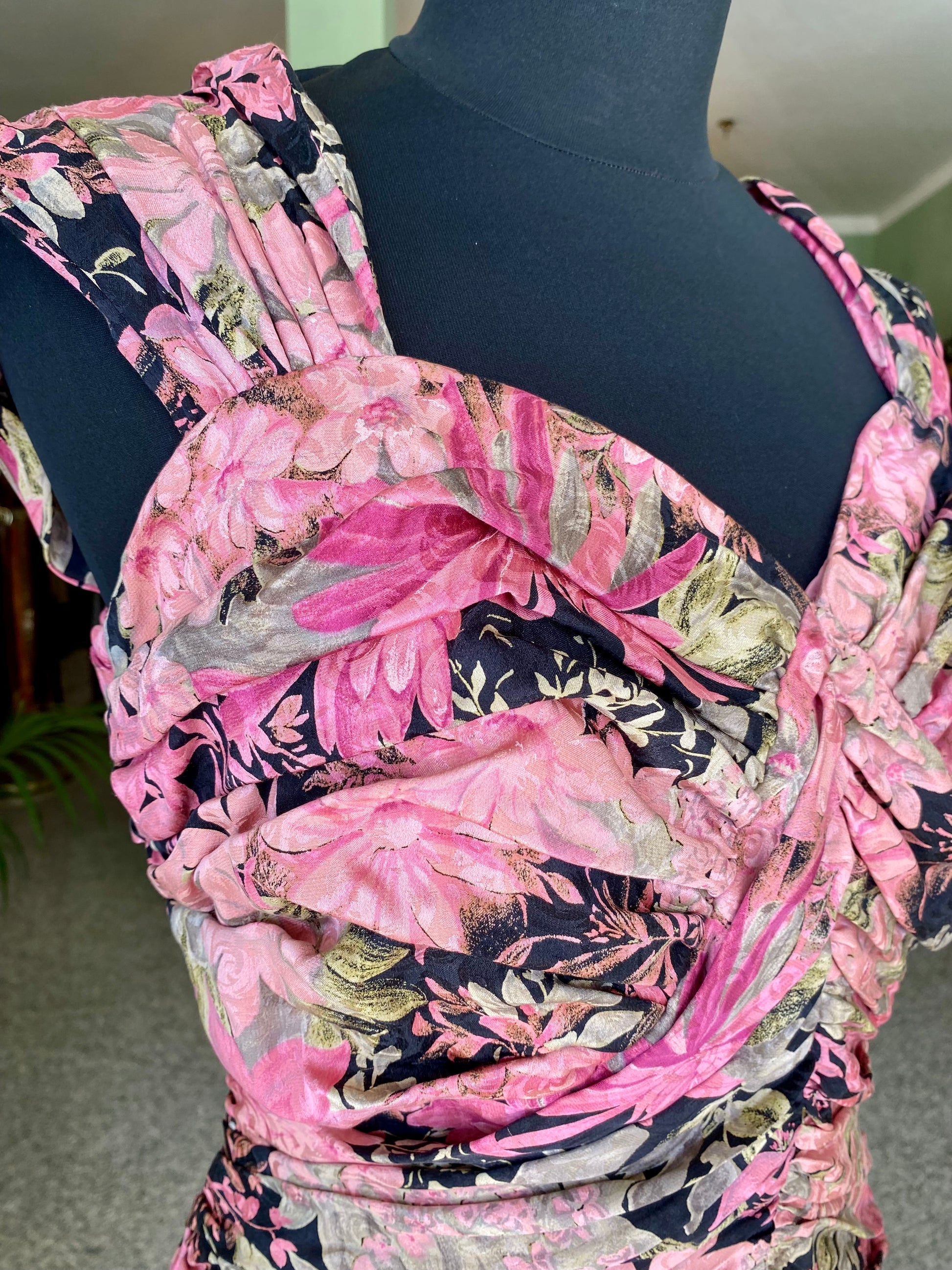 Abito sartoriale anni ’80 in pura seta, con drappeggi strategici che scolpiscono la silhouette e valorizzano il décolleté. Il motivo floreale, dai toni rosati e naturali su fondo nero, esalta l’eleganza del taglio. Un capo teatrale e sensuale, costruito con maestria, perfetto per chi ama distinguersi con carattere.