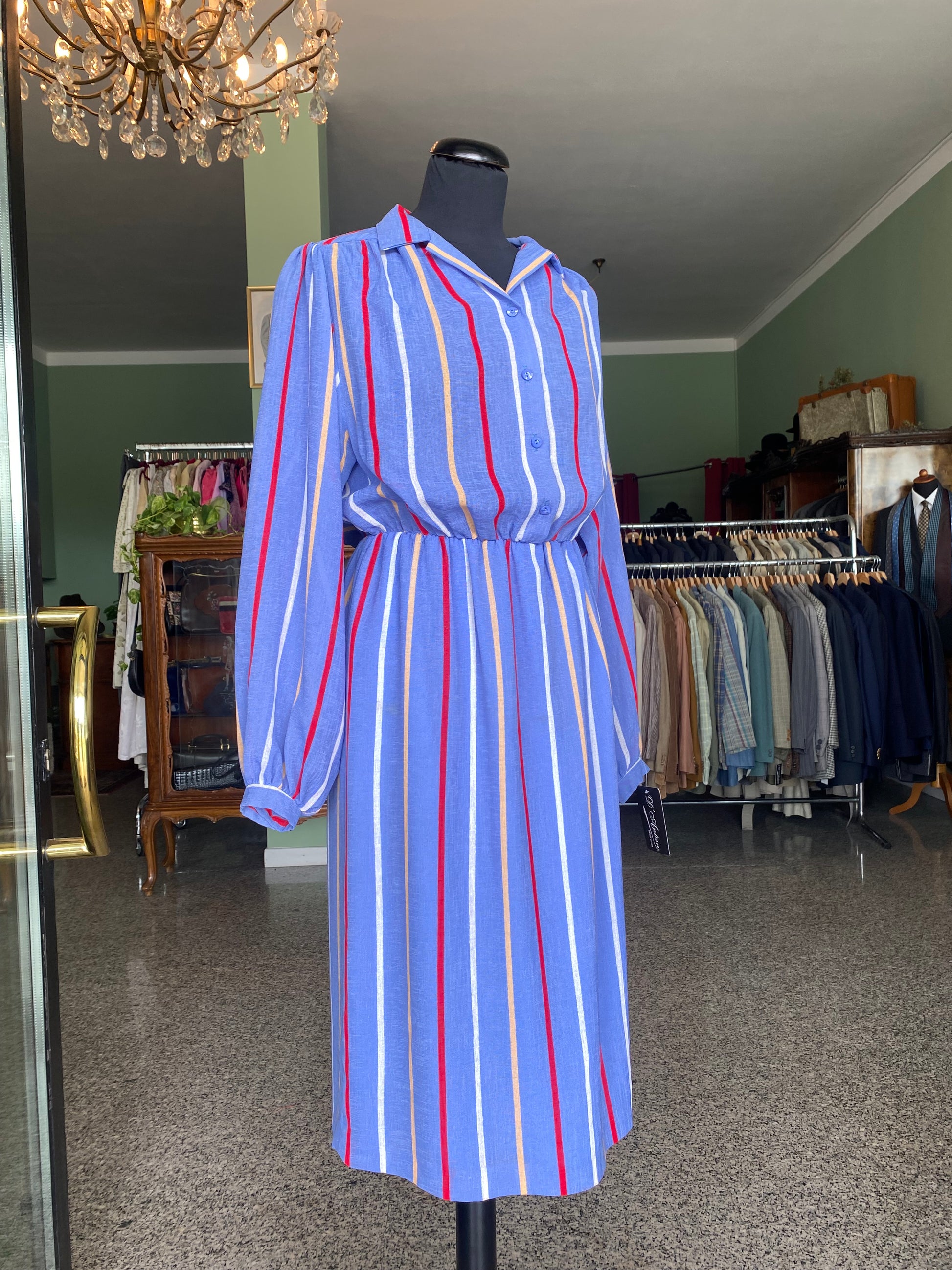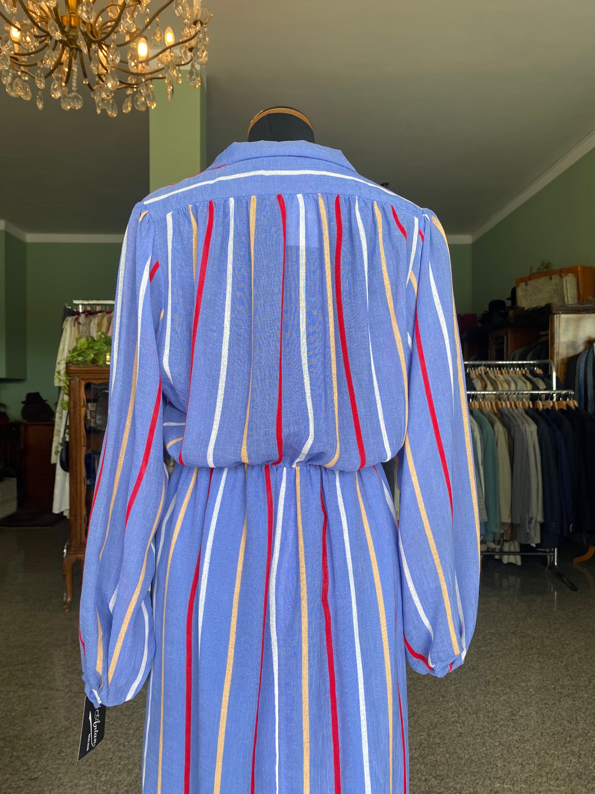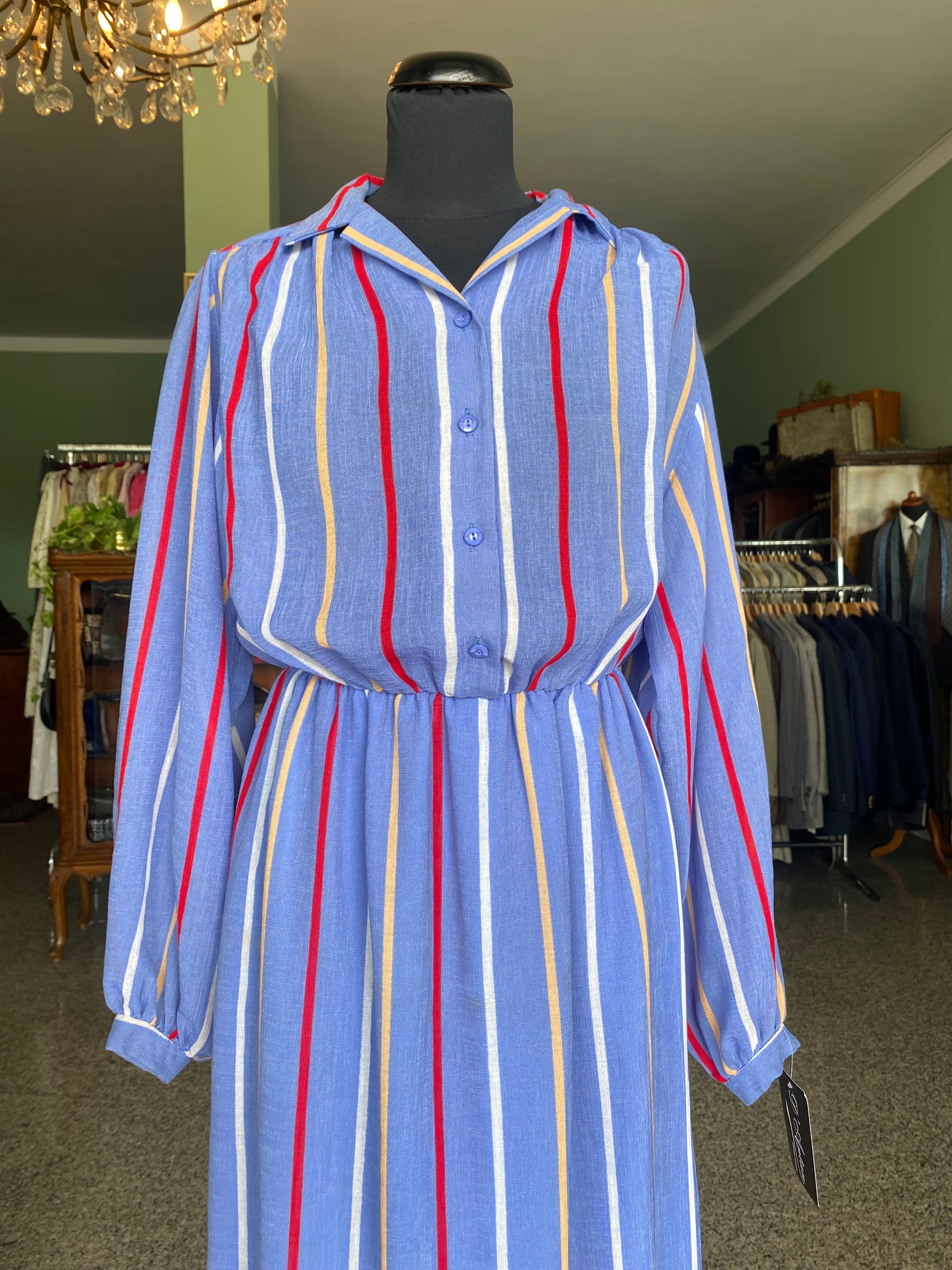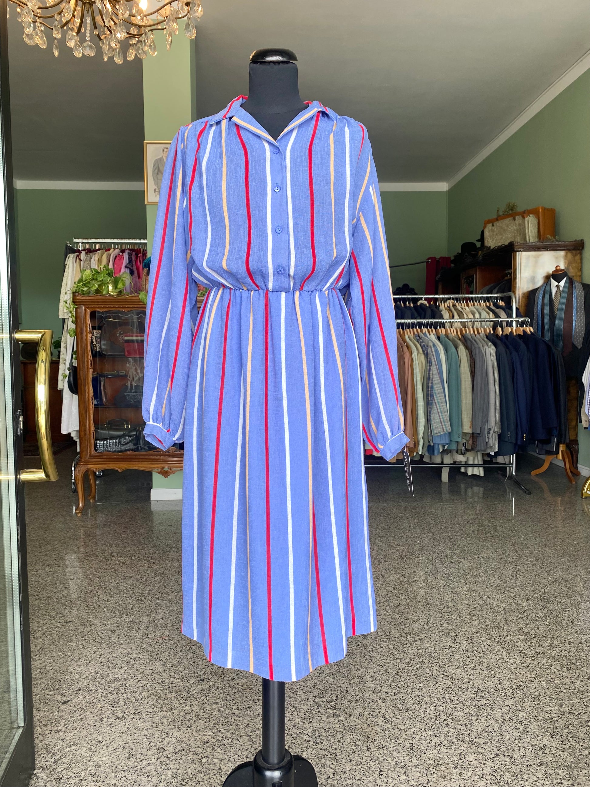 Abito anni '80 da giorno in misto cotone, leggero e fresco. Fondo azzurro con righe verticali rosse, bianche e giallo ocra. Modello classico con colletto a camicia, bottoncini sul busto, maniche lunghe con polsino e vita elasticizzata. Linea morbida, ideale per l'uso quotidiano.
