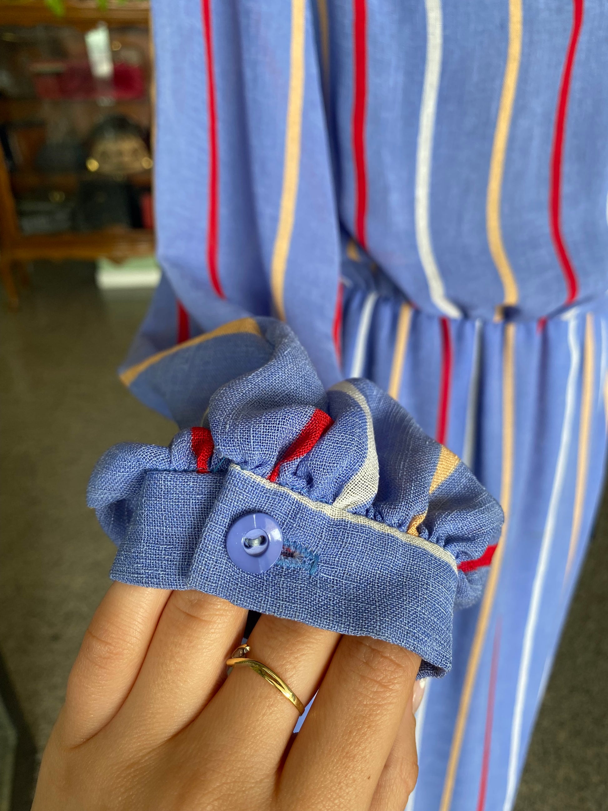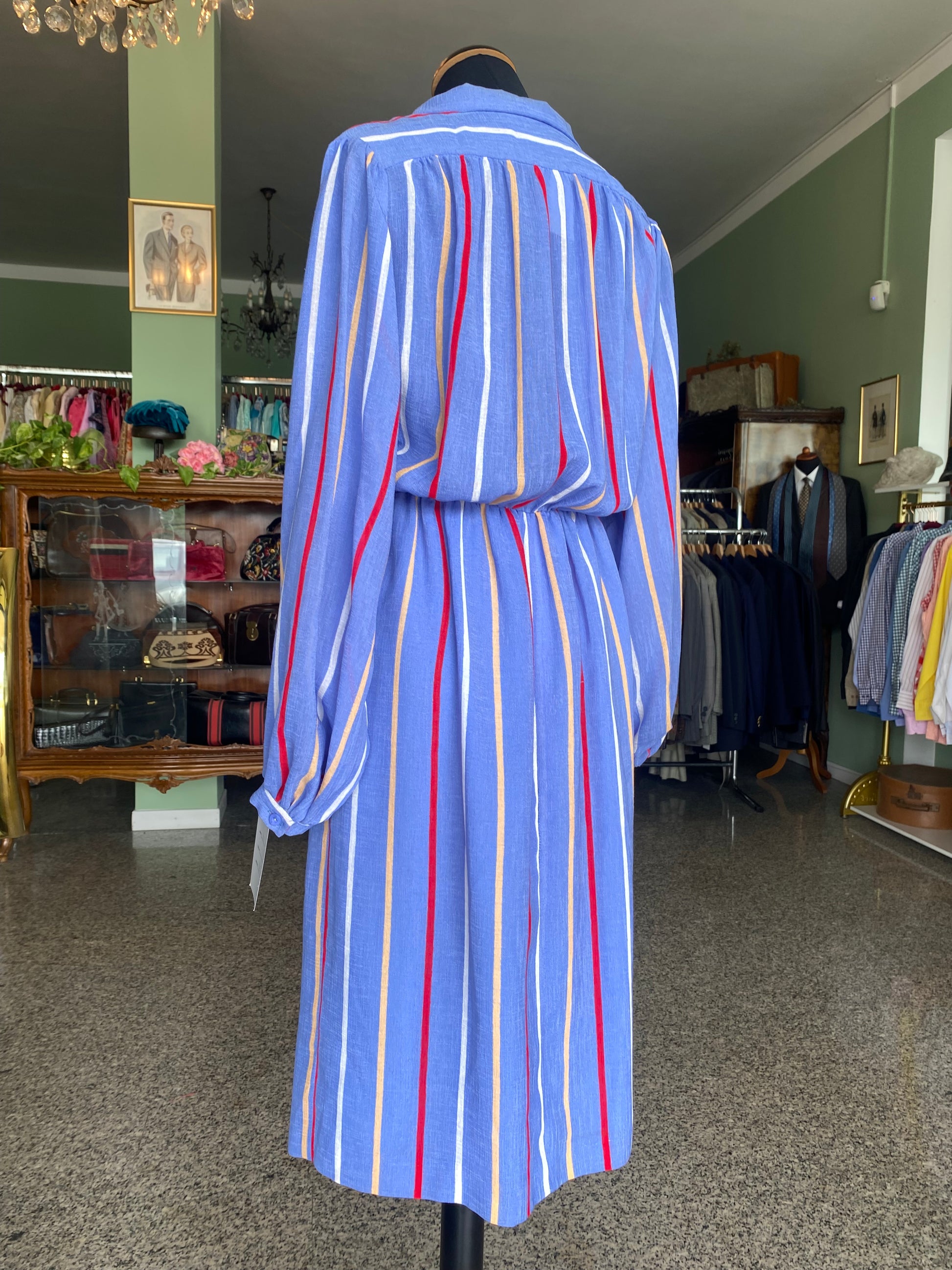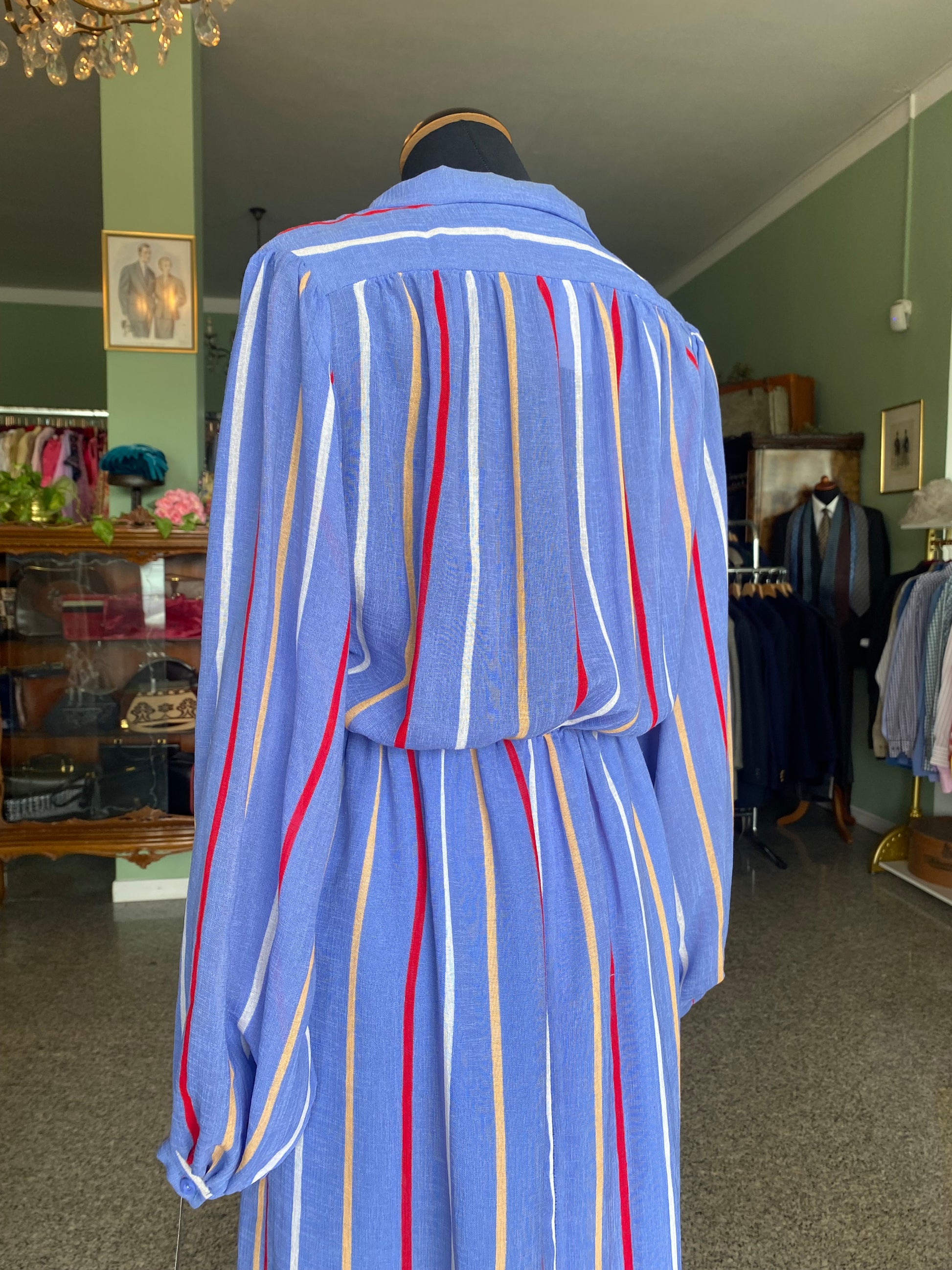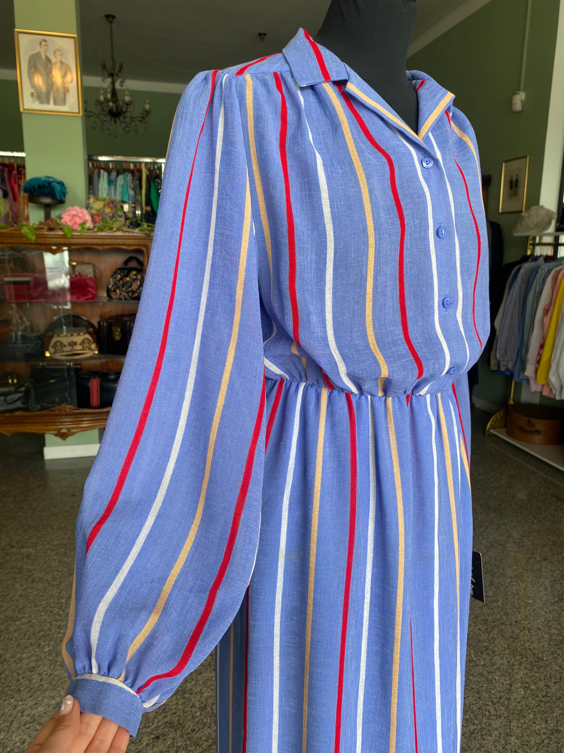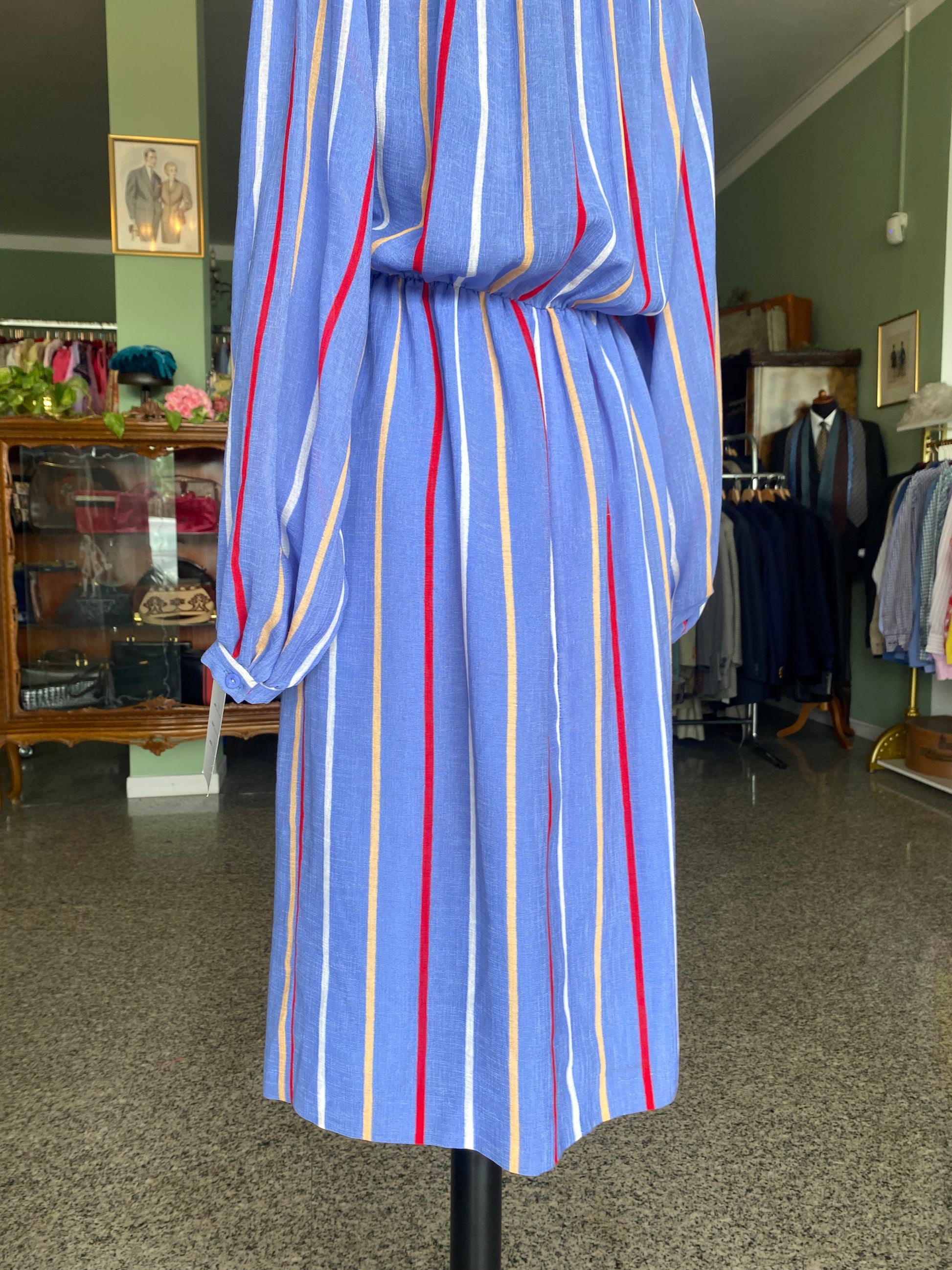 Abito anni '80 da giorno in misto cotone, leggero e fresco. Fondo azzurro con righe verticali rosse, bianche e giallo ocra. Modello classico con colletto a camicia, bottoncini sul busto, maniche lunghe con polsino e vita elasticizzata. Linea morbida, ideale per l'uso quotidiano.