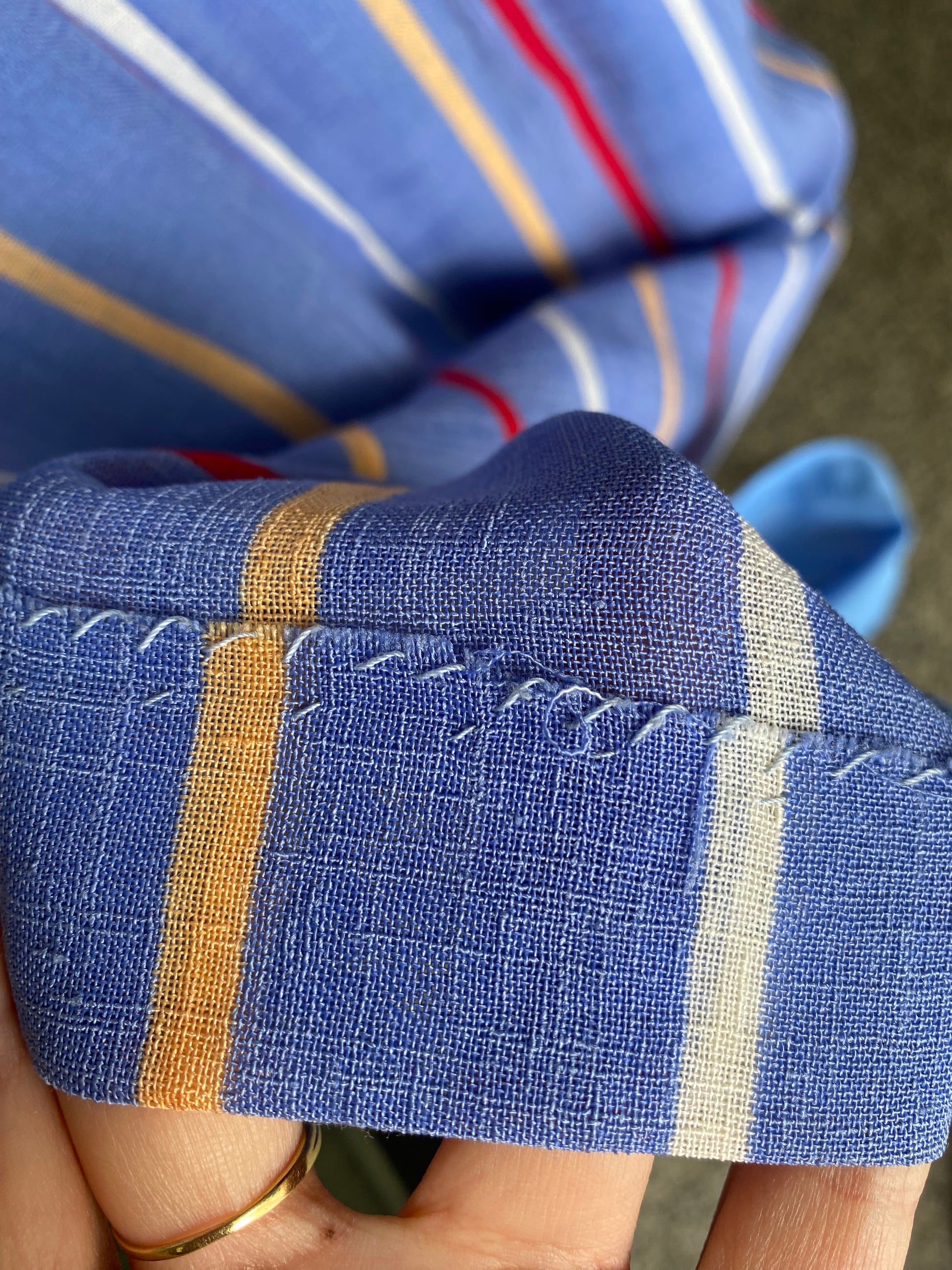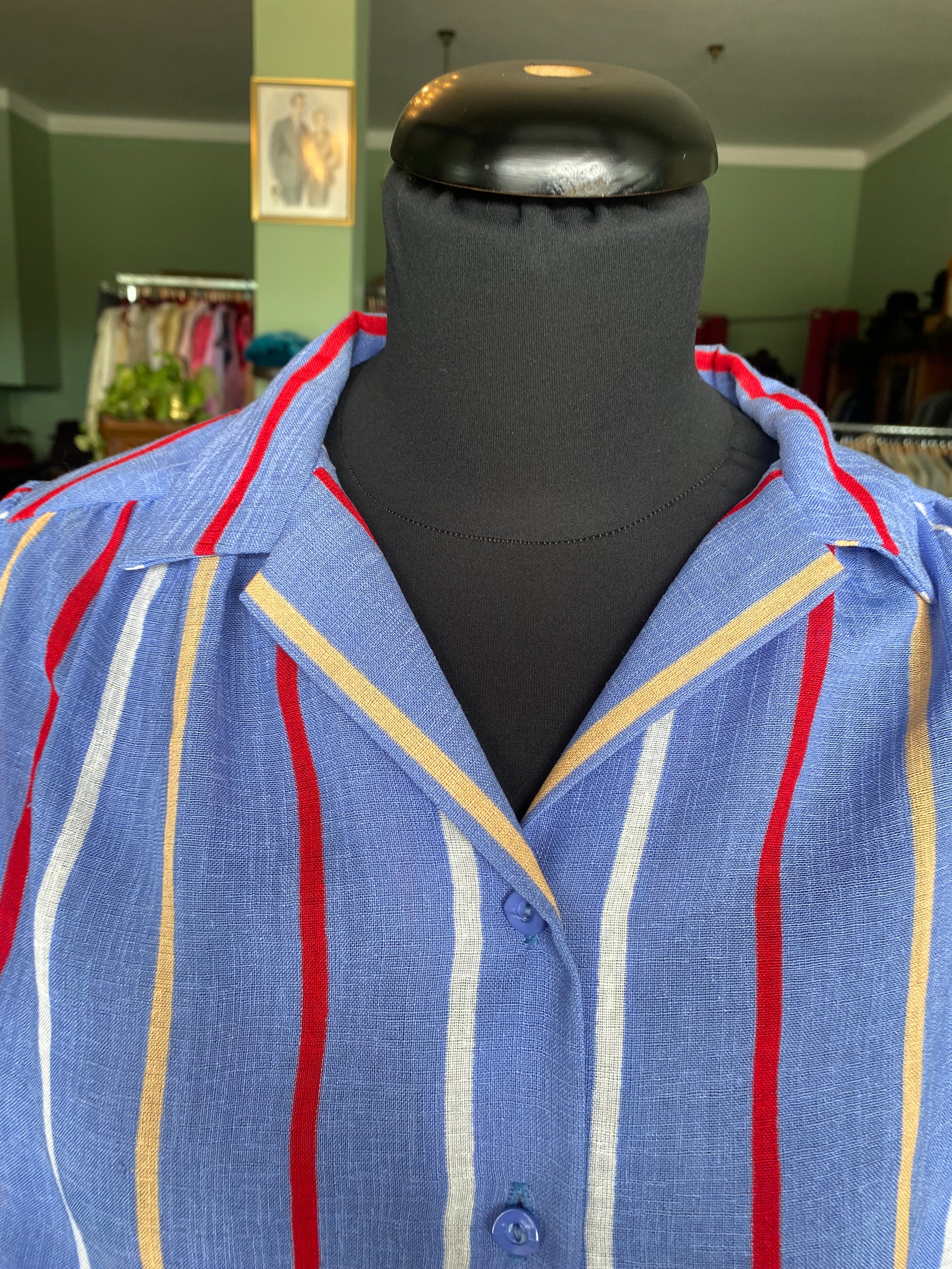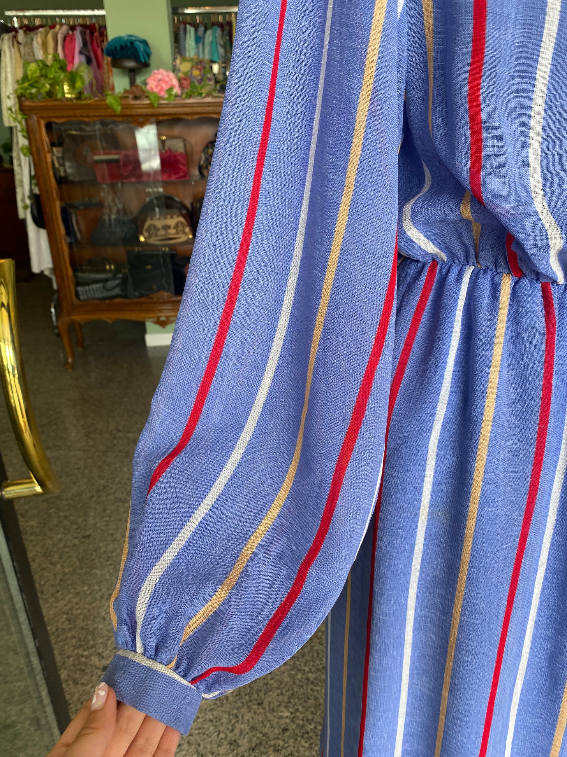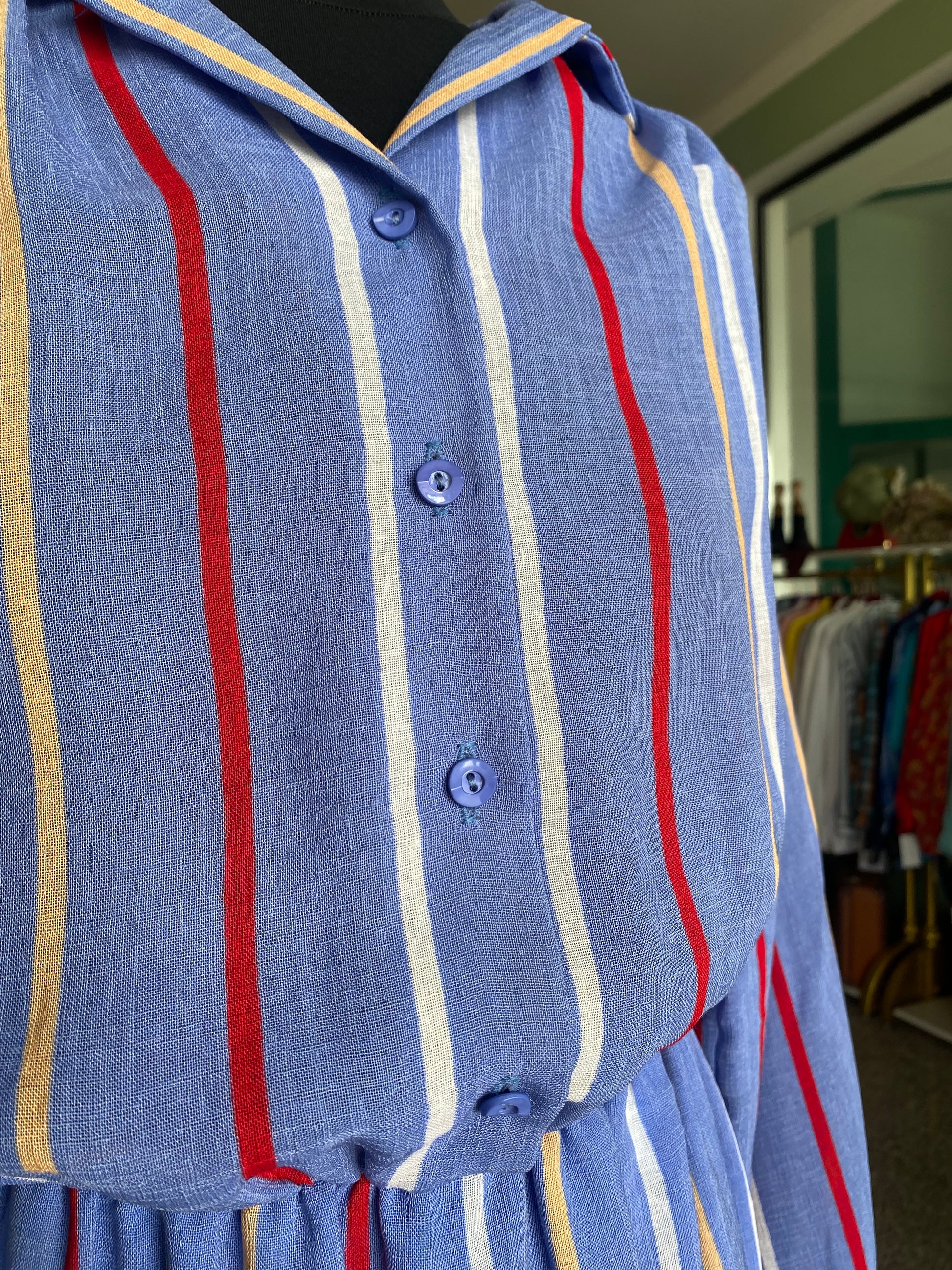 Abito anni '80 da giorno in misto cotone, leggero e fresco. Fondo azzurro con righe verticali rosse, bianche e giallo ocra. Modello classico con colletto a camicia, bottoncini sul busto, maniche lunghe con polsino e vita elasticizzata. Linea morbida, ideale per l'uso quotidiano.