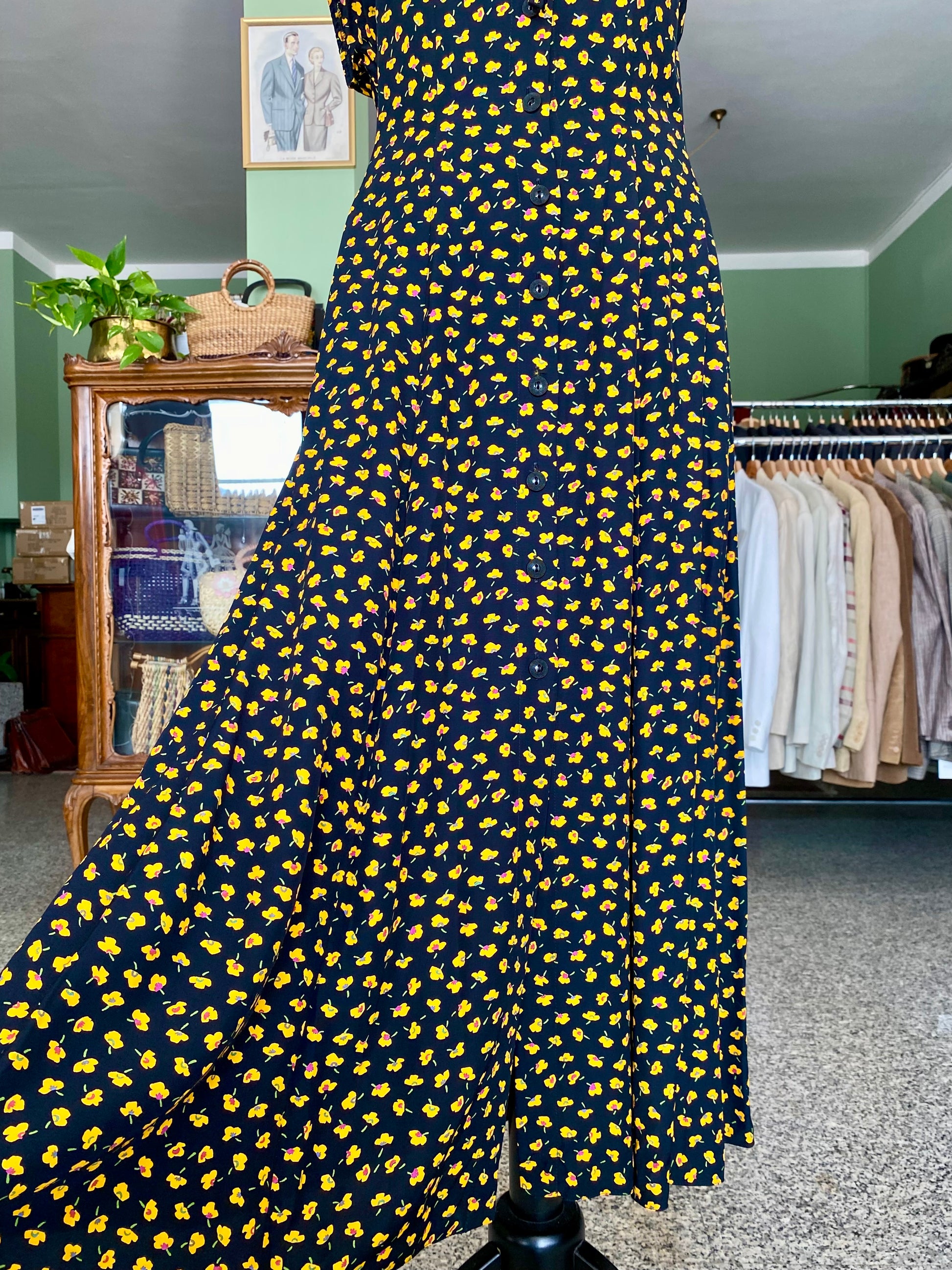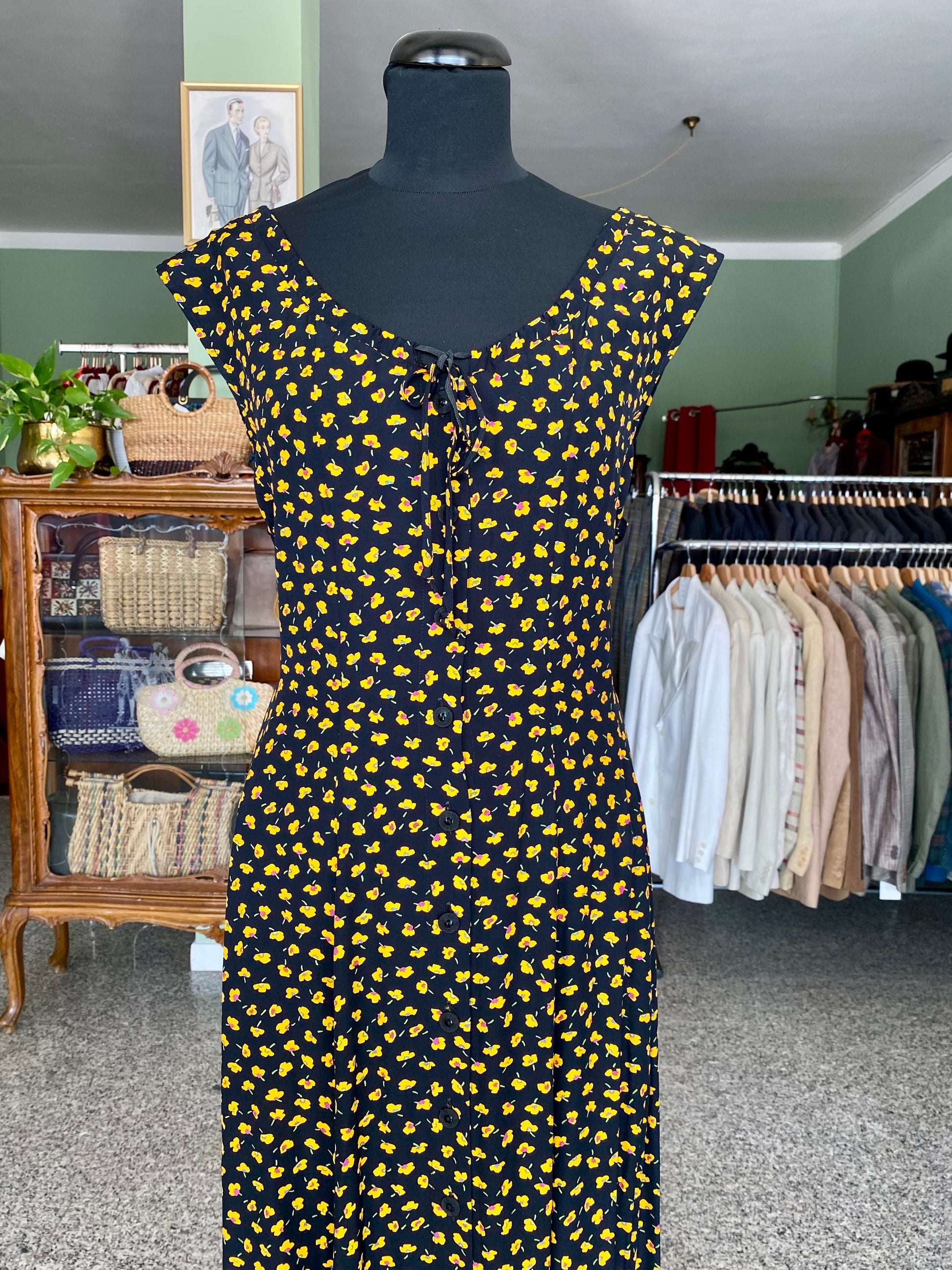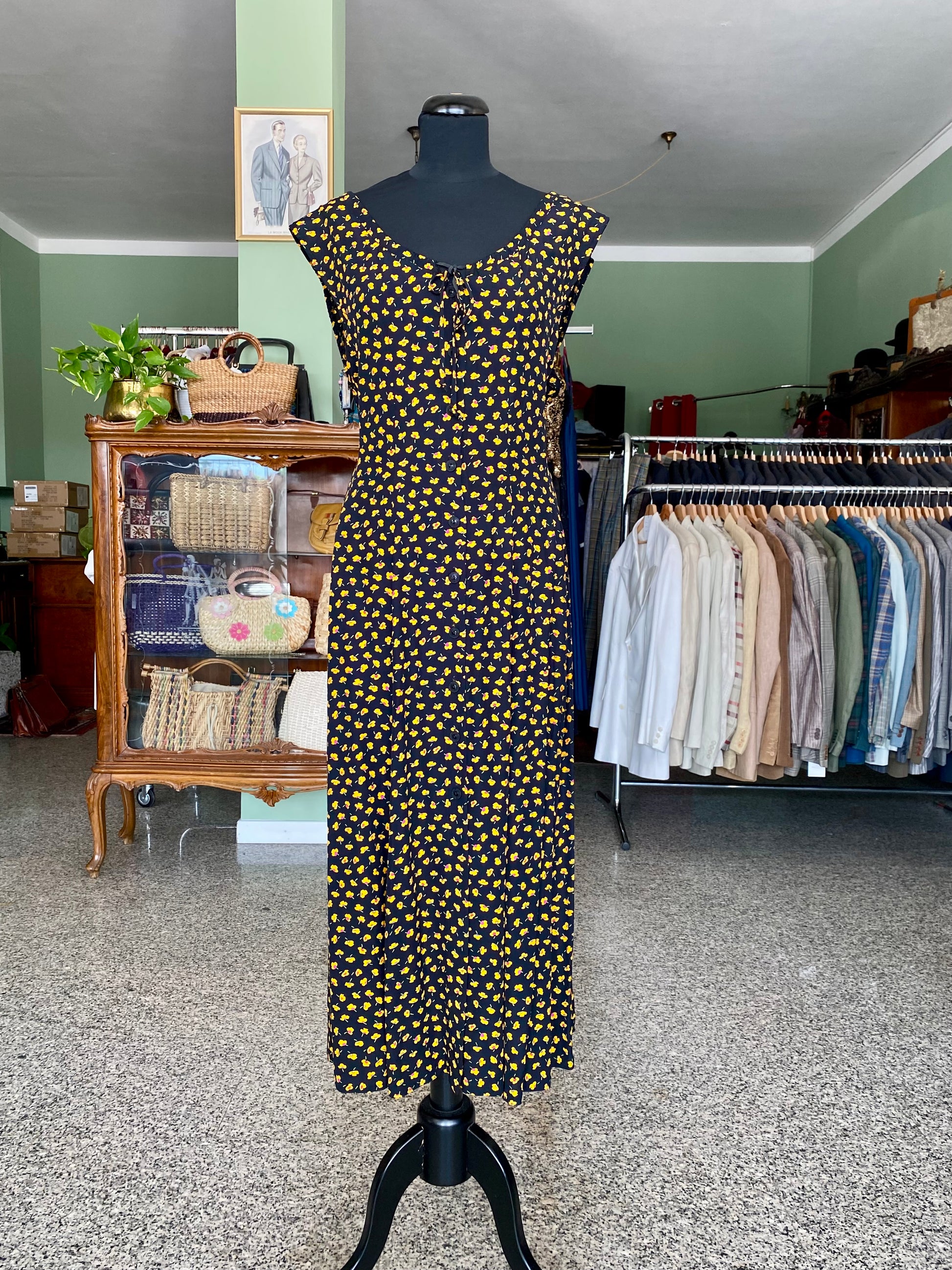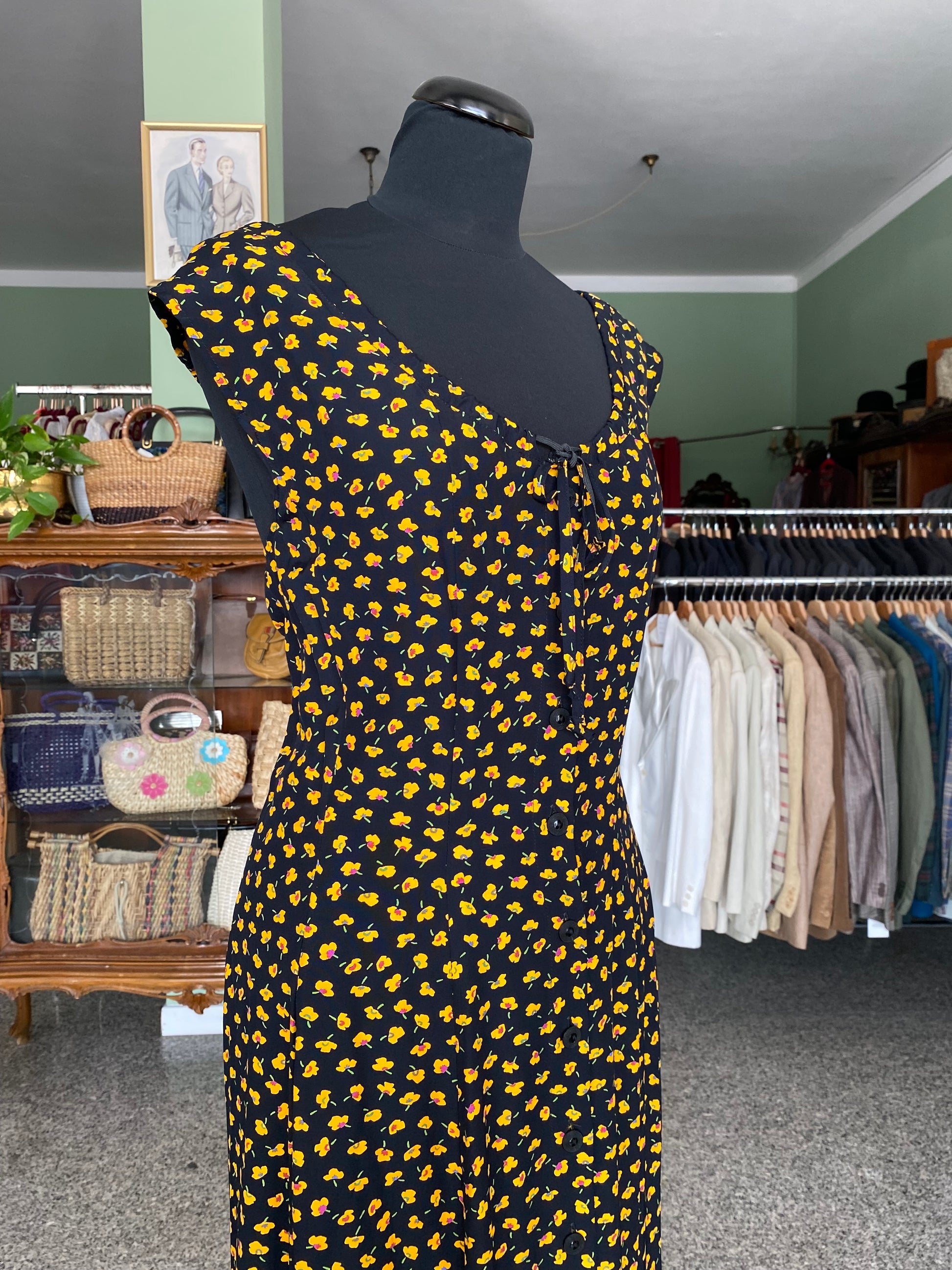 Questo abito anni ‘80 è un perfetto esempio di femminilità “all’italiana”: ha uno scollo ampio e generoso, valorizzato da un delicato laccetto, che esalta spalle e décolleté con naturale grazia. La stoffa è leggera, morbida, con una stampa di fiori gialli su sfondo scuro — un motivo vivace che spicca ma resta elegante.
