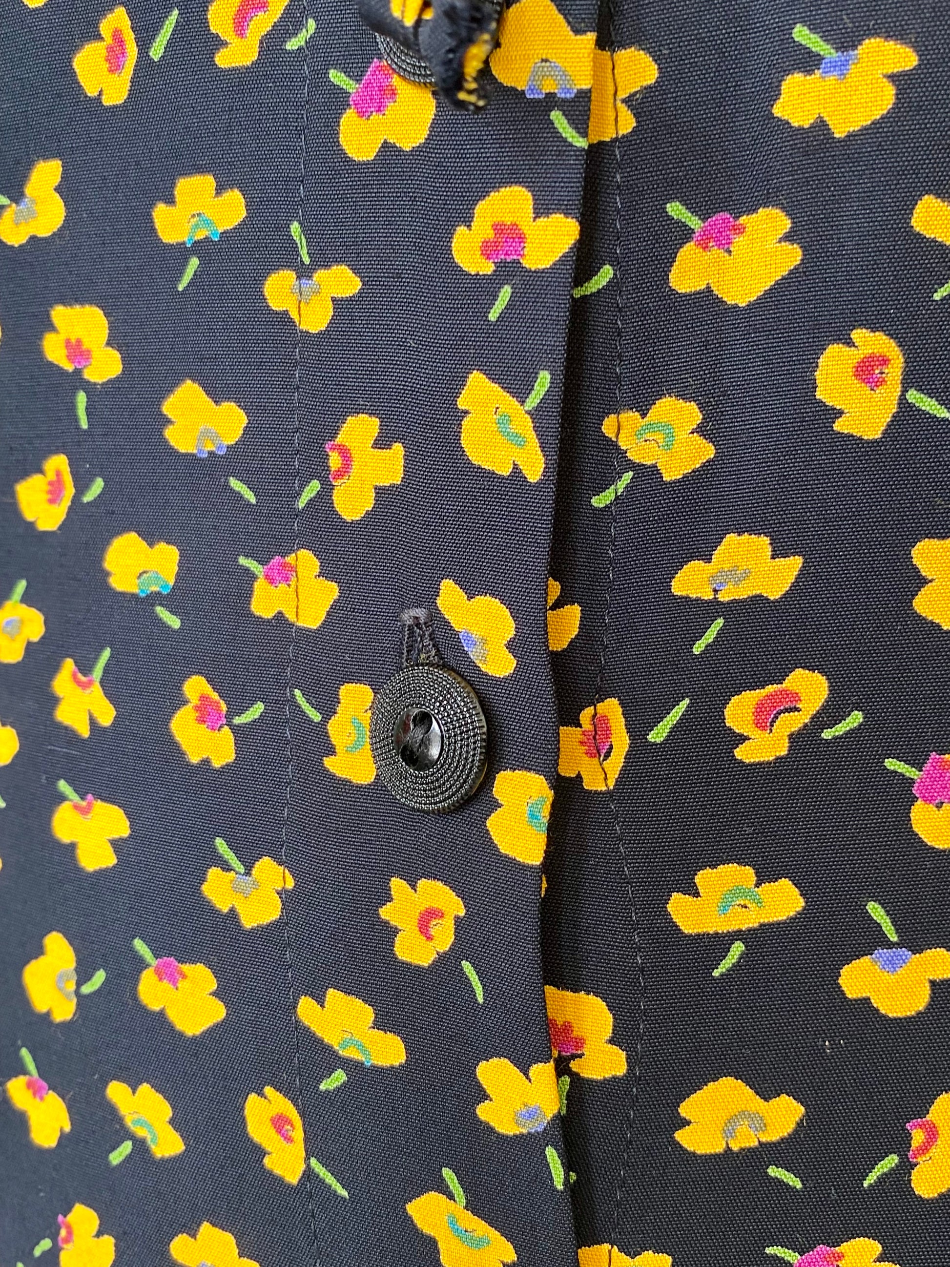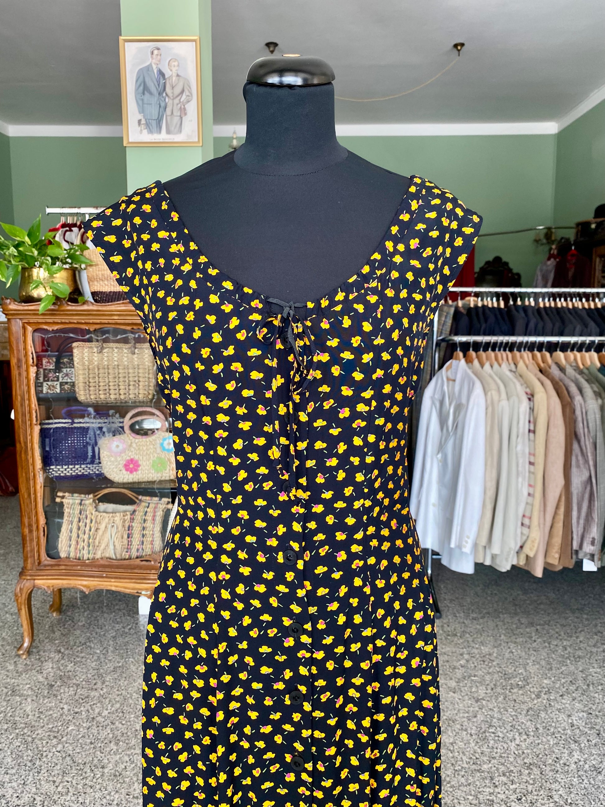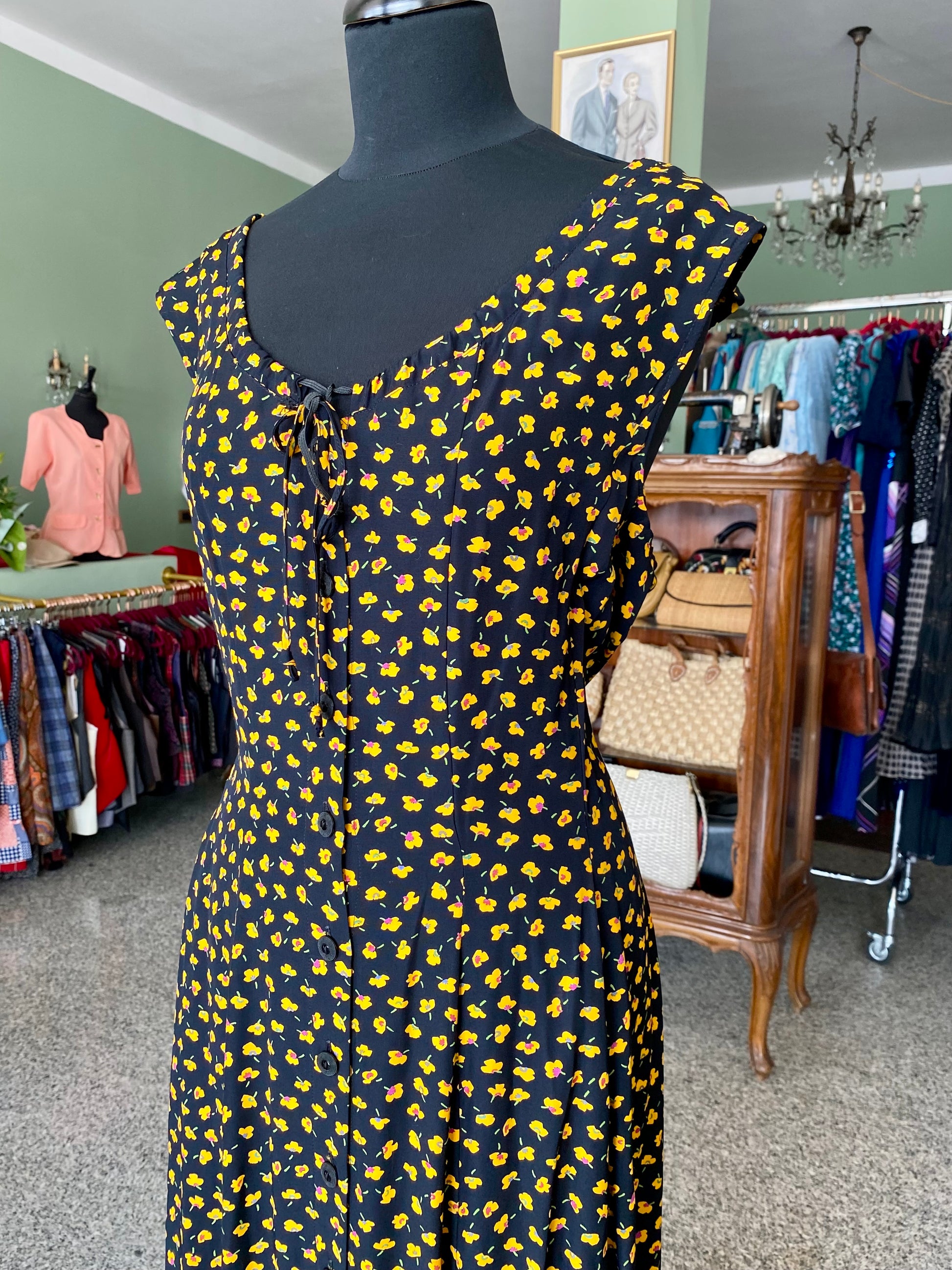 Questo abito anni ‘80 è un perfetto esempio di femminilità “all’italiana”: ha uno scollo ampio e generoso, valorizzato da un delicato laccetto, che esalta spalle e décolleté con naturale grazia. La stoffa è leggera, morbida, con una stampa di fiori gialli su sfondo scuro — un motivo vivace che spicca ma resta elegante.