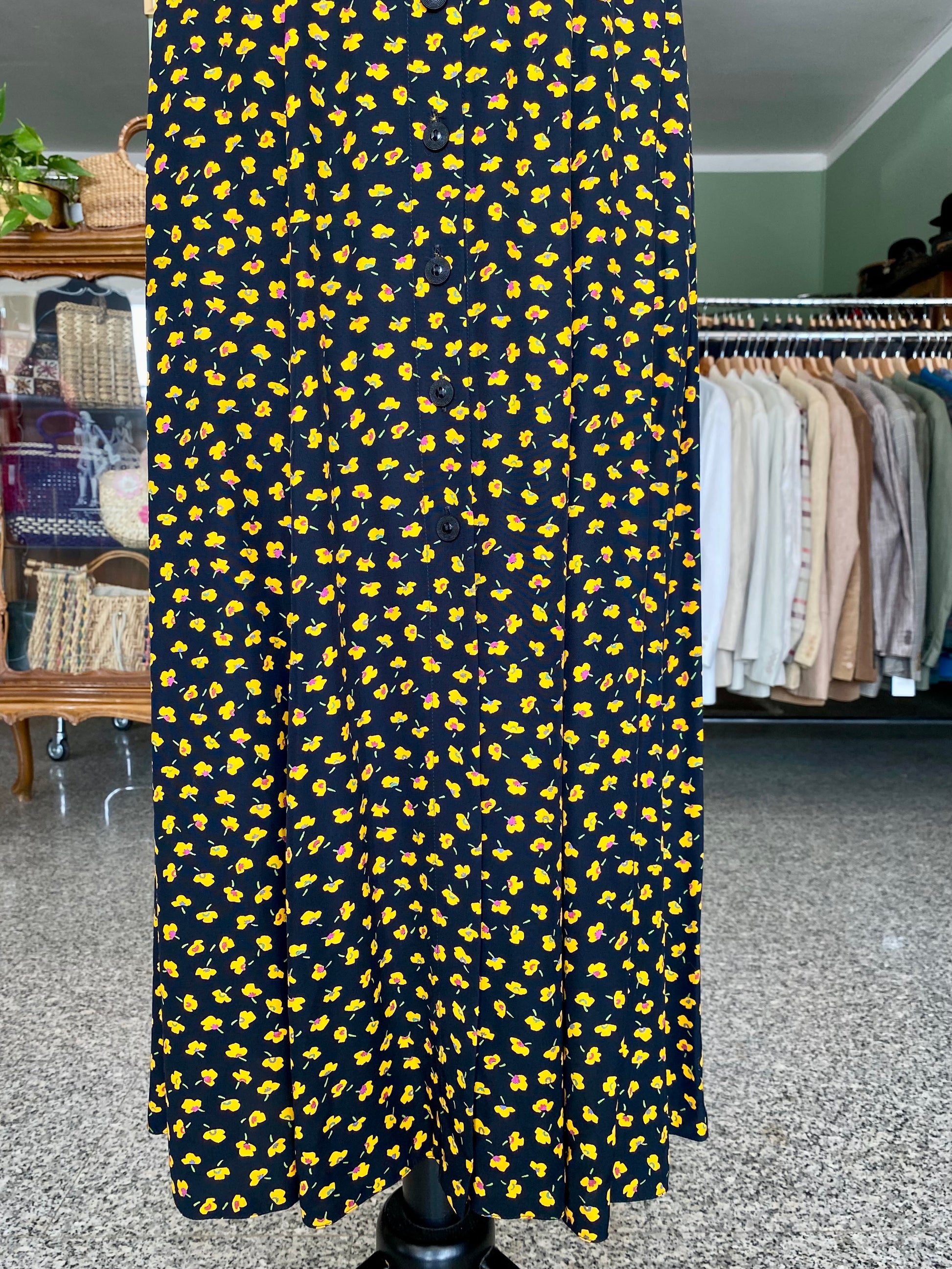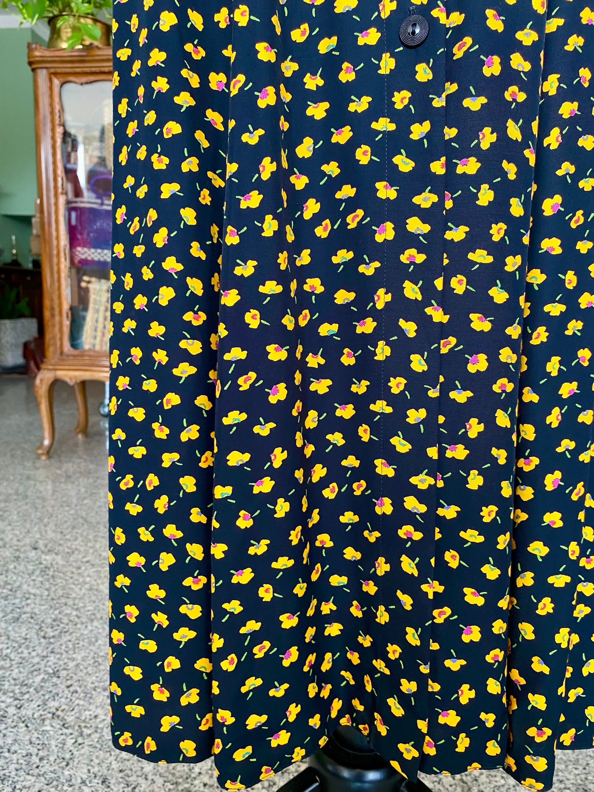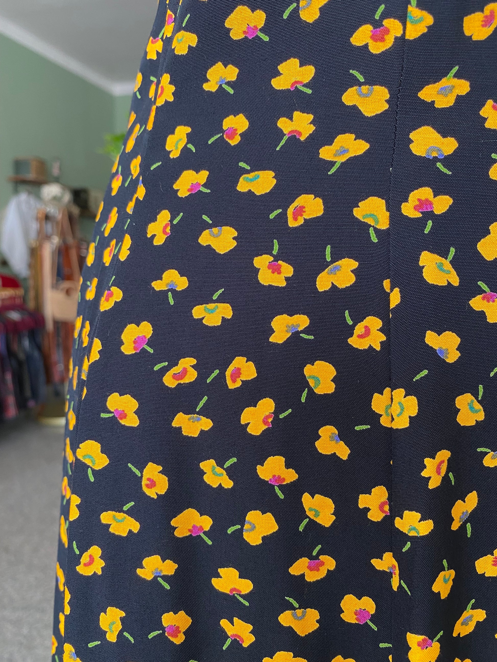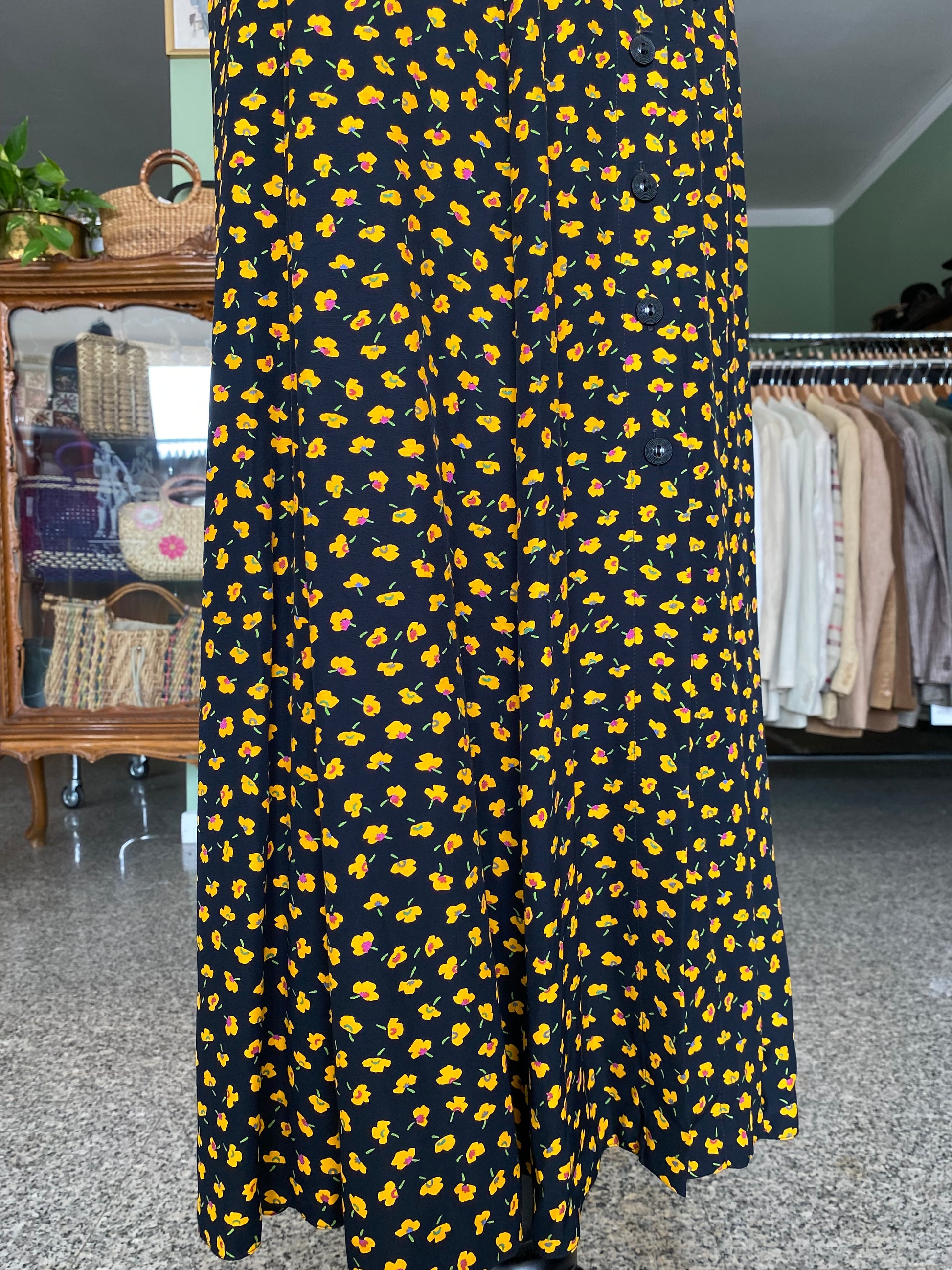 Questo abito anni ‘80 è un perfetto esempio di femminilità “all’italiana”: ha uno scollo ampio e generoso, valorizzato da un delicato laccetto, che esalta spalle e décolleté con naturale grazia. La stoffa è leggera, morbida, con una stampa di fiori gialli su sfondo scuro — un motivo vivace che spicca ma resta elegante.