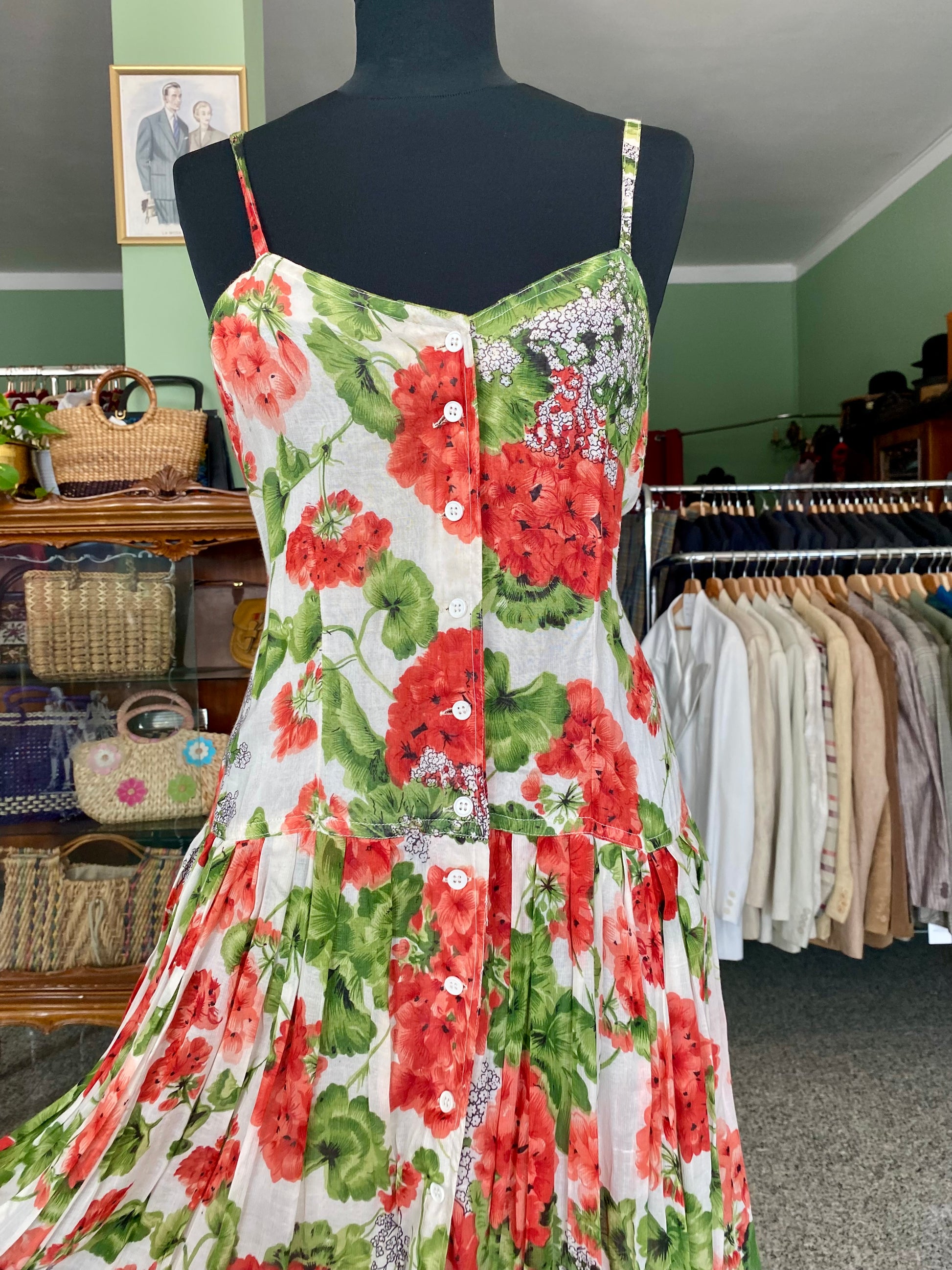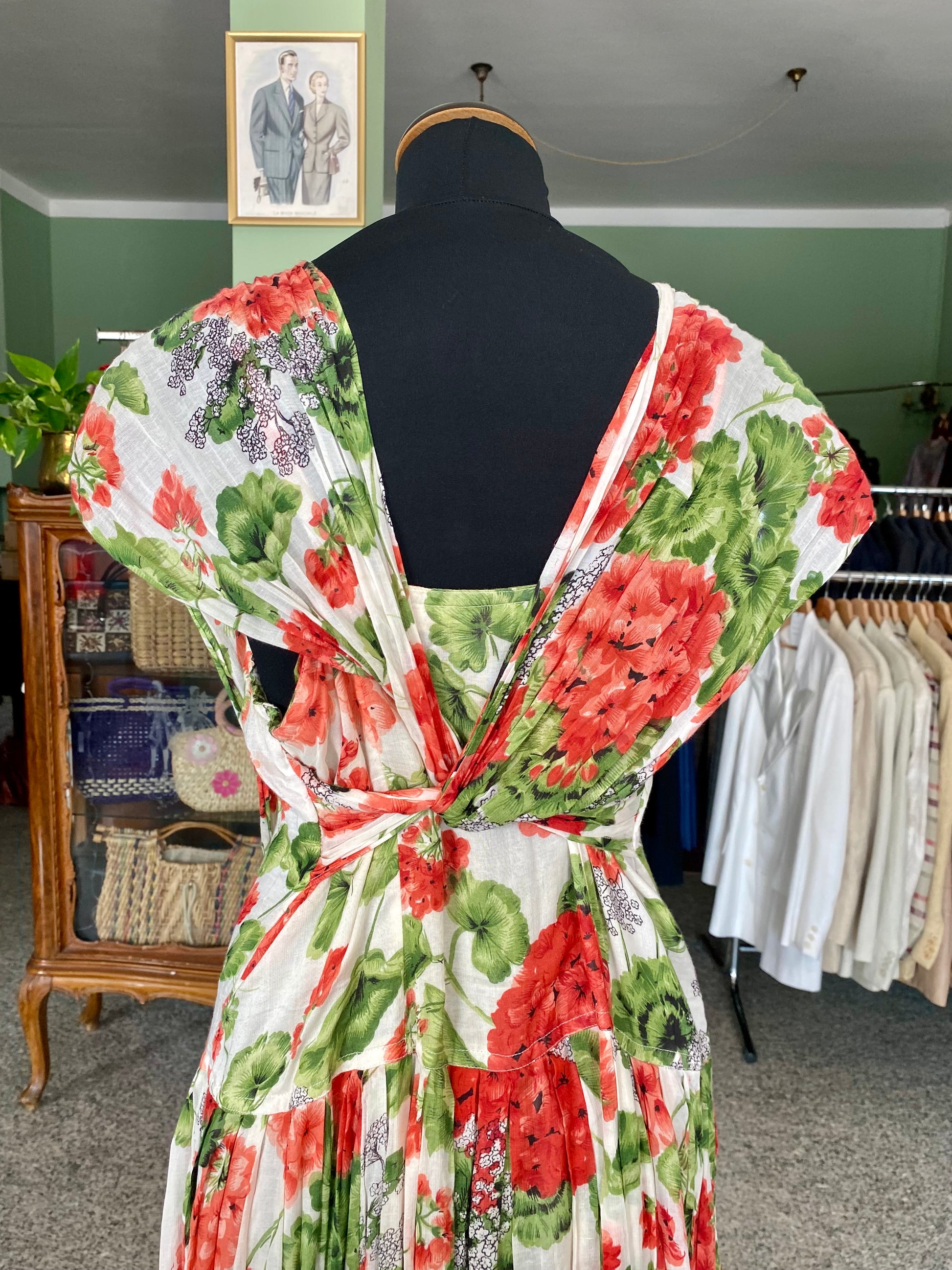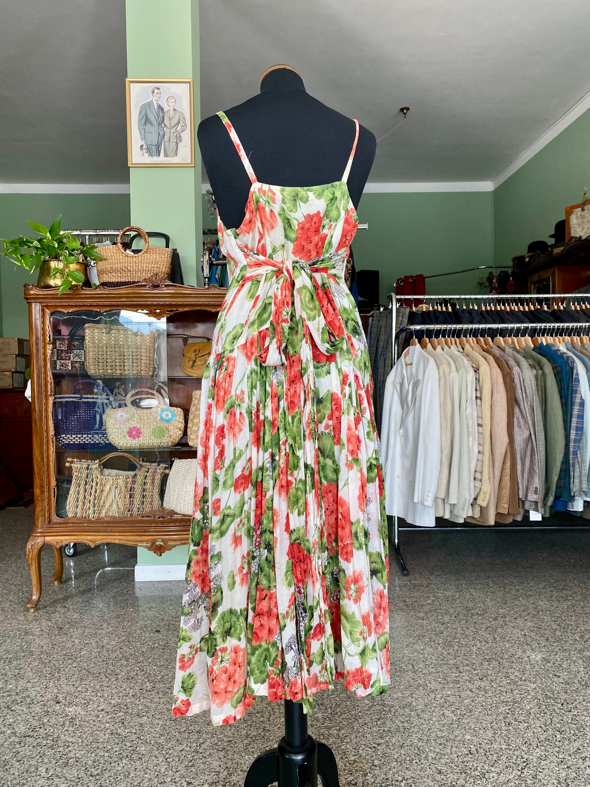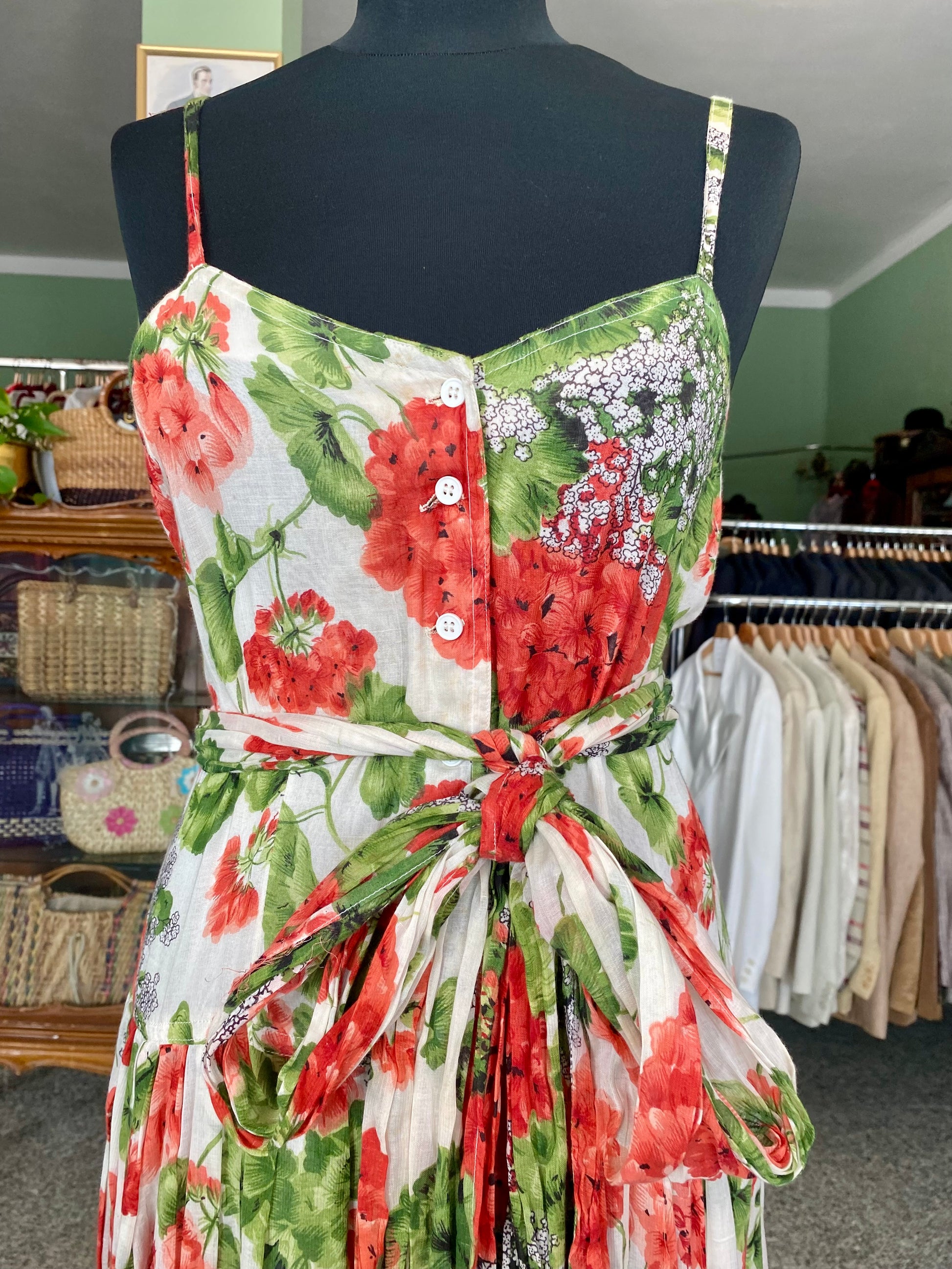 Un vero capolavoro estivo in mussola di cotone leggero, freschissimo e arioso, decorato da una fantasia floreale di gerani rossi e foglie verdi su fondo chiaro, che sprigiona tutta l’allegria dell’estate italiana. La linea è morbida e femminile, con bottoncini delicati e una gonna ampia che ondeggia con grazia ad ogni passo. Il dettaglio più sorprendente sono i lunghi lacci sul retro: si possono annodare in un romantico fiocco dietro, portare sul davanti per segnare la vita o usare come leggero coprispalle, lasciandoli ricadere sulle braccia come un drappo impalpabile. Un abito che incanta e fa sognare di passeggiate tra fiori e sole.
