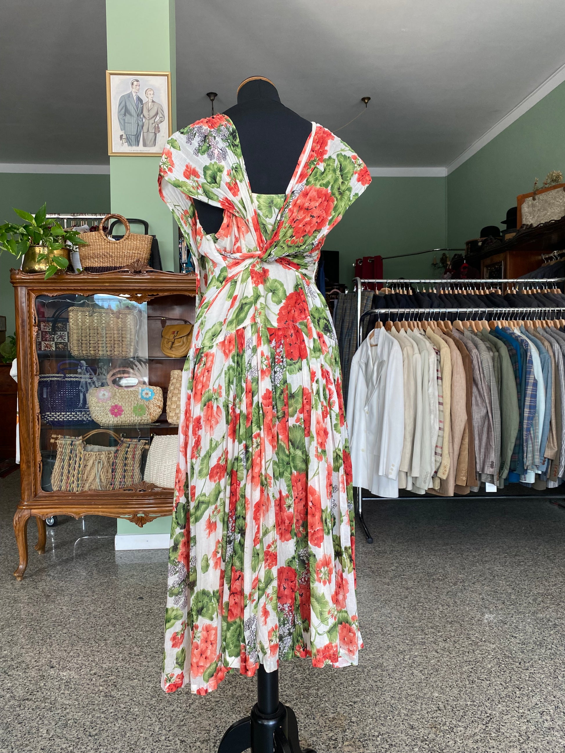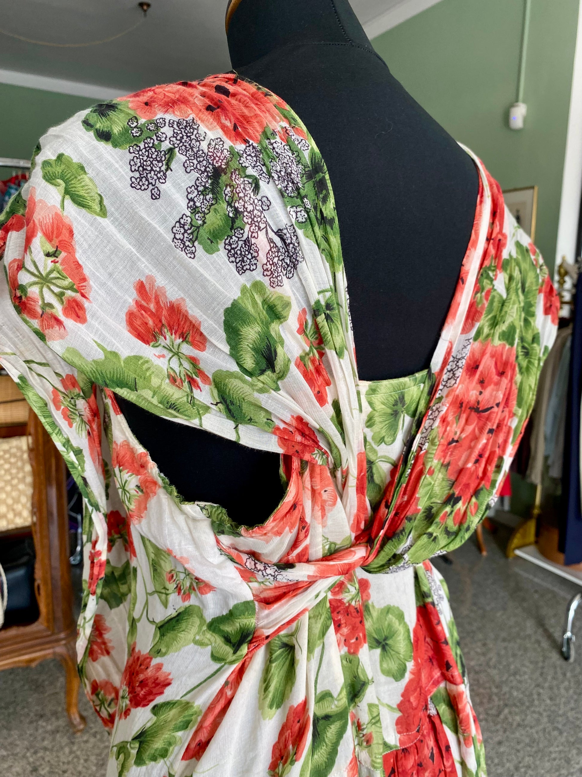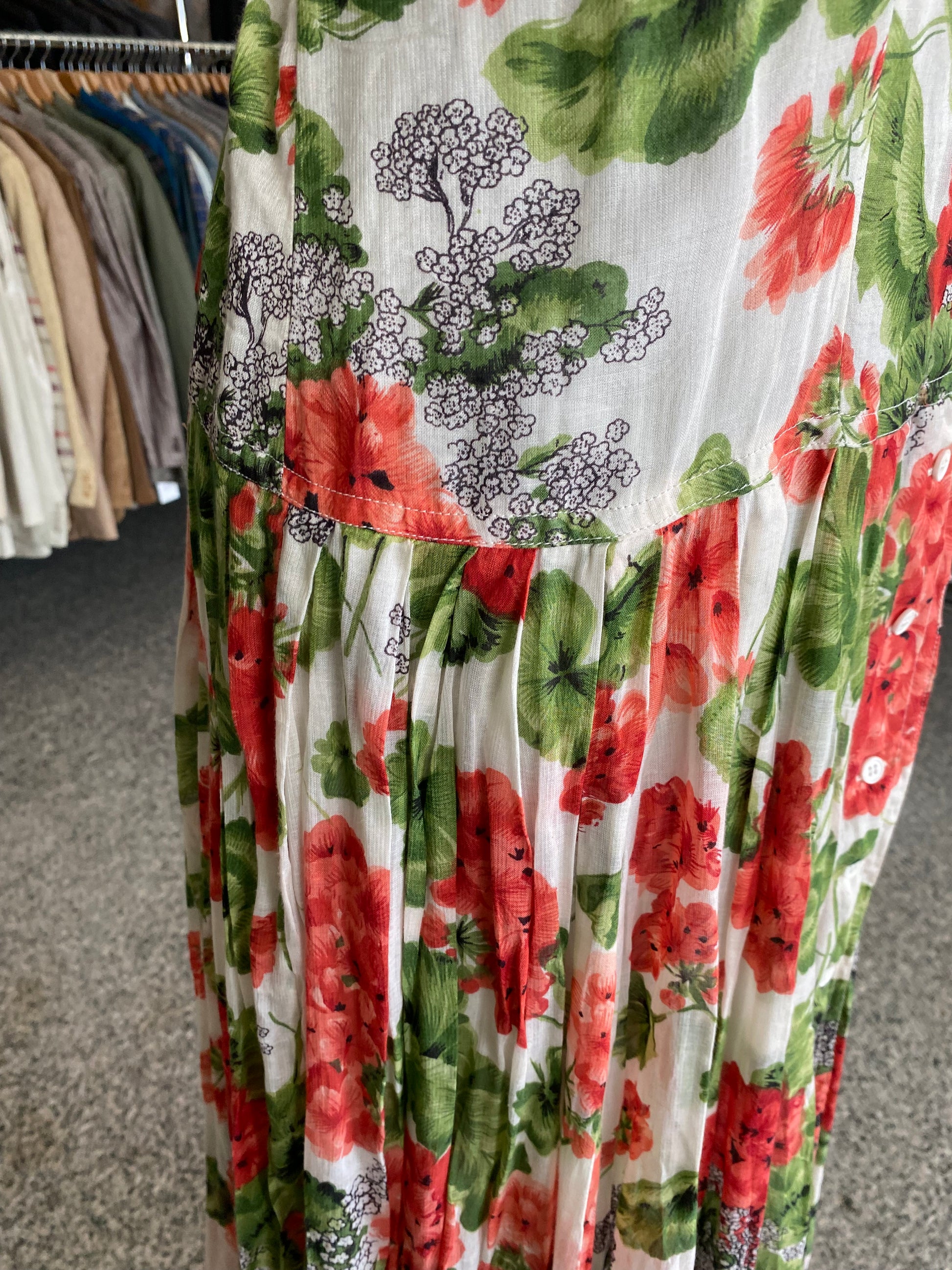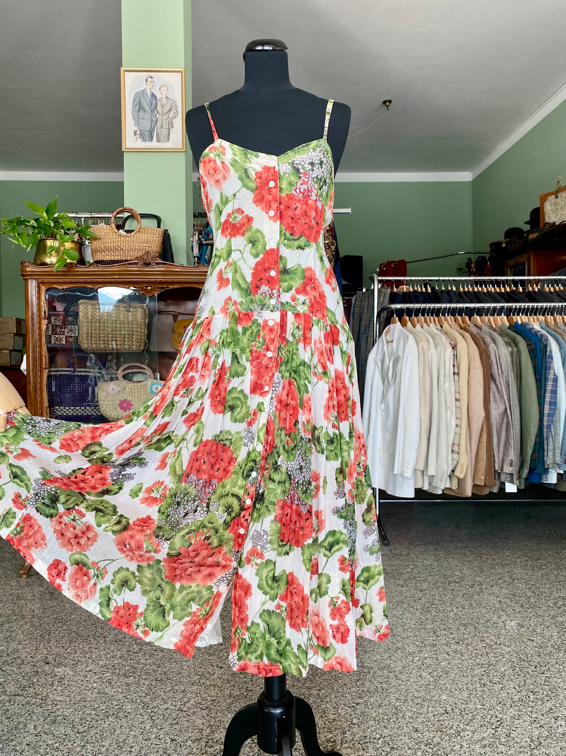 Un vero capolavoro estivo in mussola di cotone leggero, freschissimo e arioso, decorato da una fantasia floreale di gerani rossi e foglie verdi su fondo chiaro, che sprigiona tutta l’allegria dell’estate italiana. La linea è morbida e femminile, con bottoncini delicati e una gonna ampia che ondeggia con grazia ad ogni passo. Il dettaglio più sorprendente sono i lunghi lacci sul retro: si possono annodare in un romantico fiocco dietro, portare sul davanti per segnare la vita o usare come leggero coprispalle, lasciandoli ricadere sulle braccia come un drappo impalpabile. Un abito che incanta e fa sognare di passeggiate tra fiori e sole.