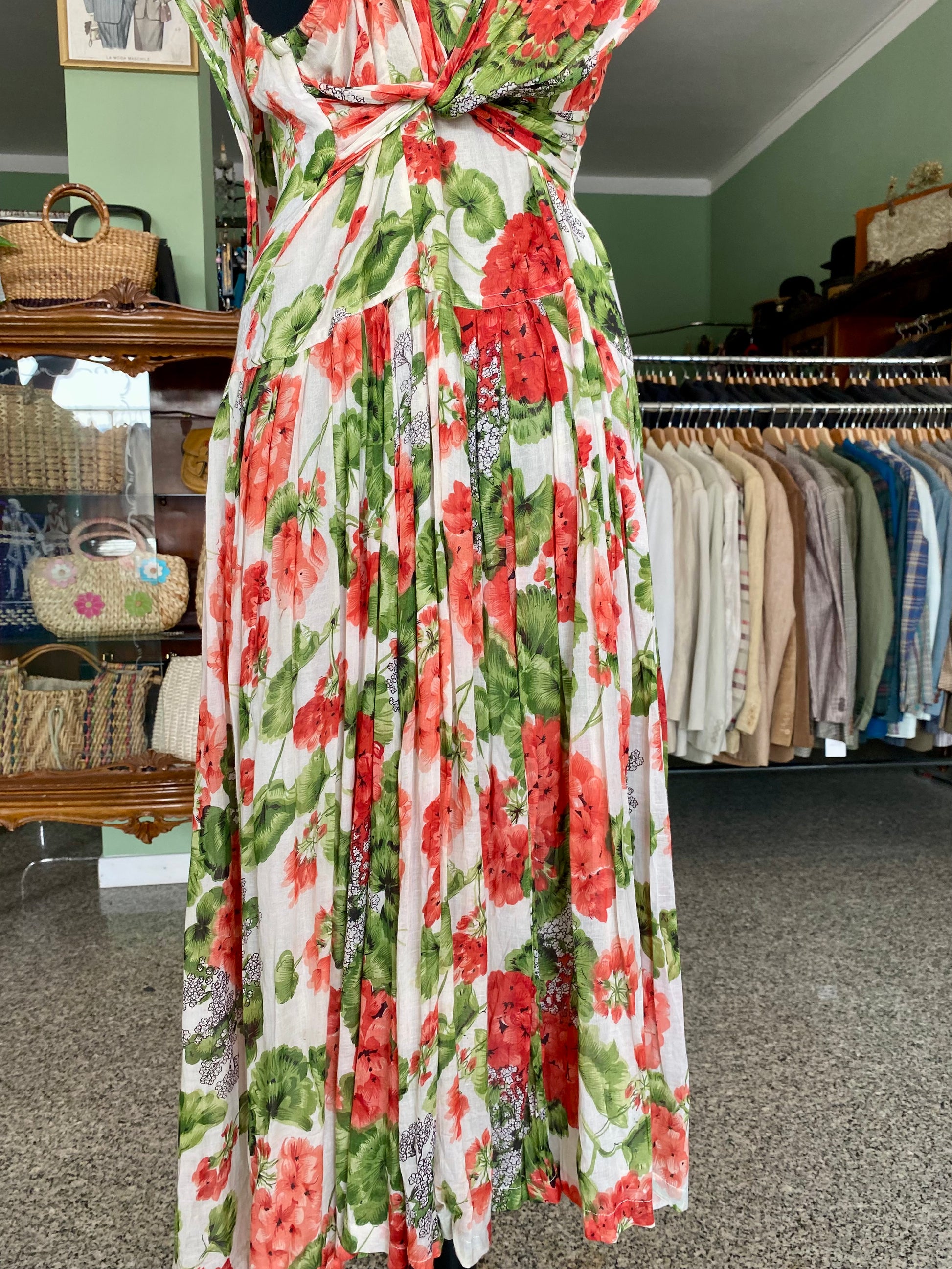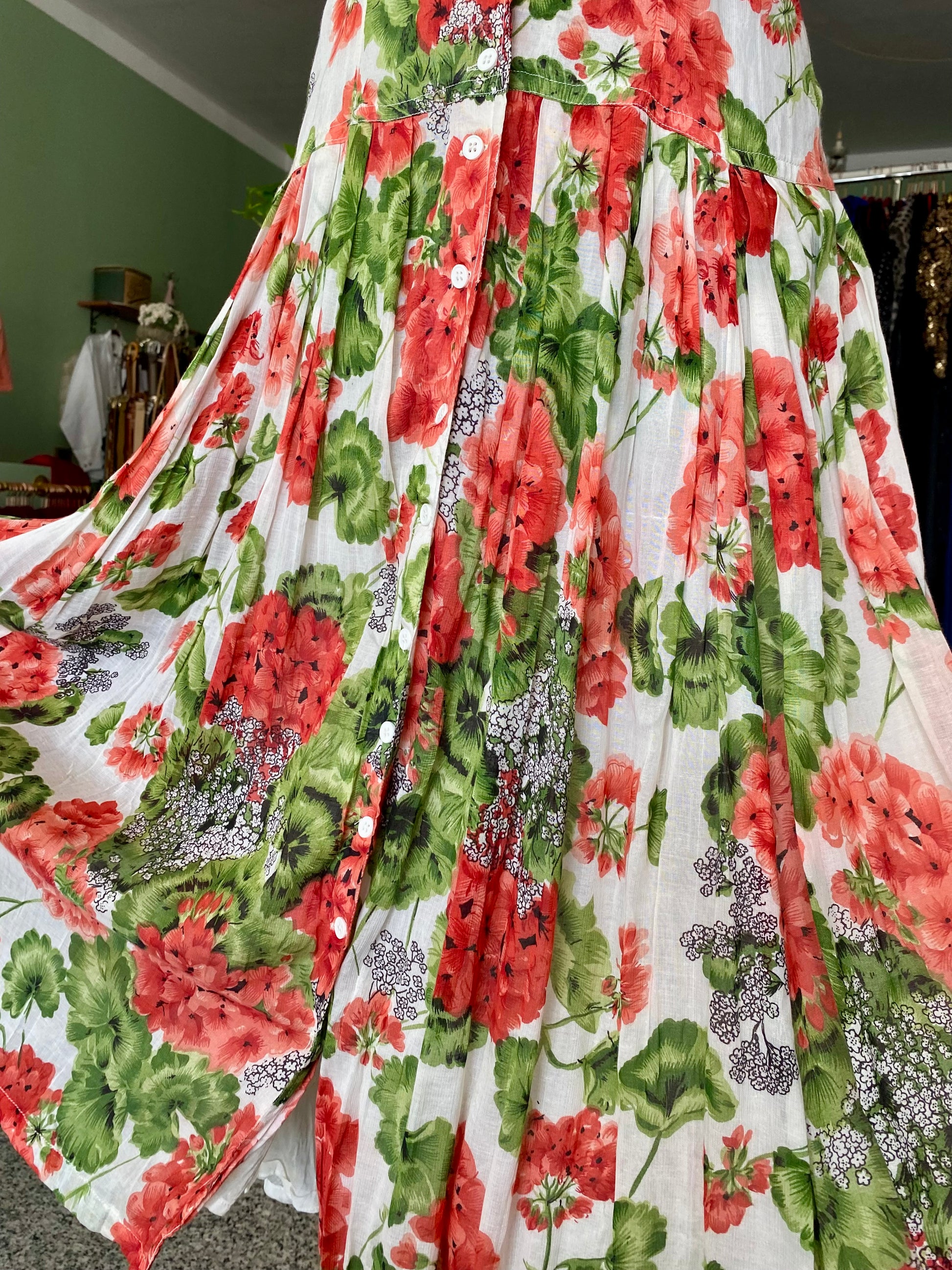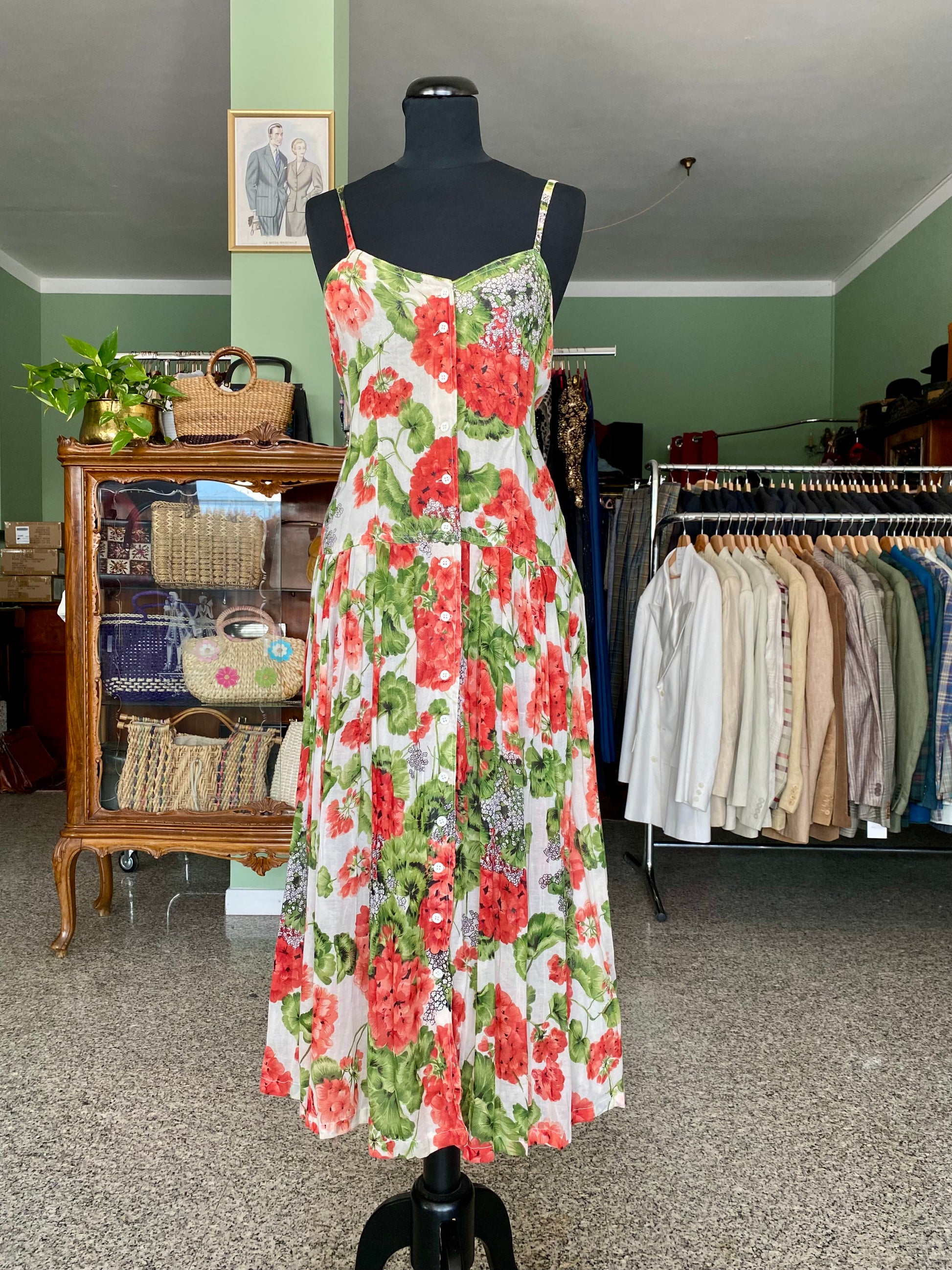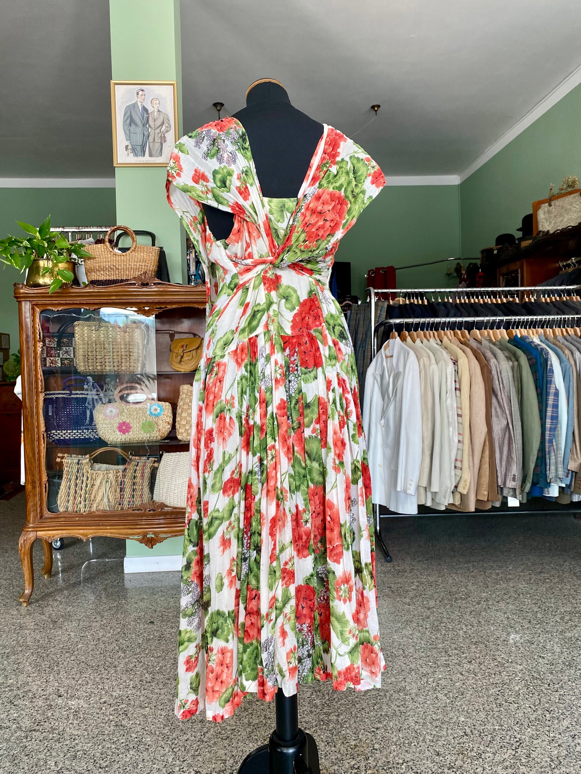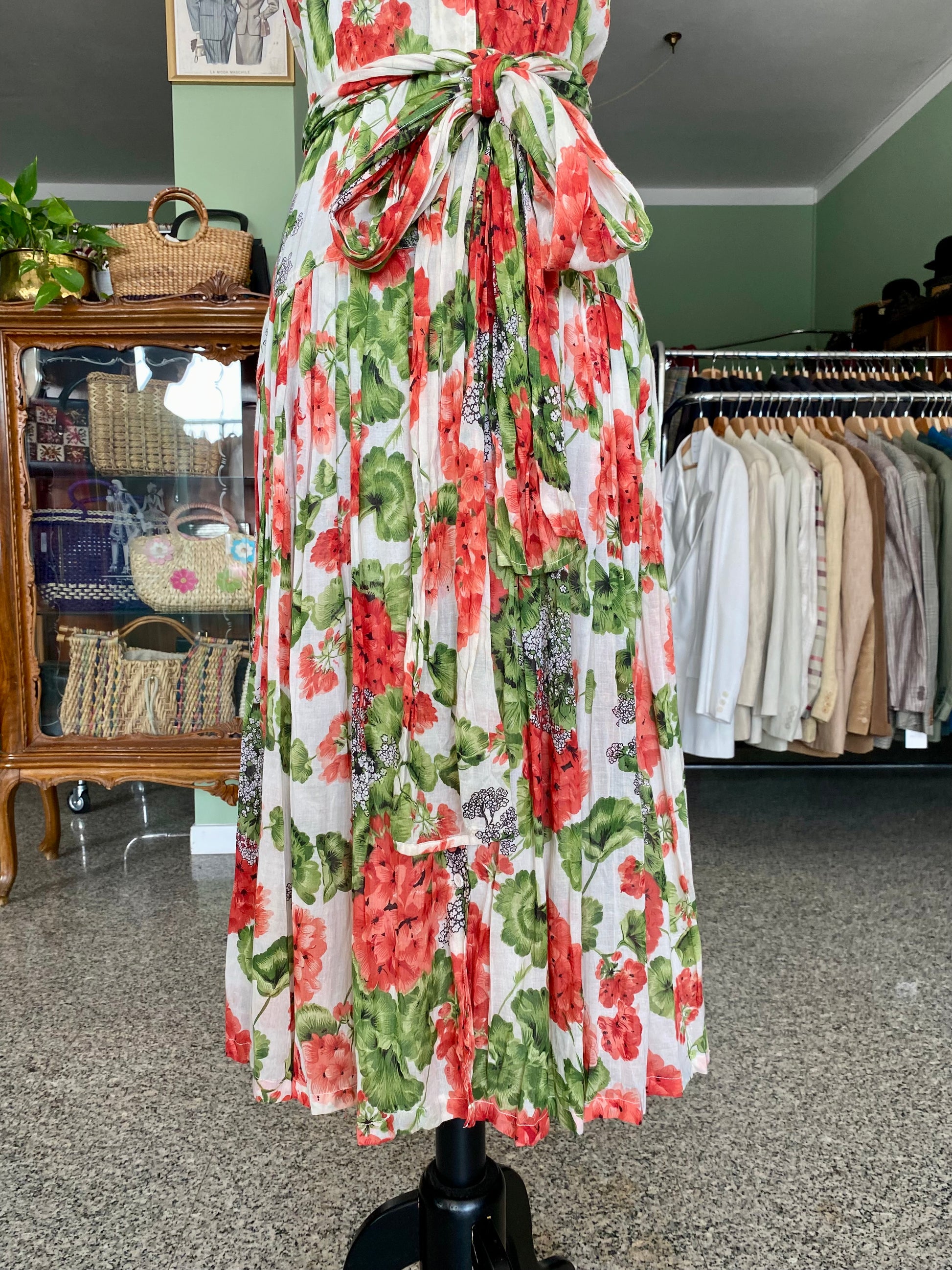 Un vero capolavoro estivo in mussola di cotone leggero, freschissimo e arioso, decorato da una fantasia floreale di gerani rossi e foglie verdi su fondo chiaro, che sprigiona tutta l’allegria dell’estate italiana. La linea è morbida e femminile, con bottoncini delicati e una gonna ampia che ondeggia con grazia ad ogni passo. Il dettaglio più sorprendente sono i lunghi lacci sul retro: si possono annodare in un romantico fiocco dietro, portare sul davanti per segnare la vita o usare come leggero coprispalle, lasciandoli ricadere sulle braccia come un drappo impalpabile. Un abito che incanta e fa sognare di passeggiate tra fiori e sole.