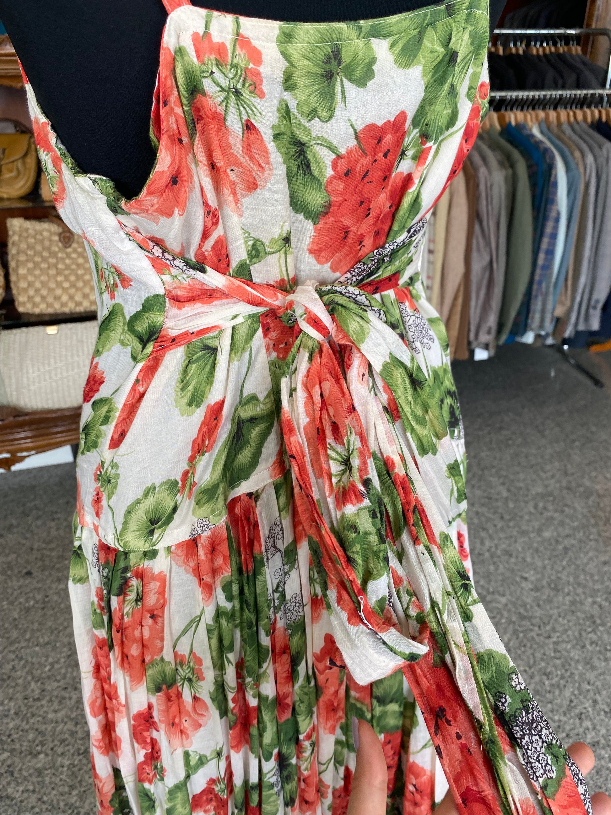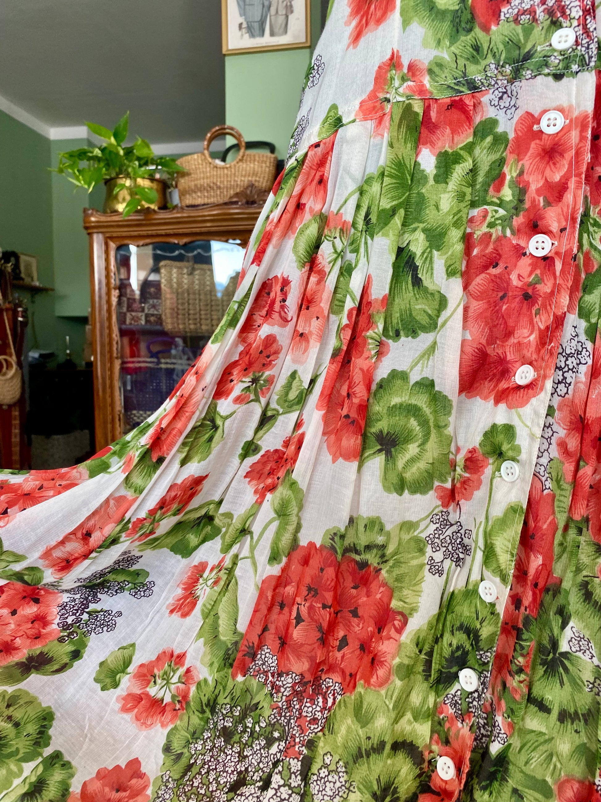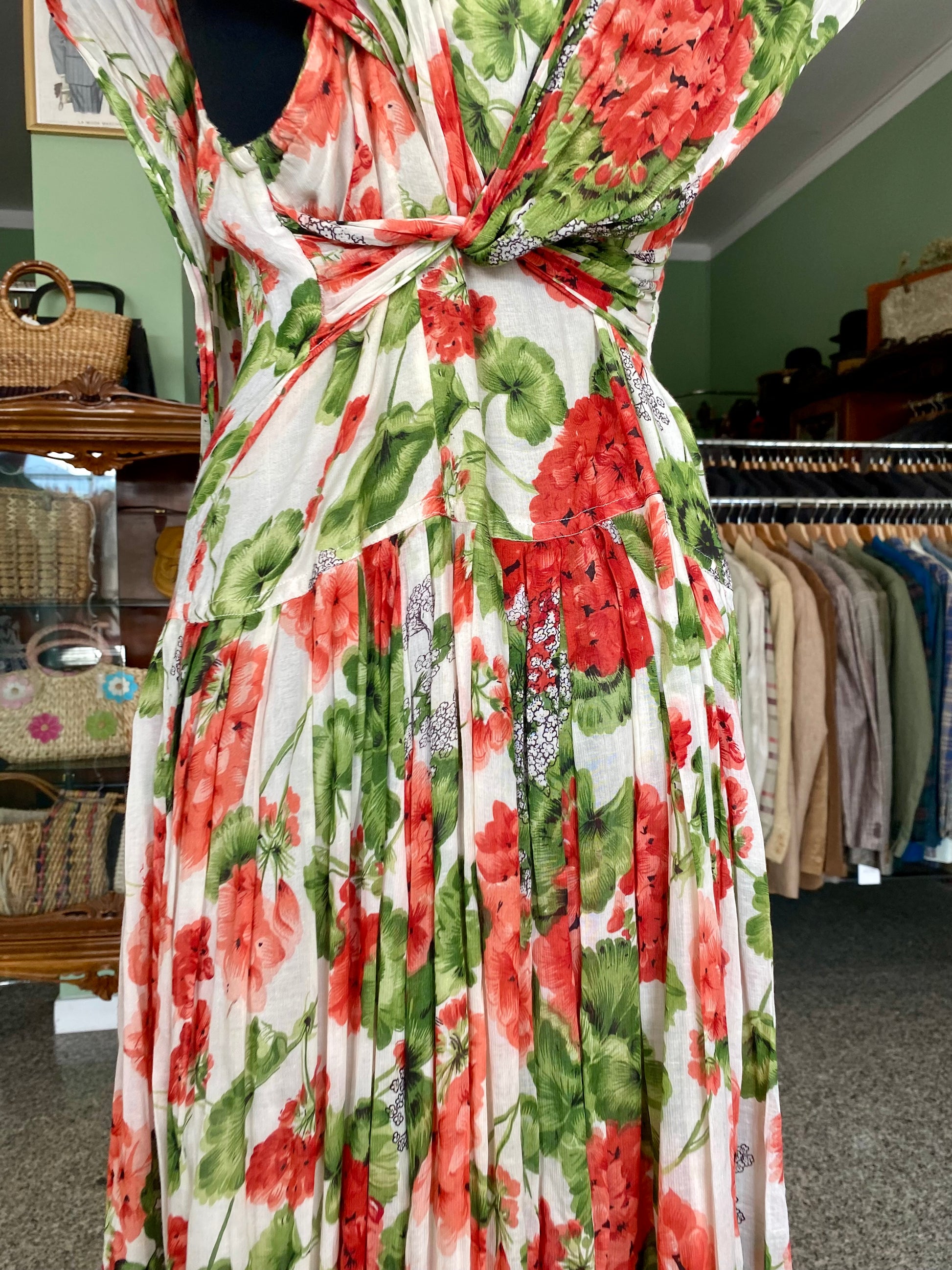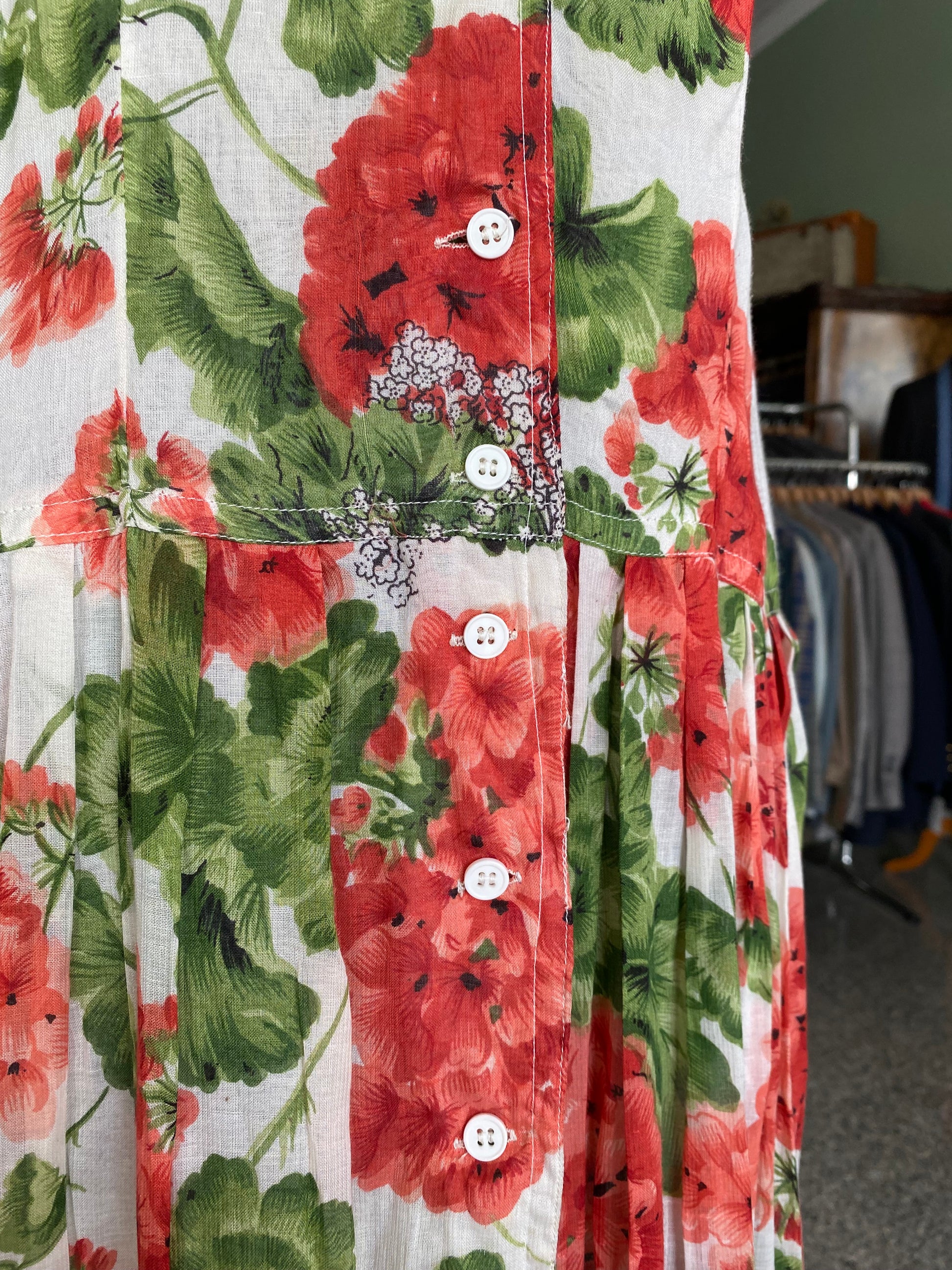 Un vero capolavoro estivo in mussola di cotone leggero, freschissimo e arioso, decorato da una fantasia floreale di gerani rossi e foglie verdi su fondo chiaro, che sprigiona tutta l’allegria dell’estate italiana. La linea è morbida e femminile, con bottoncini delicati e una gonna ampia che ondeggia con grazia ad ogni passo. Il dettaglio più sorprendente sono i lunghi lacci sul retro: si possono annodare in un romantico fiocco dietro, portare sul davanti per segnare la vita o usare come leggero coprispalle, lasciandoli ricadere sulle braccia come un drappo impalpabile. Un abito che incanta e fa sognare di passeggiate tra fiori e sole.