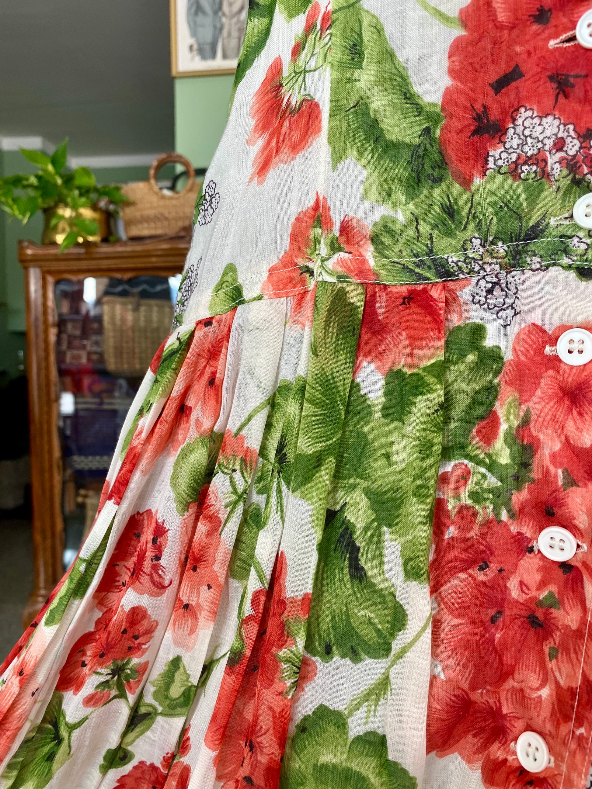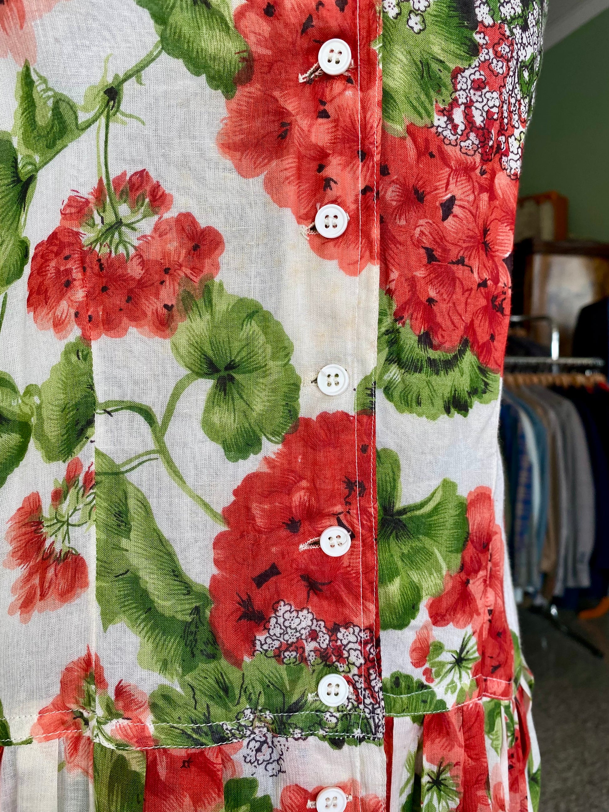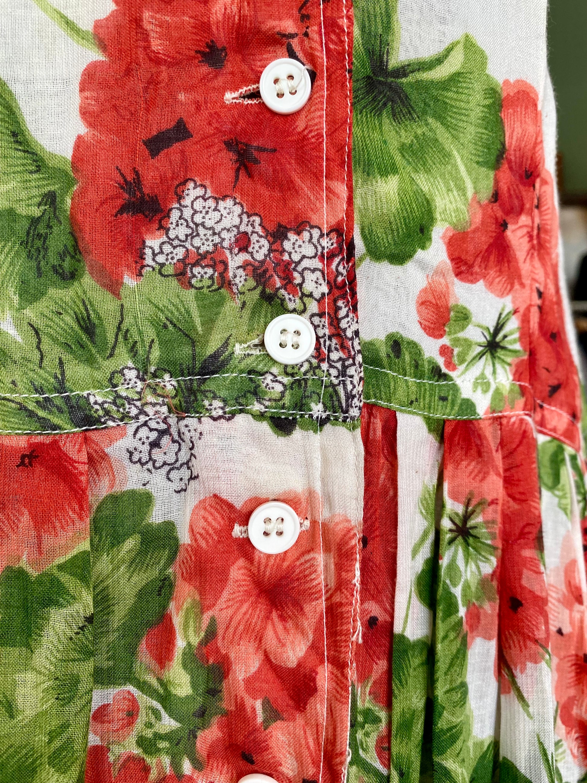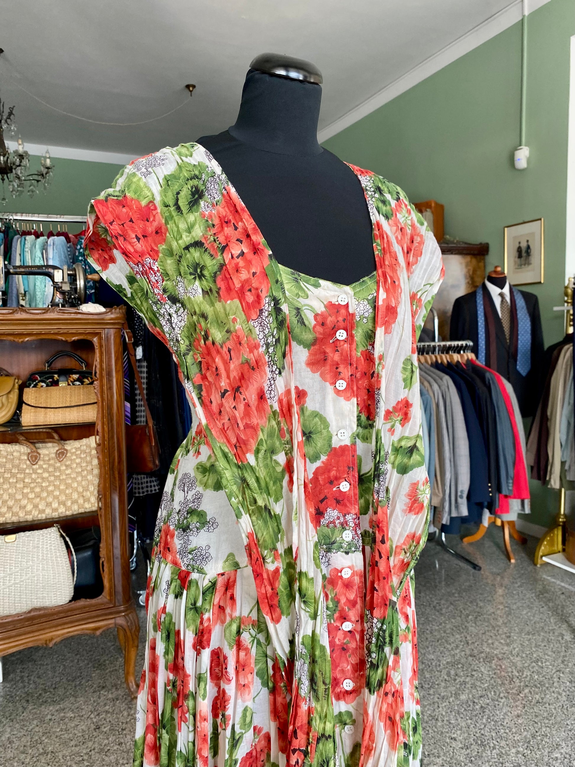 Un vero capolavoro estivo in mussola di cotone leggero, freschissimo e arioso, decorato da una fantasia floreale di gerani rossi e foglie verdi su fondo chiaro, che sprigiona tutta l’allegria dell’estate italiana. La linea è morbida e femminile, con bottoncini delicati e una gonna ampia che ondeggia con grazia ad ogni passo. Il dettaglio più sorprendente sono i lunghi lacci sul retro: si possono annodare in un romantico fiocco dietro, portare sul davanti per segnare la vita o usare come leggero coprispalle, lasciandoli ricadere sulle braccia come un drappo impalpabile. Un abito che incanta e fa sognare di passeggiate tra fiori e sole.