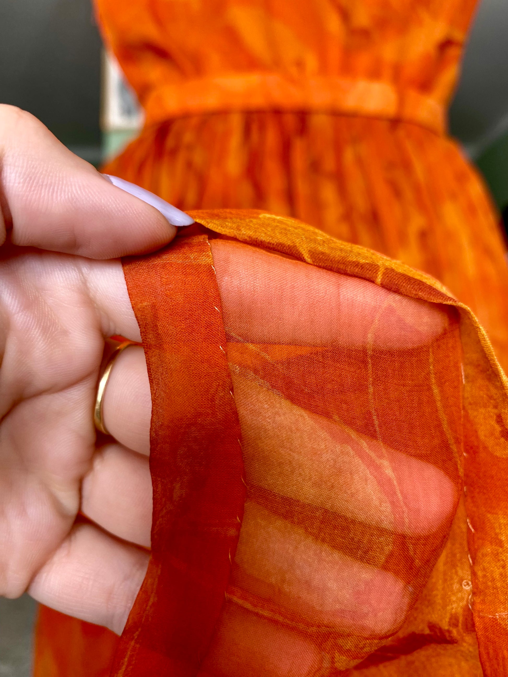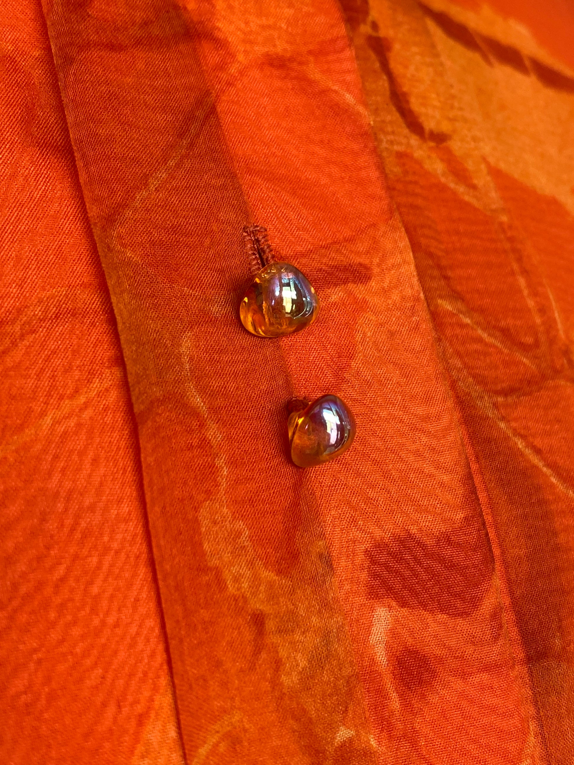 Abito anni ’60 sartoriale in organza di seta, interamente foderato, con gonna plissettata e colletto tondo dal gusto bon ton. Il punto vita è segnato da una cintura nello stesso tessuto, mentre il corpetto è impreziosito da delicati bottoni gioiello lucidi. Il motivo astratto tono su tono in arancio bruciato dona luce e carattere a un capo femminile e raro