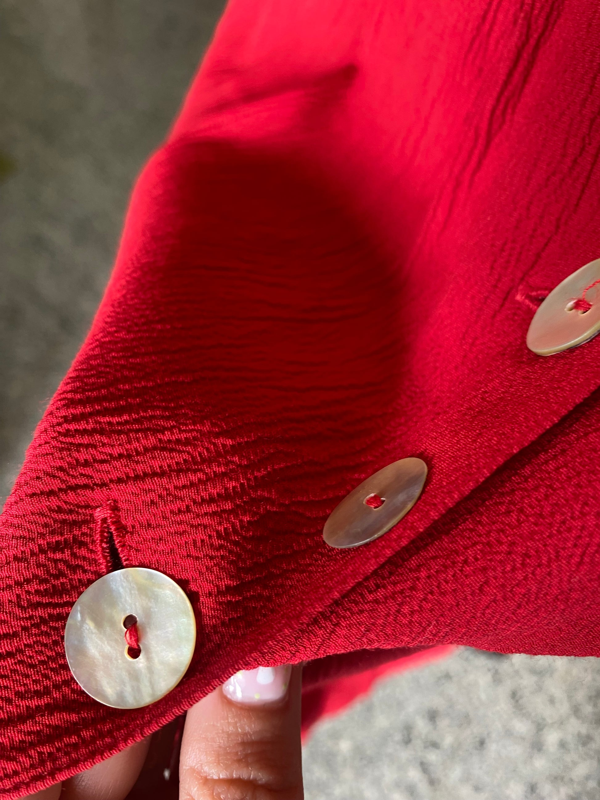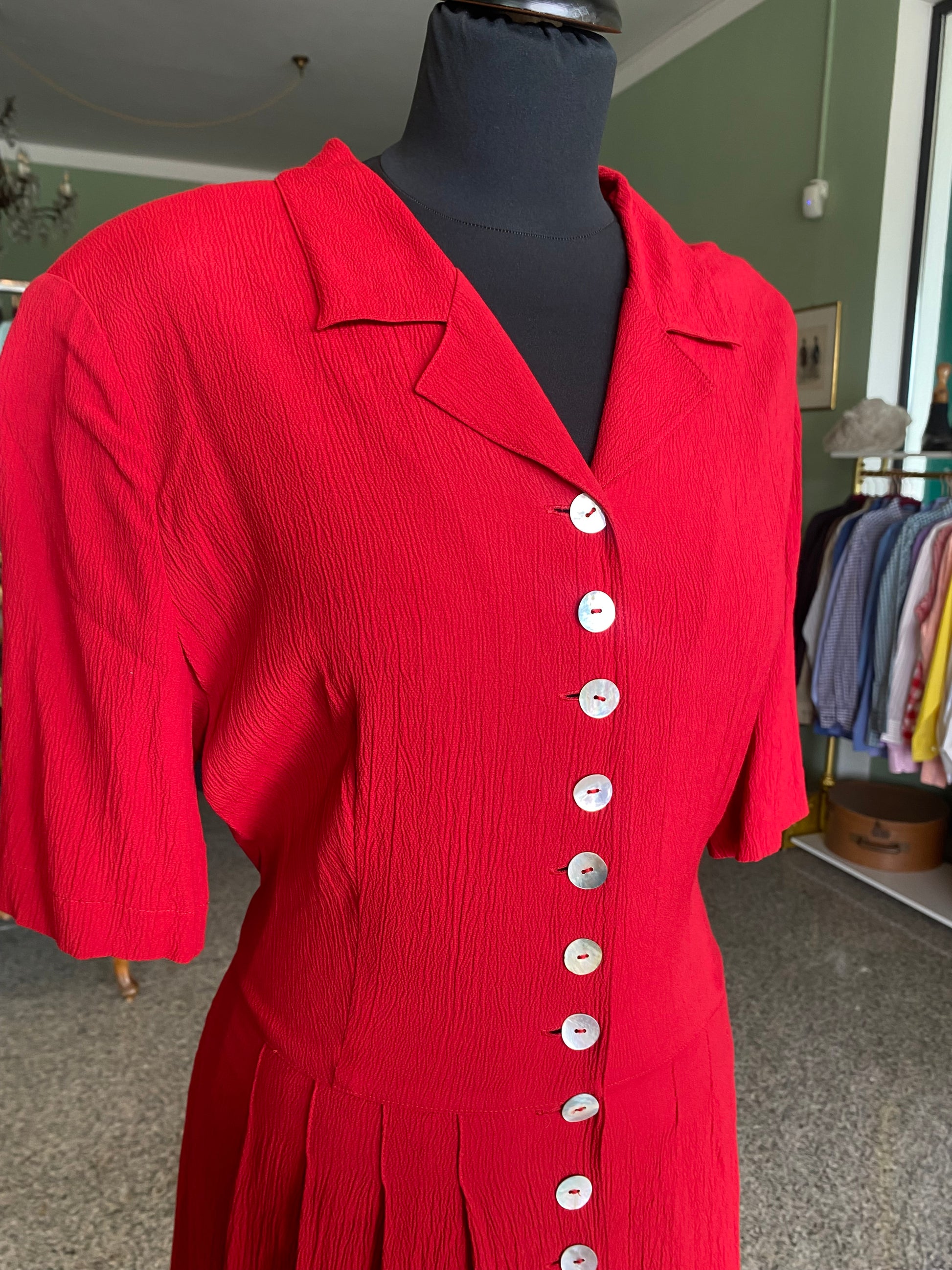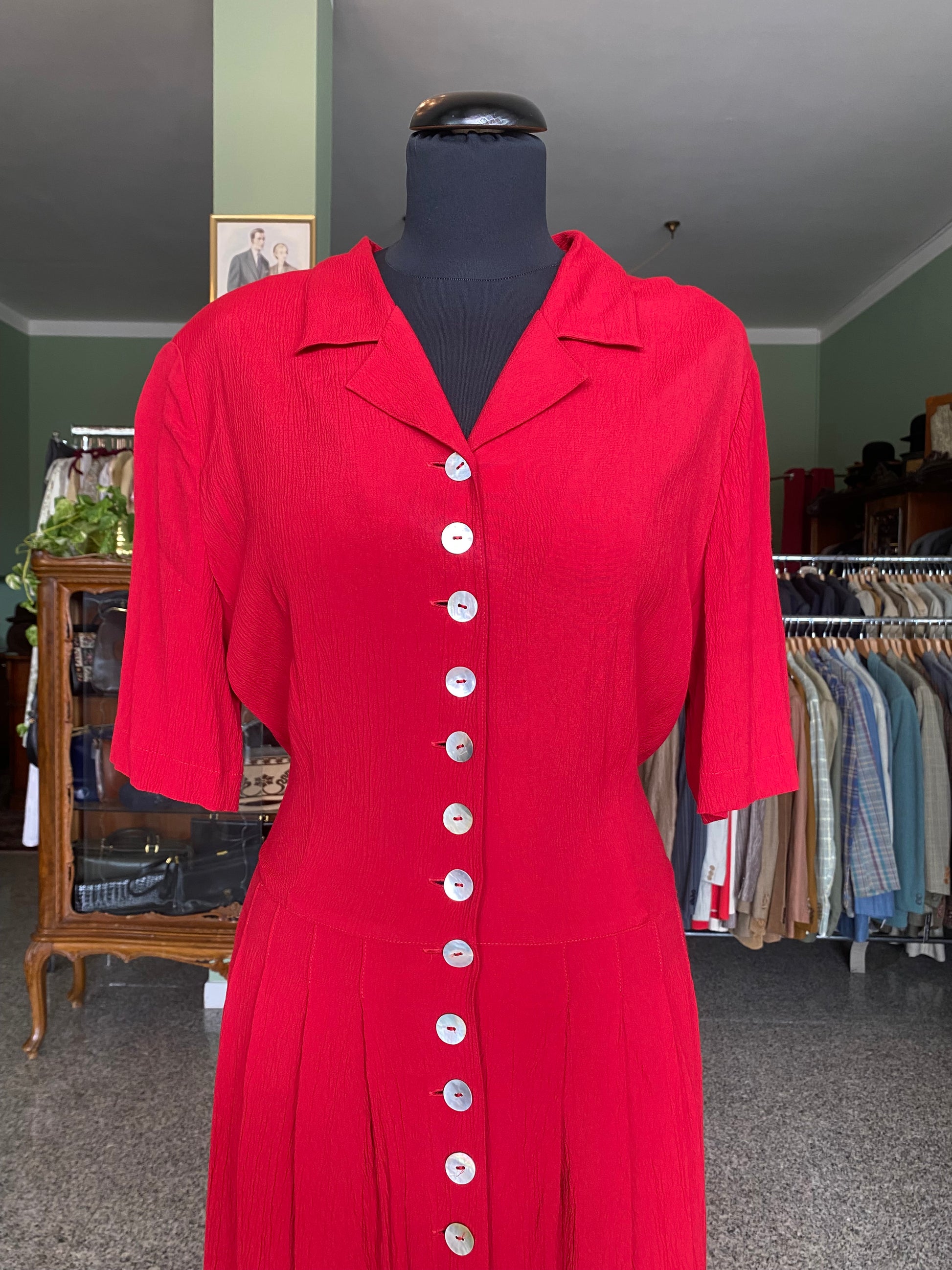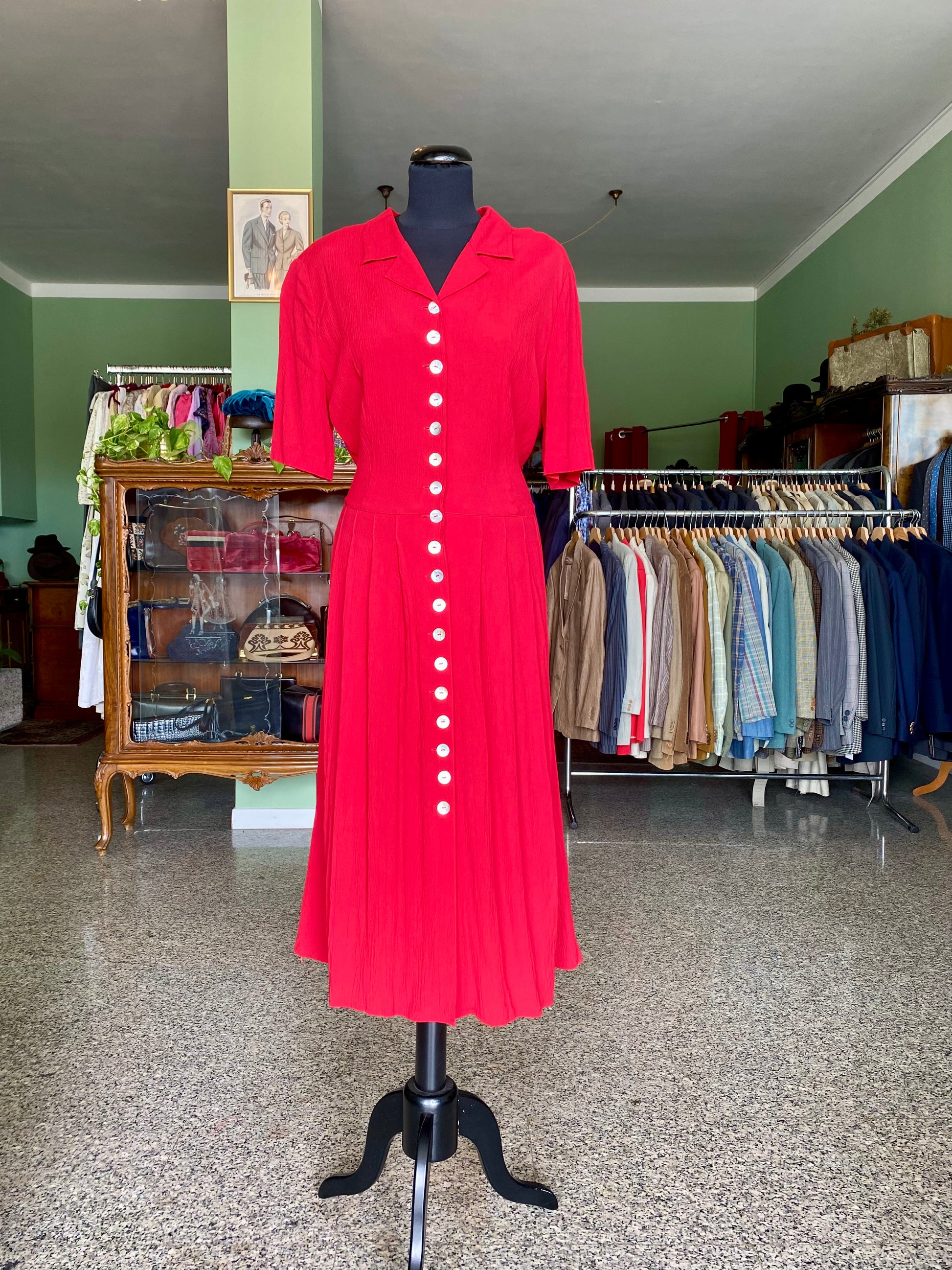 Abito anni '80 rosso in viscosa, con bottoni in madreperla sul davanti e coulisse regolabile sul retro. Modello a camicia con colletto classico, maniche corte morbide e gonna a pieghe leggere. Tessuto fluido e leggermente crespo, perfetto per un look fresco e femminile.