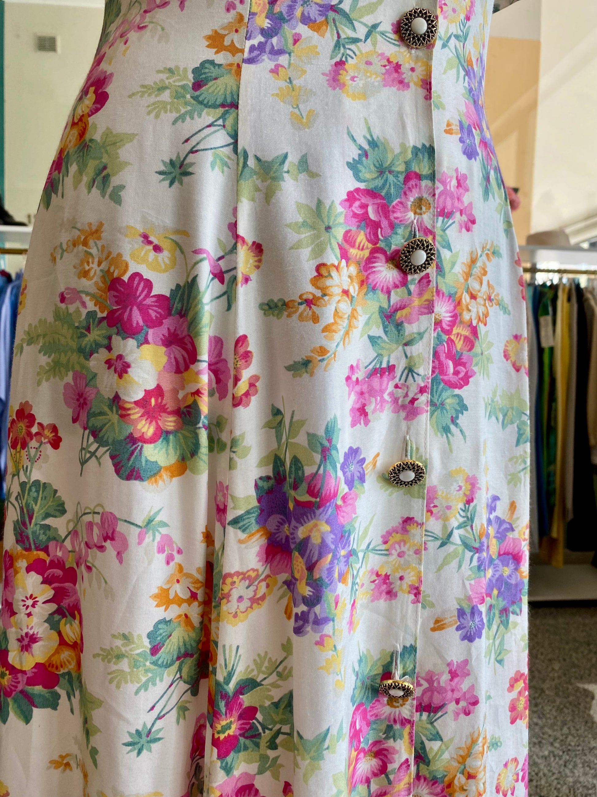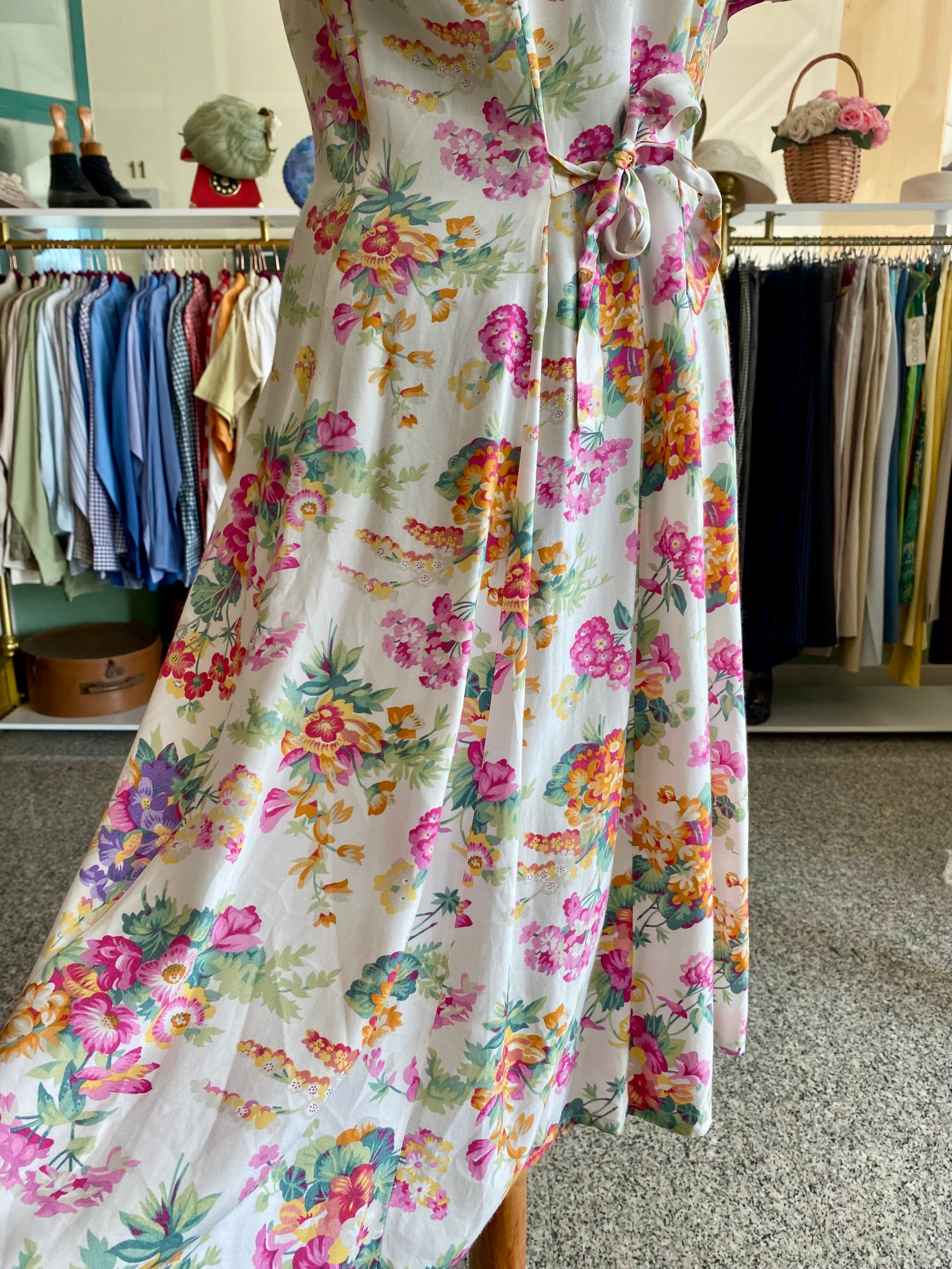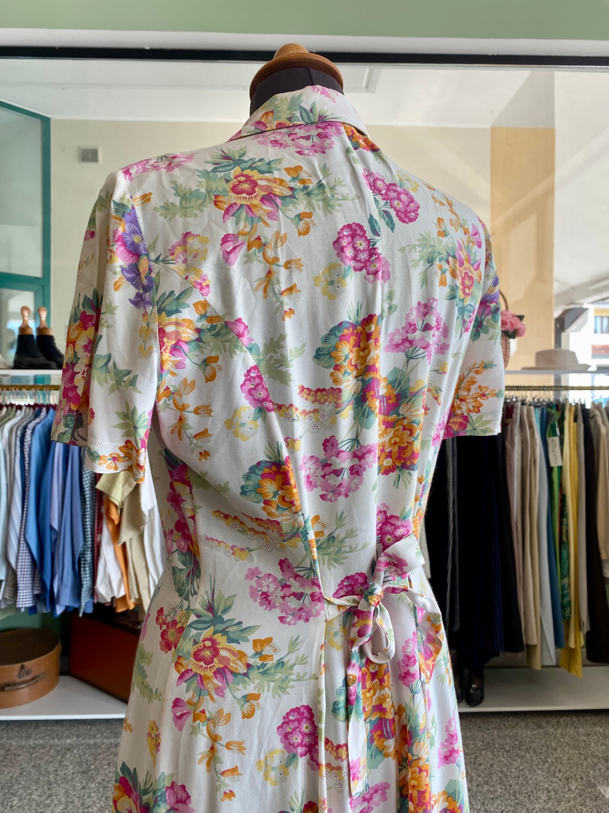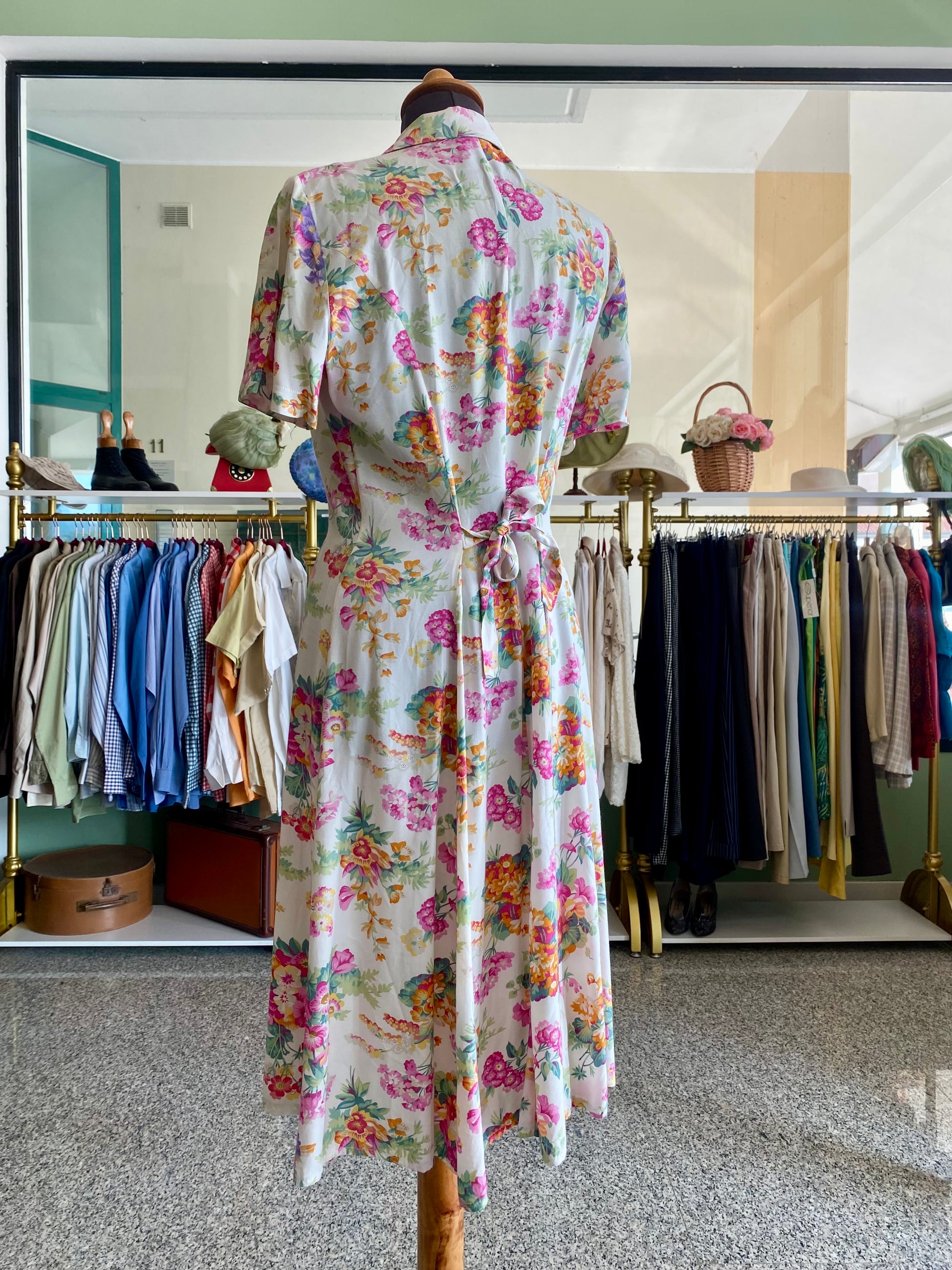 Abito anni '80/‘90 in fresca viscosa, con stampa floreale colorata su fondo bianco, bottoni decorativi e cintura da annodare sul retro. Un capo fresco e romantico, perfetto per l’estate.