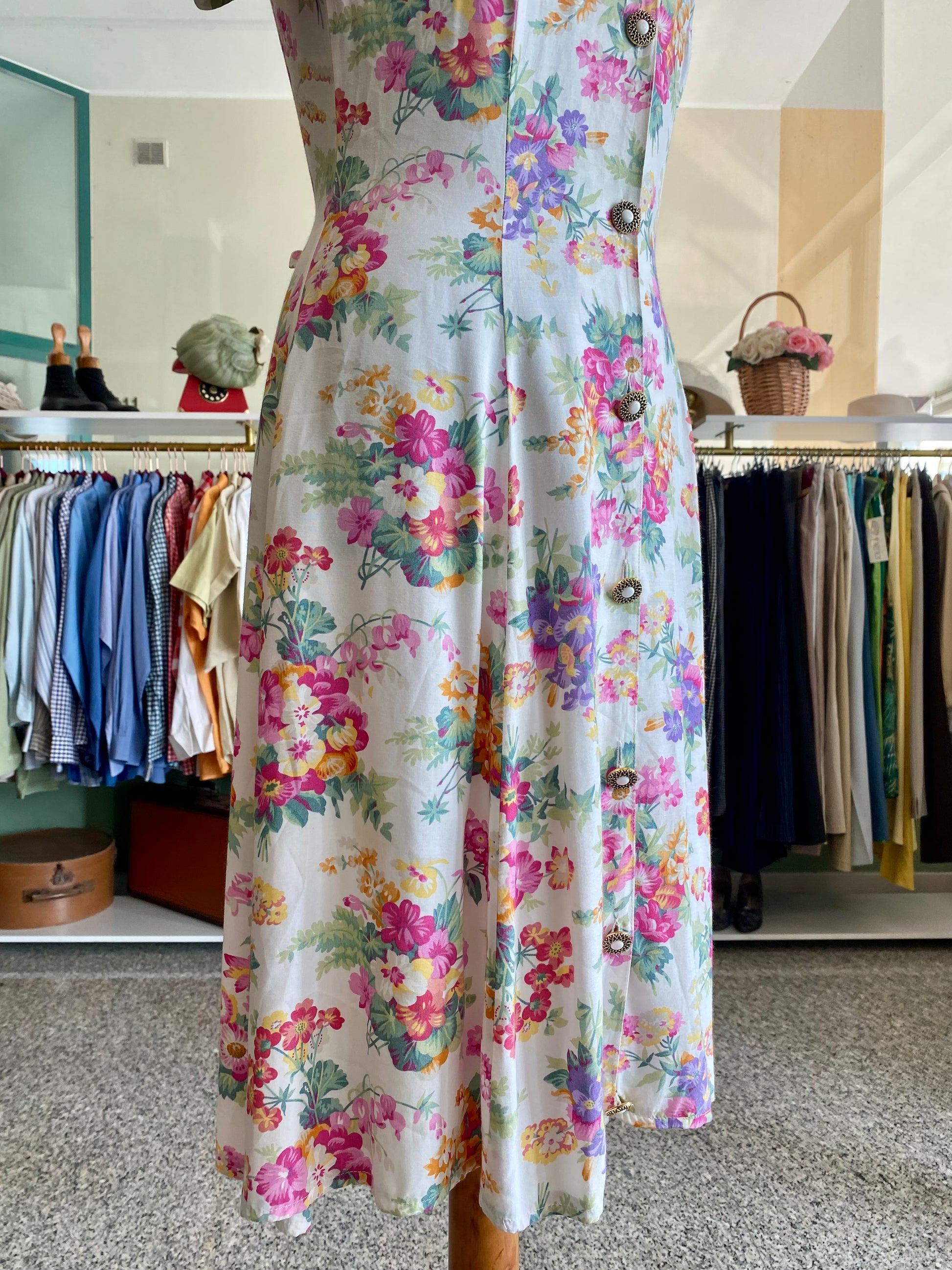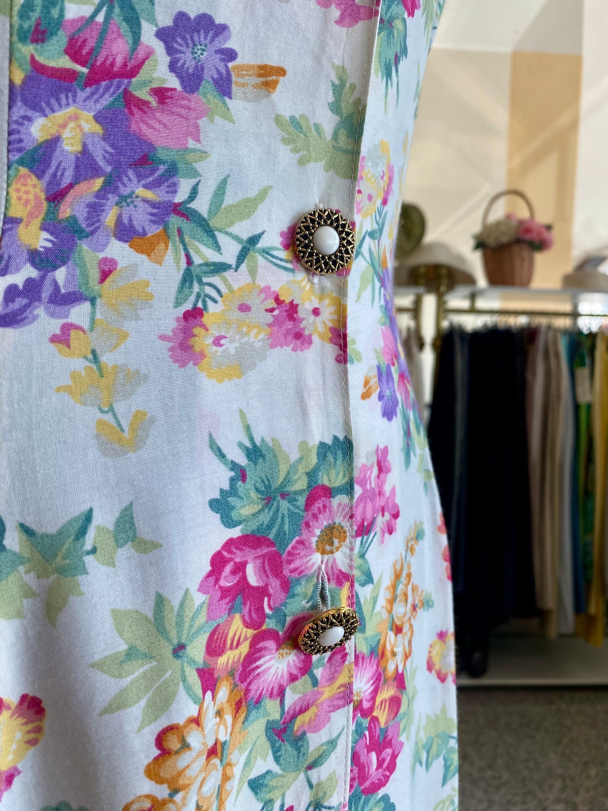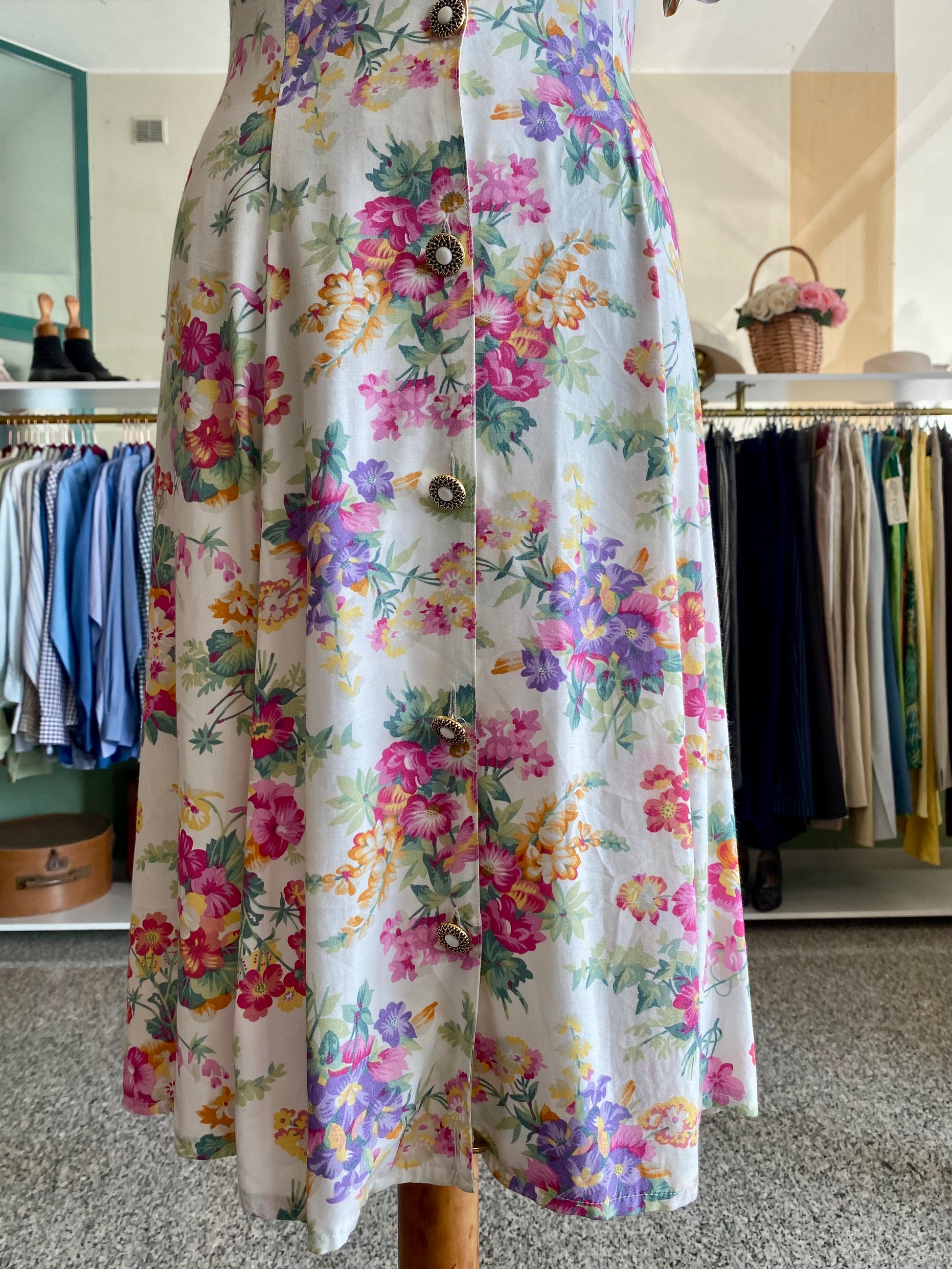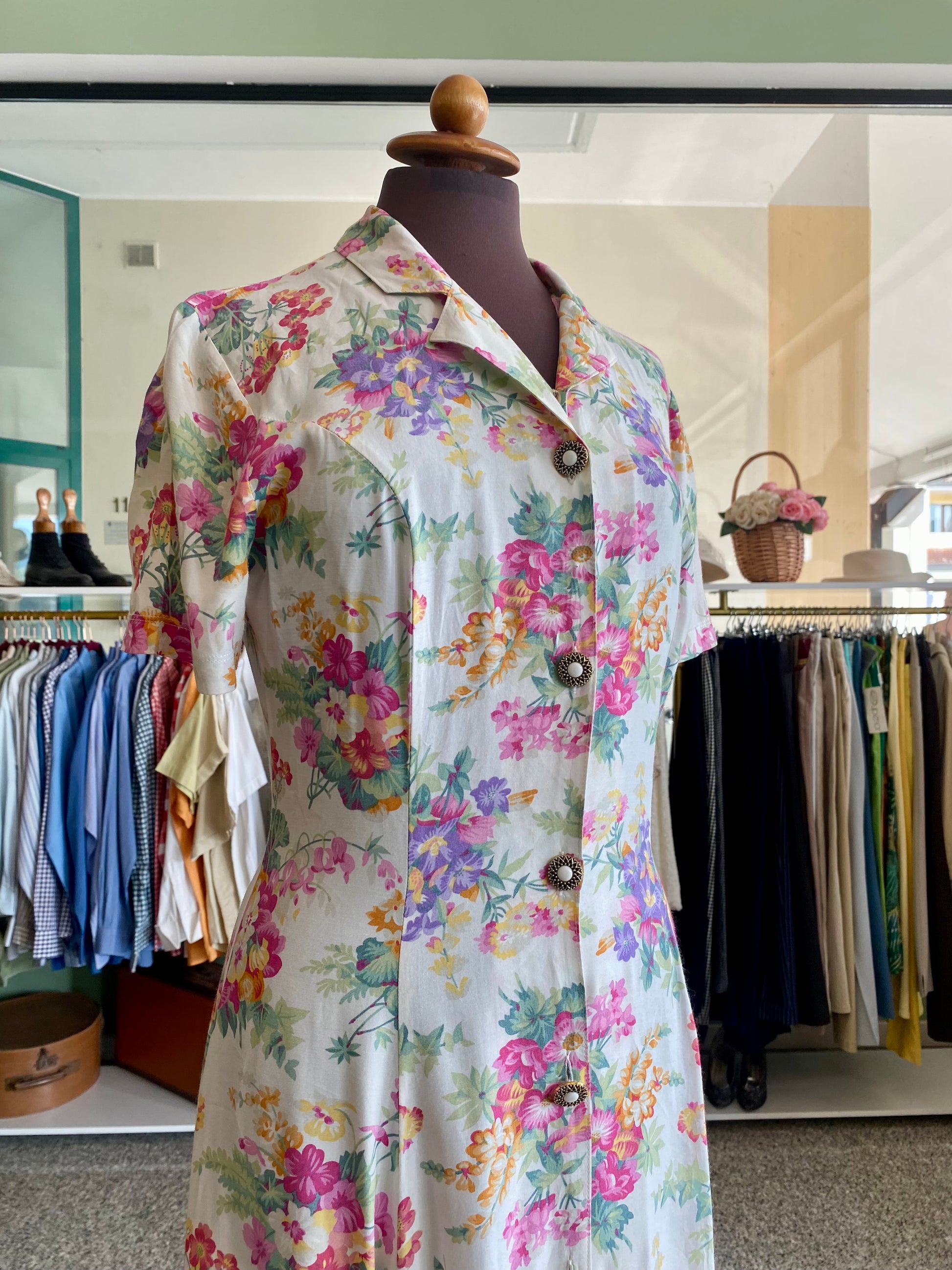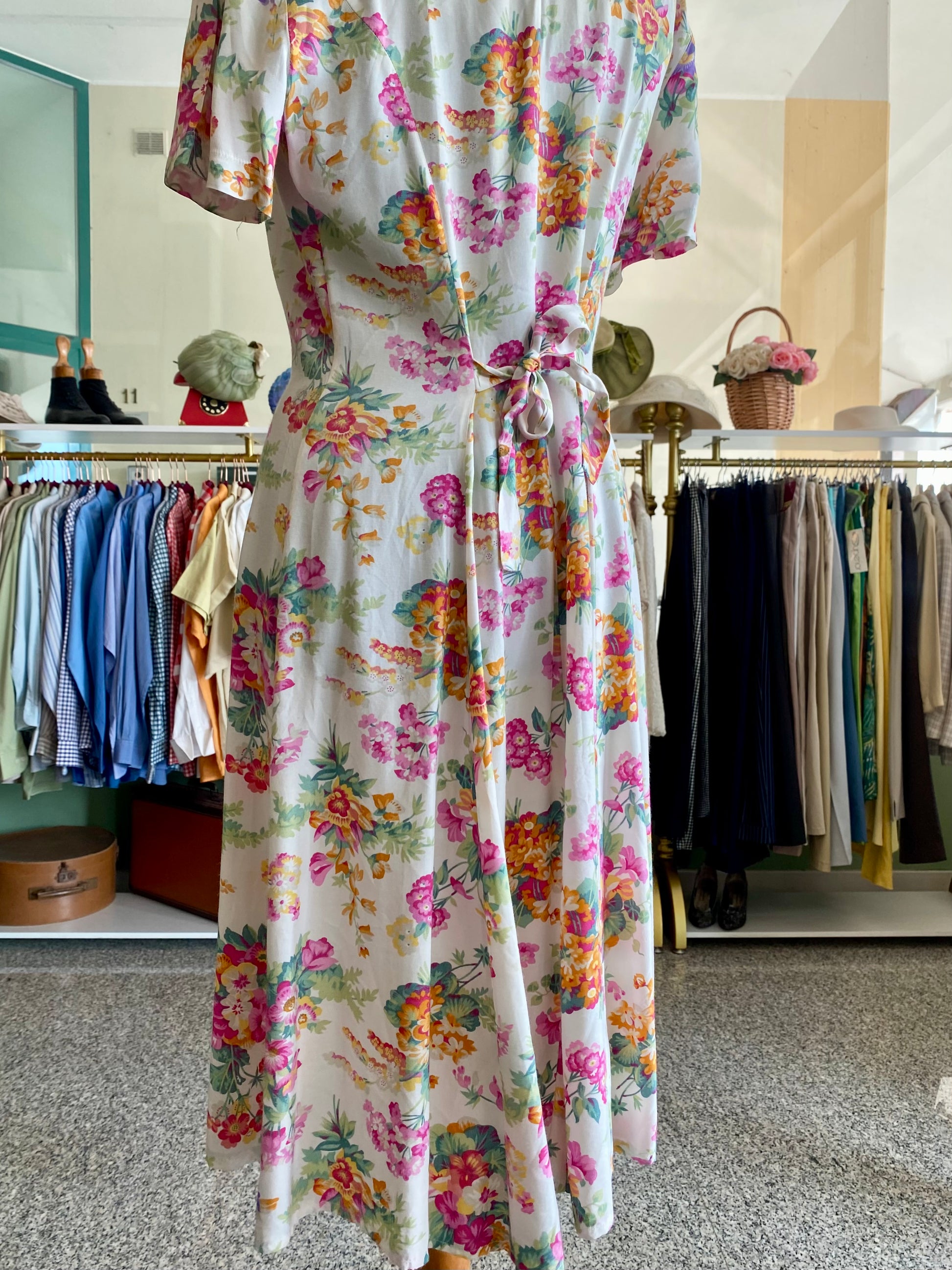 Abito anni '80/‘90 in fresca viscosa, con stampa floreale colorata su fondo bianco, bottoni decorativi e cintura da annodare sul retro. Un capo fresco e romantico, perfetto per l’estate.