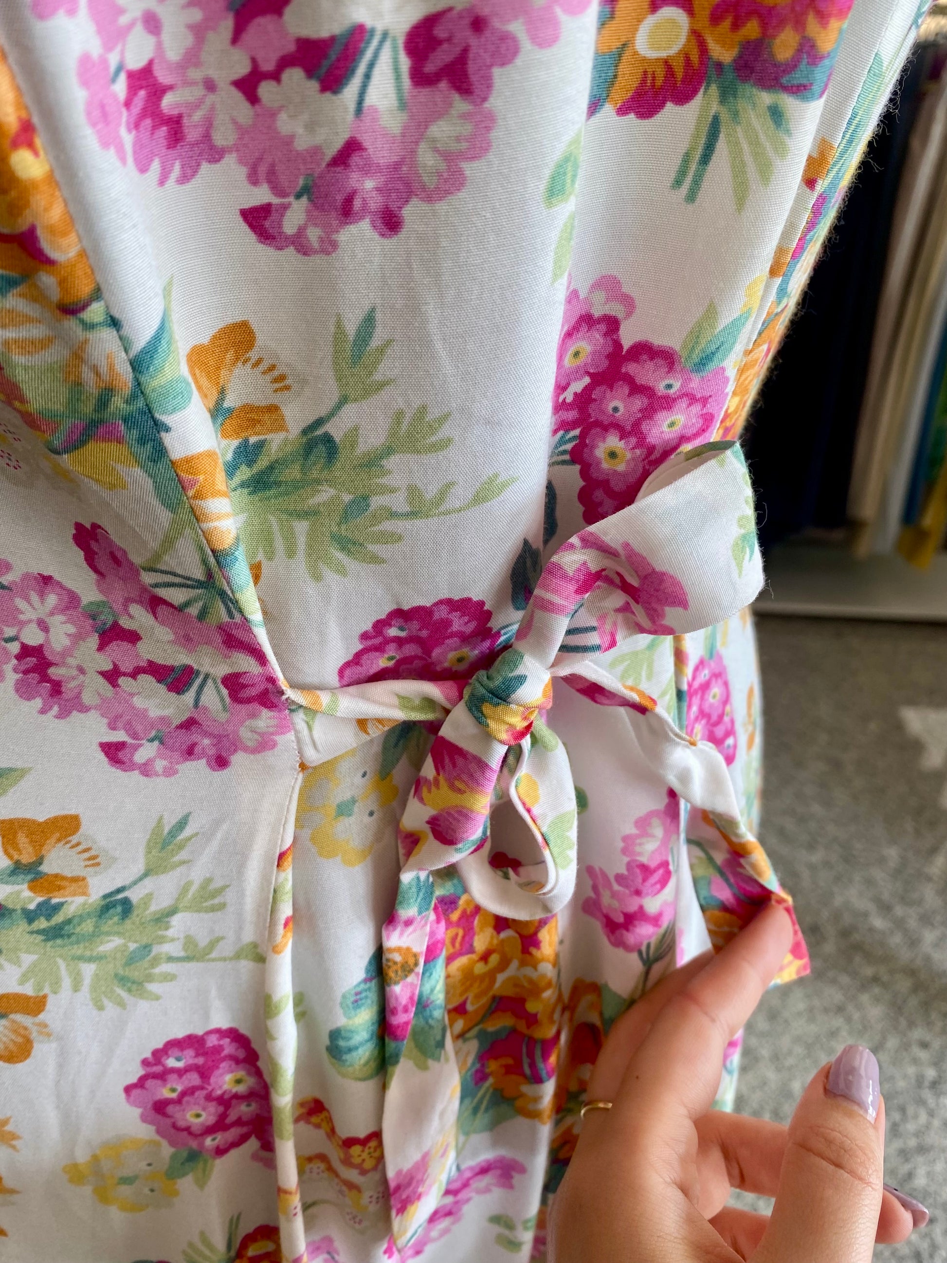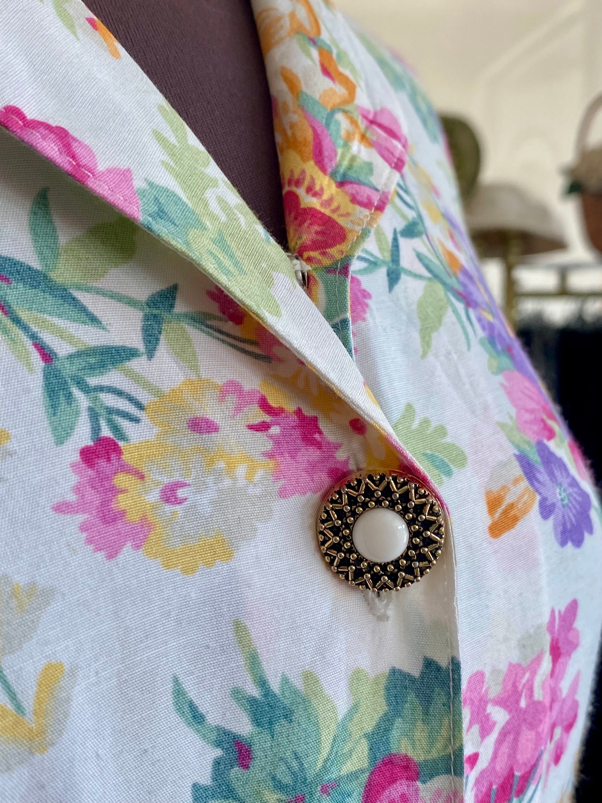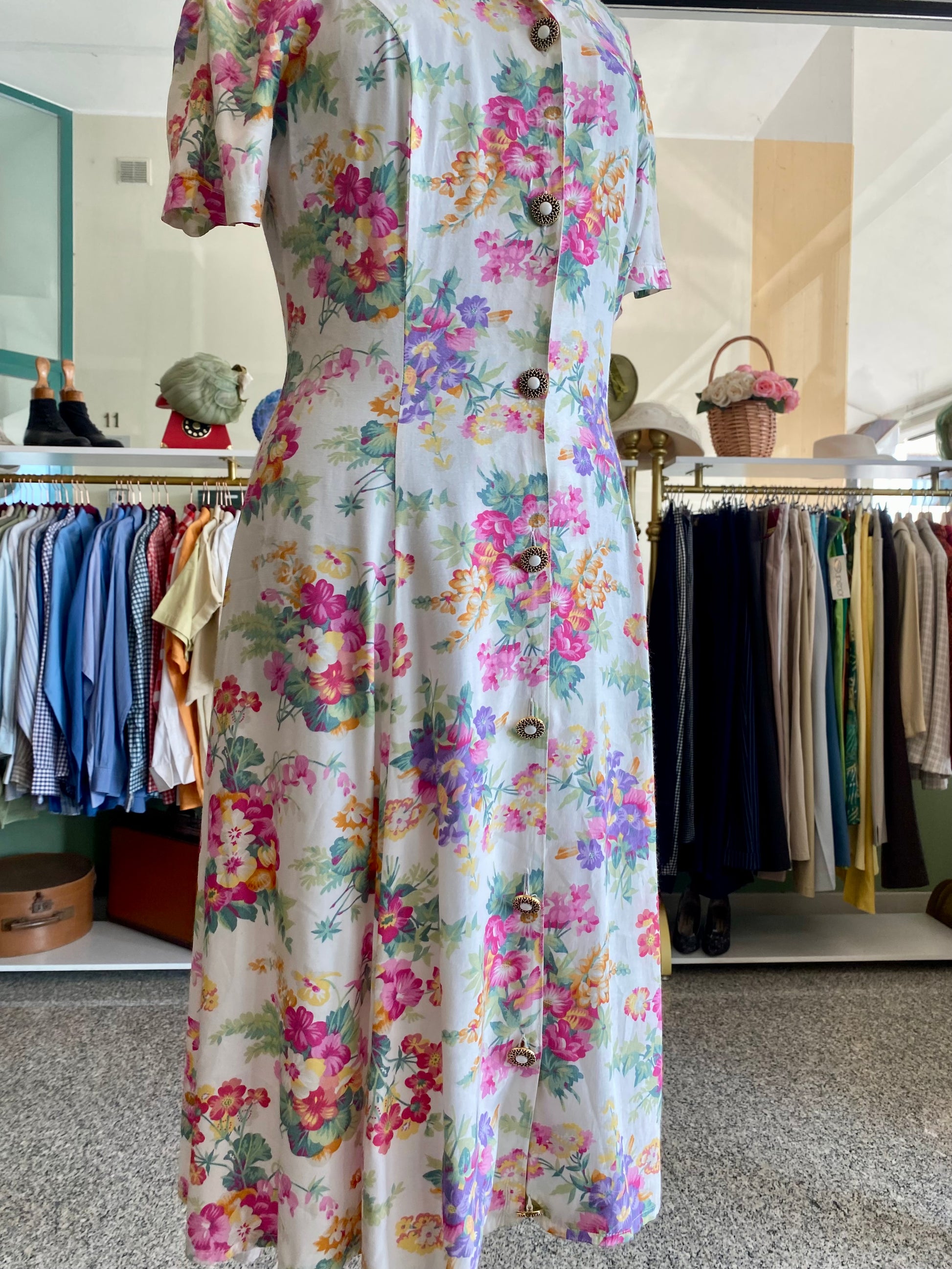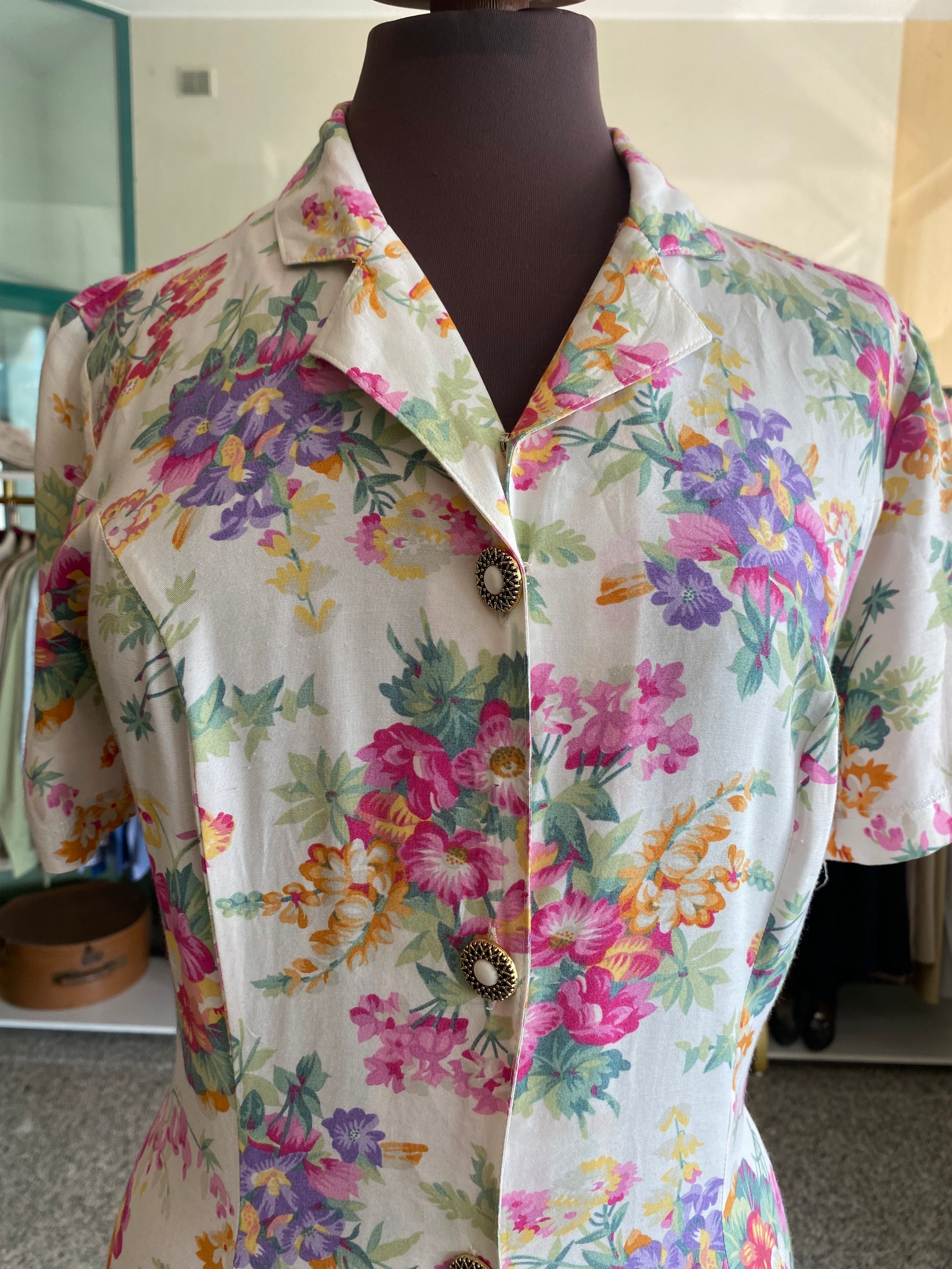 Abito anni '80/‘90 in fresca viscosa, con stampa floreale colorata su fondo bianco, bottoni decorativi e cintura da annodare sul retro. Un capo fresco e romantico, perfetto per l’estate.