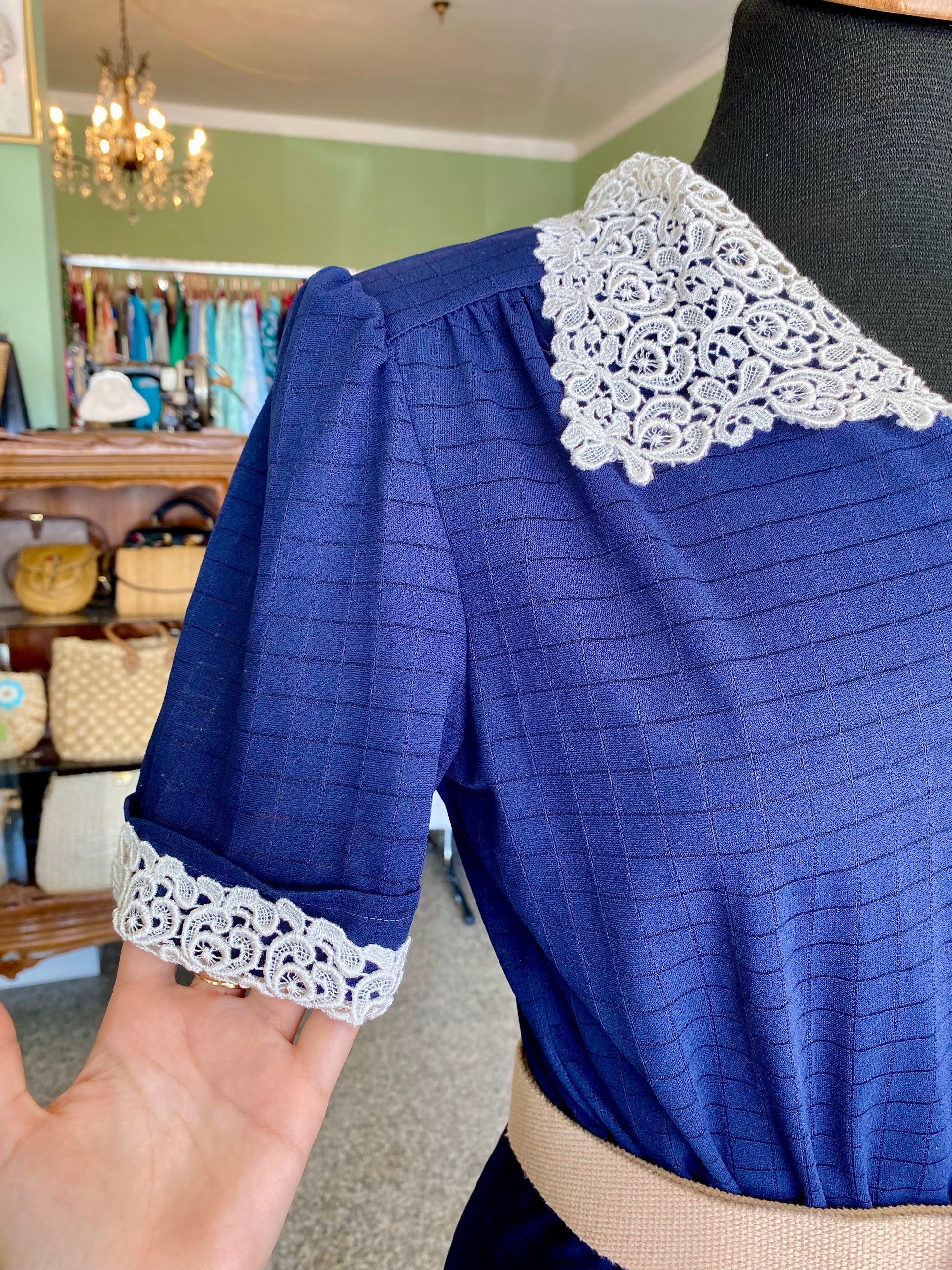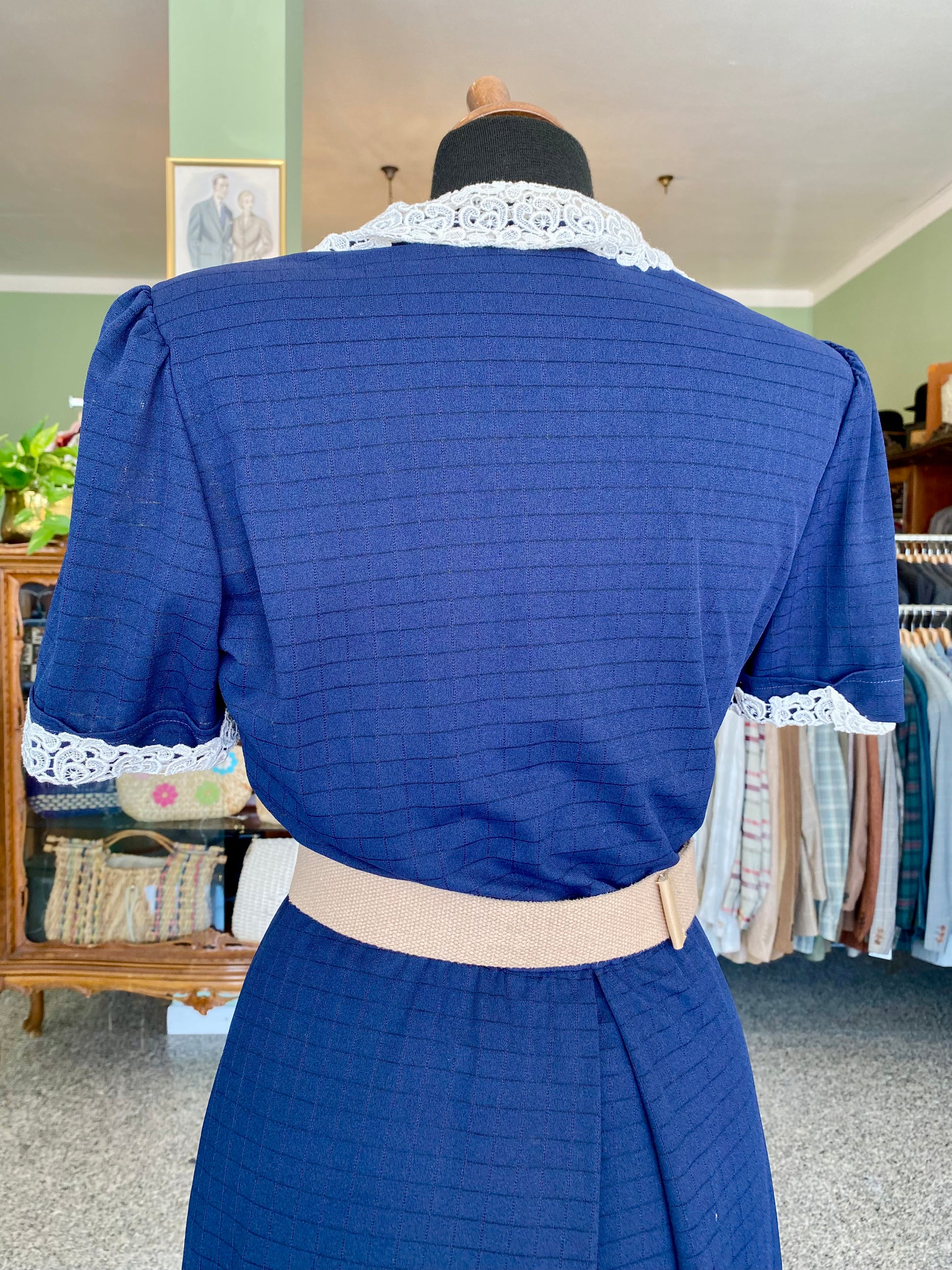 Eleganza classica con un tocco romantico: questo abito anni ’80 in blu navy presenta una linea femminile e fluida, con gonna midi plissettata e maniche corte leggermente a palloncino. Il colletto e i polsini sono impreziositi da un pizzo ricamato color panna, che crea un contrasto raffinato e dal gusto rétro. Il tessuto leggero e testurizzato ha una micro fantasia geometrica a rilievo, che aggiunge profondità al colore. La vita è elasticizzata, ma può essere ulteriormente valorizzata con cintura (in foto abbinato a una con fibbia in legno, non inclusa). Un capo perfetto per chi ama lo stile vintage bon ton.