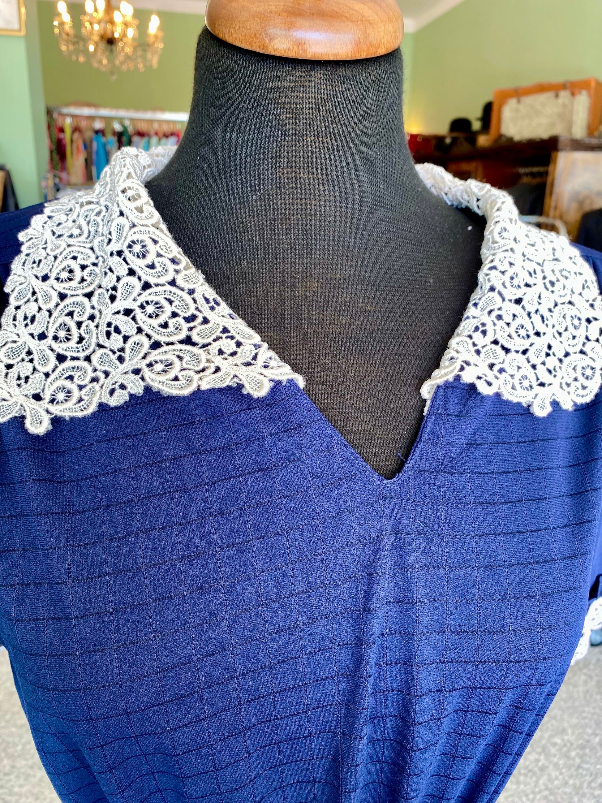 Abito plissettato anni '80 blu navy con pizzo bon ton - TG. 42 circa