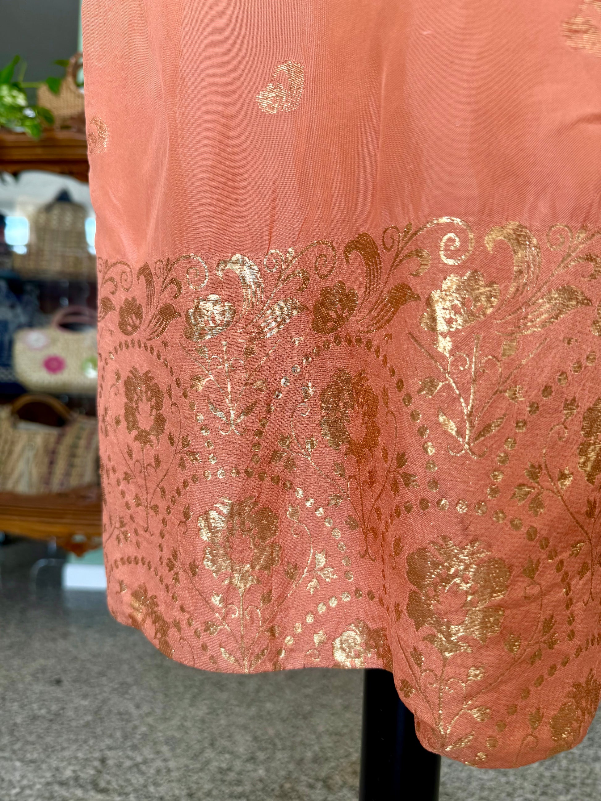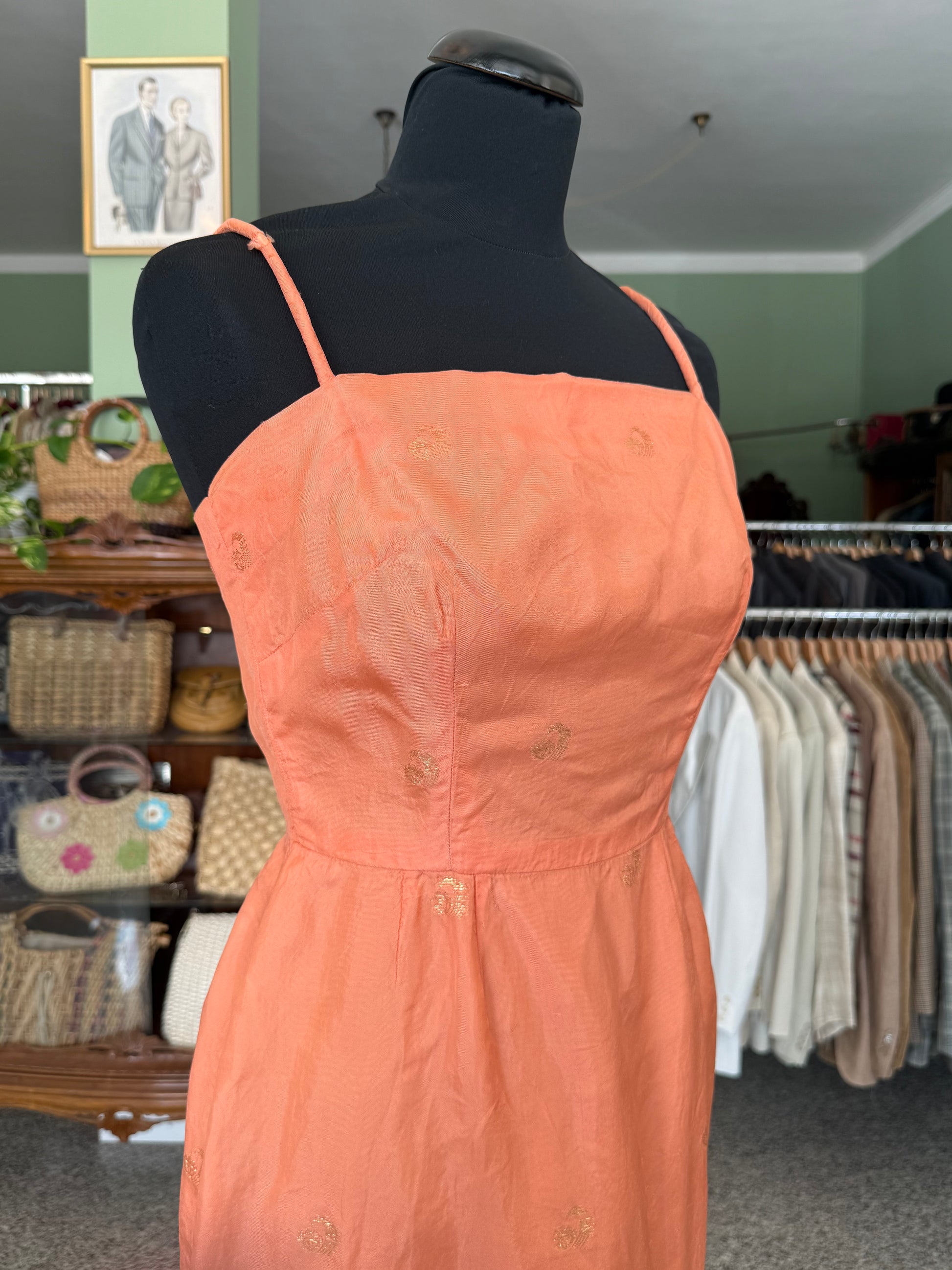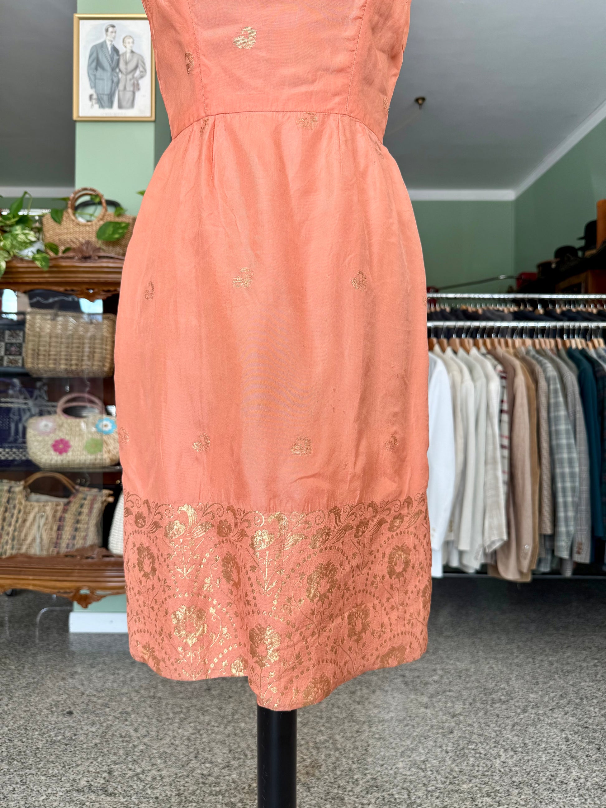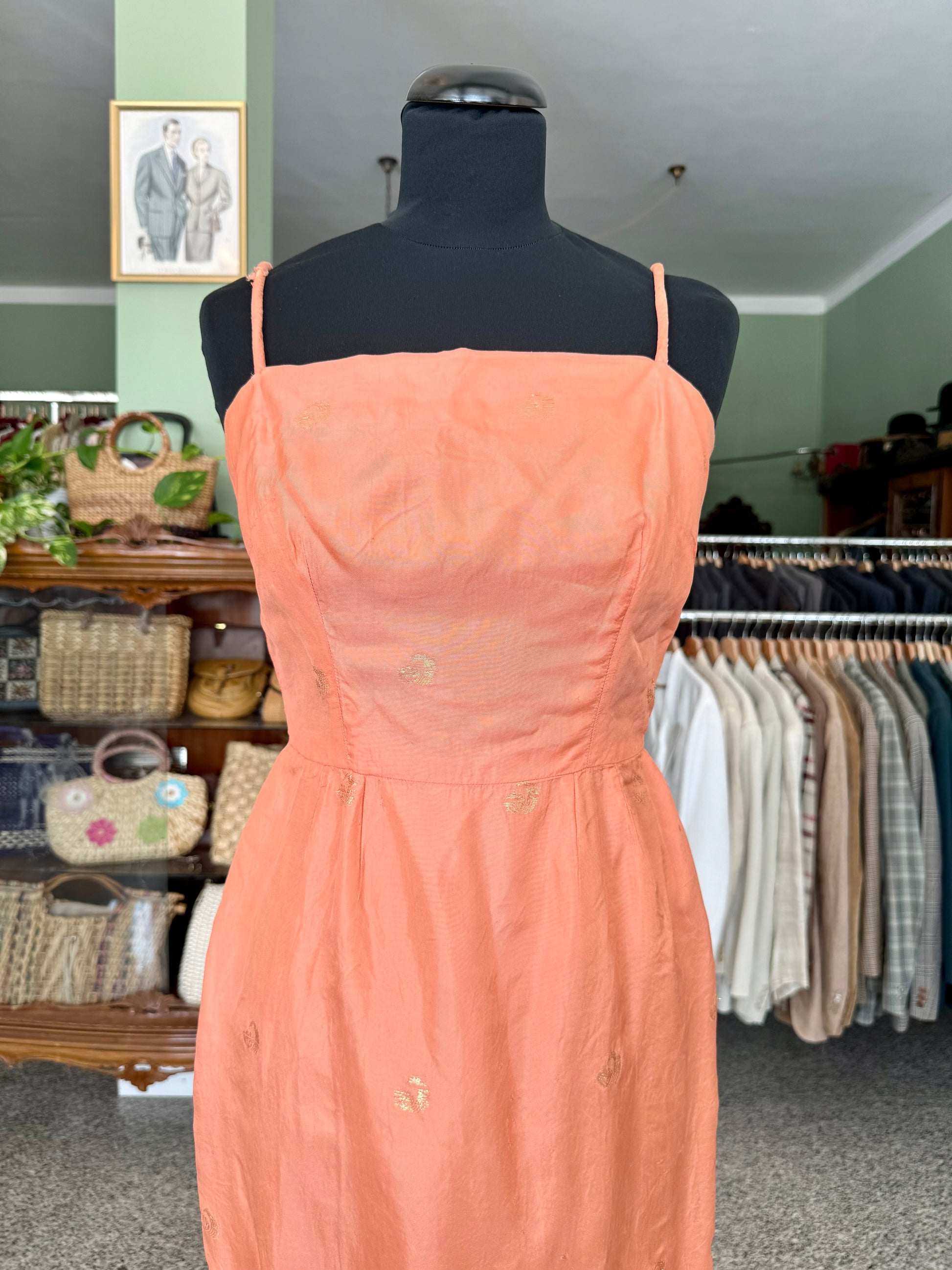 Abito sartoriale anni ’60 in tessuto color corallo con preziosi ricami dorati, realizzato a mano. Linea aderente con bretelle sottili (da riparare), bustino strutturato e spacco laterale. Perfetto per eventi o cerimonie, può essere valorizzato con due clip gioiello sulle spalline per un tocco elegante e originale. Vintage autentico dal fascino delicato e sofisticato.