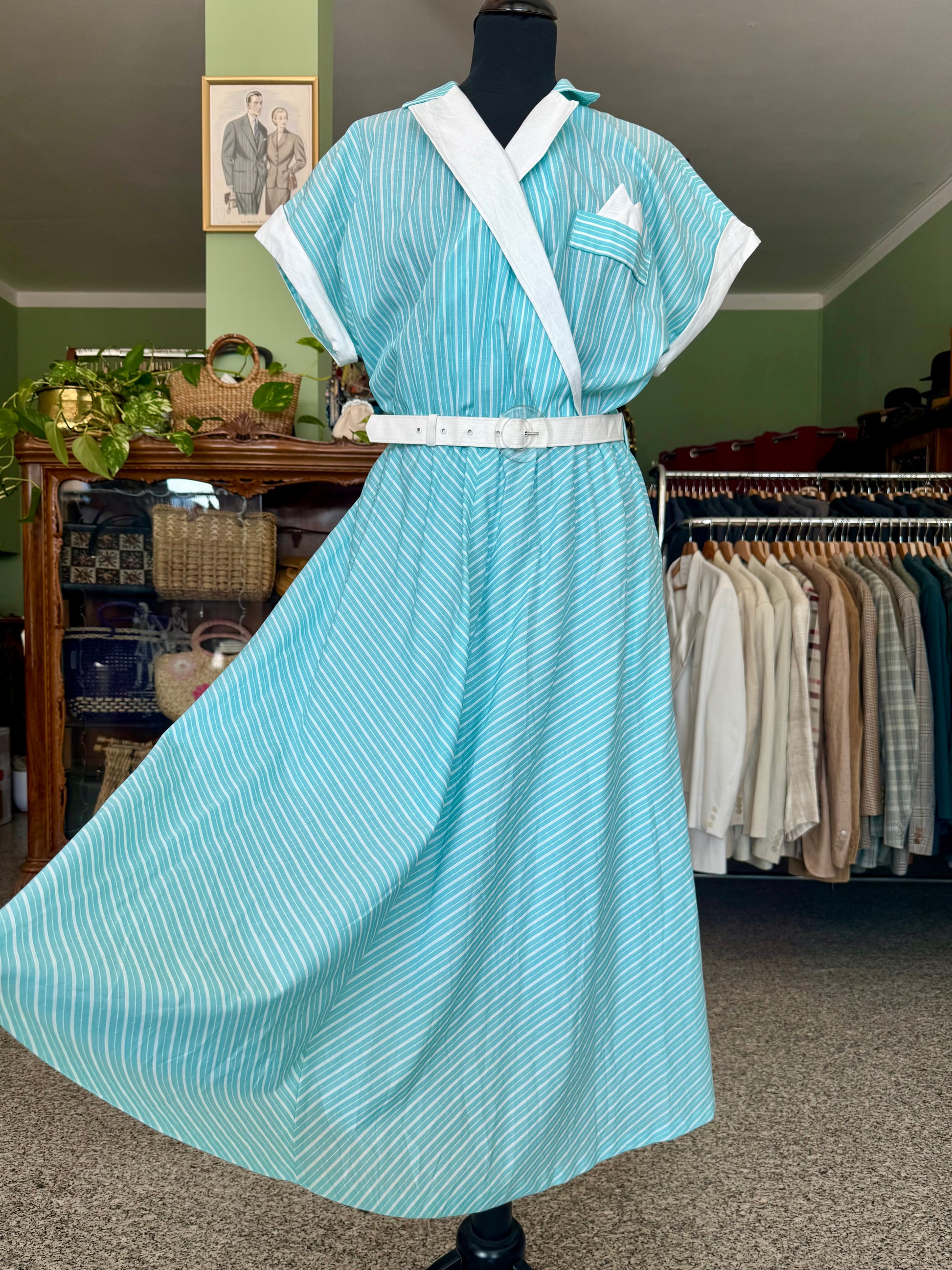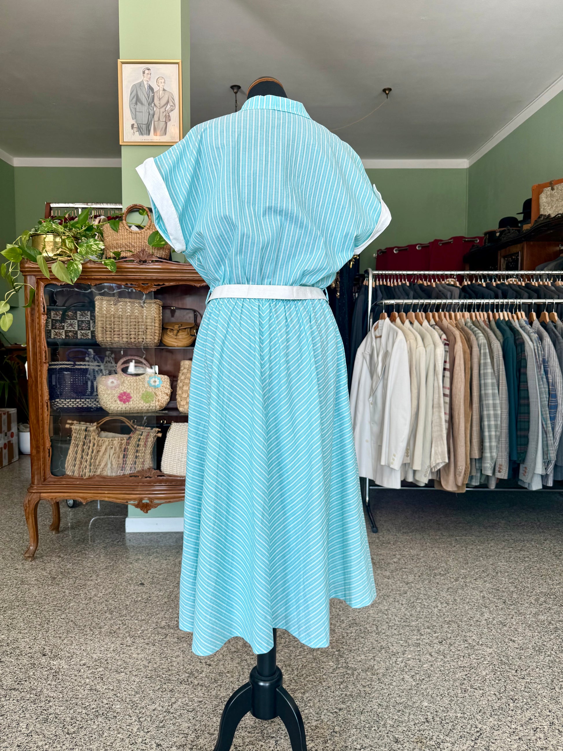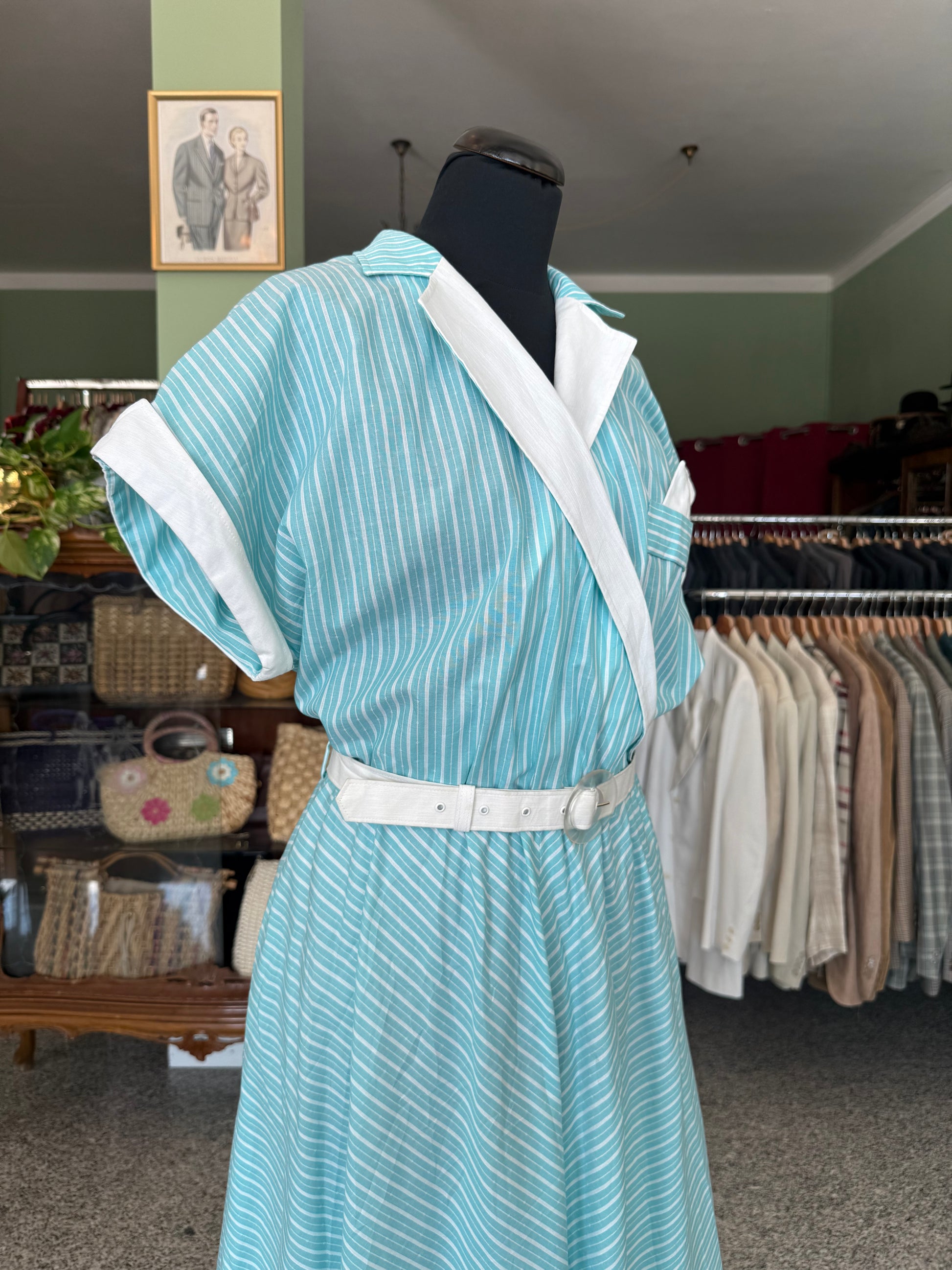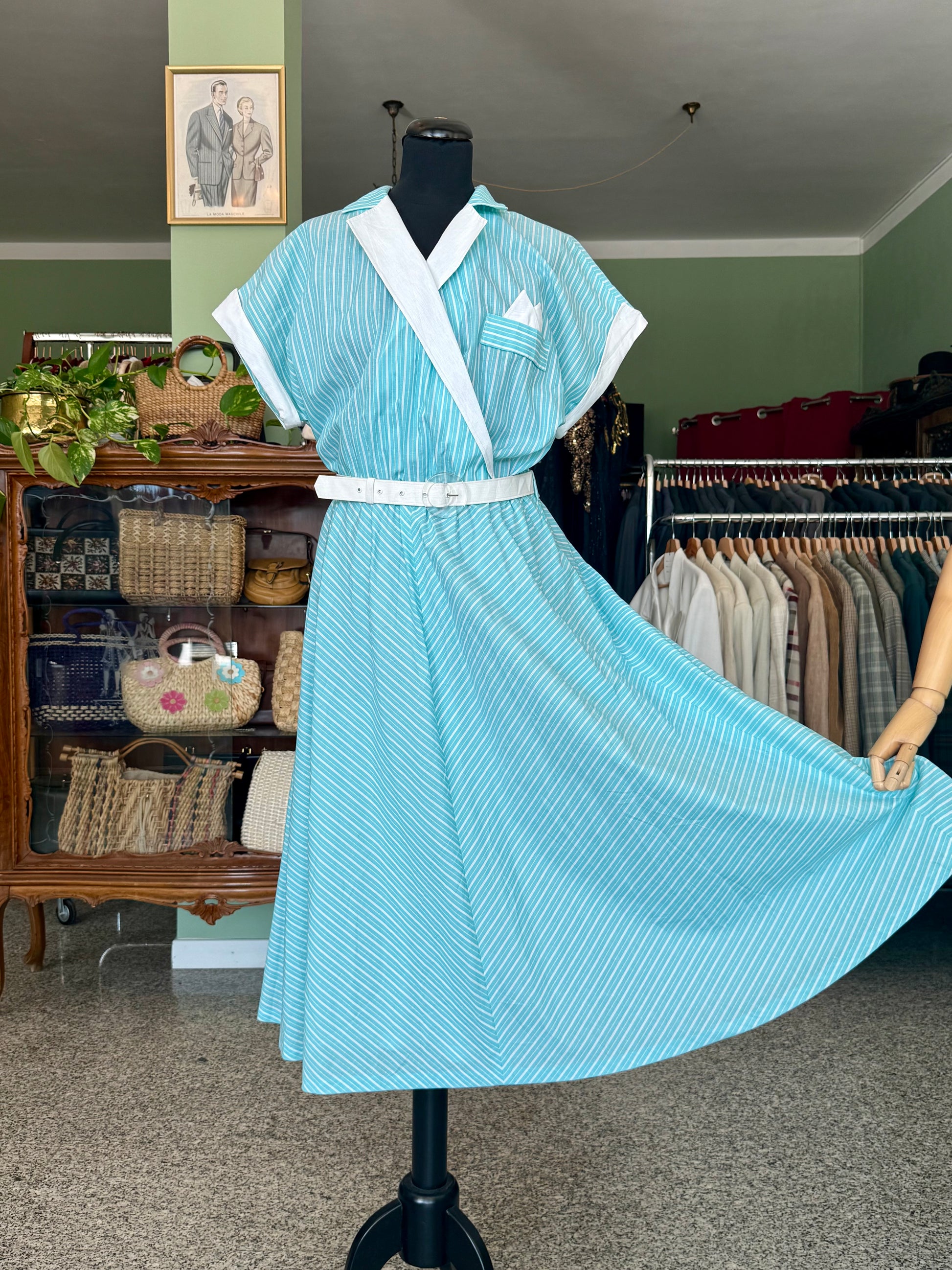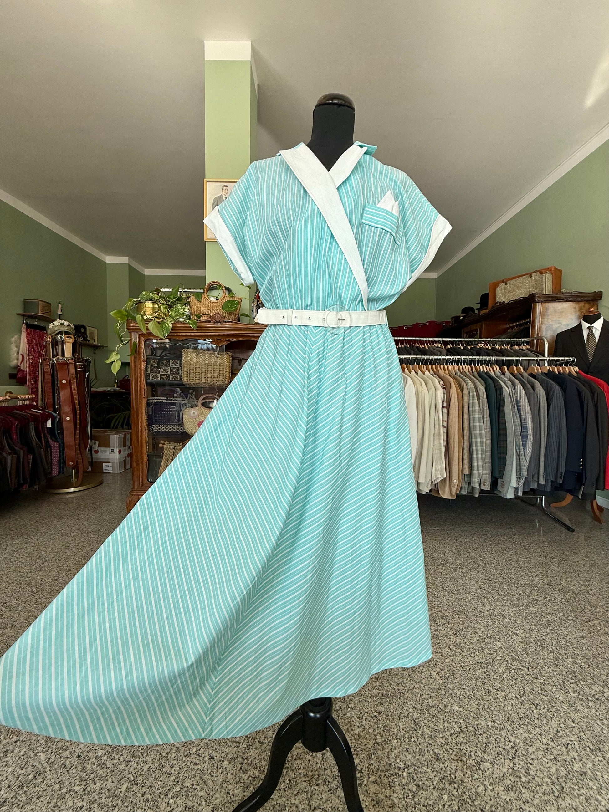 Abito anni ’80 ispirato allo stile rockabilly degli anni ’50, con linea svasata e silhouette marcatamente femminile. Realizzato in un fresco cotone a righe bianco e turchese, è caratterizzato da una gonna ampia, corpino incrociato con rever a contrasto, maniche con risvolto e cintura bianca in vita con fibbia in plexi. Un capo dal carattere giocoso e rétro, perfetto per chi ama i tagli vintage che valorizzano la figura con personalità.