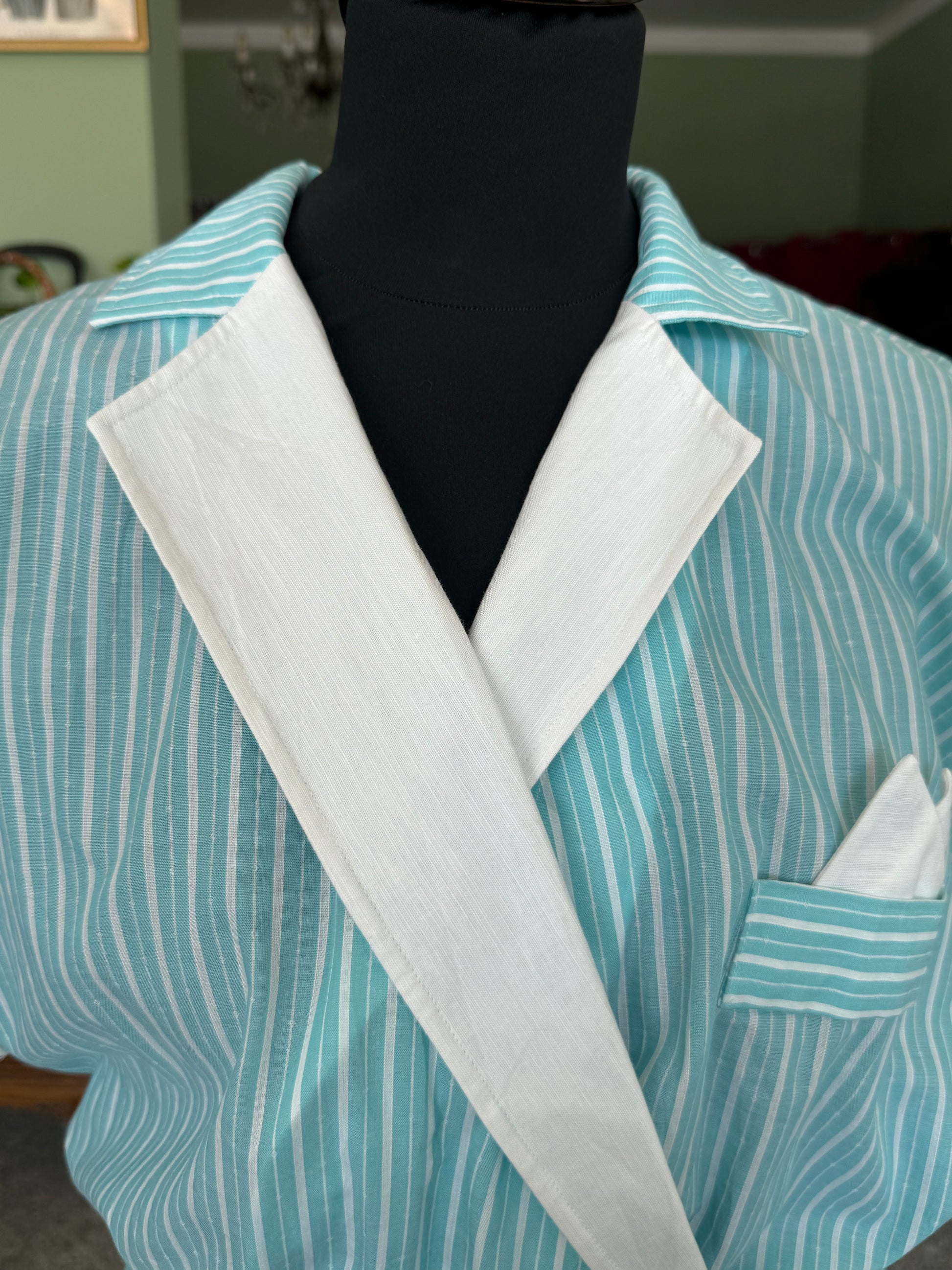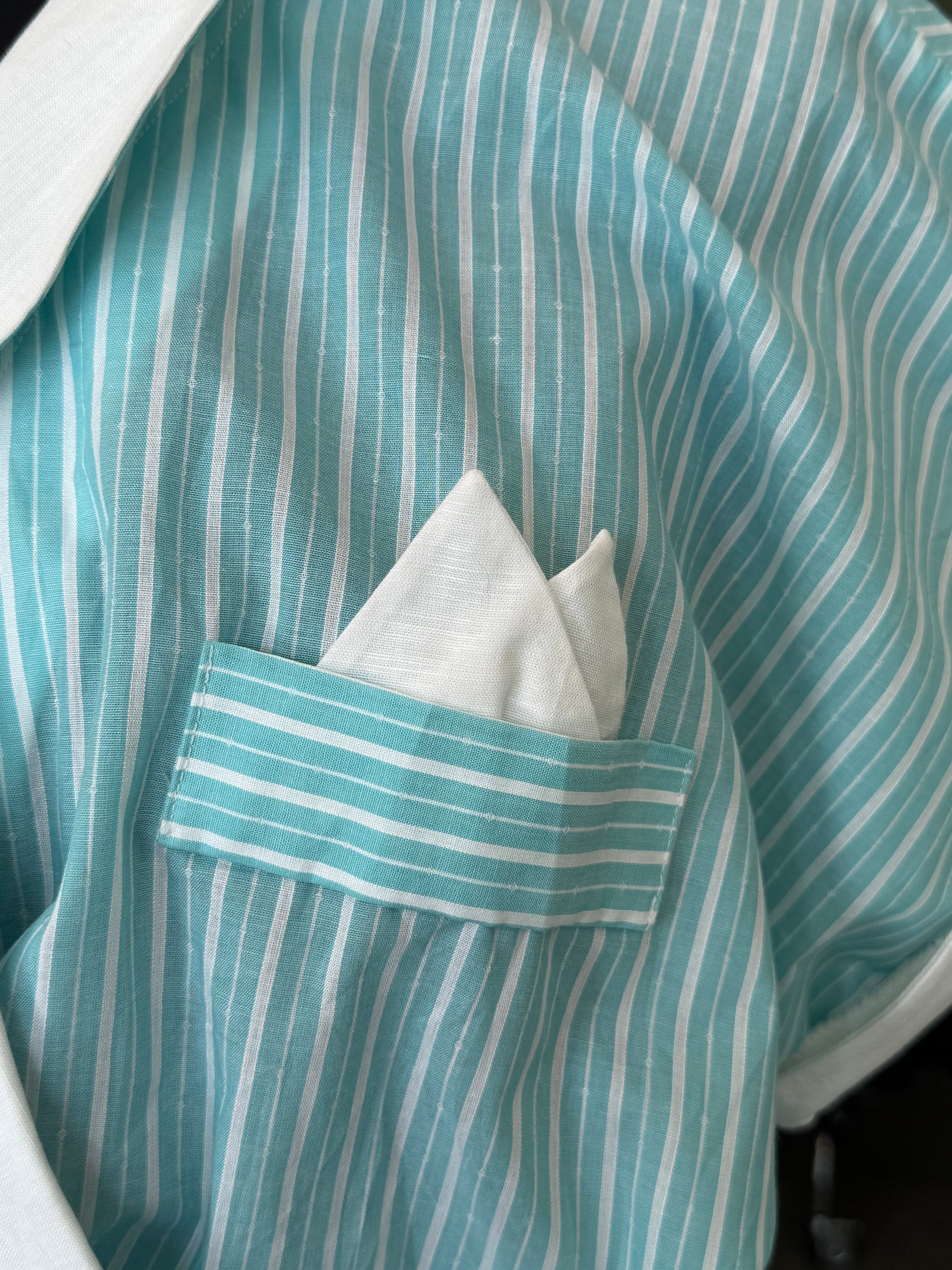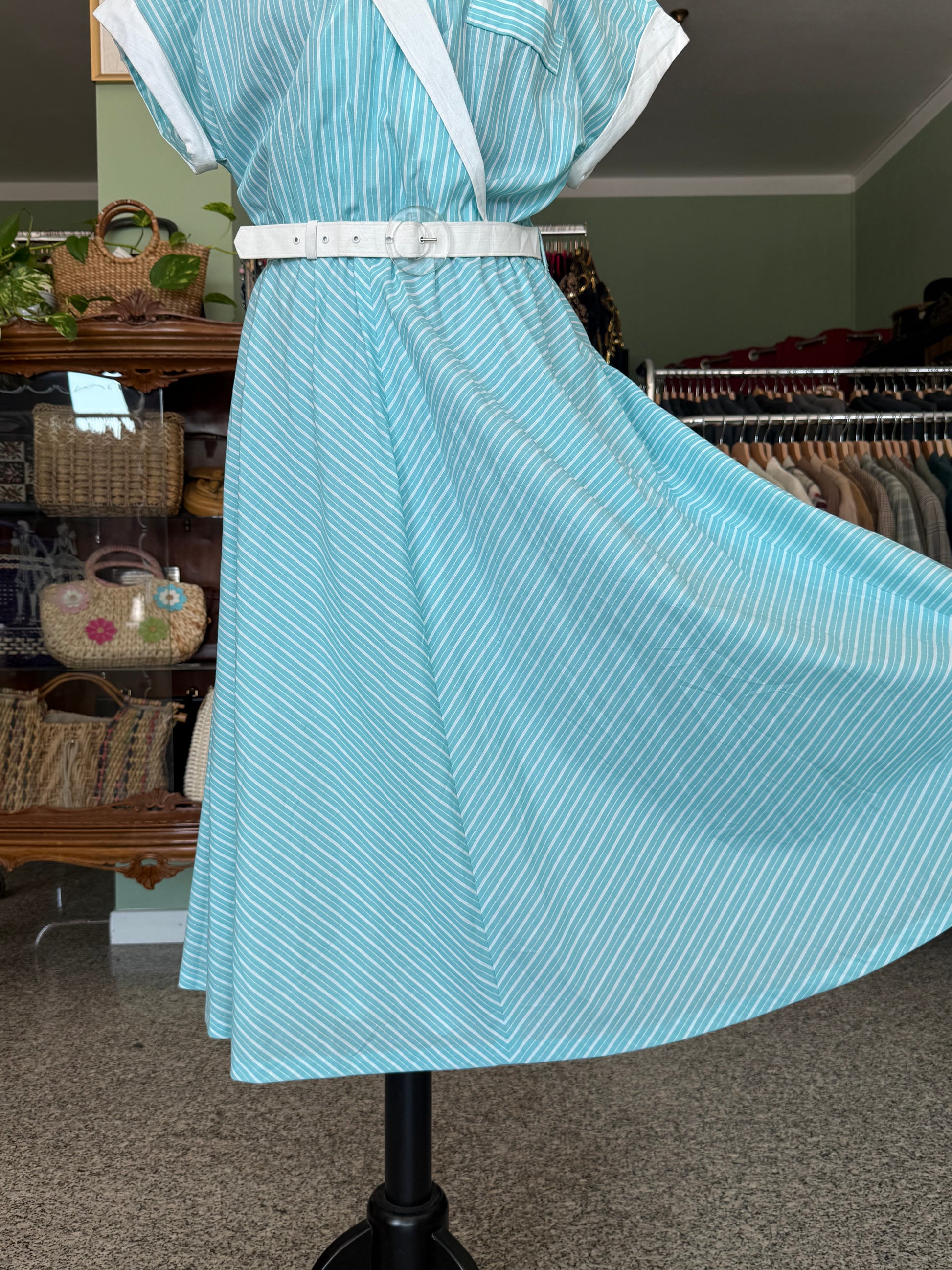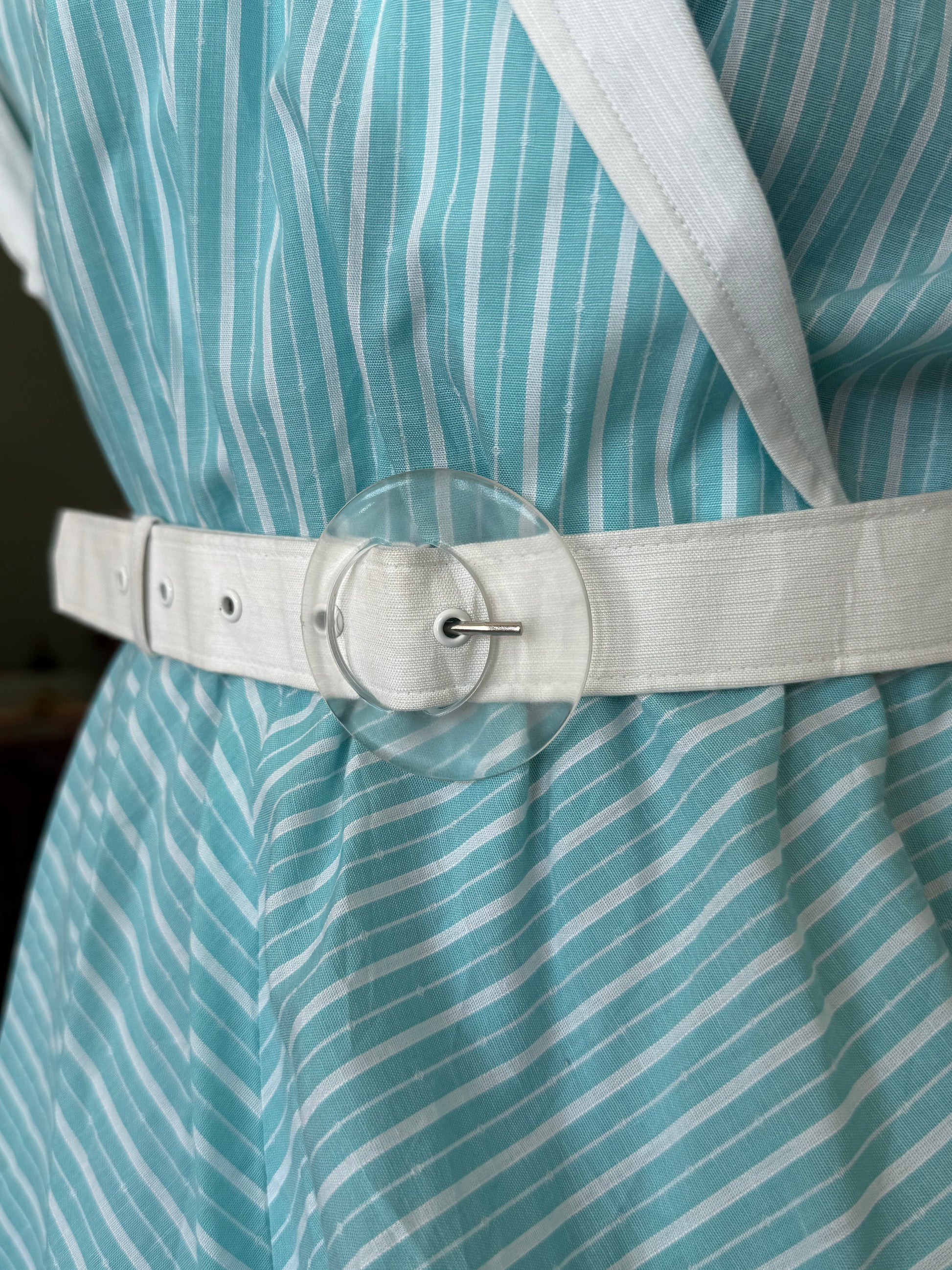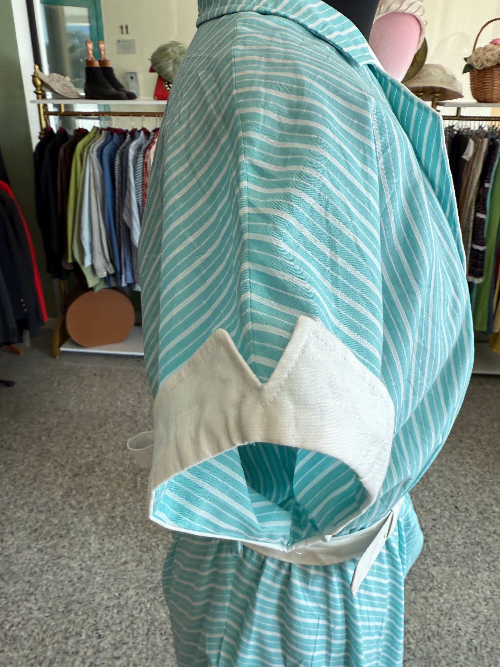 Abito anni ’80 ispirato allo stile rockabilly degli anni ’50, con linea svasata e silhouette marcatamente femminile. Realizzato in un fresco cotone a righe bianco e turchese, è caratterizzato da una gonna ampia, corpino incrociato con rever a contrasto, maniche con risvolto e cintura bianca in vita con fibbia in plexi. Un capo dal carattere giocoso e rétro, perfetto per chi ama i tagli vintage che valorizzano la figura con personalità.