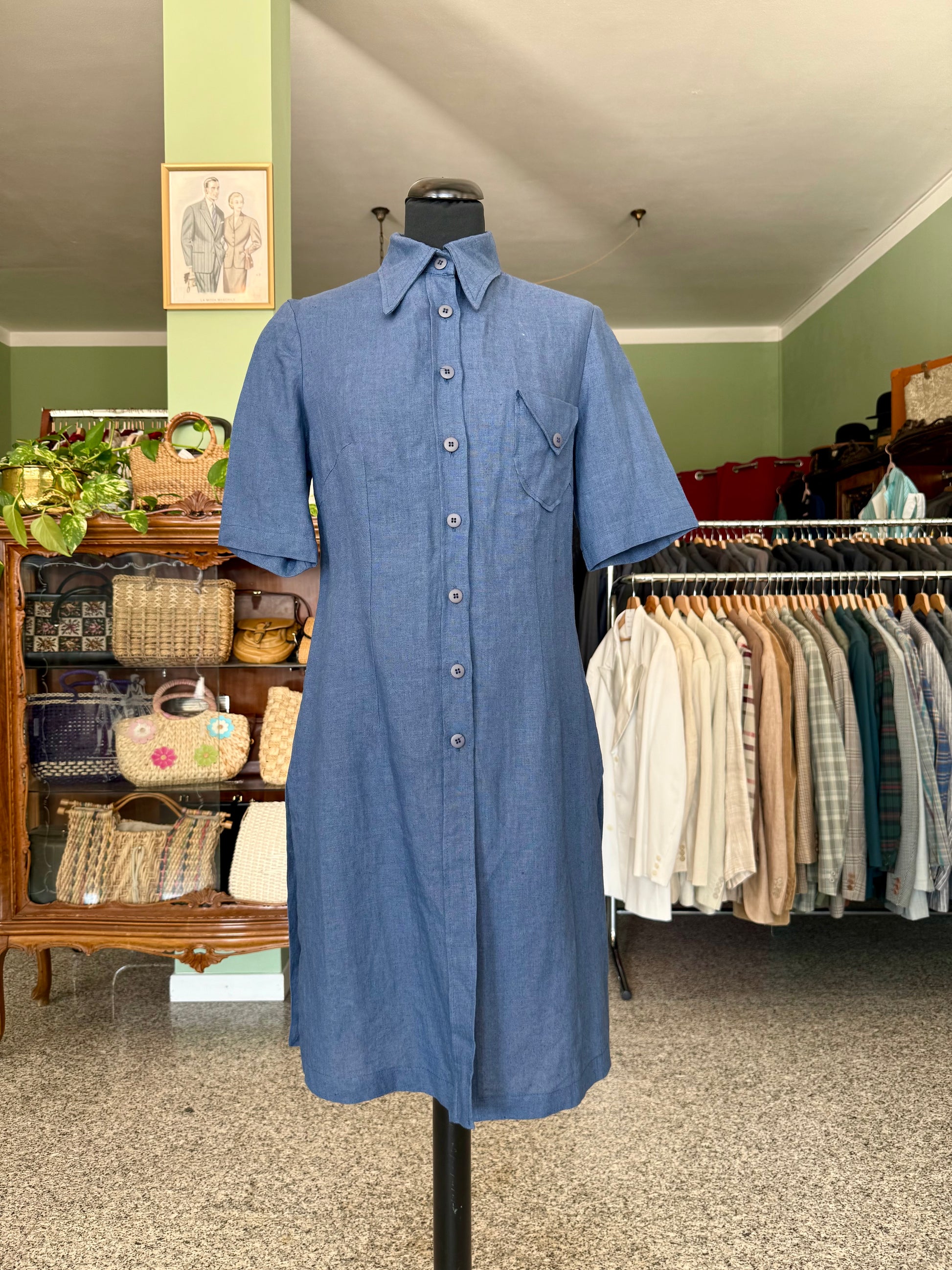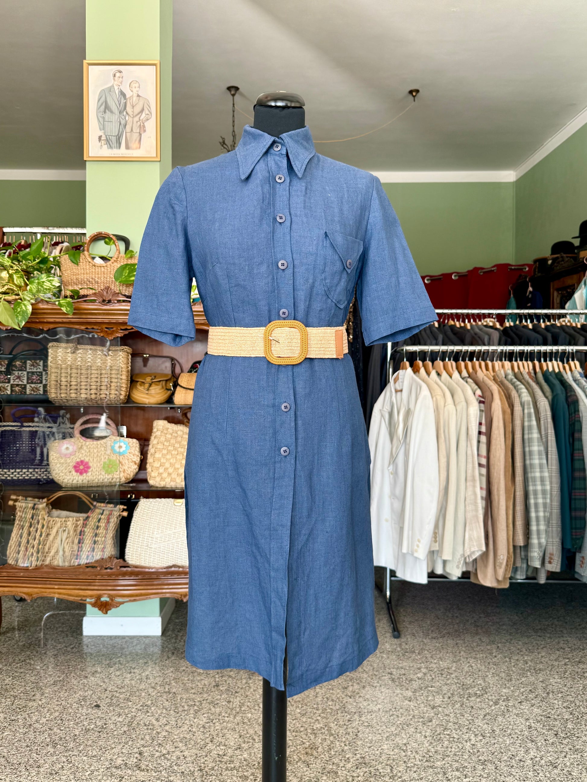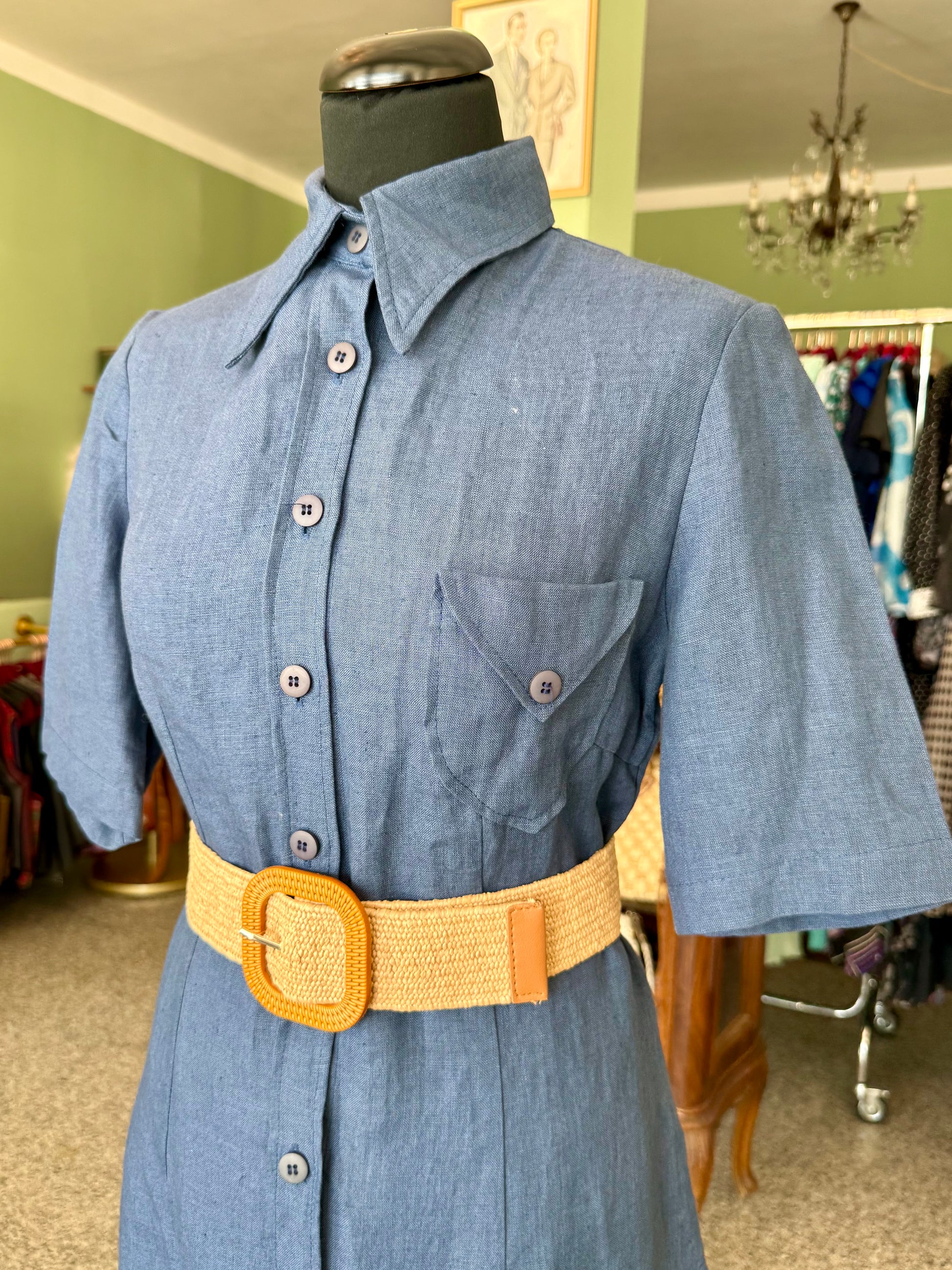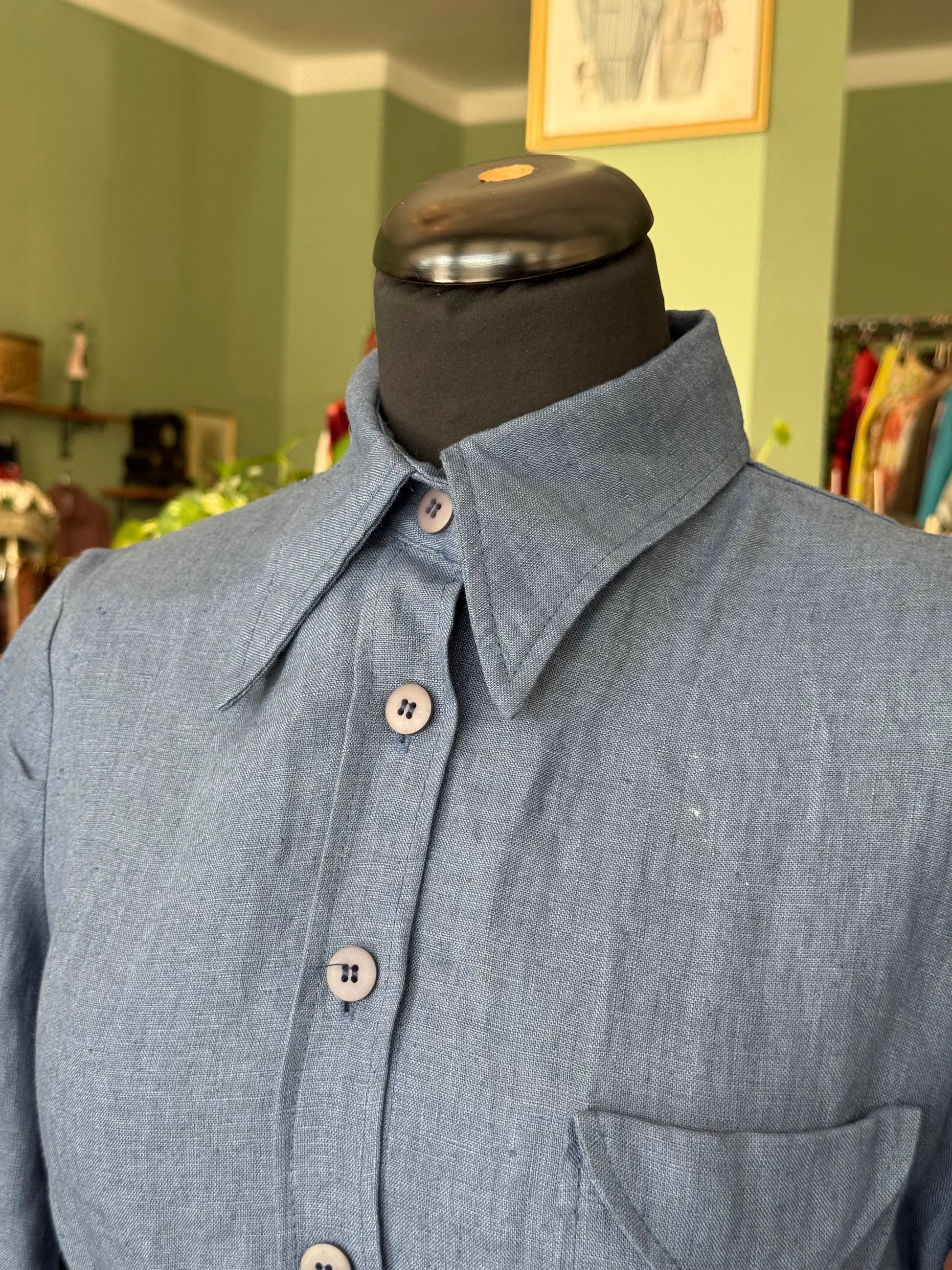 Abito camicia anni ’70 in puro lino blu denim - TG. 40 circa