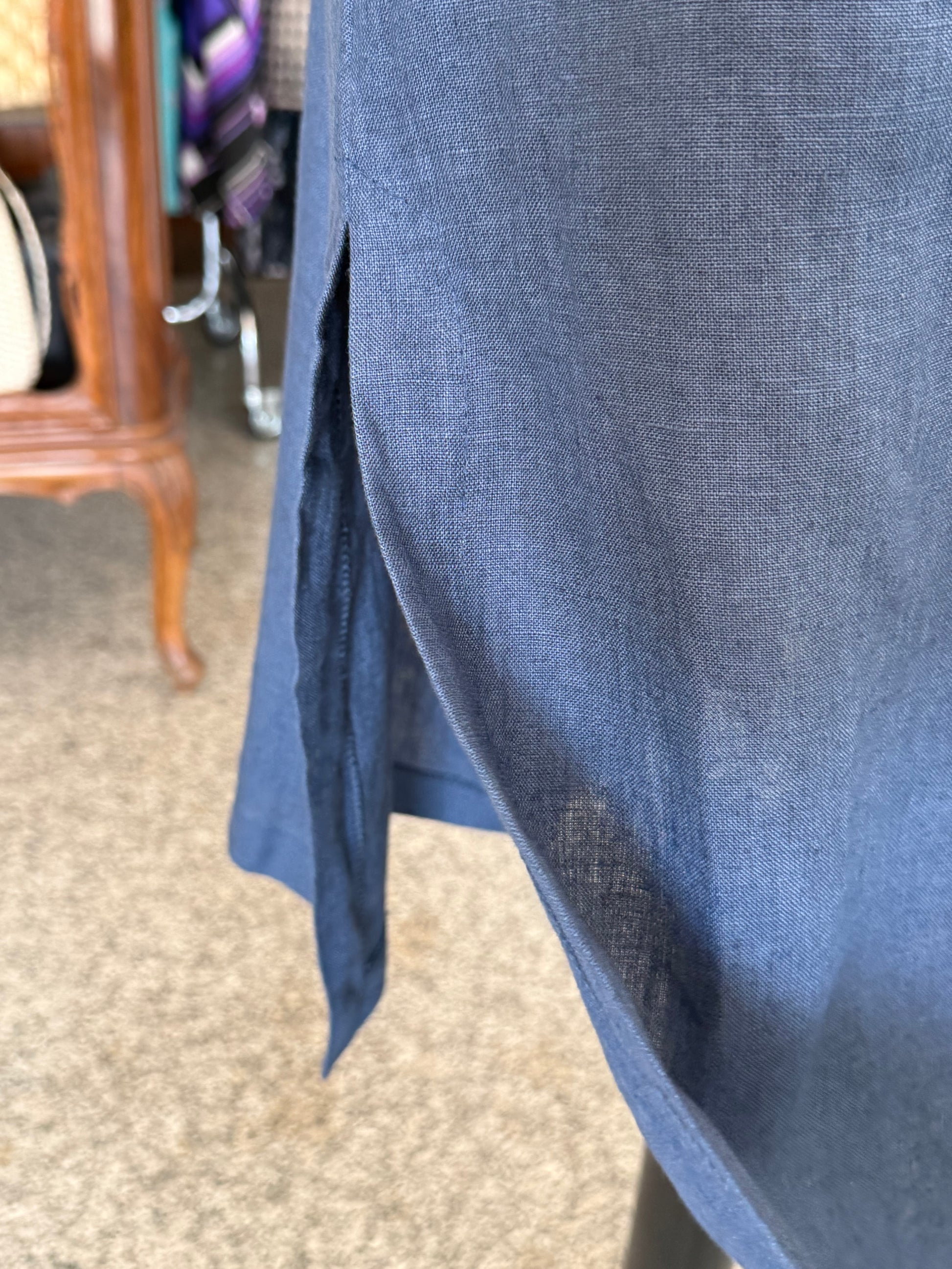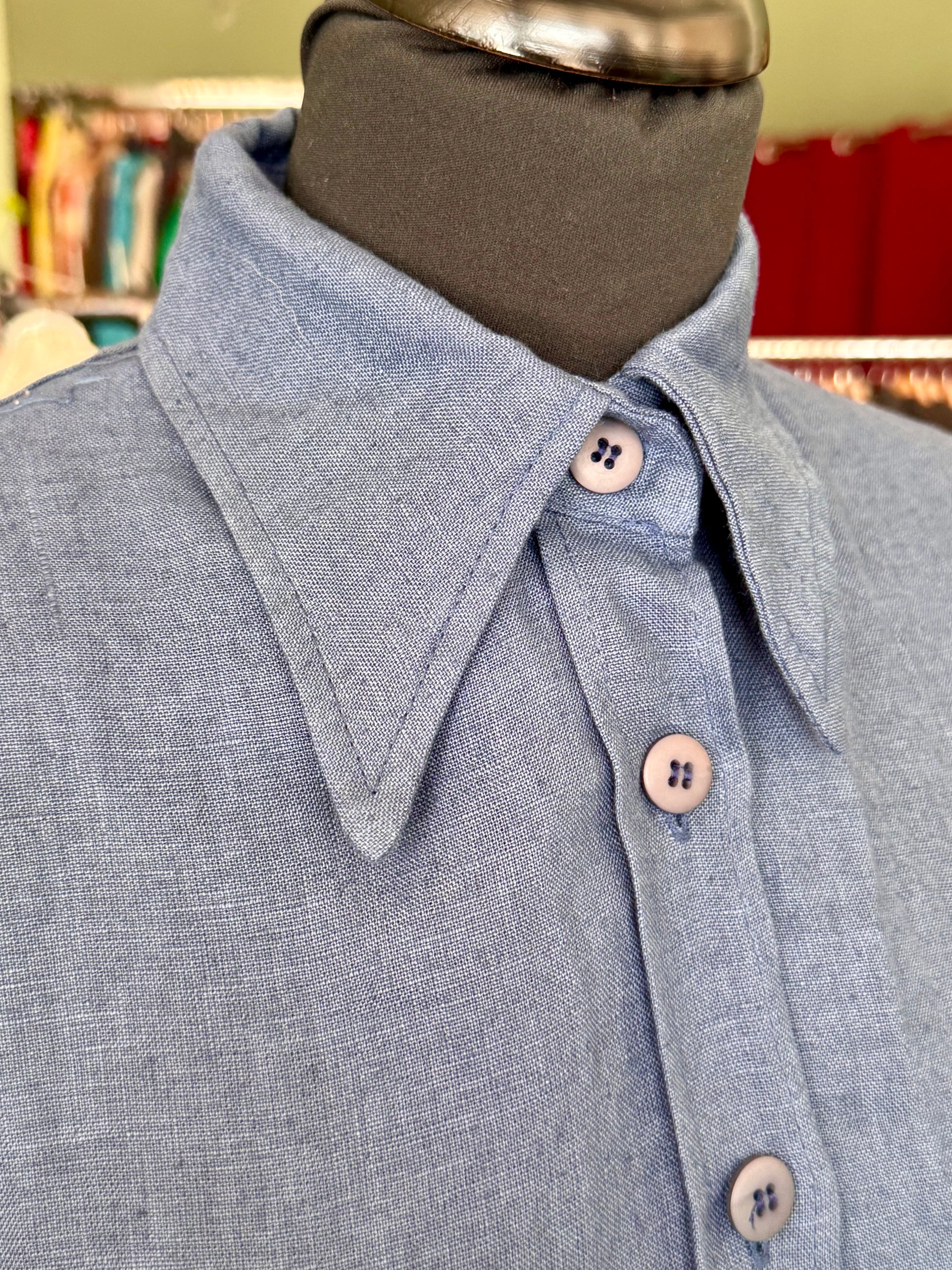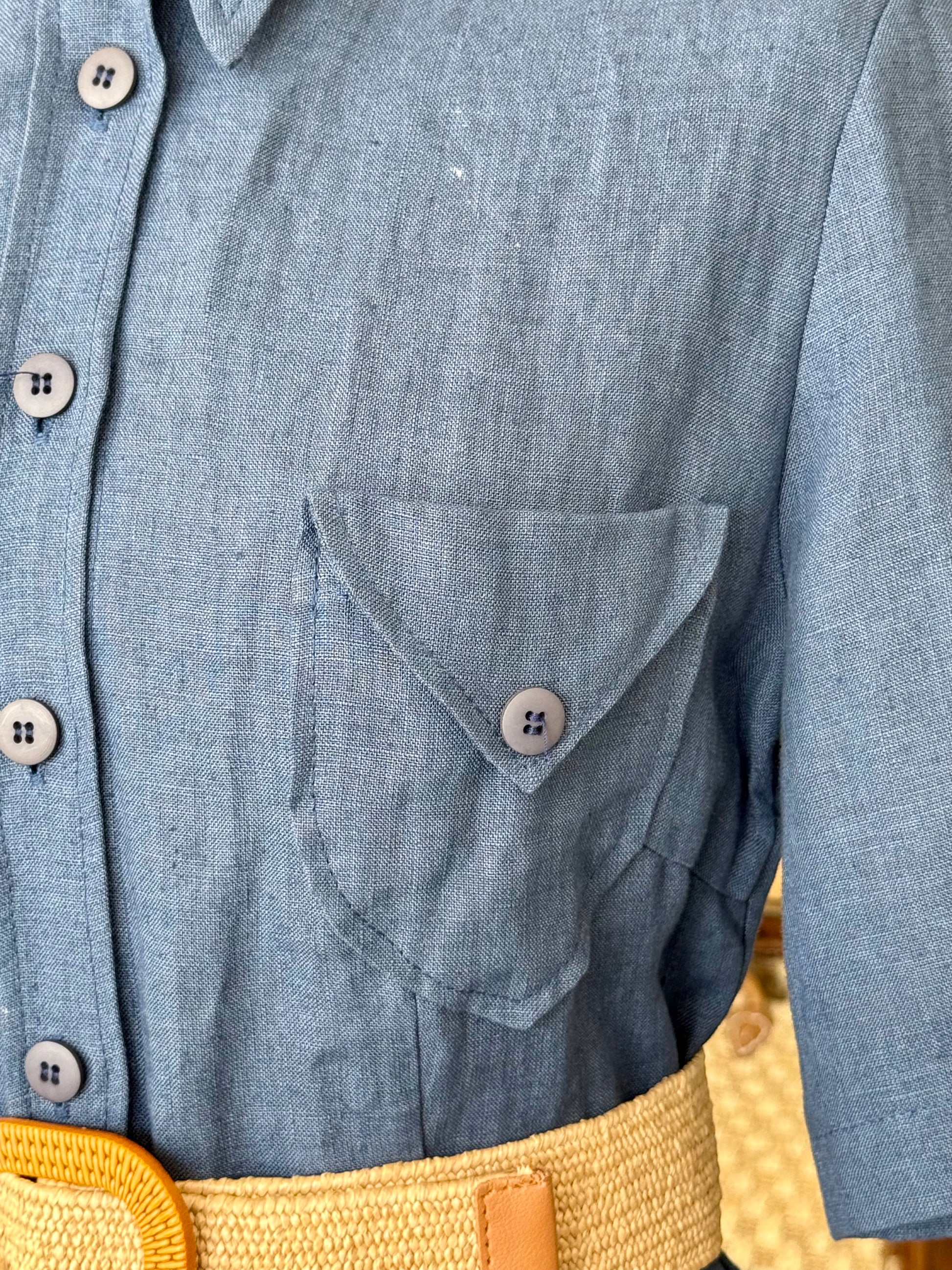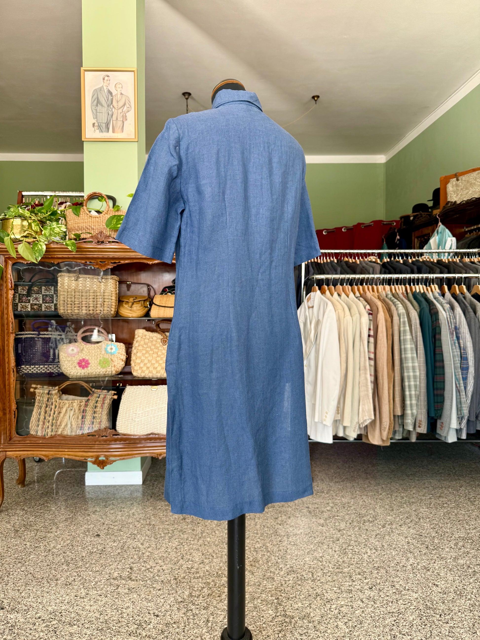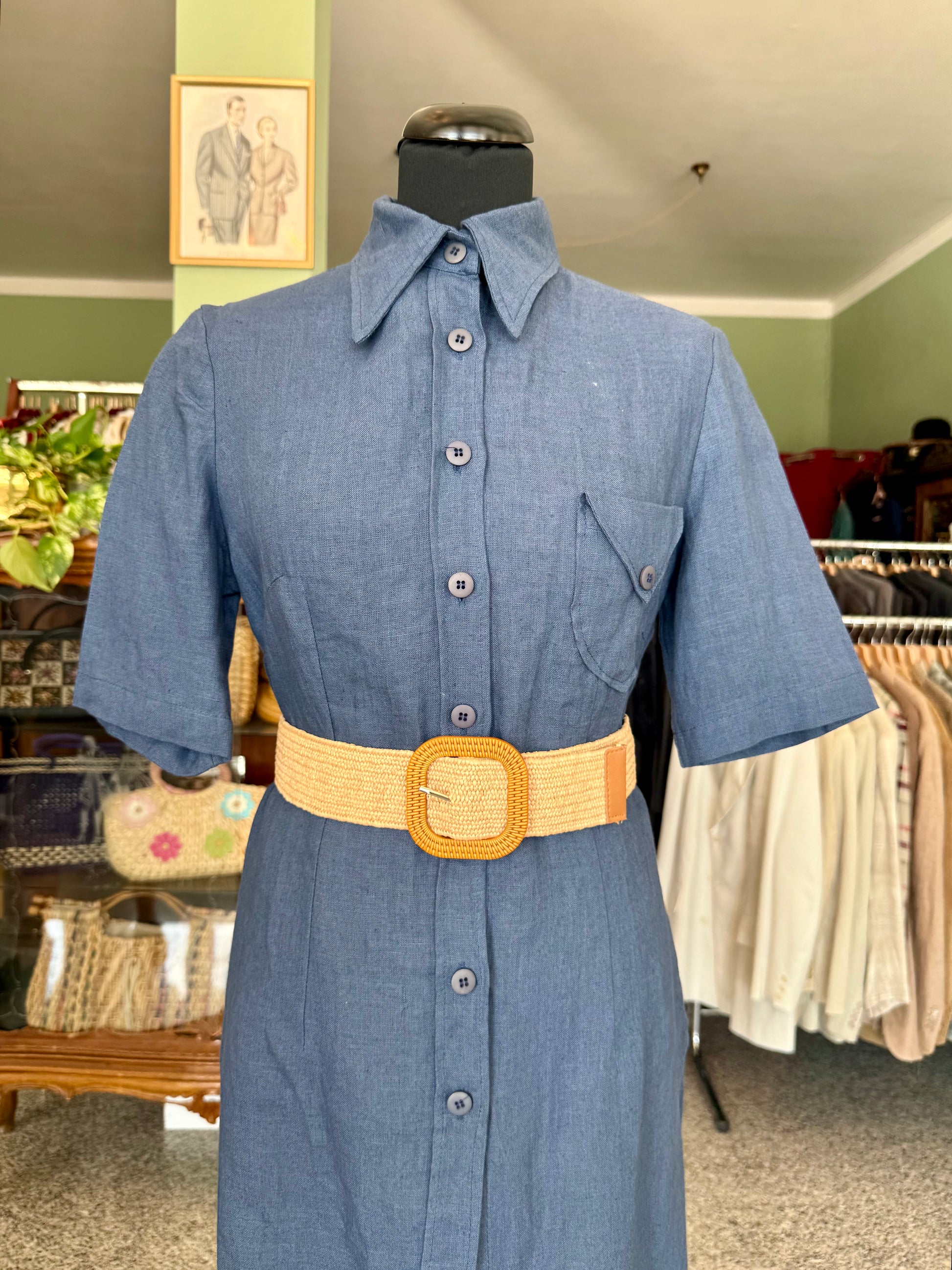 Abito camicia anni ’70 in puro lino blu denim - TG. 40 circa