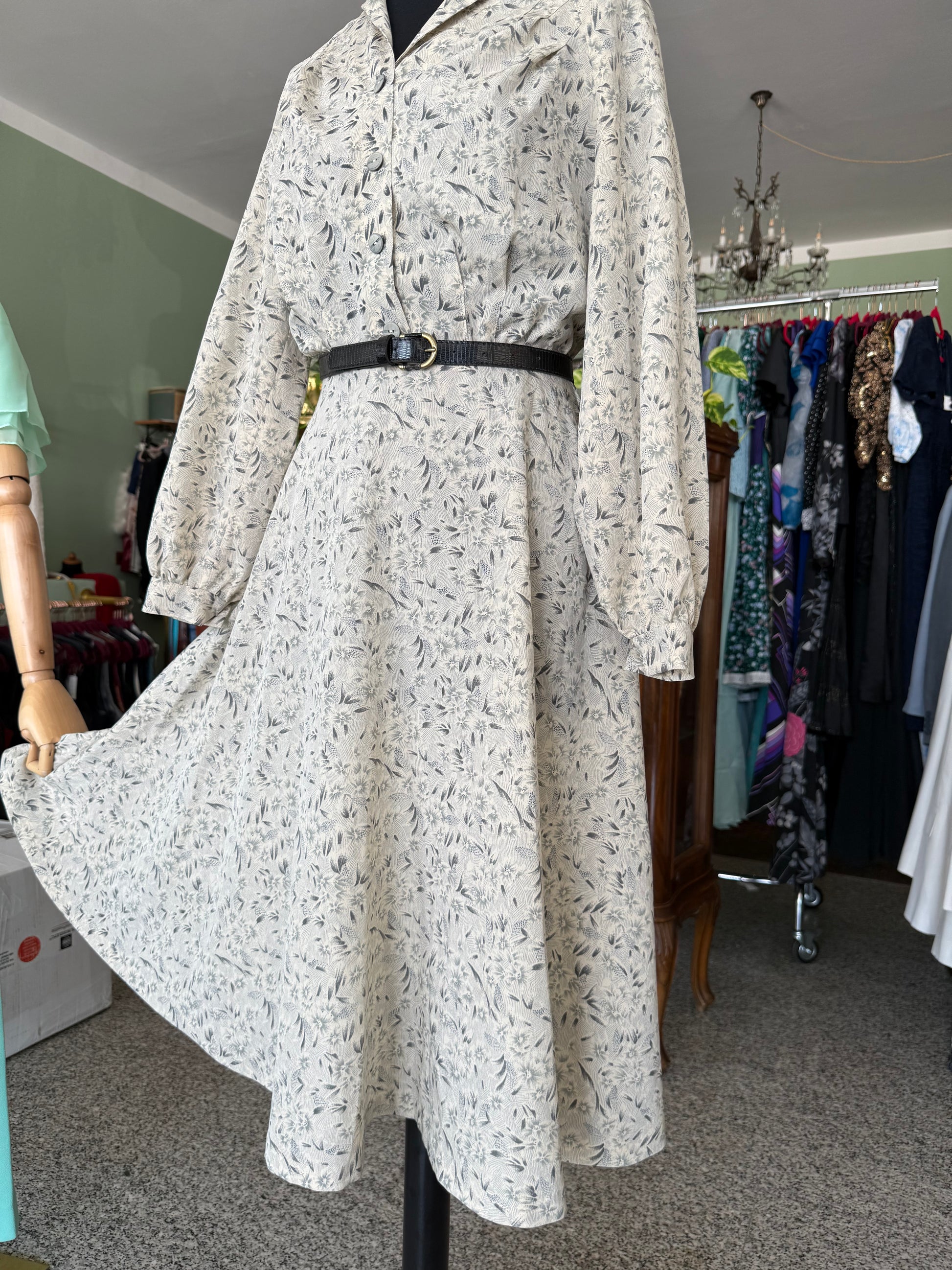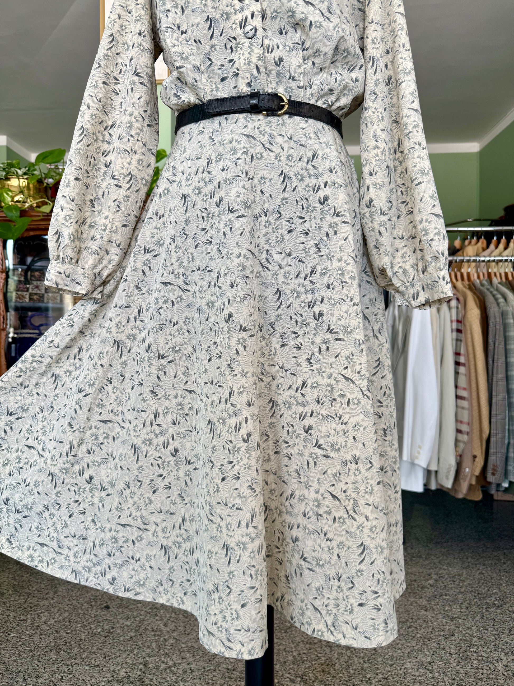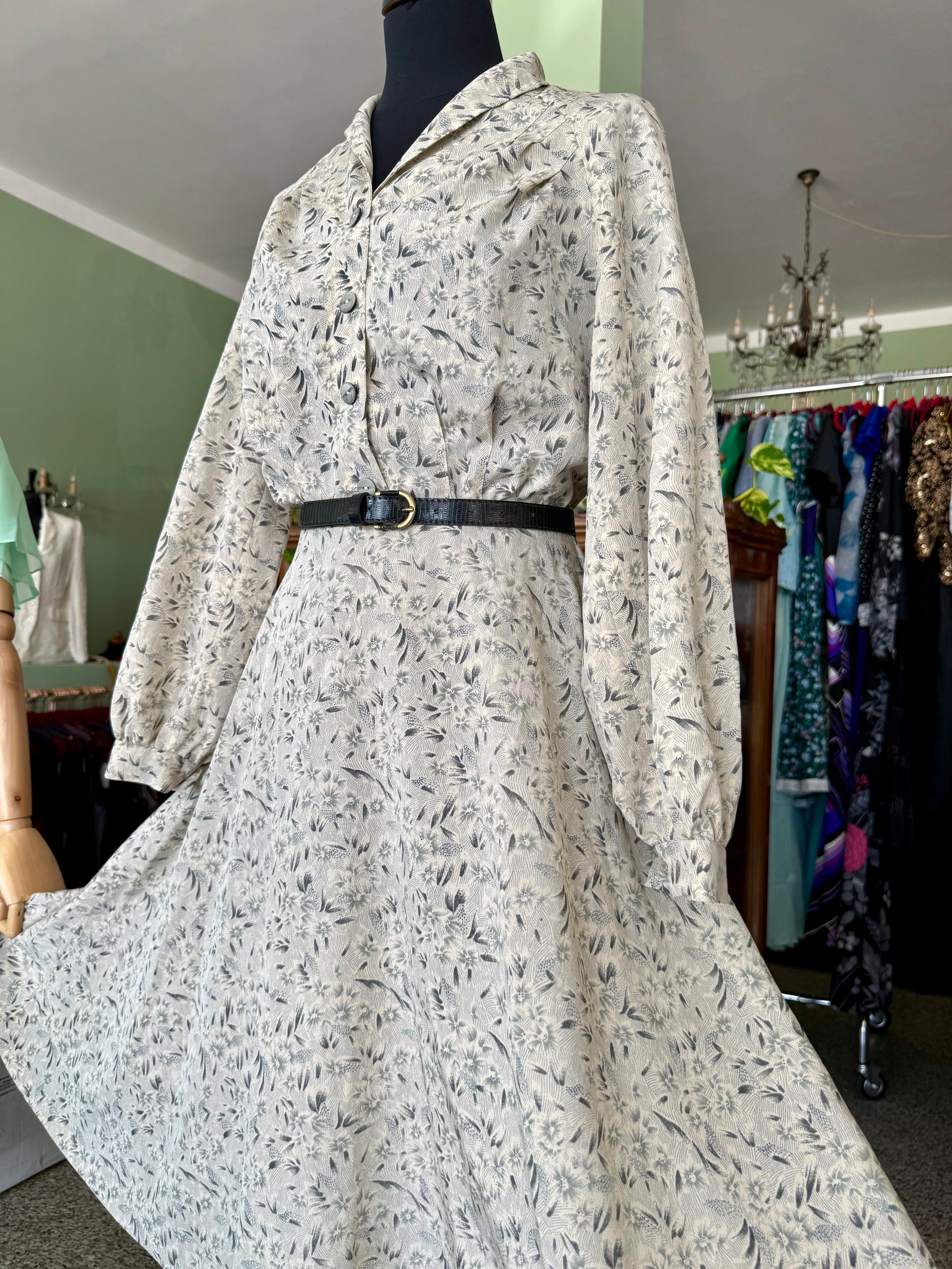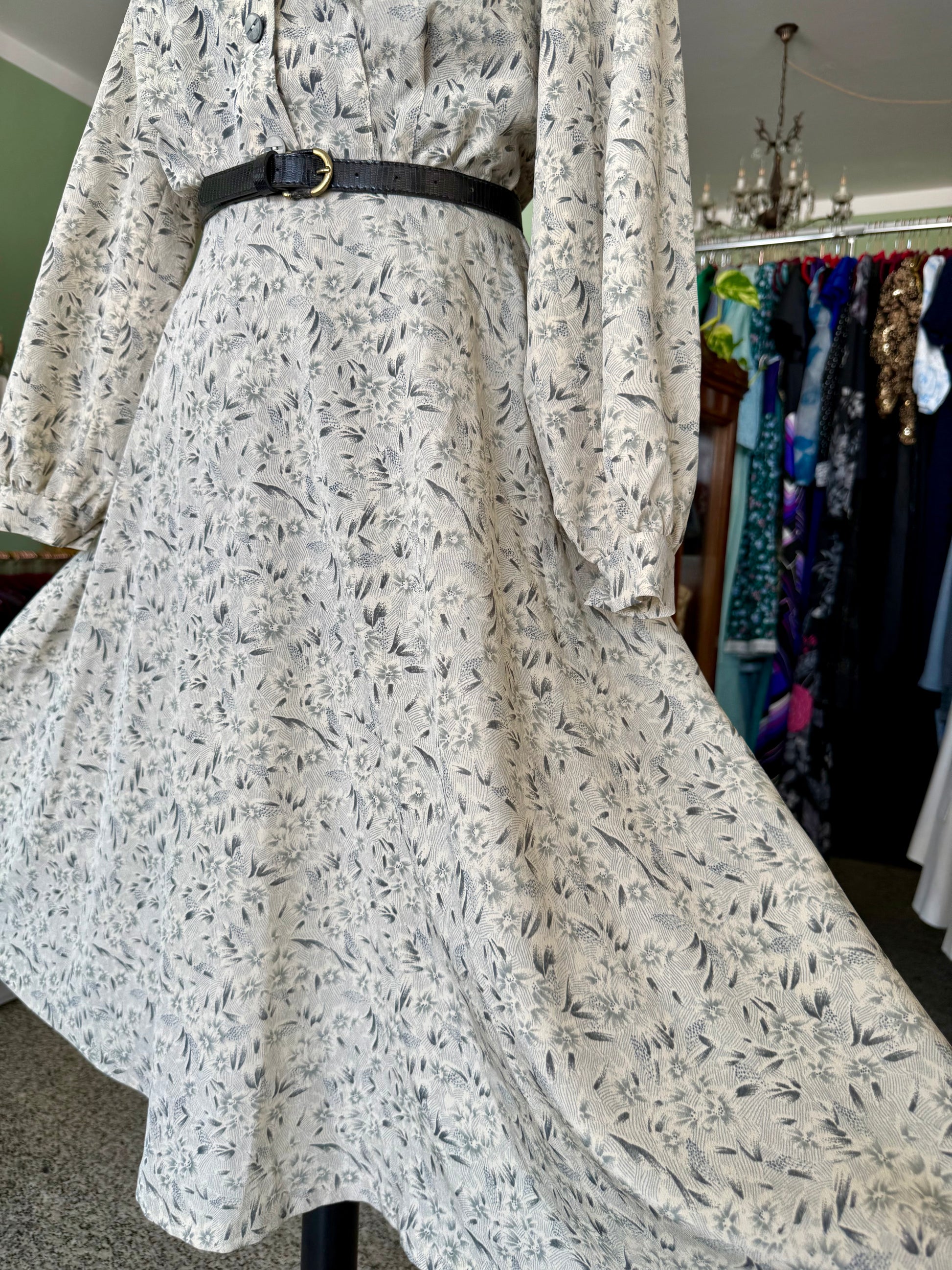 Abito anni ‘70 sartoriale, elegante e romantico, con raffinata fantasia floreale sui toni del grigio. Modello con scollo alto, vita segnata e gonna ampia svasata. Maniche lunghe vaporose che si stringono in prossimità dei polsini.