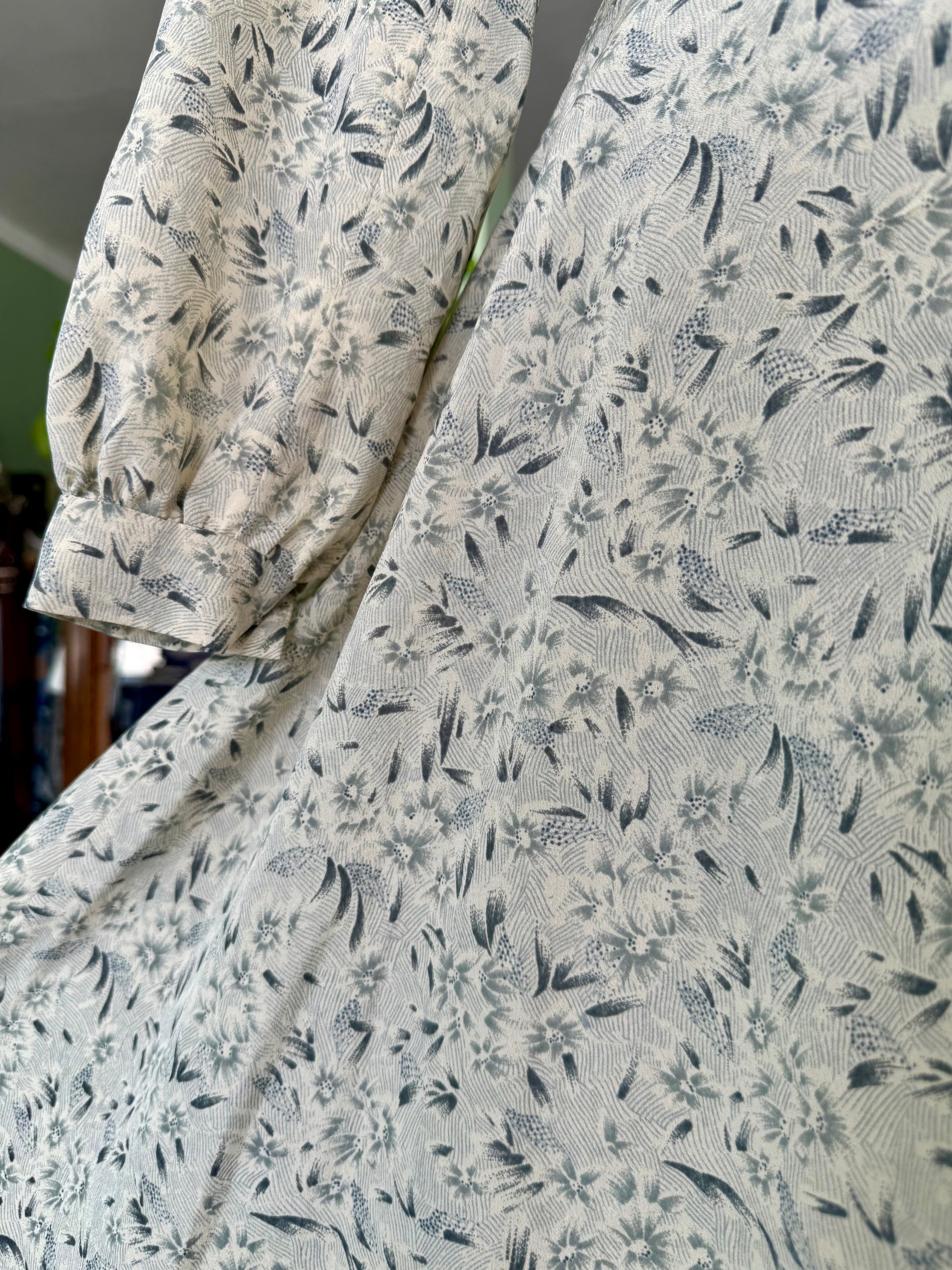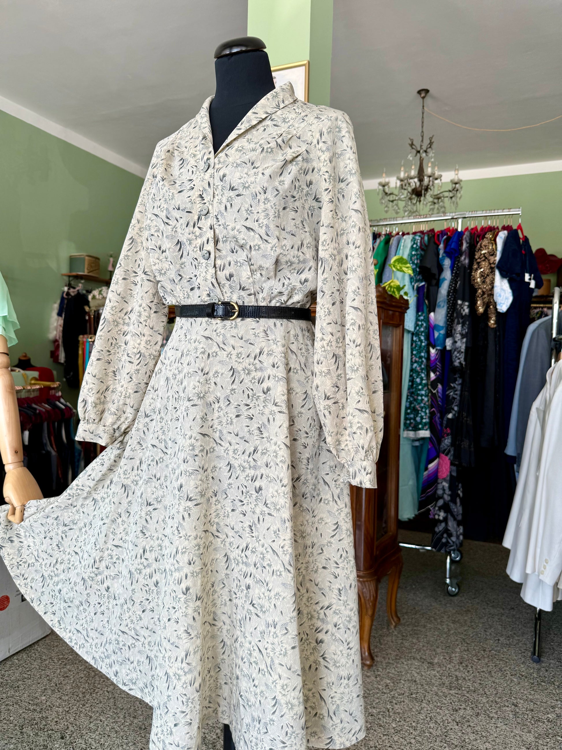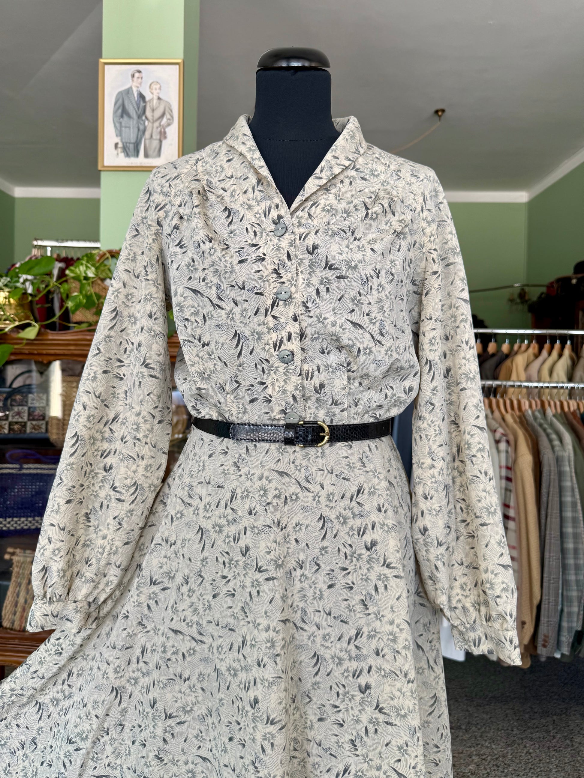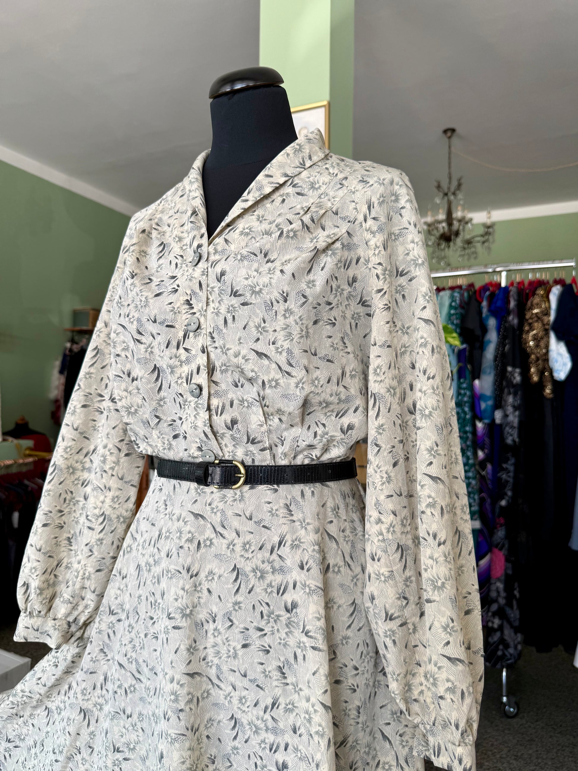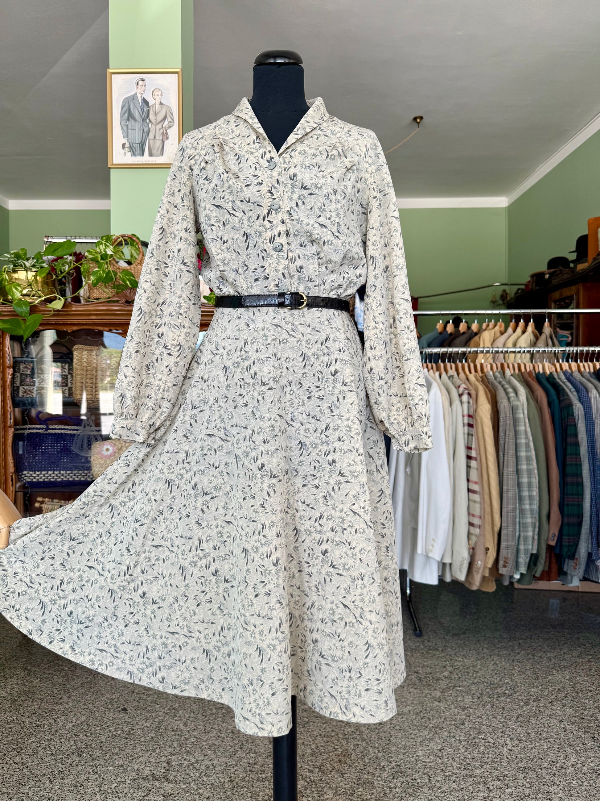 Abito anni ‘70 sartoriale, elegante e romantico, con raffinata fantasia floreale sui toni del grigio. Modello con scollo alto, vita segnata e gonna ampia svasata. Maniche lunghe vaporose che si stringono in prossimità dei polsini.