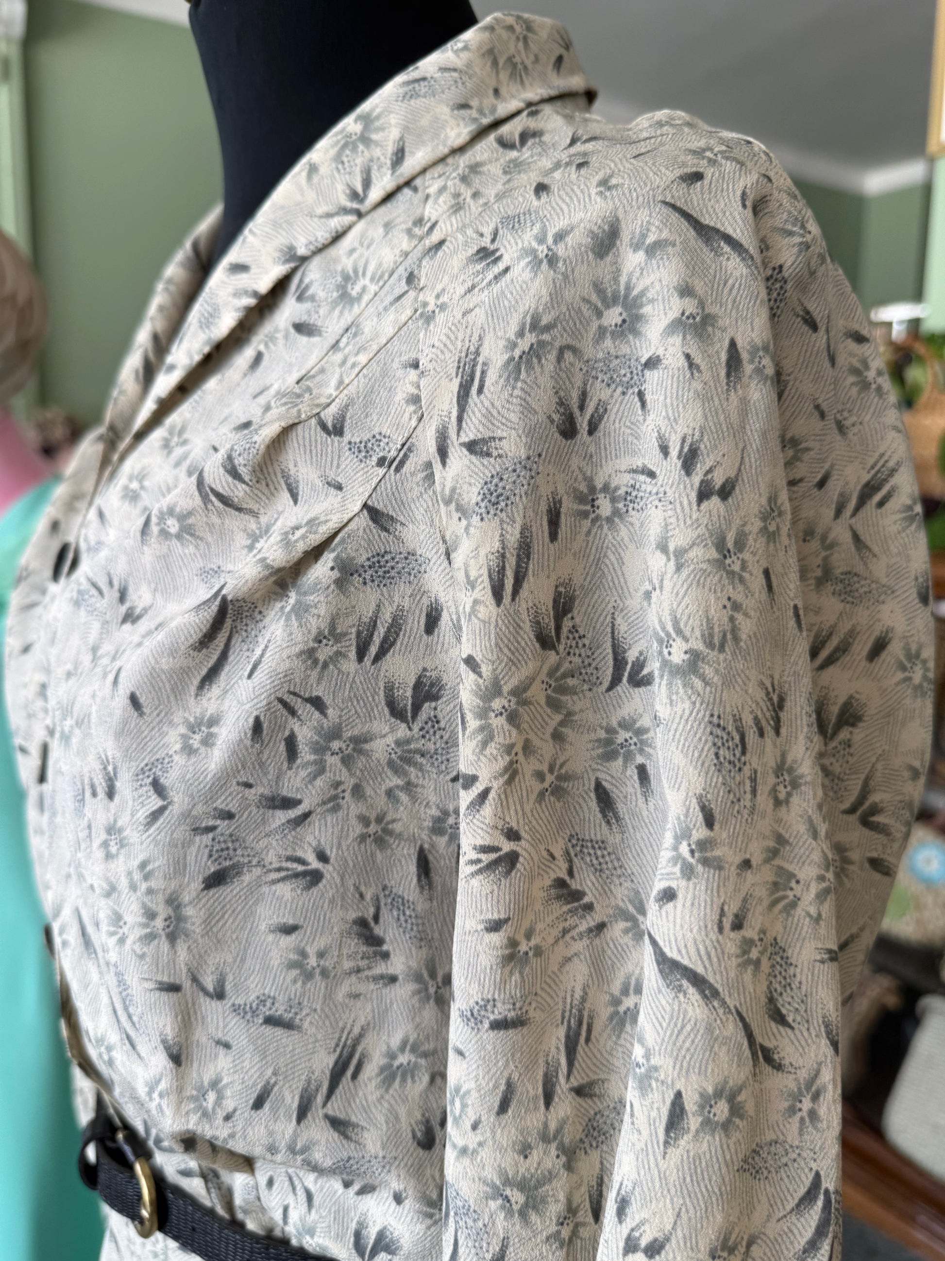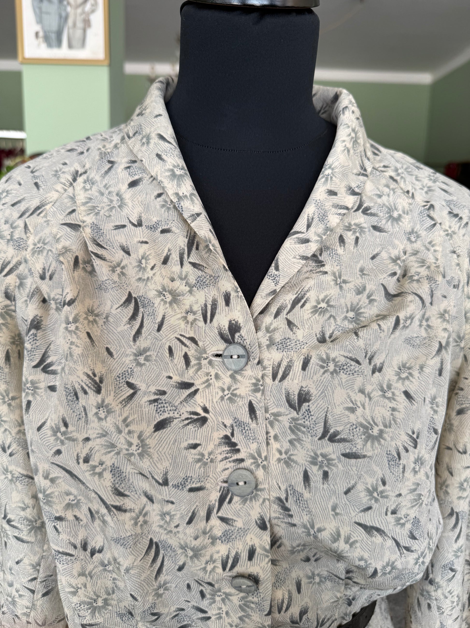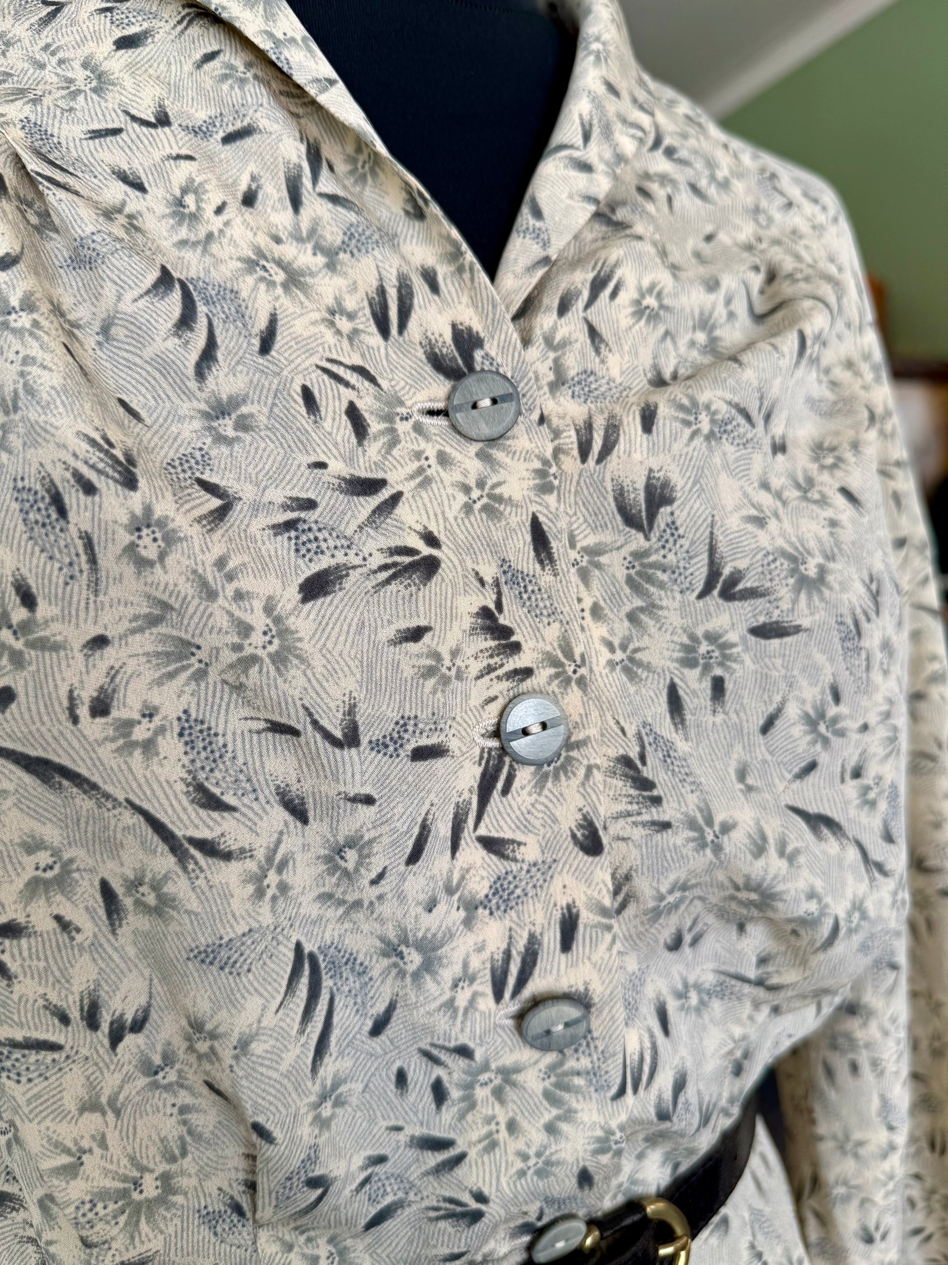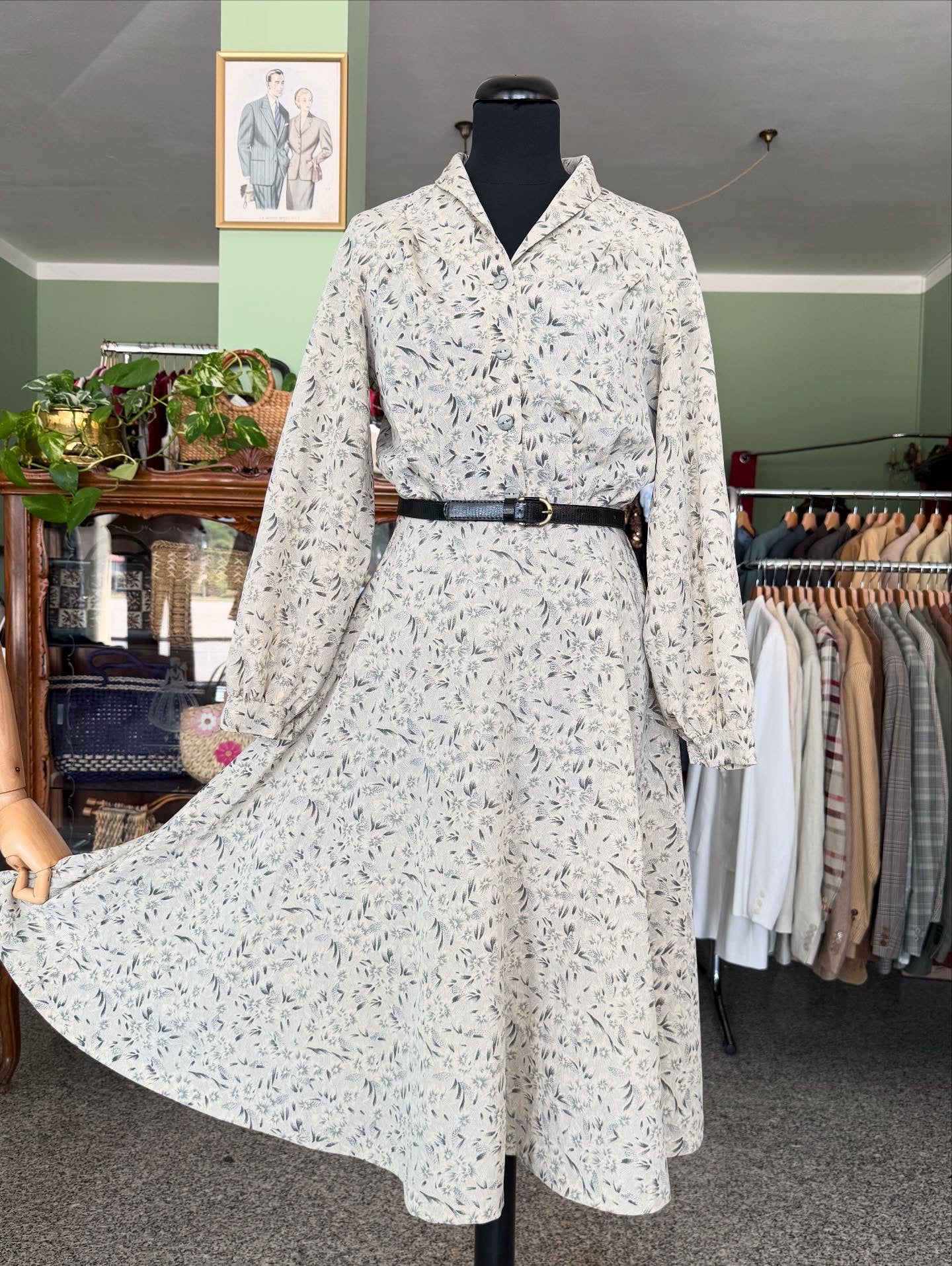 Abito anni ‘70 sartoriale, elegante e romantico, con raffinata fantasia floreale sui toni del grigio. Modello con scollo alto, vita segnata e gonna ampia svasata. Maniche lunghe vaporose che si stringono in prossimità dei polsini.