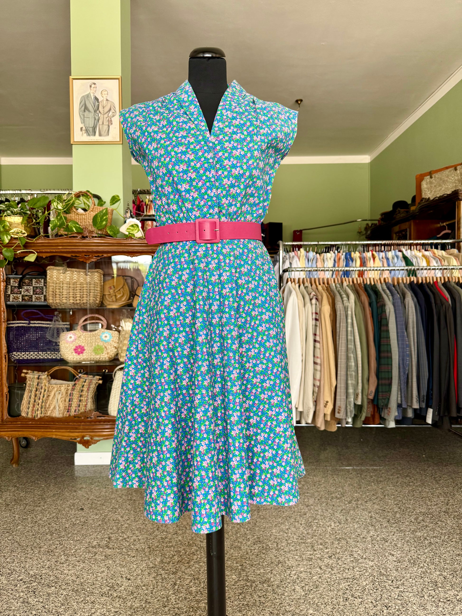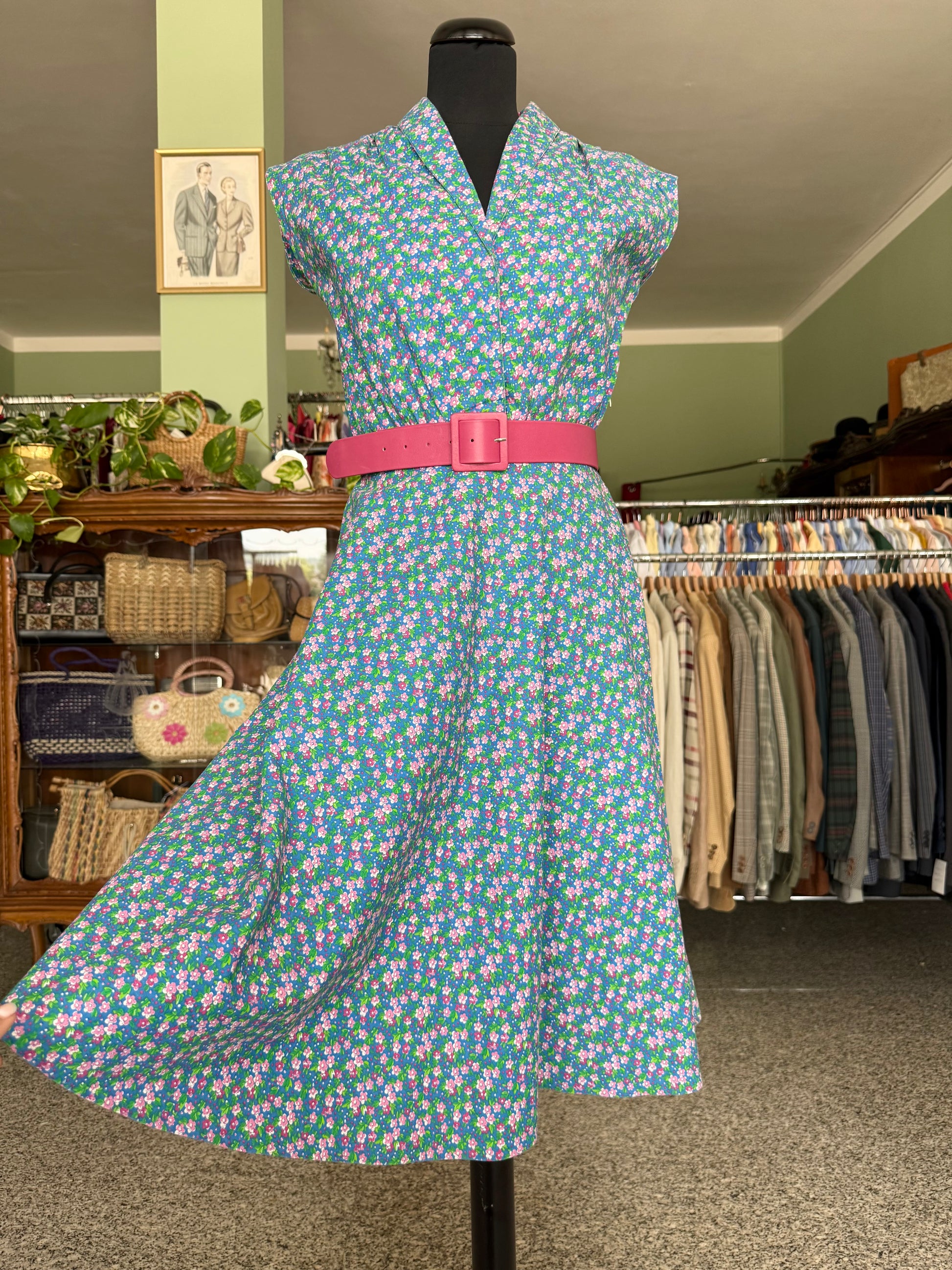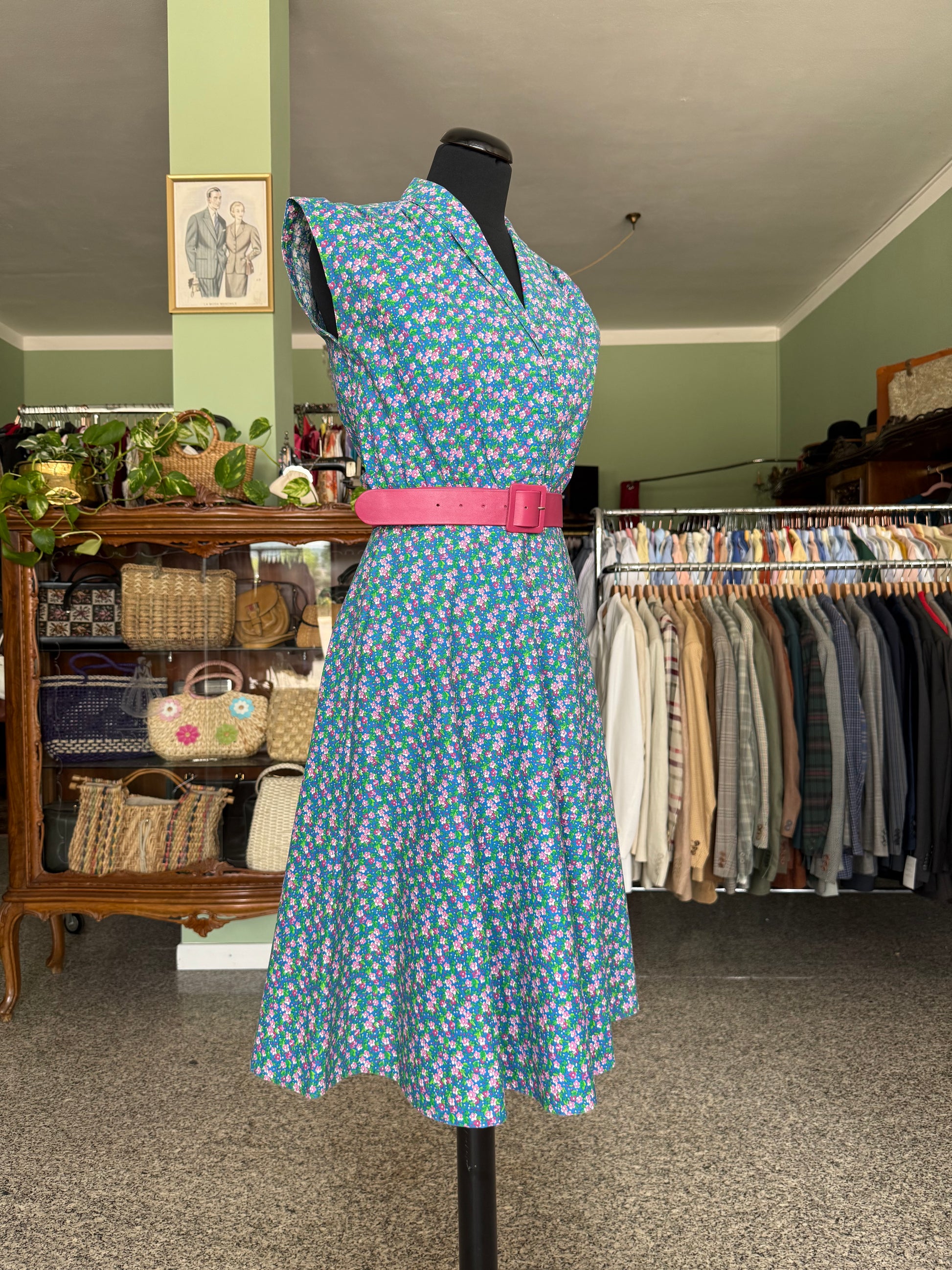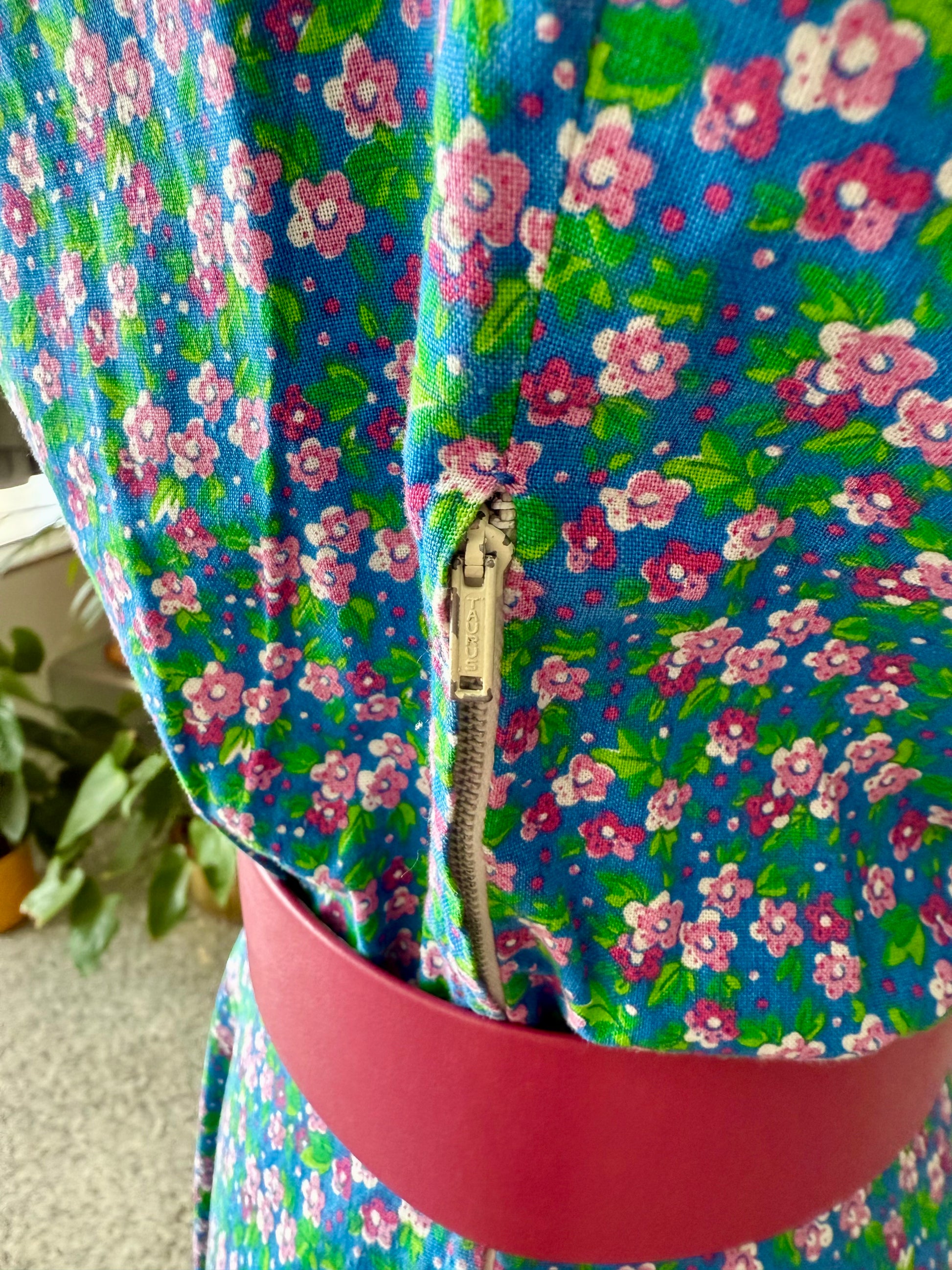 Abito sartoriale della fine degli anni ‘60, in puro cotone azzurro con micro fantasia floreali sui toni del rosa. Modello con vita segnata e gonna svasata, femminile ed elegante. Scollo a V e zip laterale, sul fianco.
