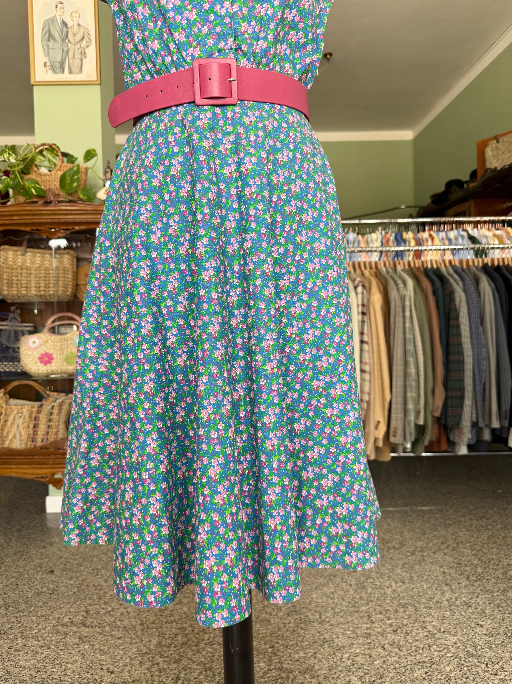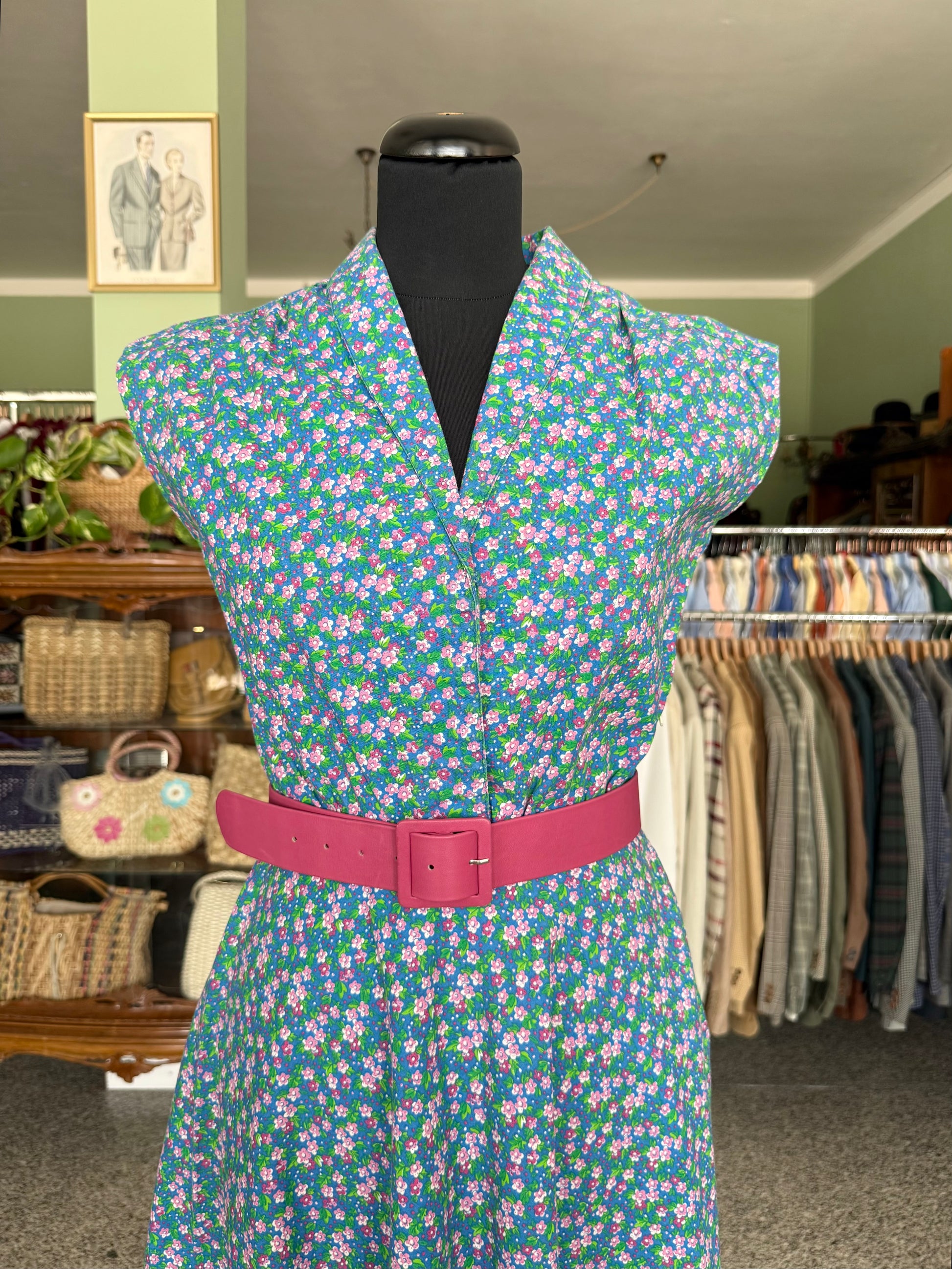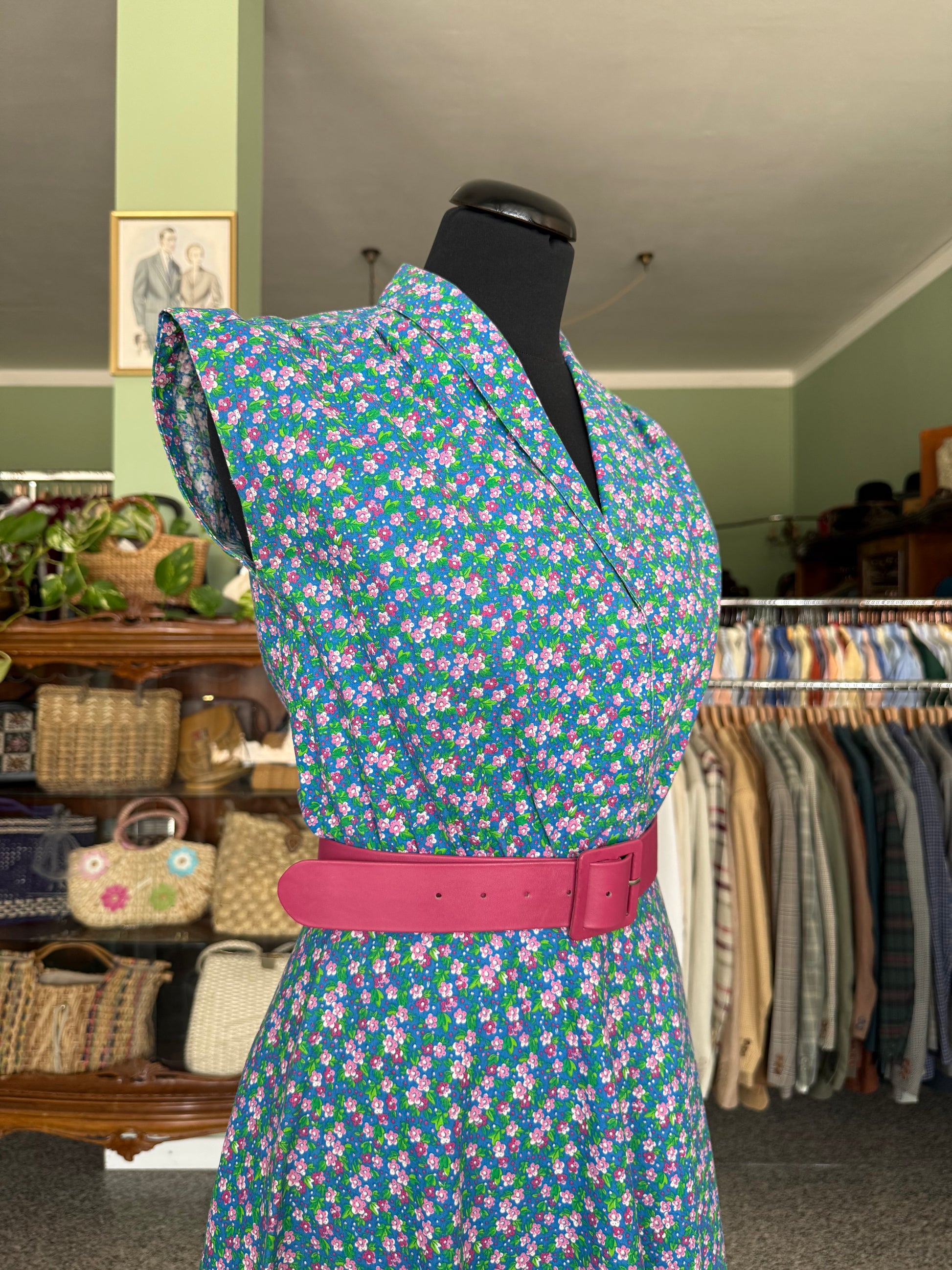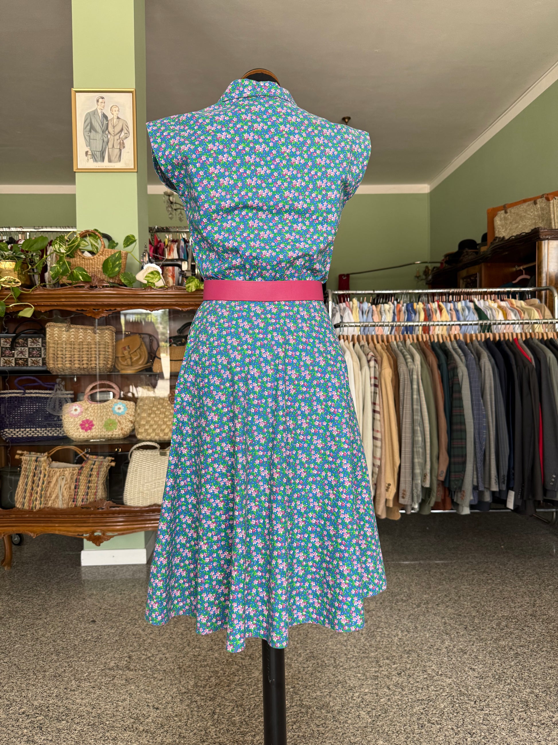 Abito sartoriale della fine degli anni ‘60, in puro cotone azzurro con micro fantasia floreali sui toni del rosa. Modello con vita segnata e gonna svasata, femminile ed elegante. Scollo a V e zip laterale, sul fianco.