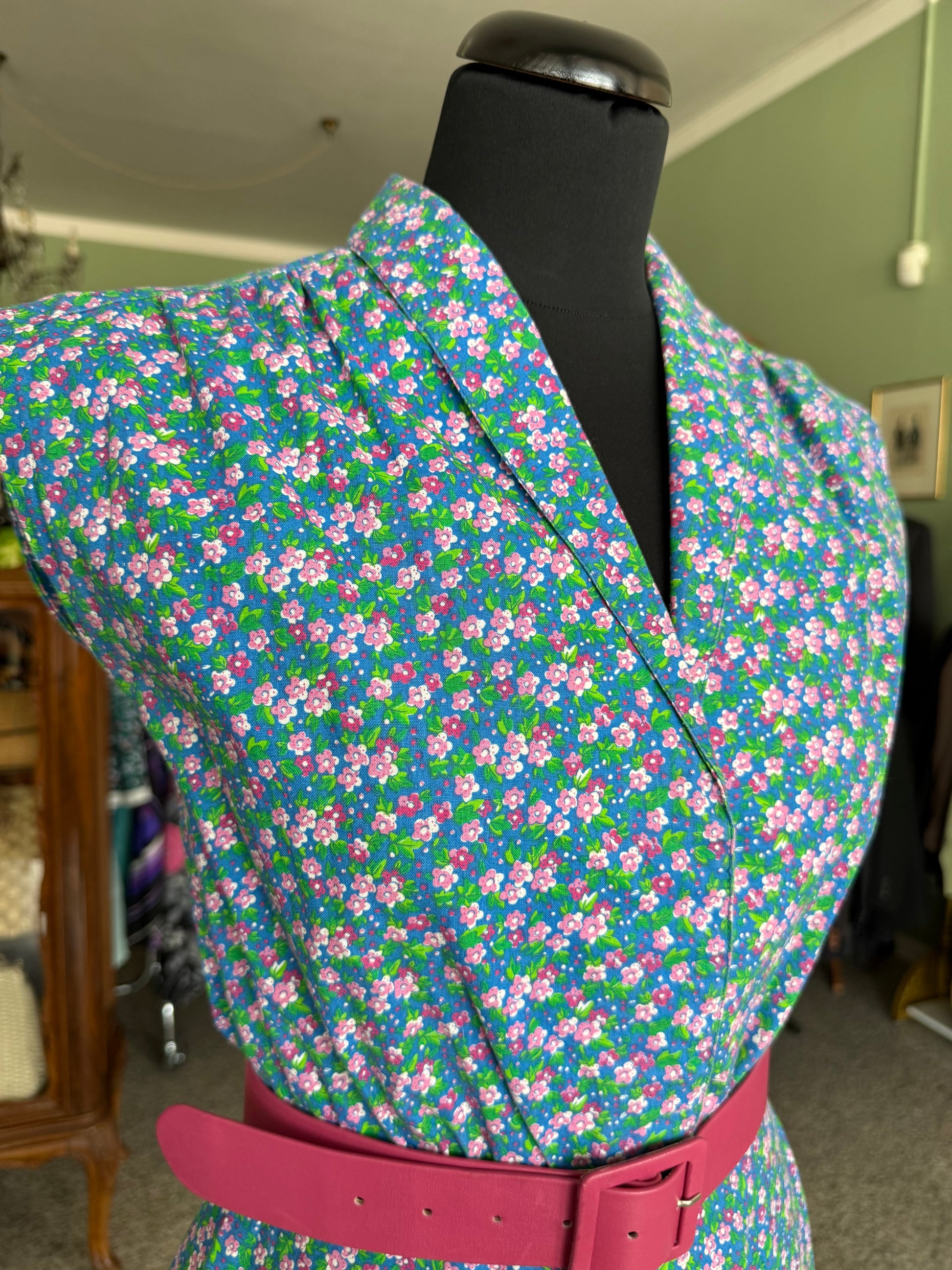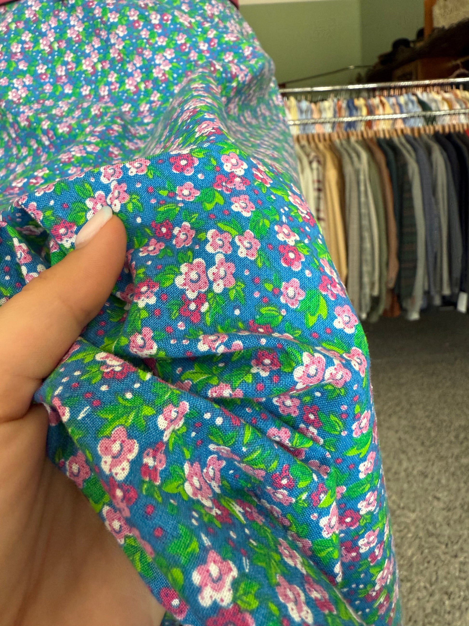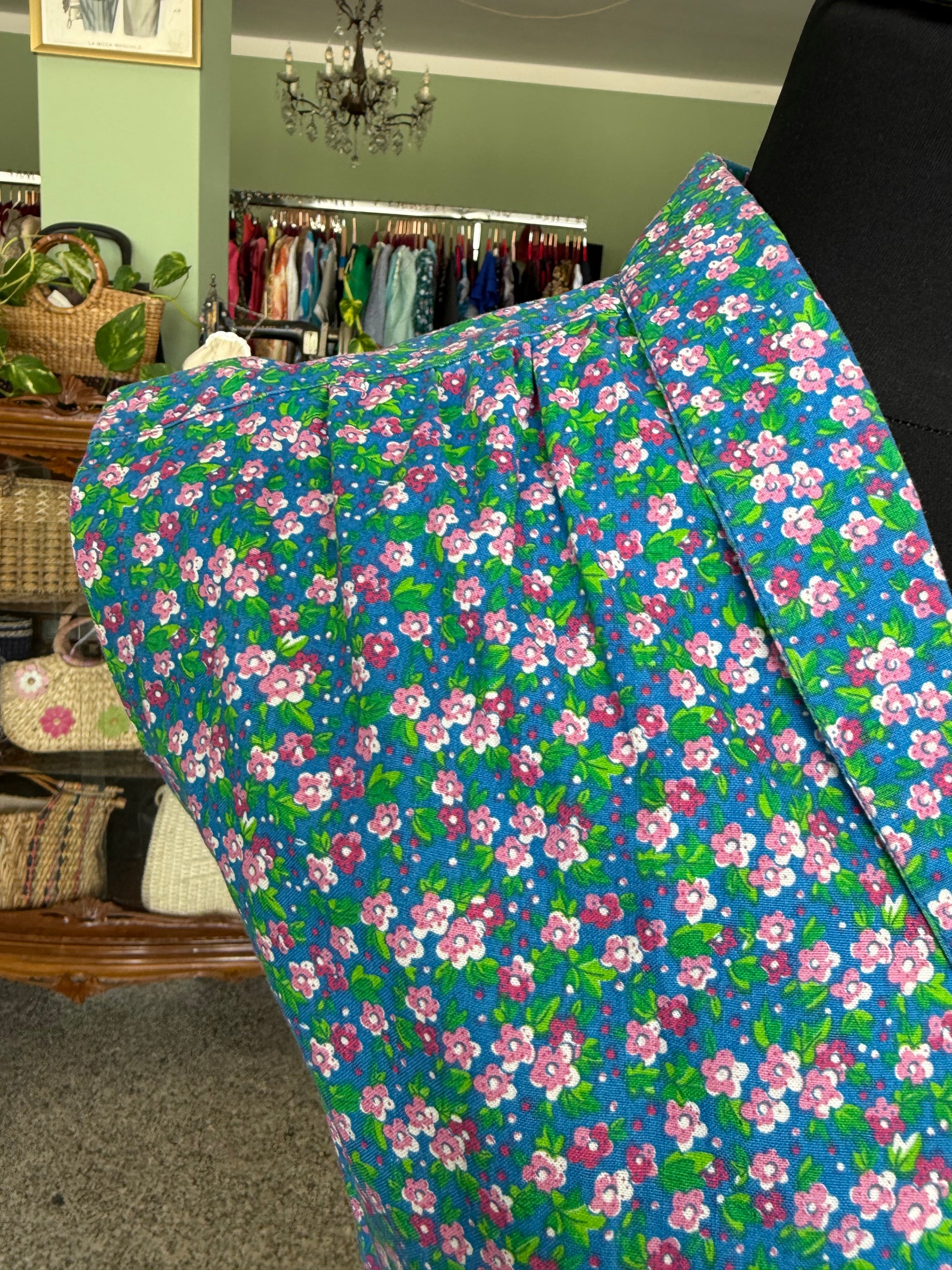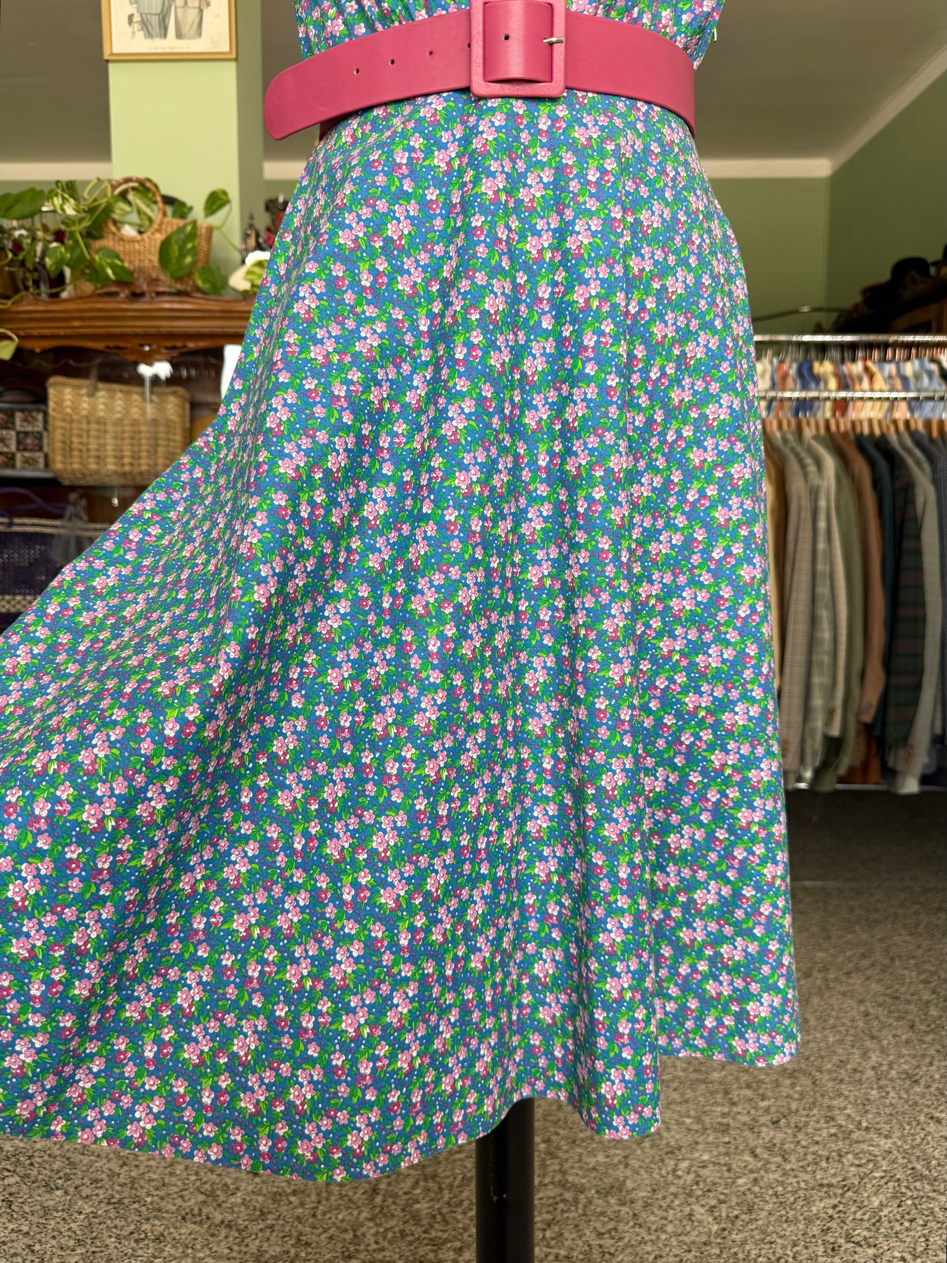 Abito sartoriale della fine degli anni ‘60, in puro cotone azzurro con micro fantasia floreali sui toni del rosa. Modello con vita segnata e gonna svasata, femminile ed elegante. Scollo a V e zip laterale, sul fianco.
