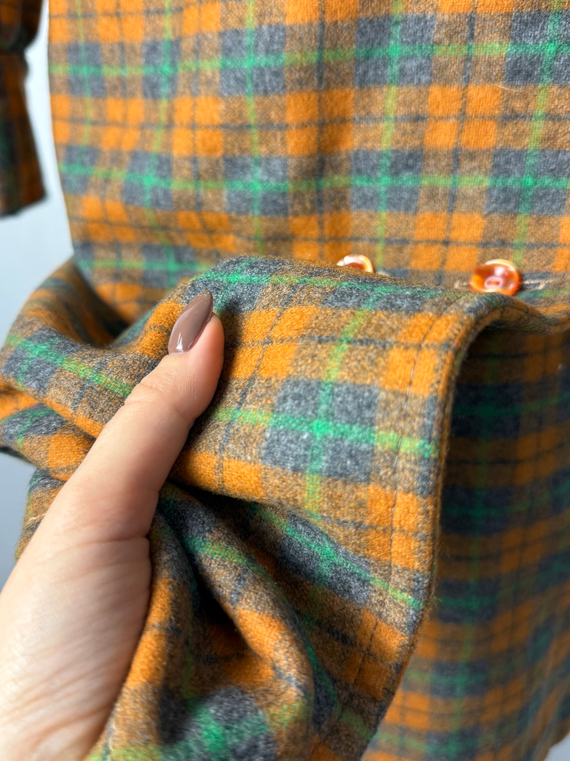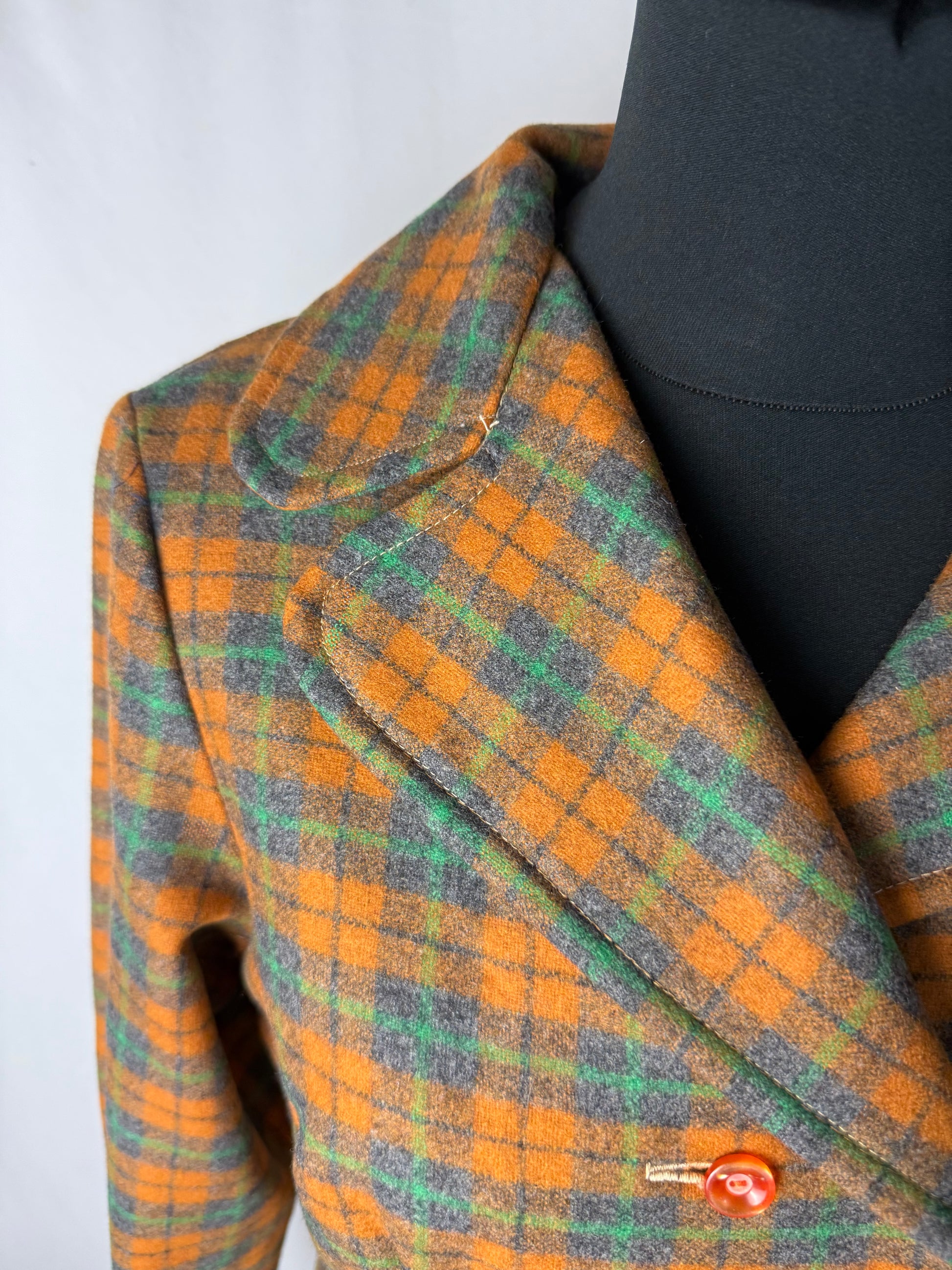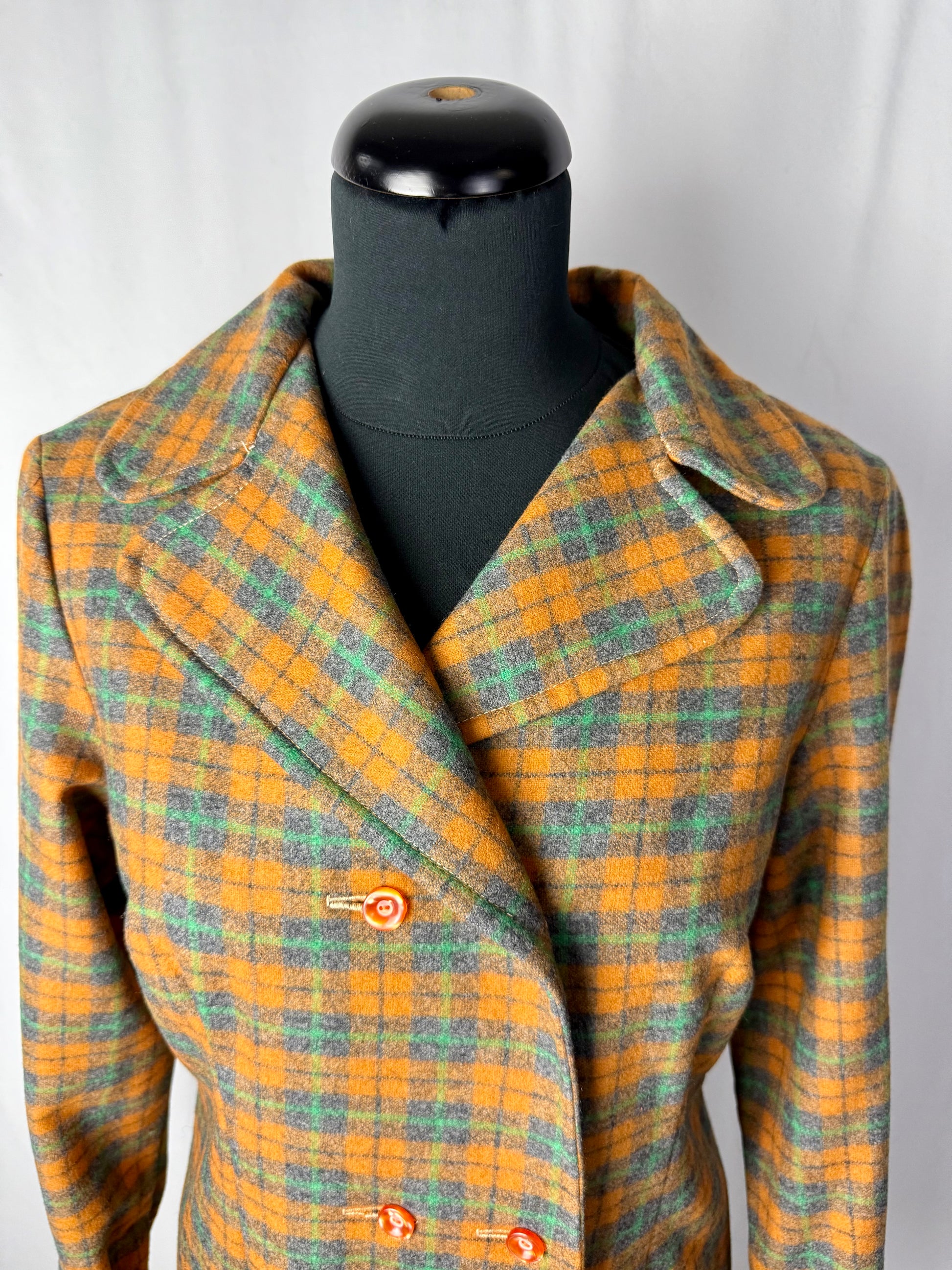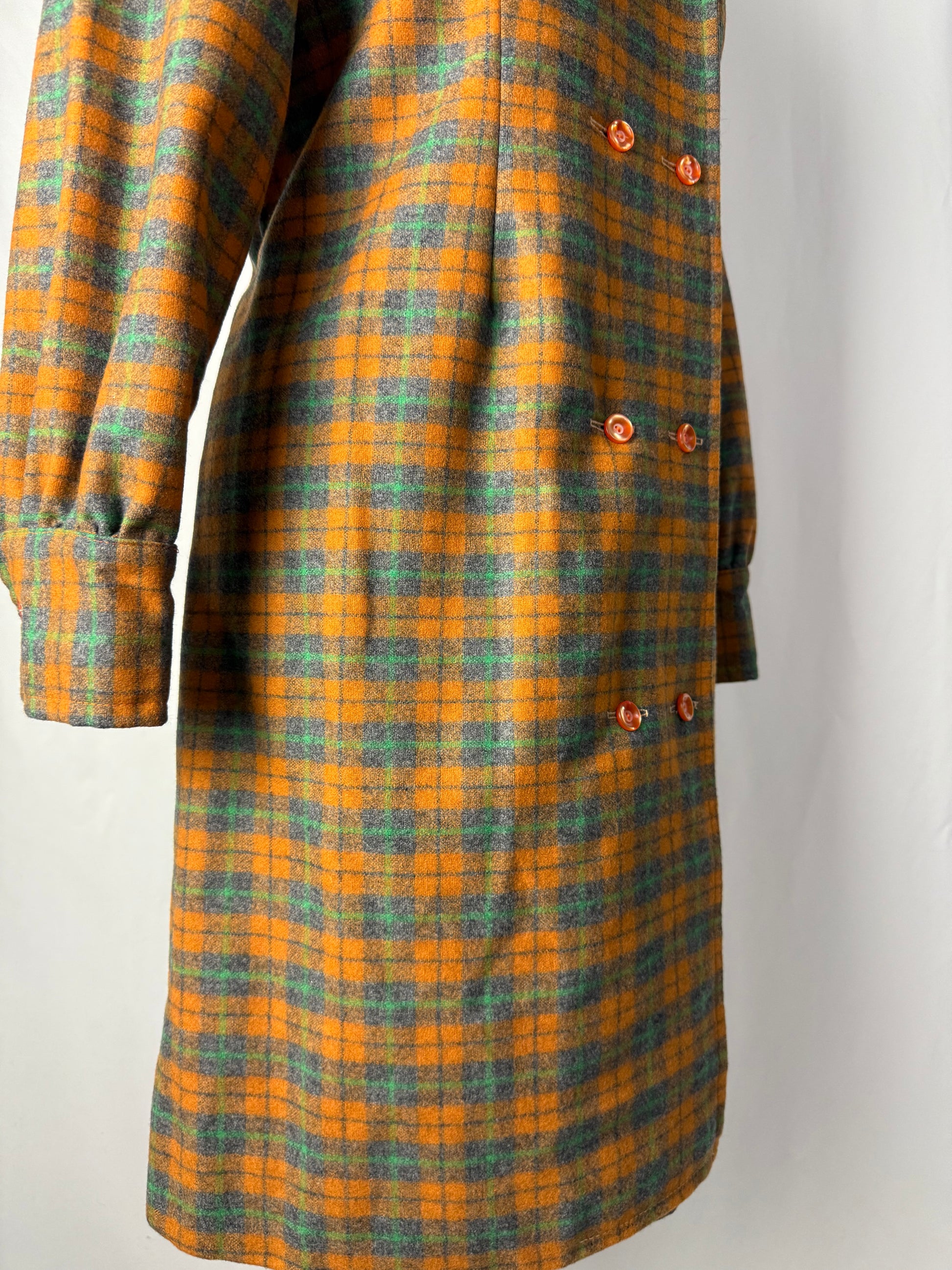 Abito sartoriale in pura lana con costruzione a doppiopetto e colletto rever, caratterizzato da una linea leggermente svasata e maniche lunghe con polsino abbottonato. Il tessuto presenta un motivo scozzese a quadri nei toni caldi dell’ocra, del verde e del grigio, rifinito con bottoni tono arancio in evidenza. Un modello dal taglio pulito e strutturato, tipico della confezione anni ’60/’70, ideale come capo outerwear elegante e senza tempo.