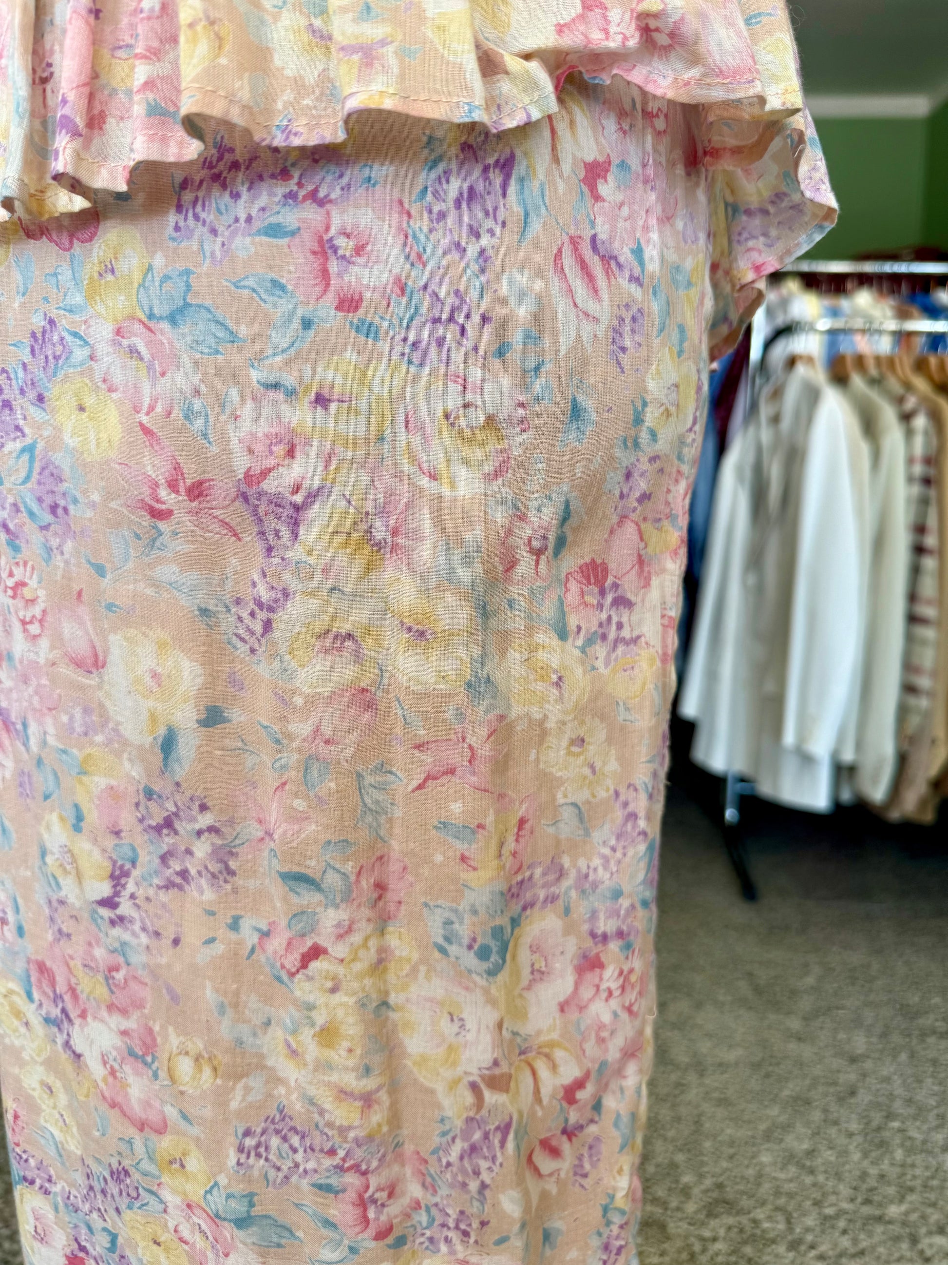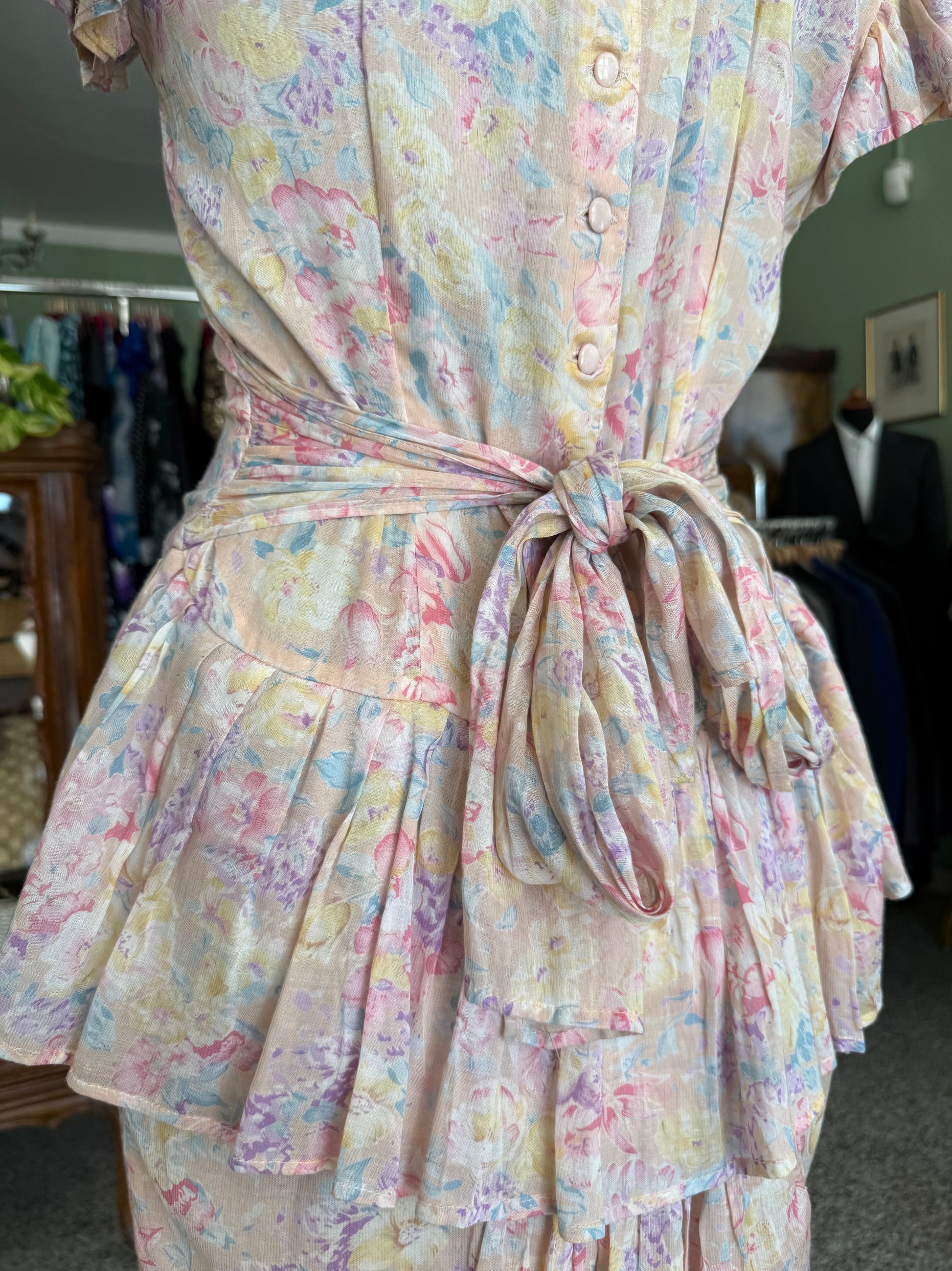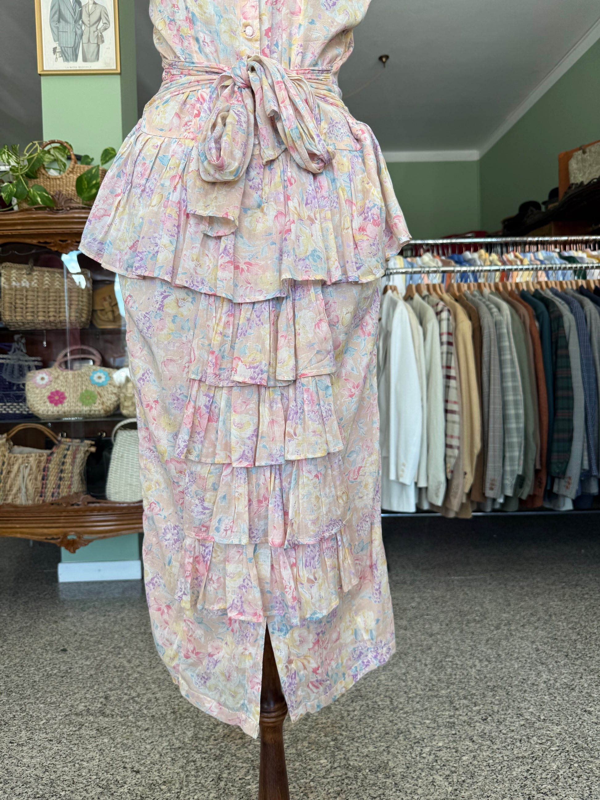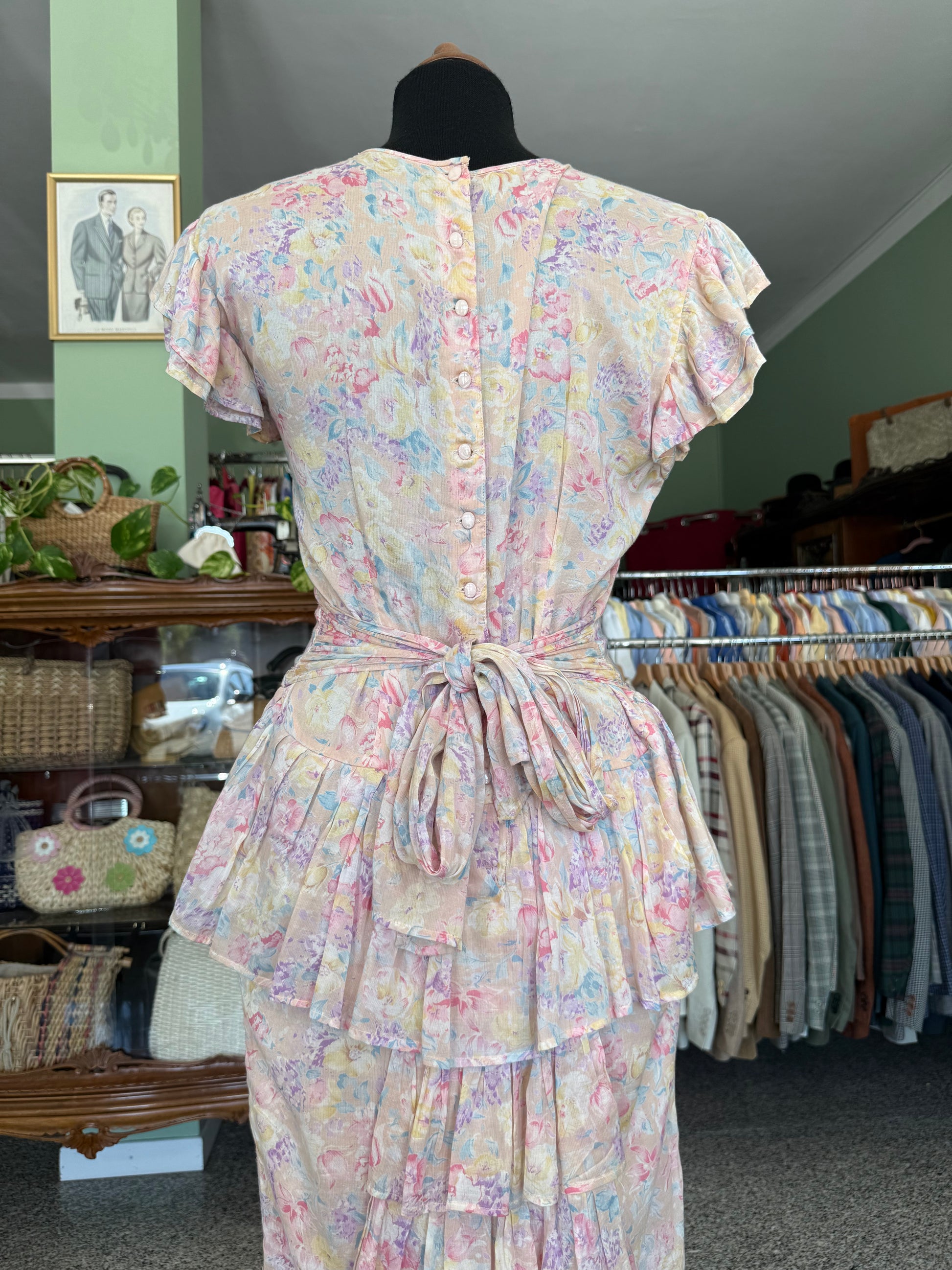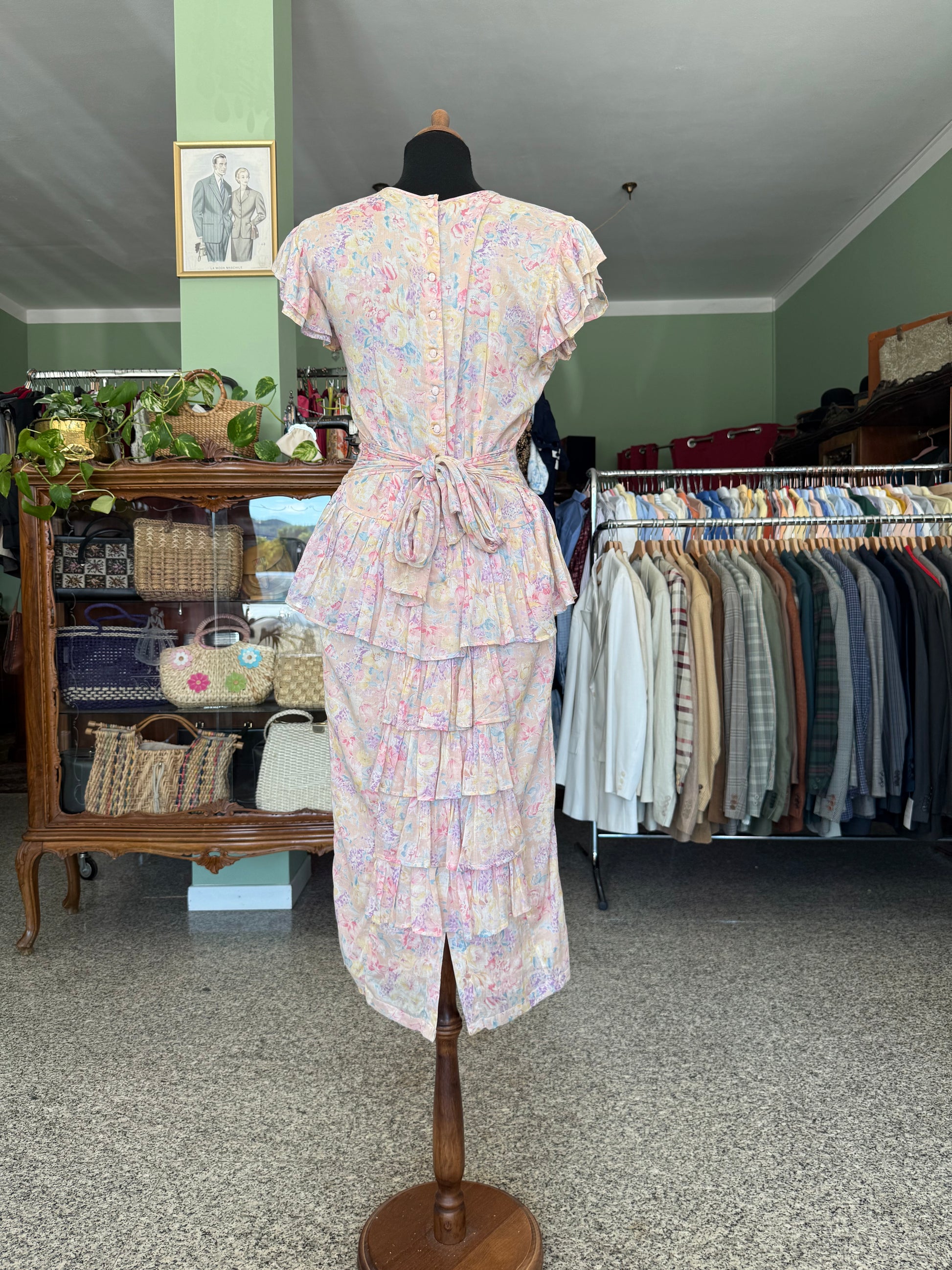 Quest’abito anni ‘80 è un trionfo di femminilità e dettagli decorativi. Realizzato in mussola di cotone delicatamente a fantasia floreale dai colori pastello – rosa, lilla, giallo e azzurro – trasmette un’atmosfera delicata e romantica. La parte superiore presenta maniche corte leggermente a sbuffo e una fila di piccoli bottoni sul retro, che aggiungono grazia e raffinatezza. In vita, una cintura dello stesso tessuto si annoda con un fiocco sul retro, sottolineando la silhouette. La gonna è movimentata sul retro da più strati di balze sovrapposte, che donano volume e leggerezza a ogni passo. È un abito che evoca immediatamente immagini di giardini fioriti e momenti conviviali, pensato per occasioni in cui romanticismo e grazia erano protagonisti assoluti.