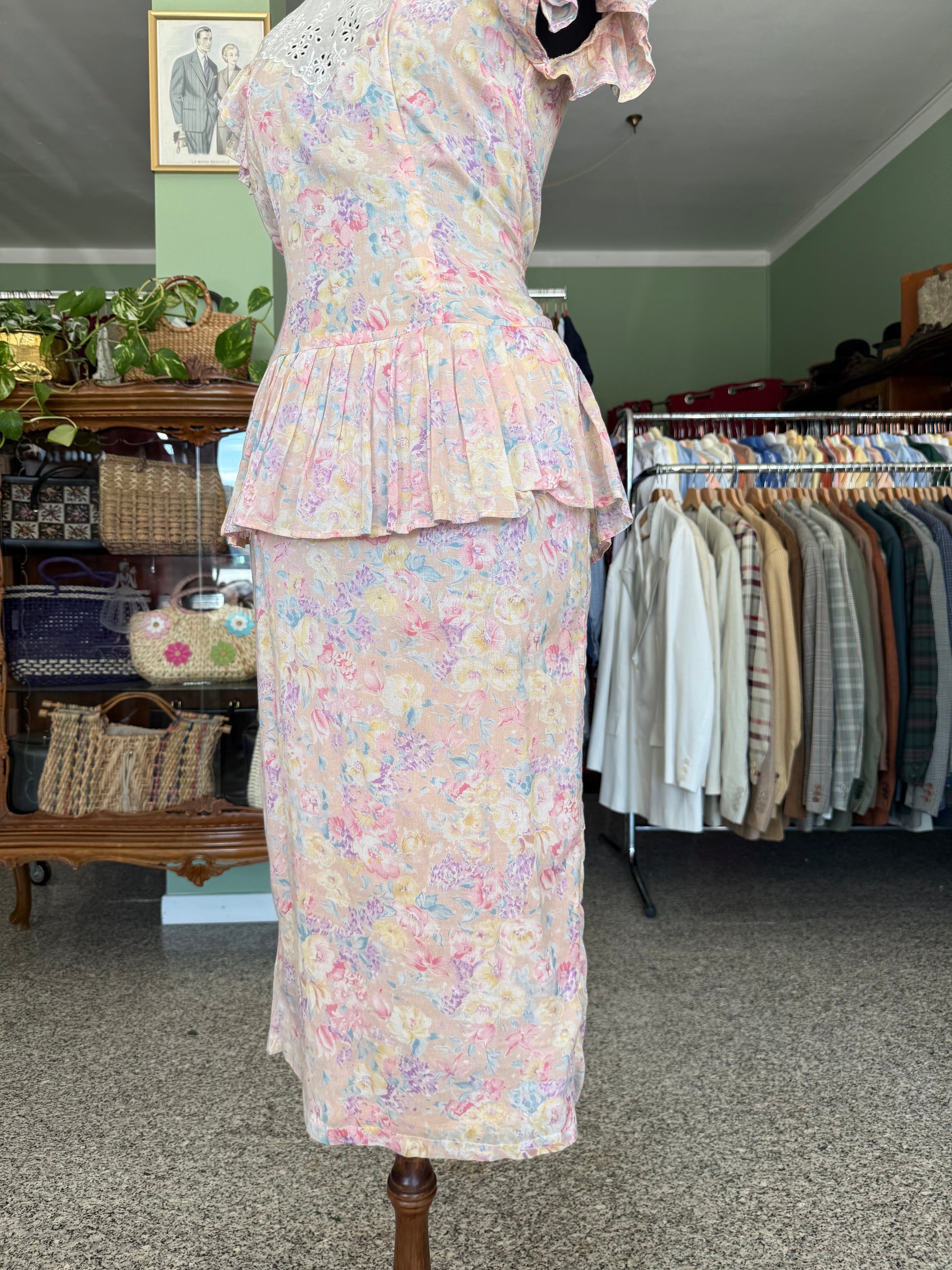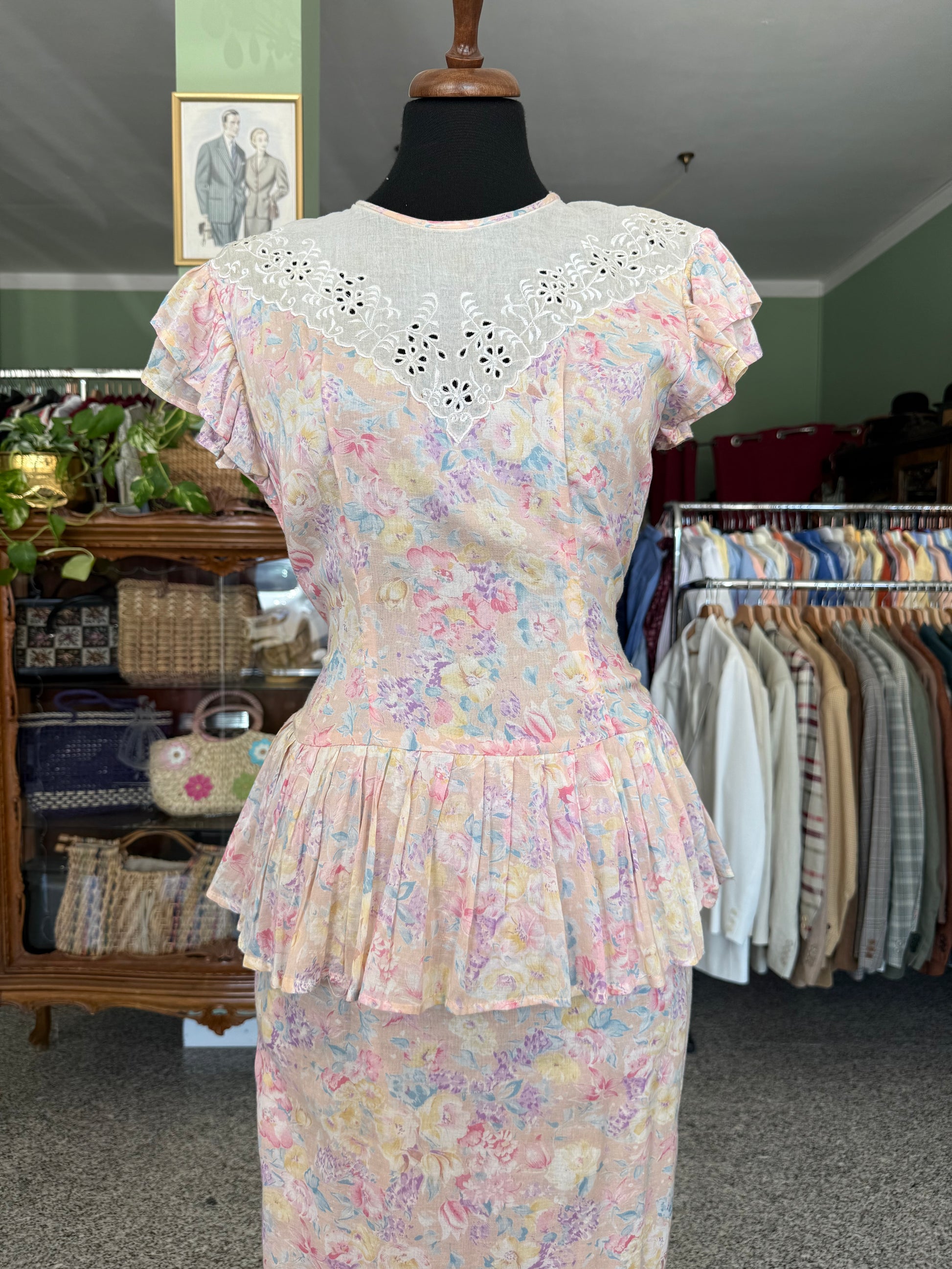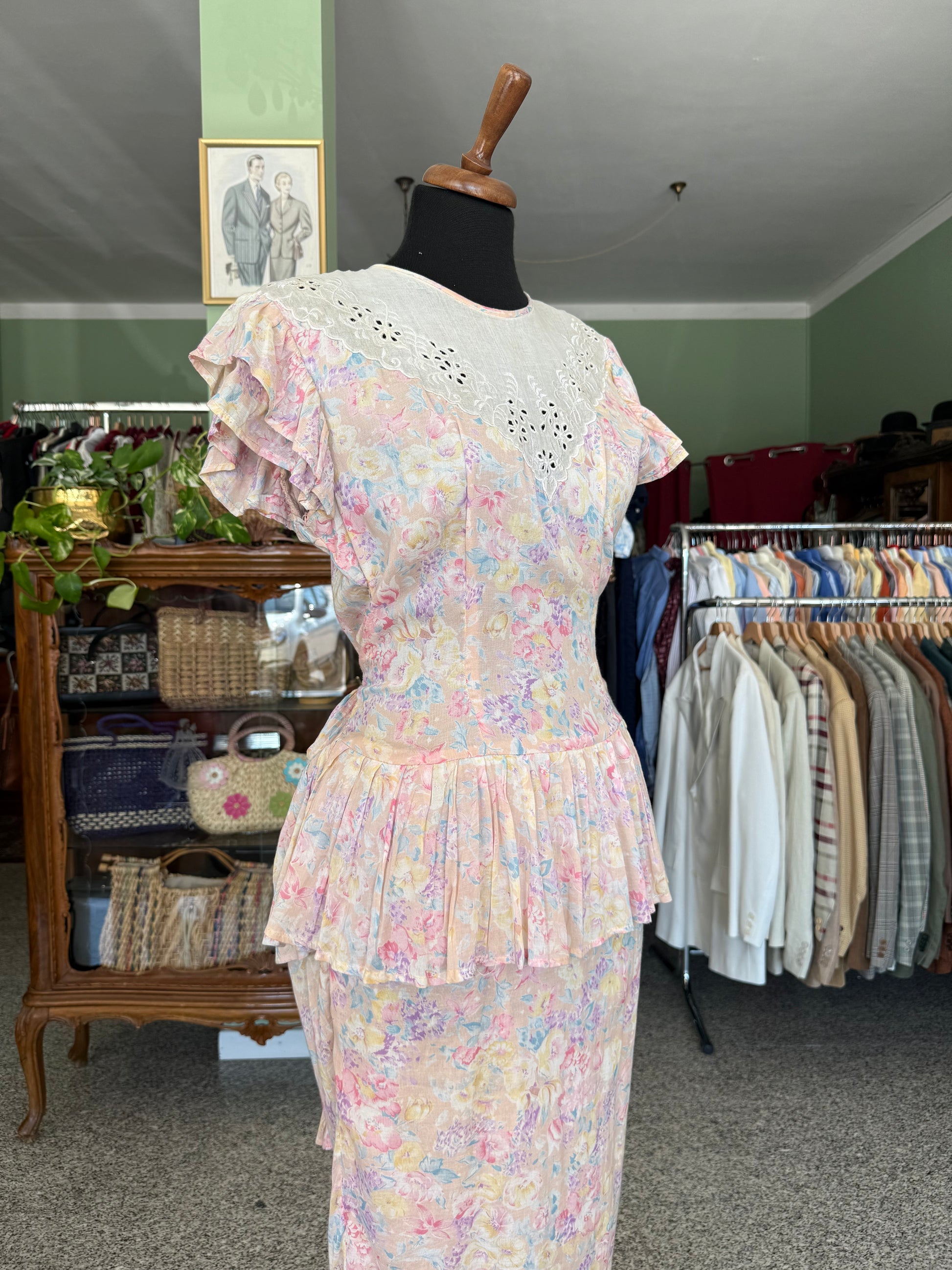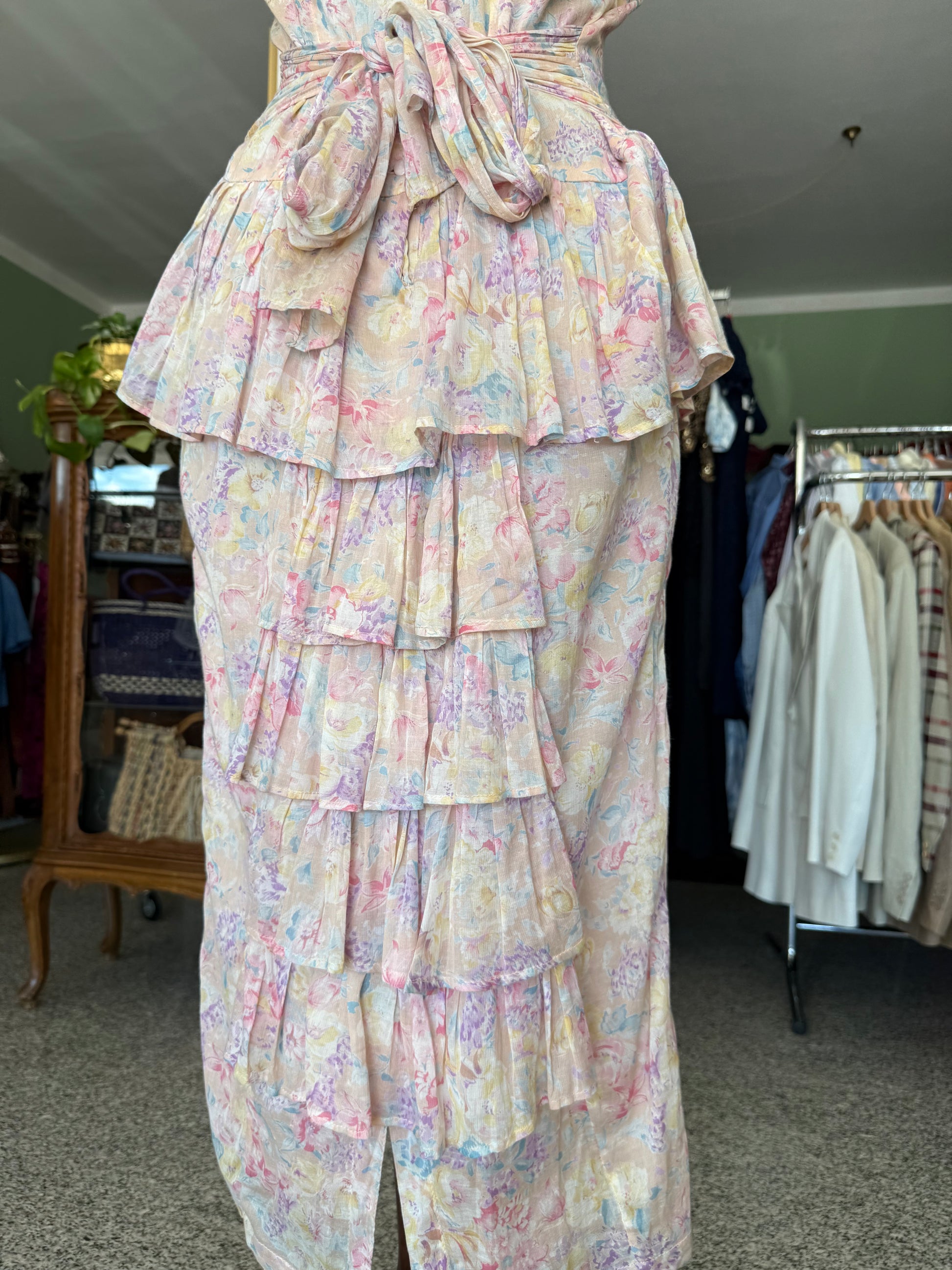 Quest’abito anni ‘80 è un trionfo di femminilità e dettagli decorativi. Realizzato in mussola di cotone delicatamente a fantasia floreale dai colori pastello – rosa, lilla, giallo e azzurro – trasmette un’atmosfera delicata e romantica. La parte superiore presenta maniche corte leggermente a sbuffo e una fila di piccoli bottoni sul retro, che aggiungono grazia e raffinatezza. In vita, una cintura dello stesso tessuto si annoda con un fiocco sul retro, sottolineando la silhouette. La gonna è movimentata sul retro da più strati di balze sovrapposte, che donano volume e leggerezza a ogni passo. È un abito che evoca immediatamente immagini di giardini fioriti e momenti conviviali, pensato per occasioni in cui romanticismo e grazia erano protagonisti assoluti.
