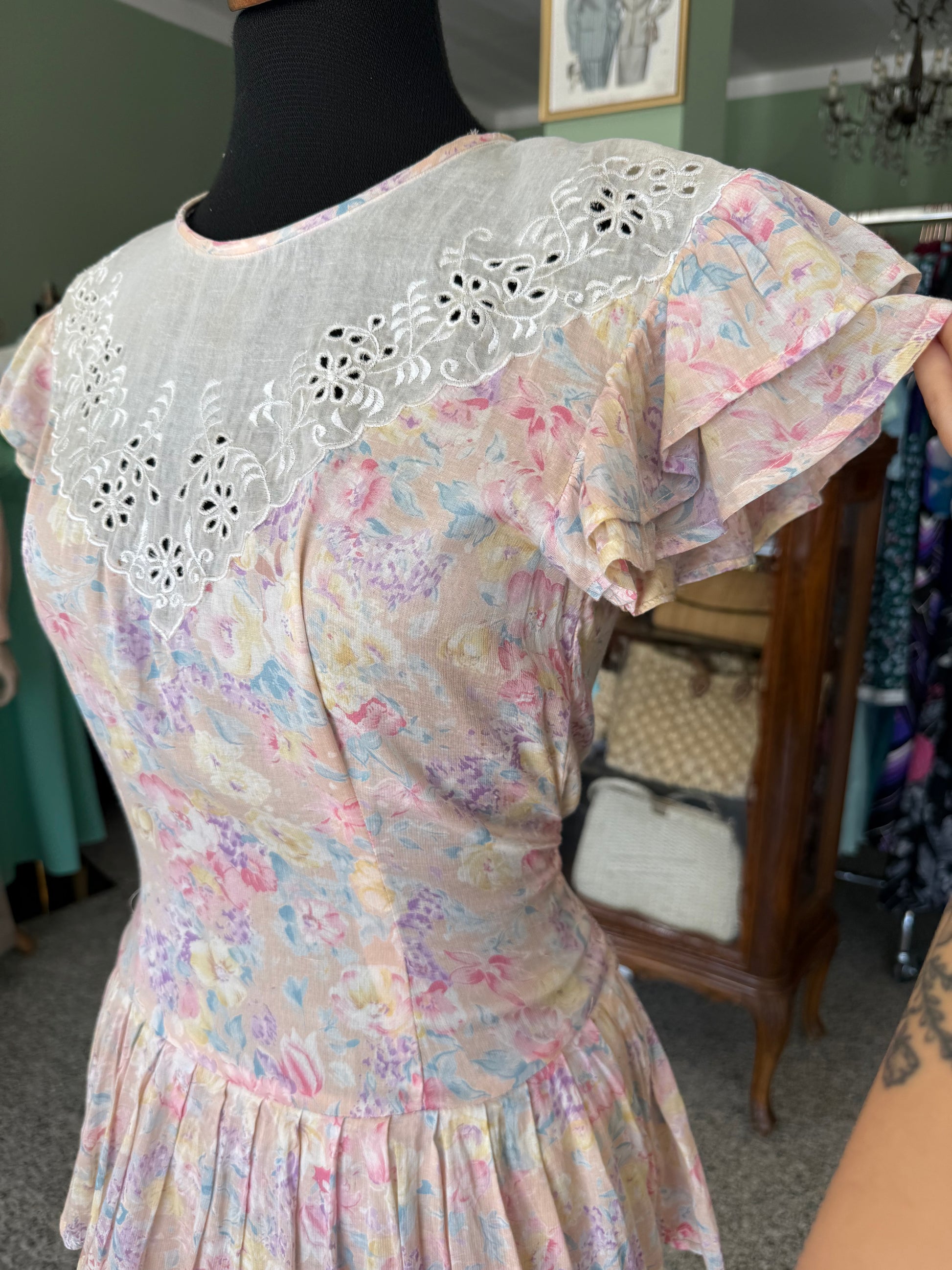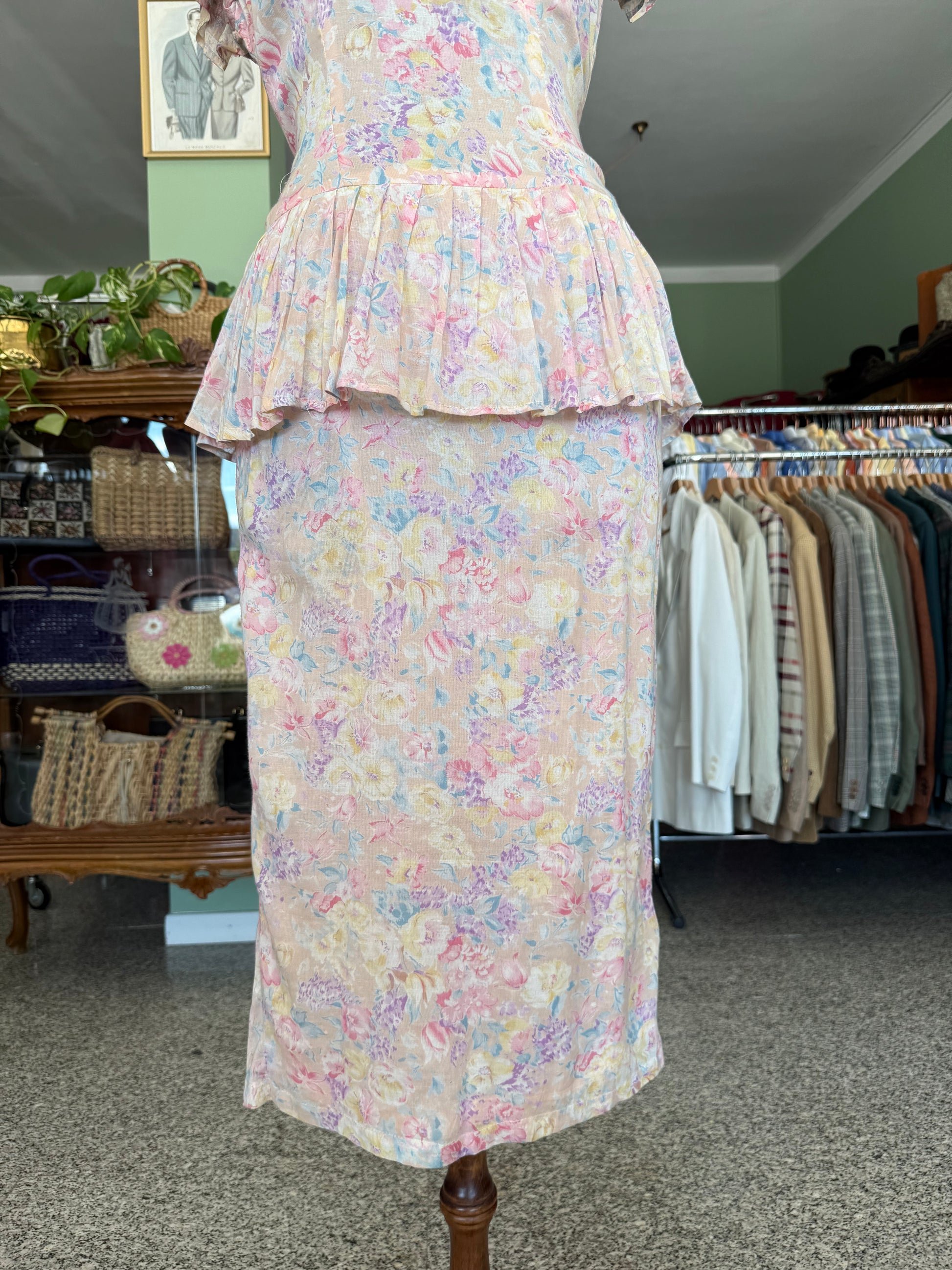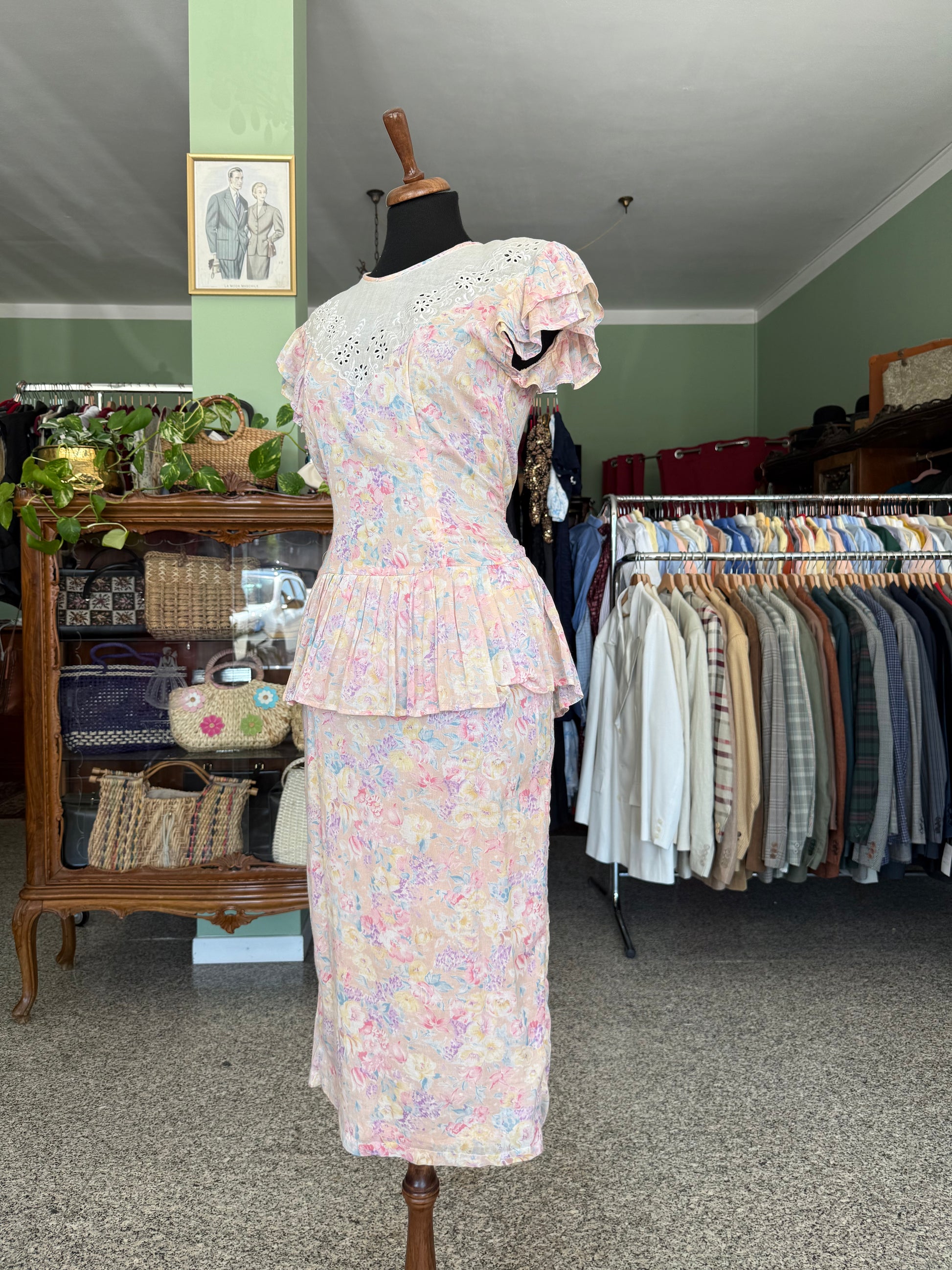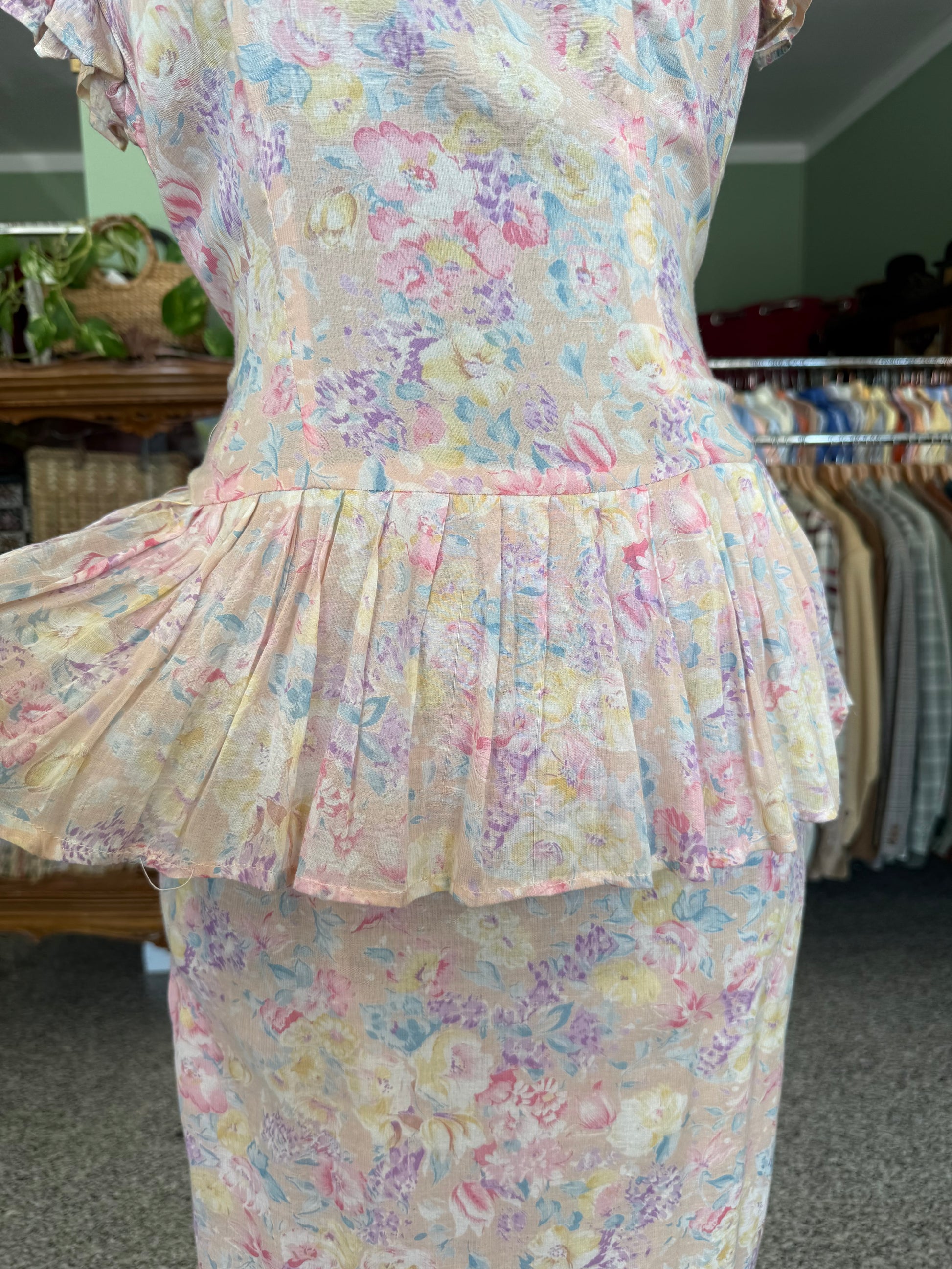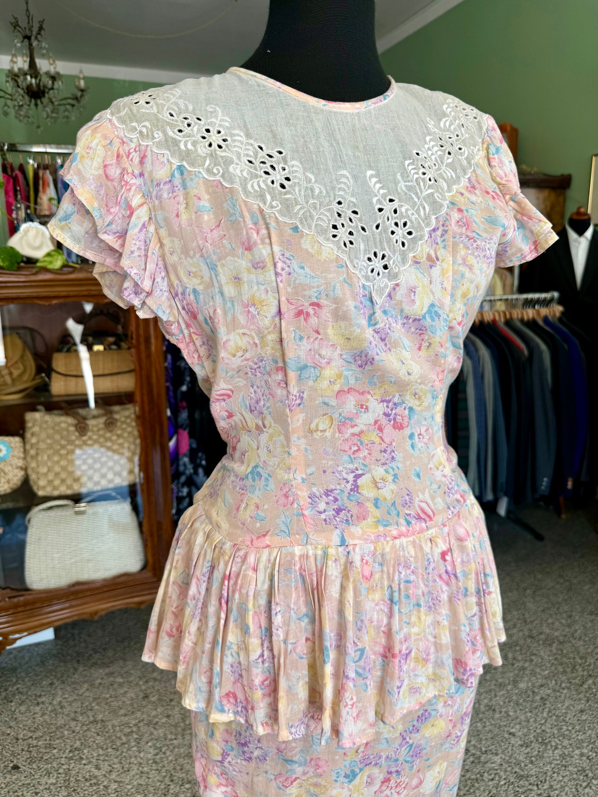 Quest’abito anni ‘80 è un trionfo di femminilità e dettagli decorativi. Realizzato in mussola di cotone delicatamente a fantasia floreale dai colori pastello – rosa, lilla, giallo e azzurro – trasmette un’atmosfera delicata e romantica. La parte superiore presenta maniche corte leggermente a sbuffo e una fila di piccoli bottoni sul retro, che aggiungono grazia e raffinatezza. In vita, una cintura dello stesso tessuto si annoda con un fiocco sul retro, sottolineando la silhouette. La gonna è movimentata sul retro da più strati di balze sovrapposte, che donano volume e leggerezza a ogni passo. È un abito che evoca immediatamente immagini di giardini fioriti e momenti conviviali, pensato per occasioni in cui romanticismo e grazia erano protagonisti assoluti.