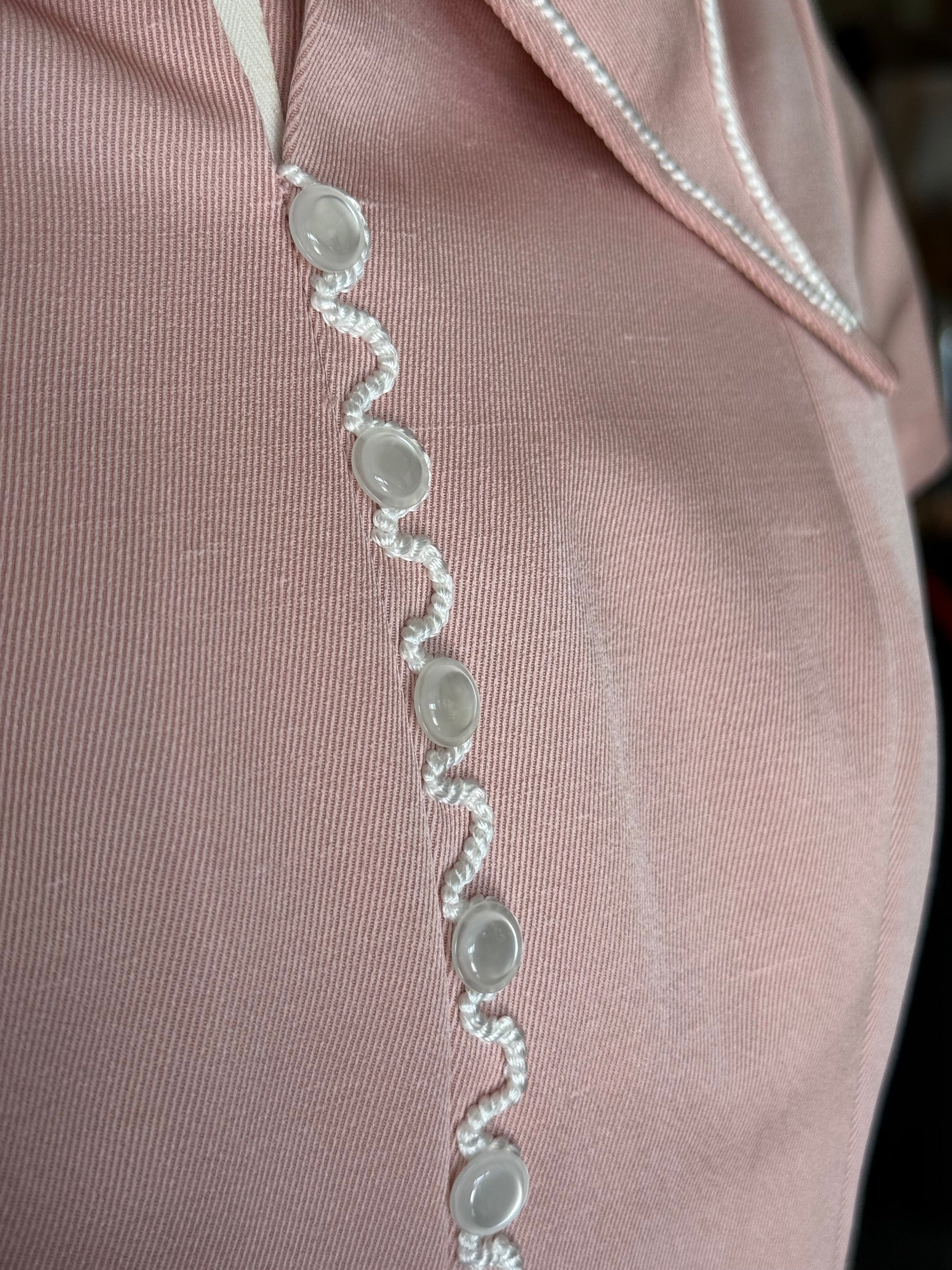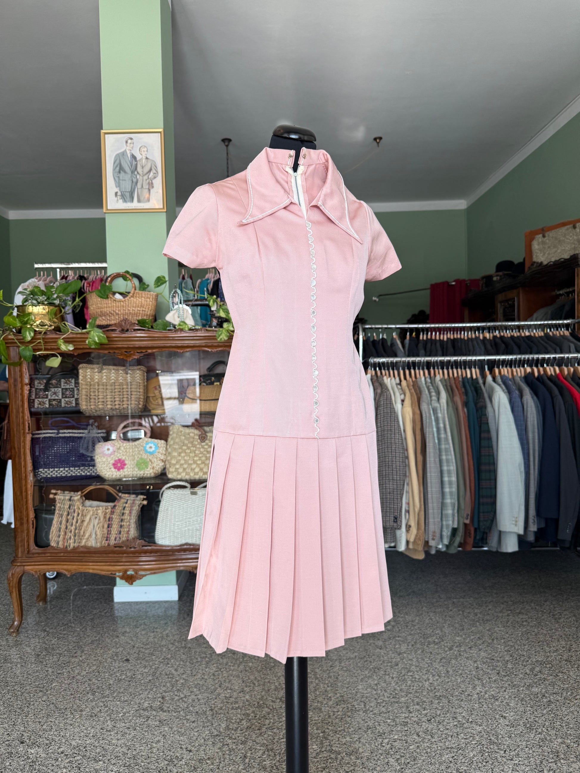 Delizioso abito sartoriale originale degli anni ’70 realizzato in tessuto rosa pastello dal taglio pulito e raffinato. Il punto vita scende leggermente sui fianchi, aprendo la gonna in morbide pieghe regolari che donano movimento e leggerezza. La chiusura frontale è arricchita da un elegante dettaglio di bottoncini rivestiti con profilo bianco ricamato a onde, mentre il colletto a punte larghe richiama il gusto retrò delle linee mod e dell’epoca. Lo stile riprende la moda giovanile alla Garçonne.
