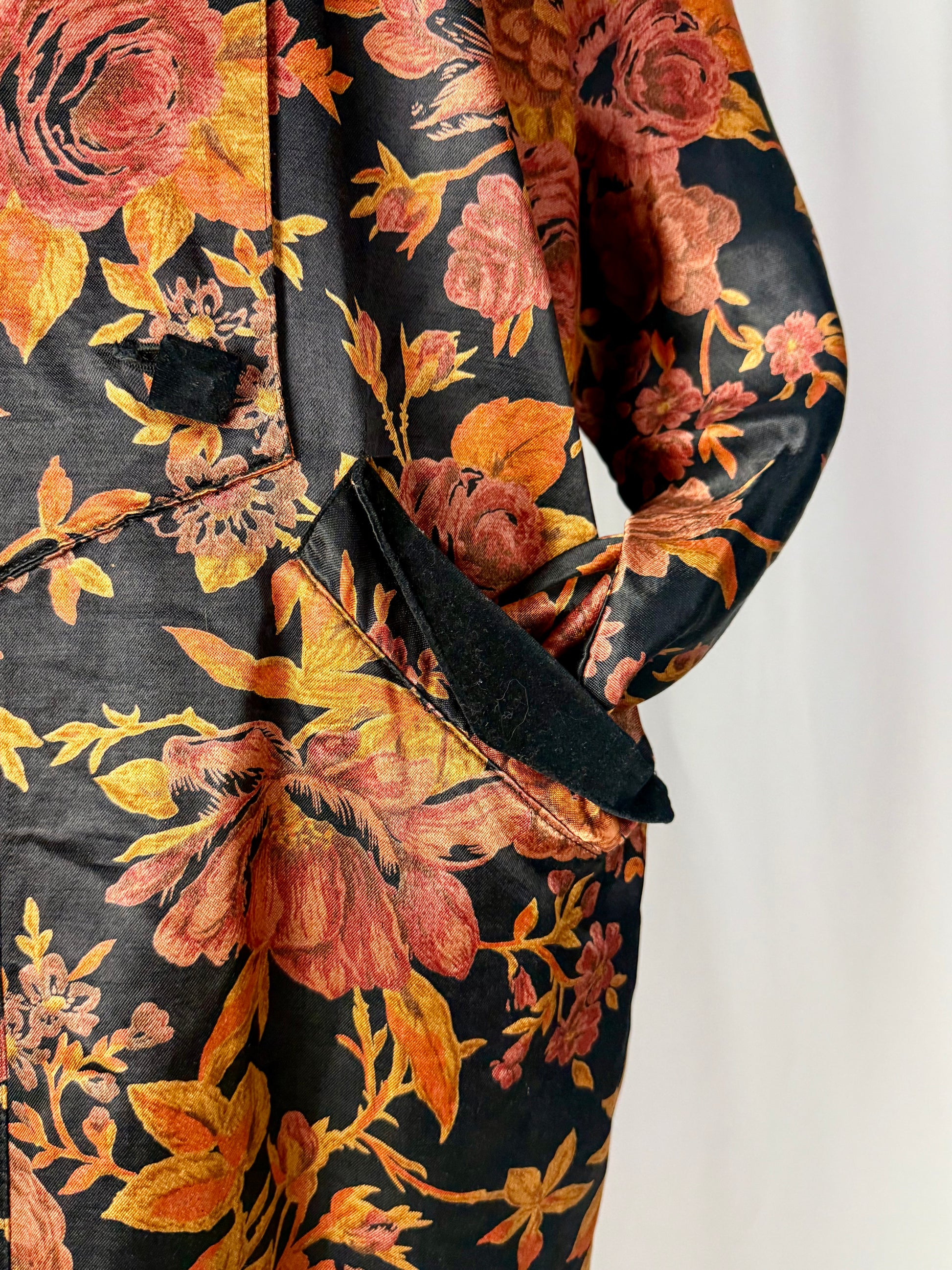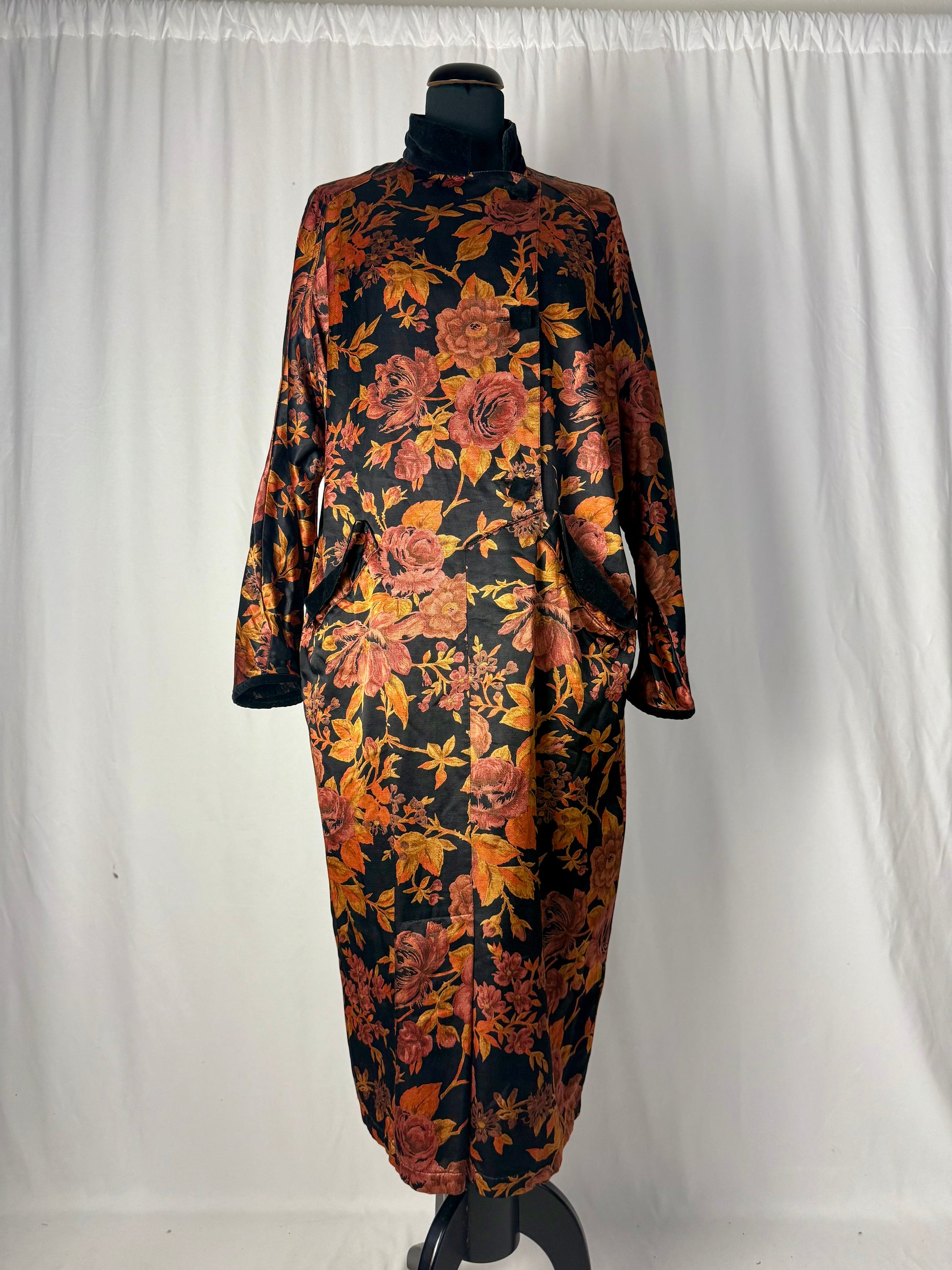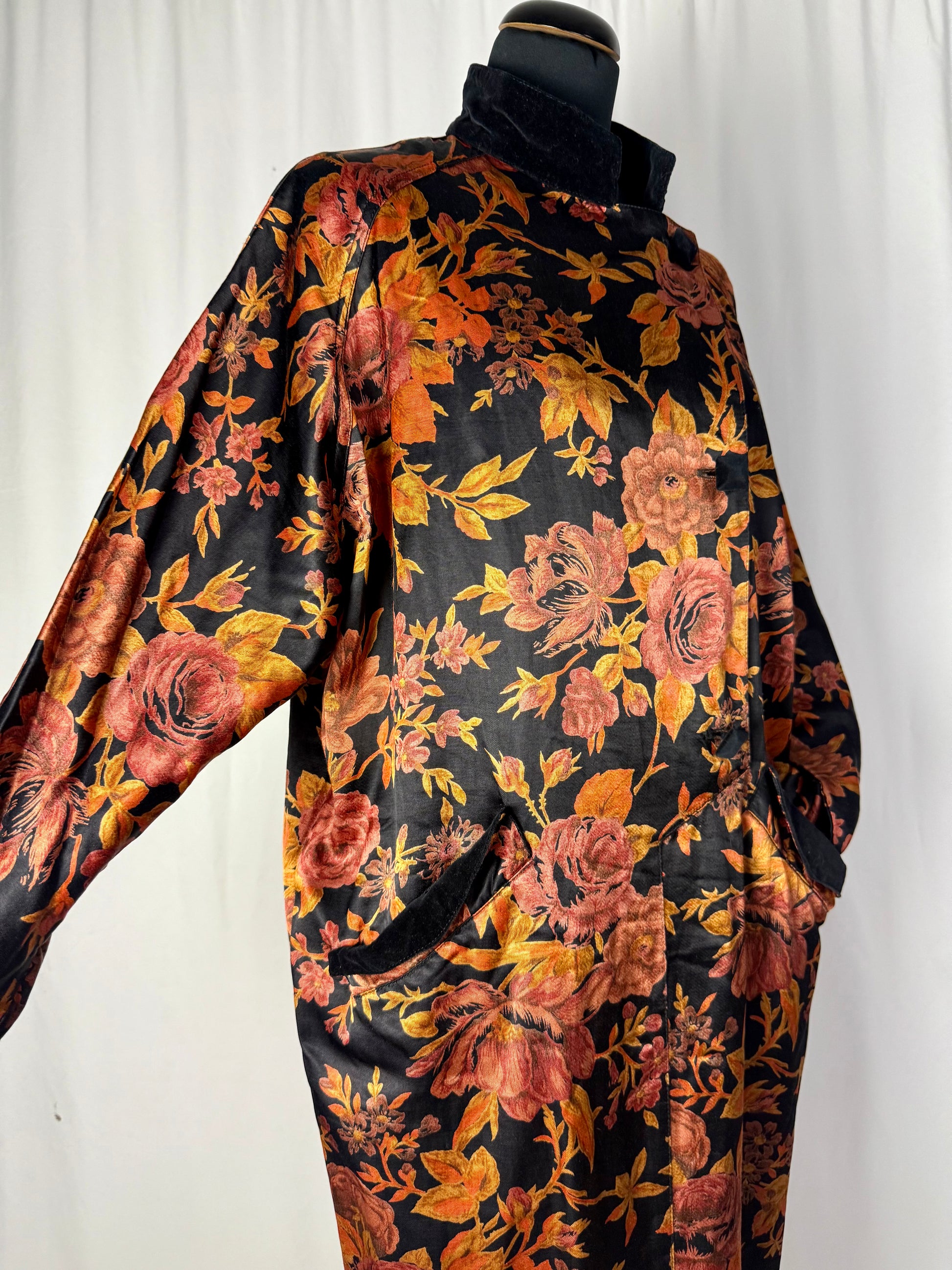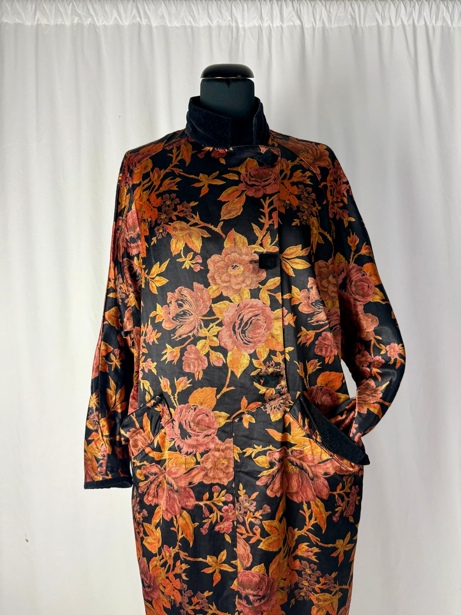 Un capo unico degli anni ’80 ispirato alle linee fluide e all’eleganza sobria degli anni ’20. Realizzato in un raso corposo e luminoso, si distingue per la stampa floreale dai toni caldi che avvolge la figura con un fascino intramontabile. Il taglio dritto e morbido, con tasche laterali e colletto alto in velluto, dona un’allure disinvolta e allo stesso tempo sofisticataz
