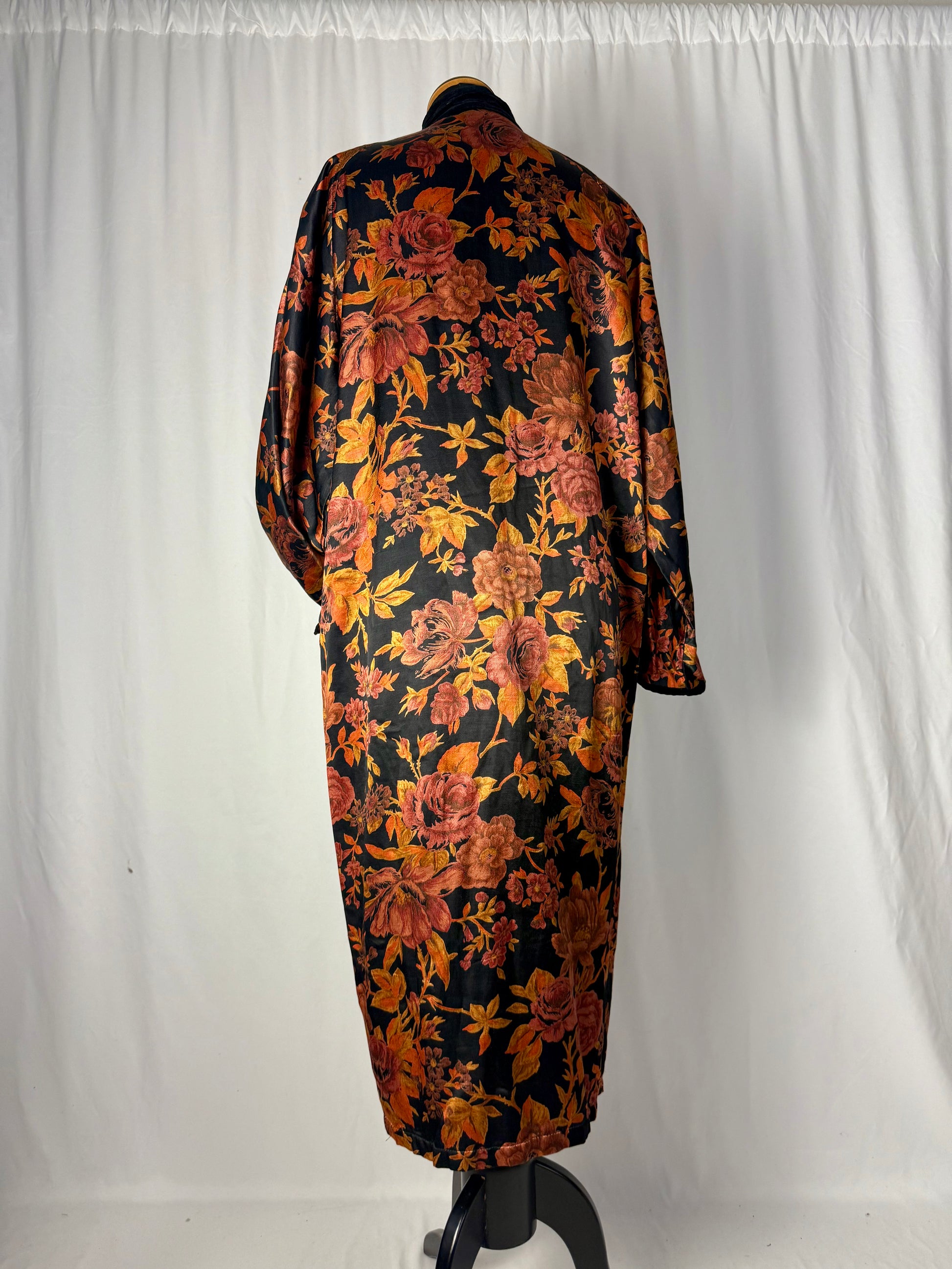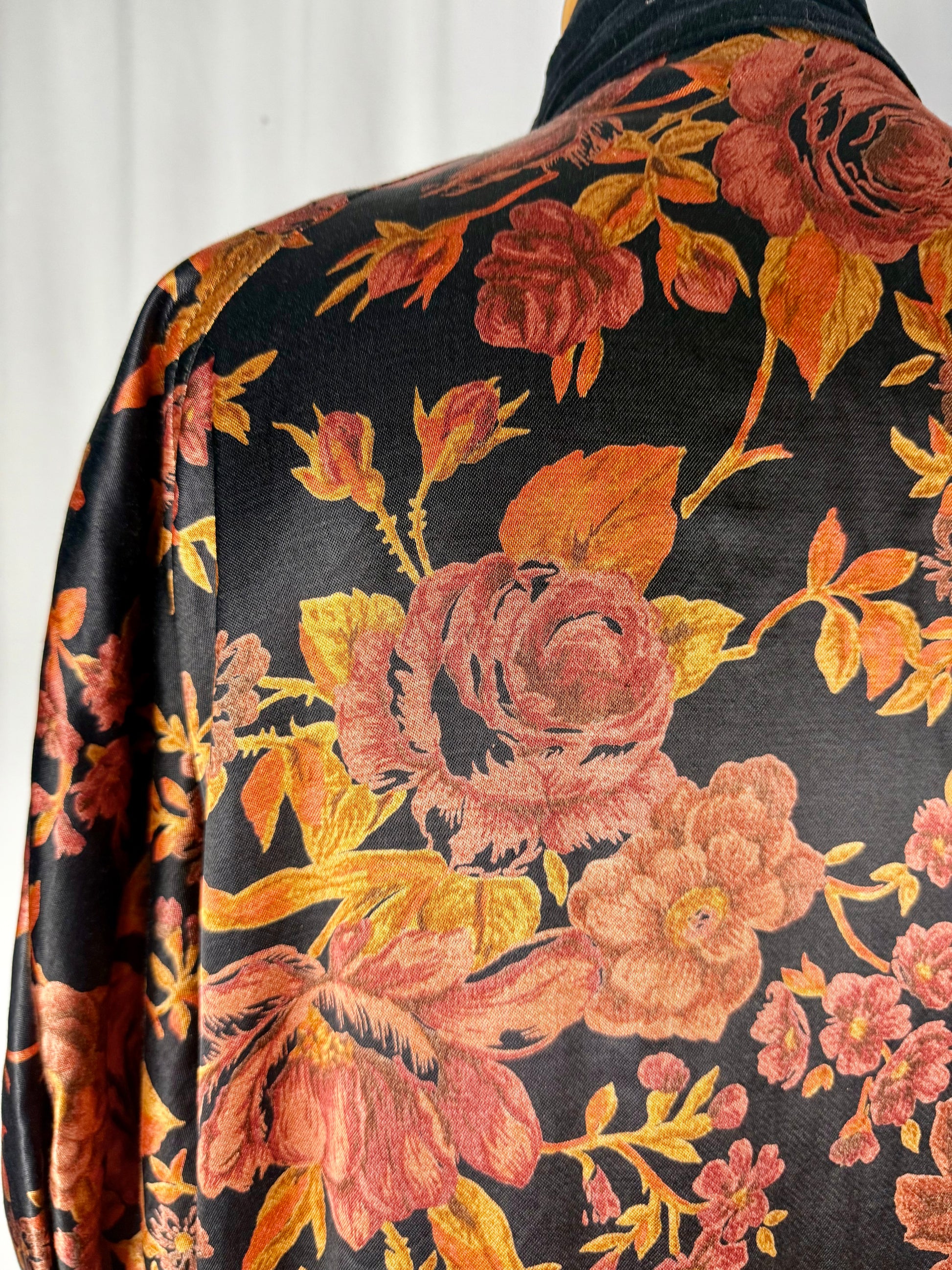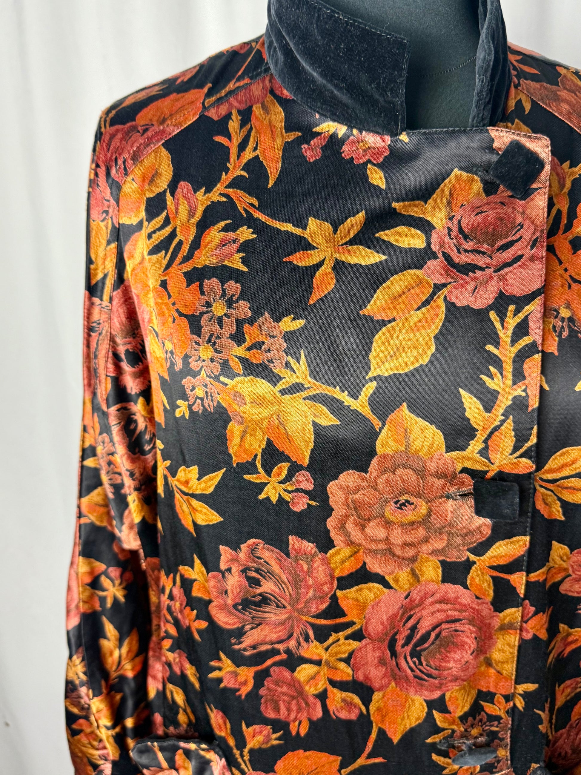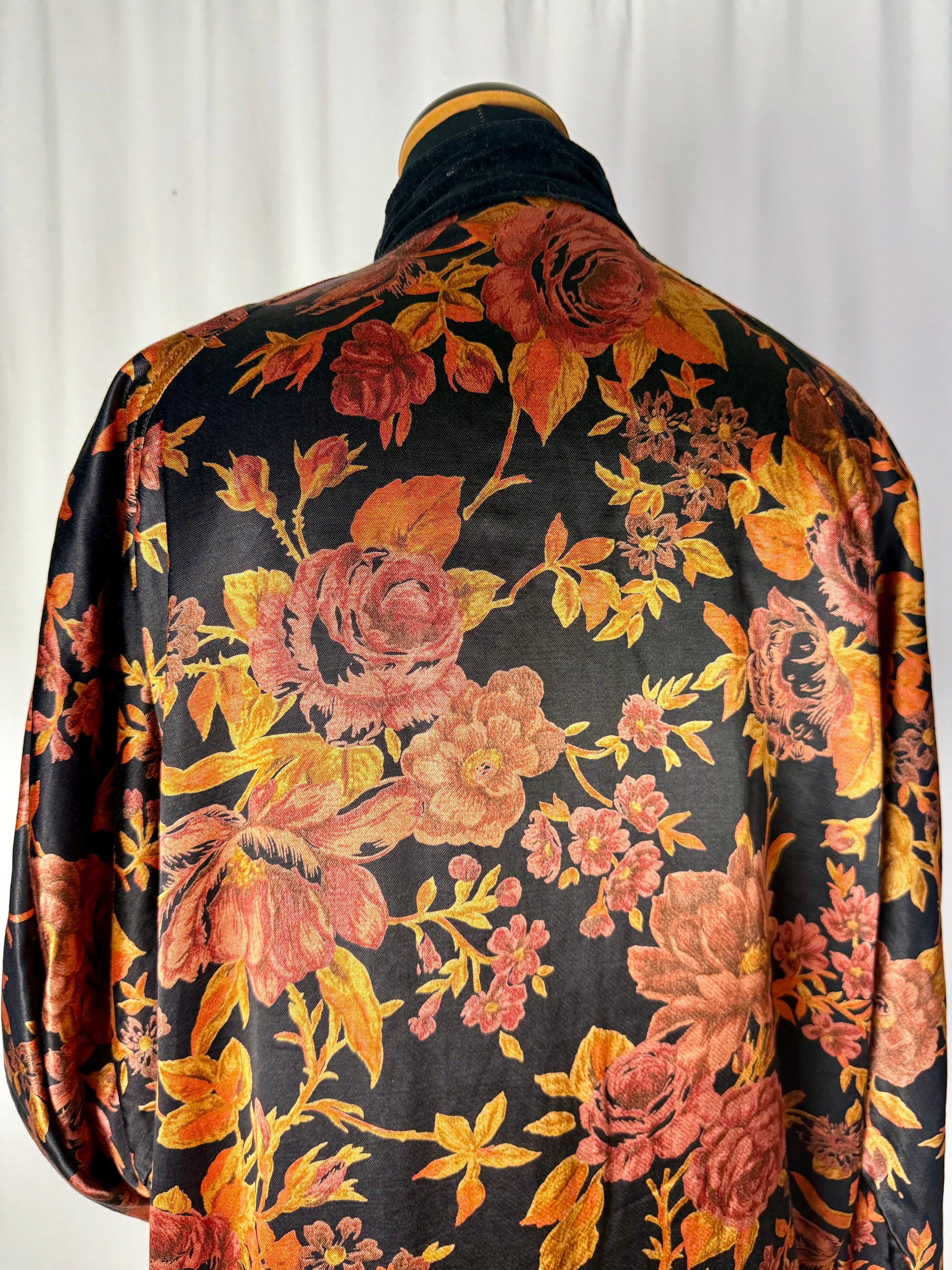 Un capo unico degli anni ’80 ispirato alle linee fluide e all’eleganza sobria degli anni ’20. Realizzato in un raso corposo e luminoso, si distingue per la stampa floreale dai toni caldi che avvolge la figura con un fascino intramontabile. Il taglio dritto e morbido, con tasche laterali e colletto alto in velluto, dona un’allure disinvolta e allo stesso tempo sofisticataz