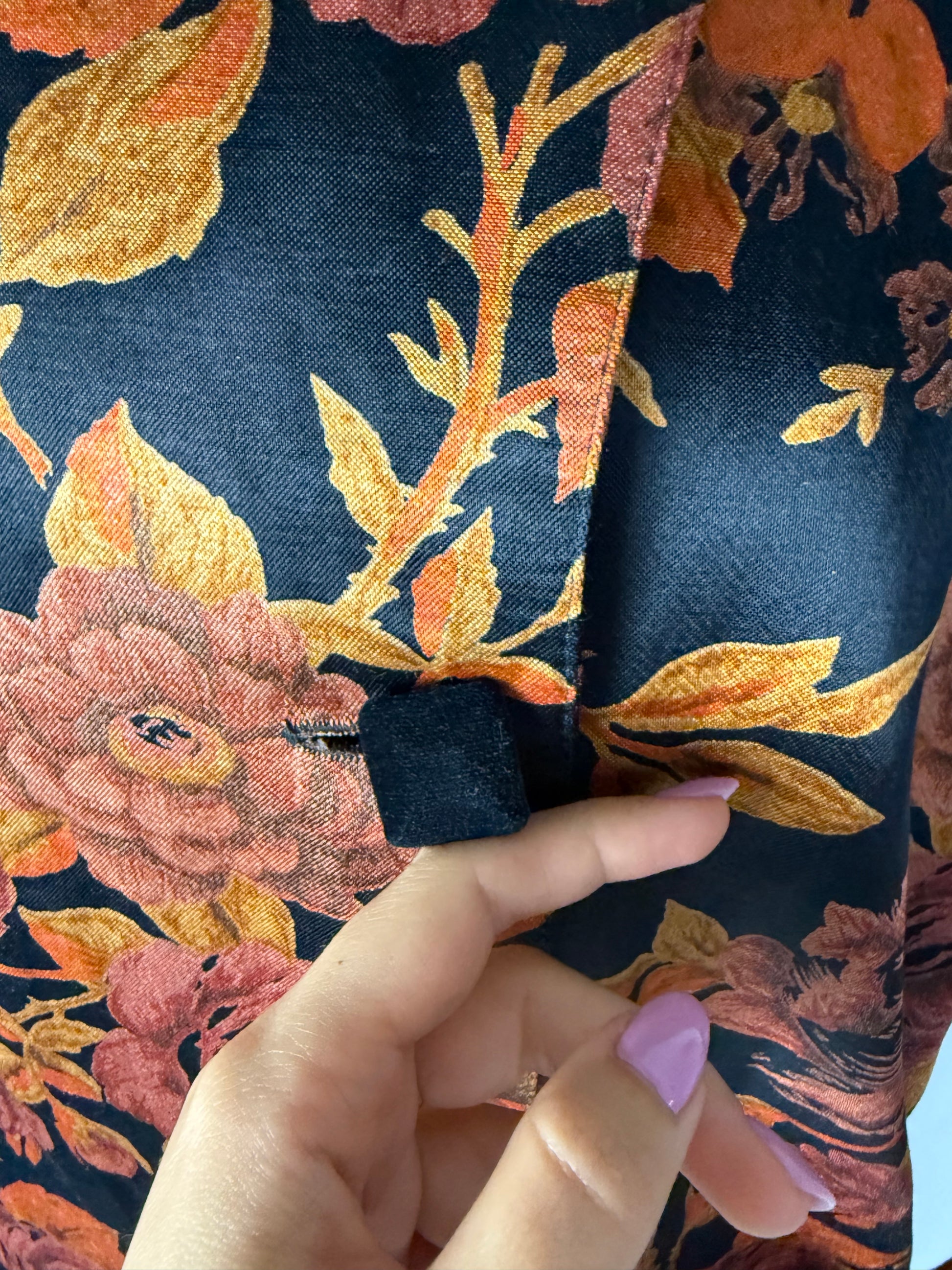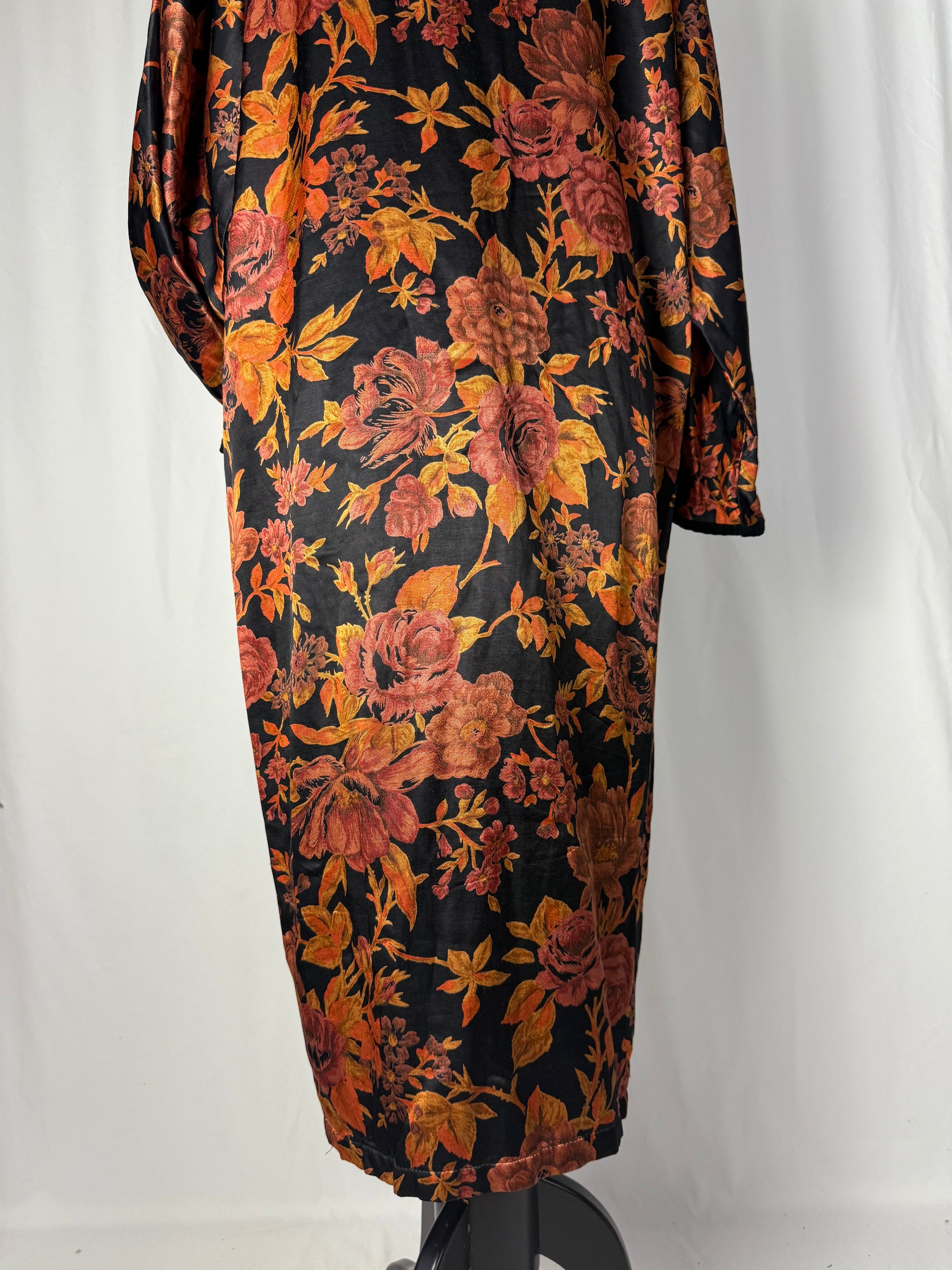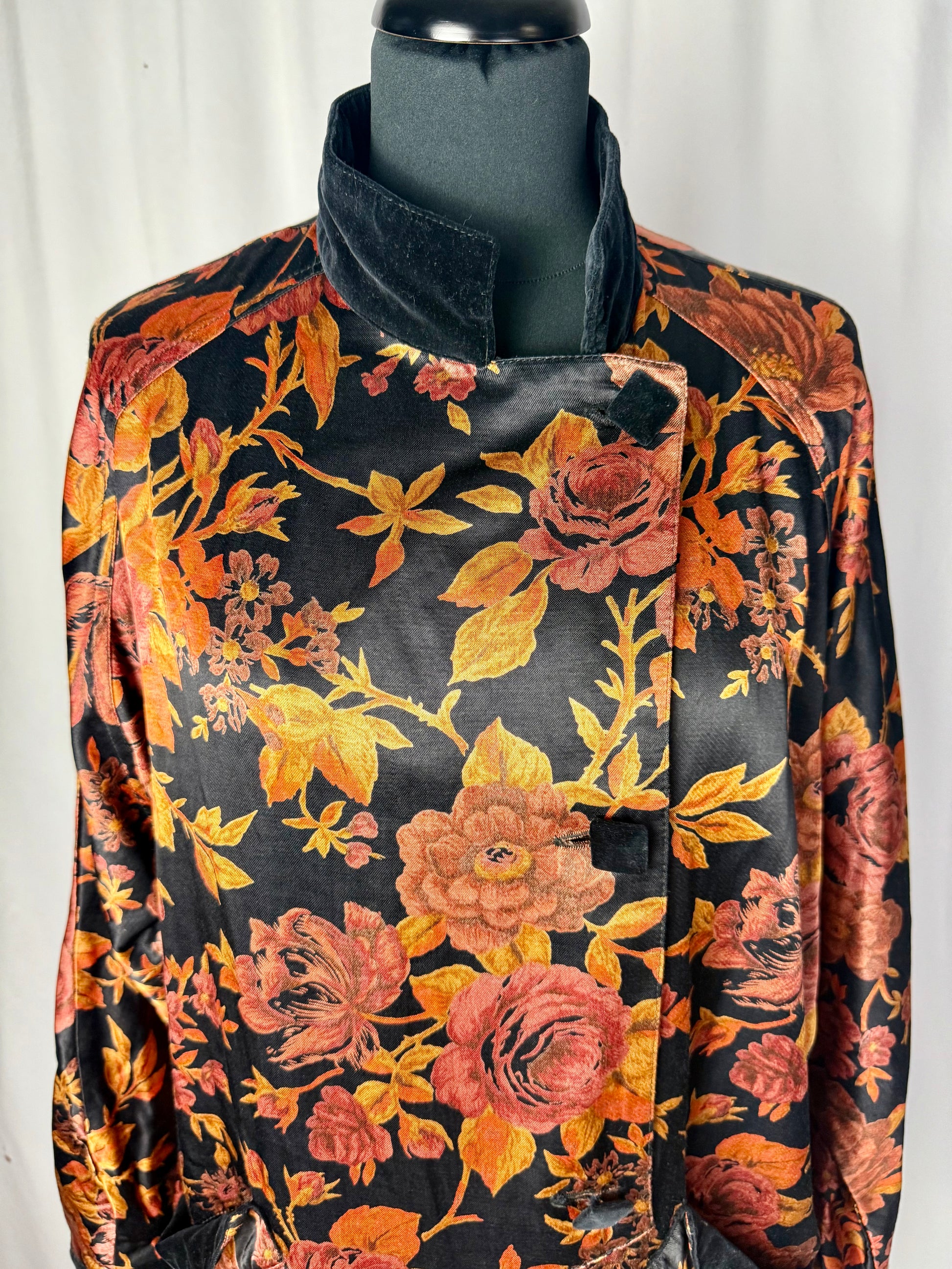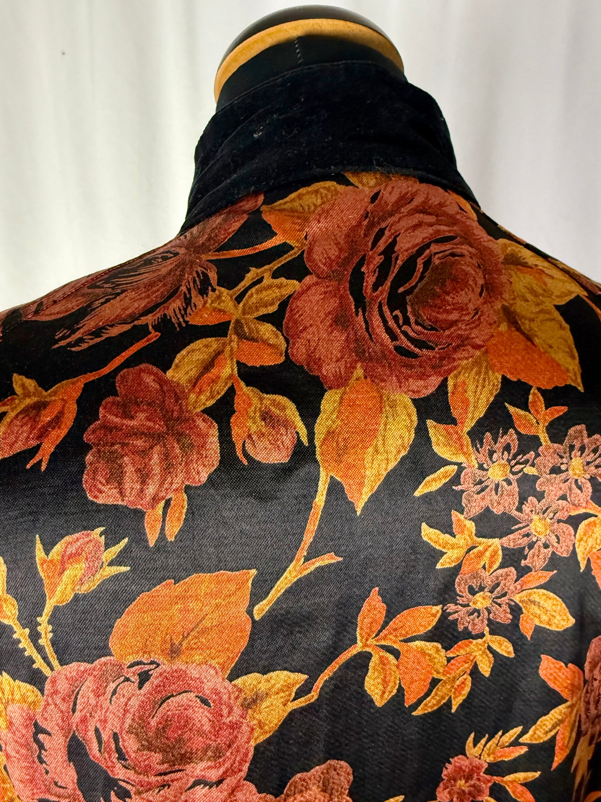 Un capo unico degli anni ’80 ispirato alle linee fluide e all’eleganza sobria degli anni ’20. Realizzato in un raso corposo e luminoso, si distingue per la stampa floreale dai toni caldi che avvolge la figura con un fascino intramontabile. Il taglio dritto e morbido, con tasche laterali e colletto alto in velluto, dona un’allure disinvolta e allo stesso tempo sofisticataz