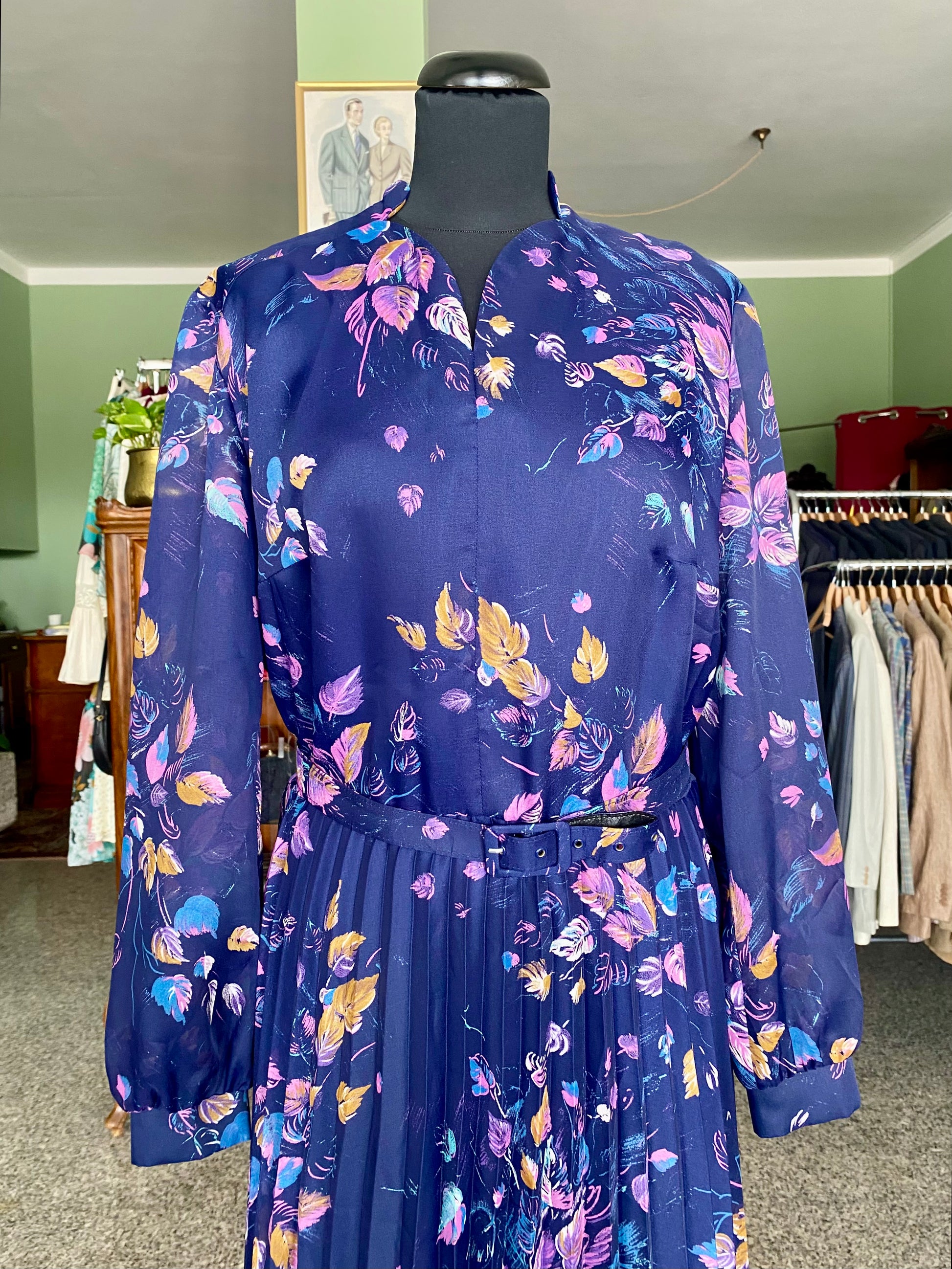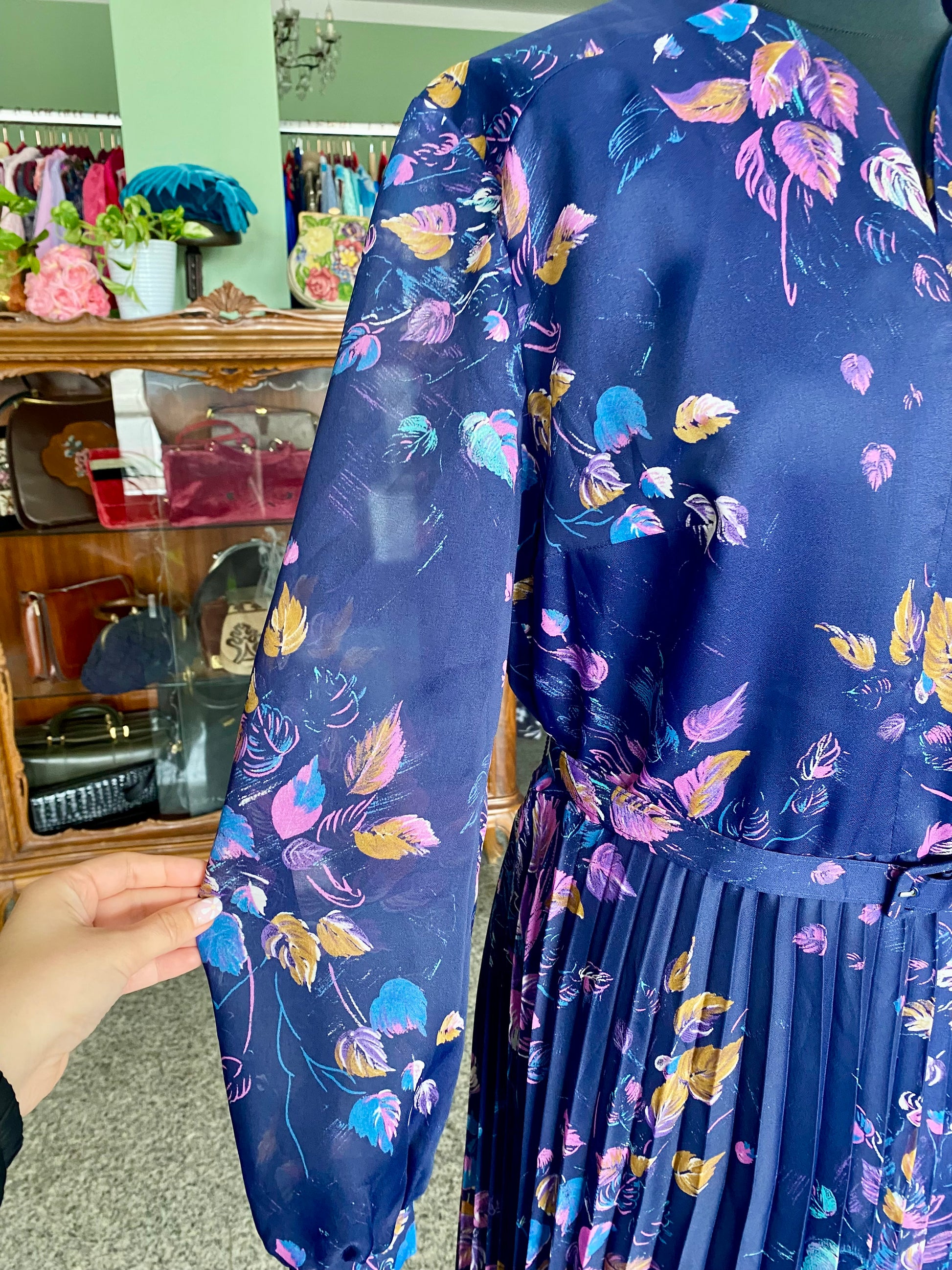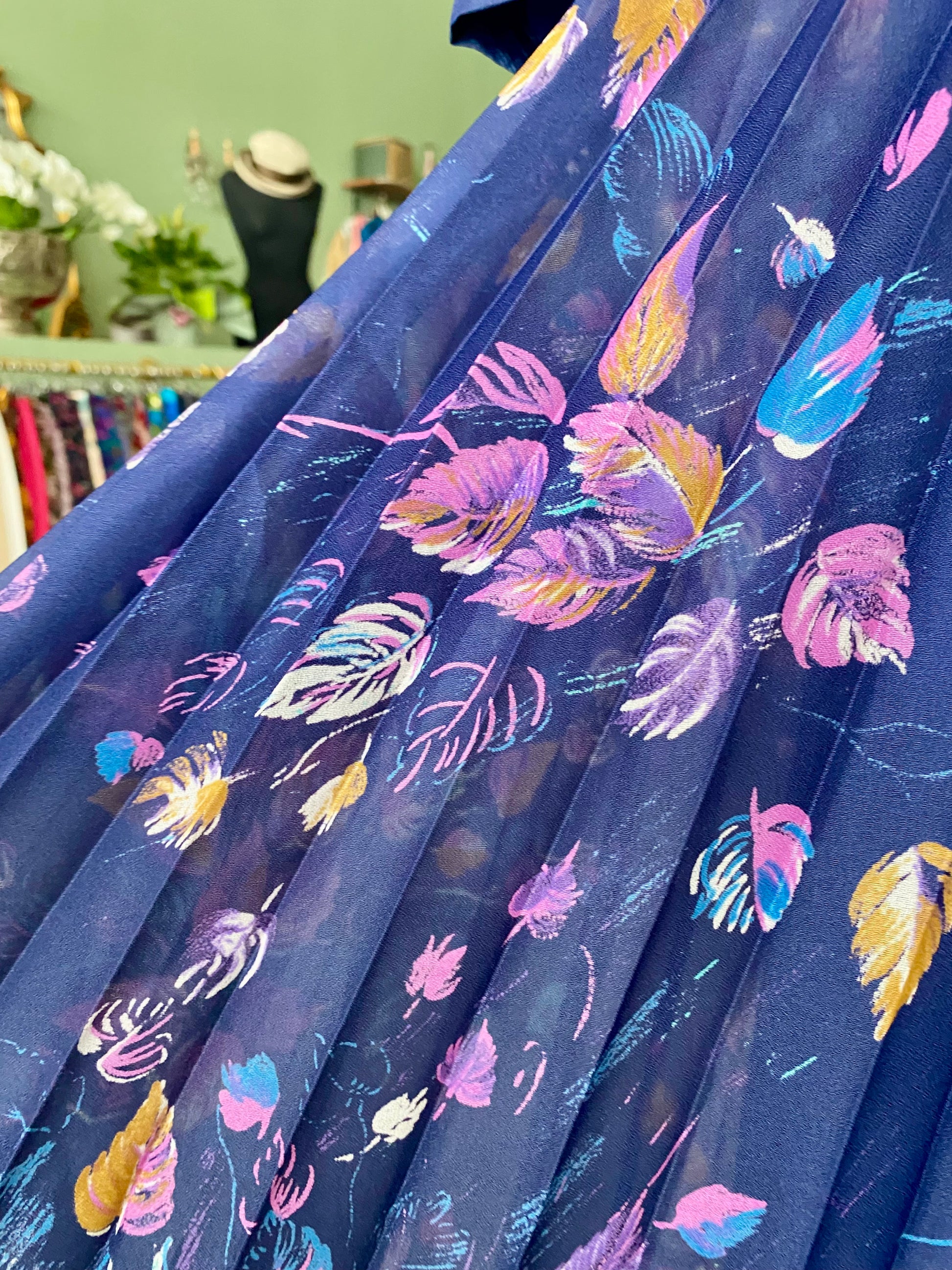 Abito anni ’70 in voile leggero, stampato con un’elegante fantasia di piume nei toni del viola, giallo e turchese. La gonna è interamente plissettata, creando un movimento fluido e raffinato, mentre la vita è definita da una cintura coordinata. Il taglio dritto, le maniche lunghe e semi trasparenti e lo scollo con revers donano equilibrio e charme a questo modello dalla femminilità discreta ma ricercata.