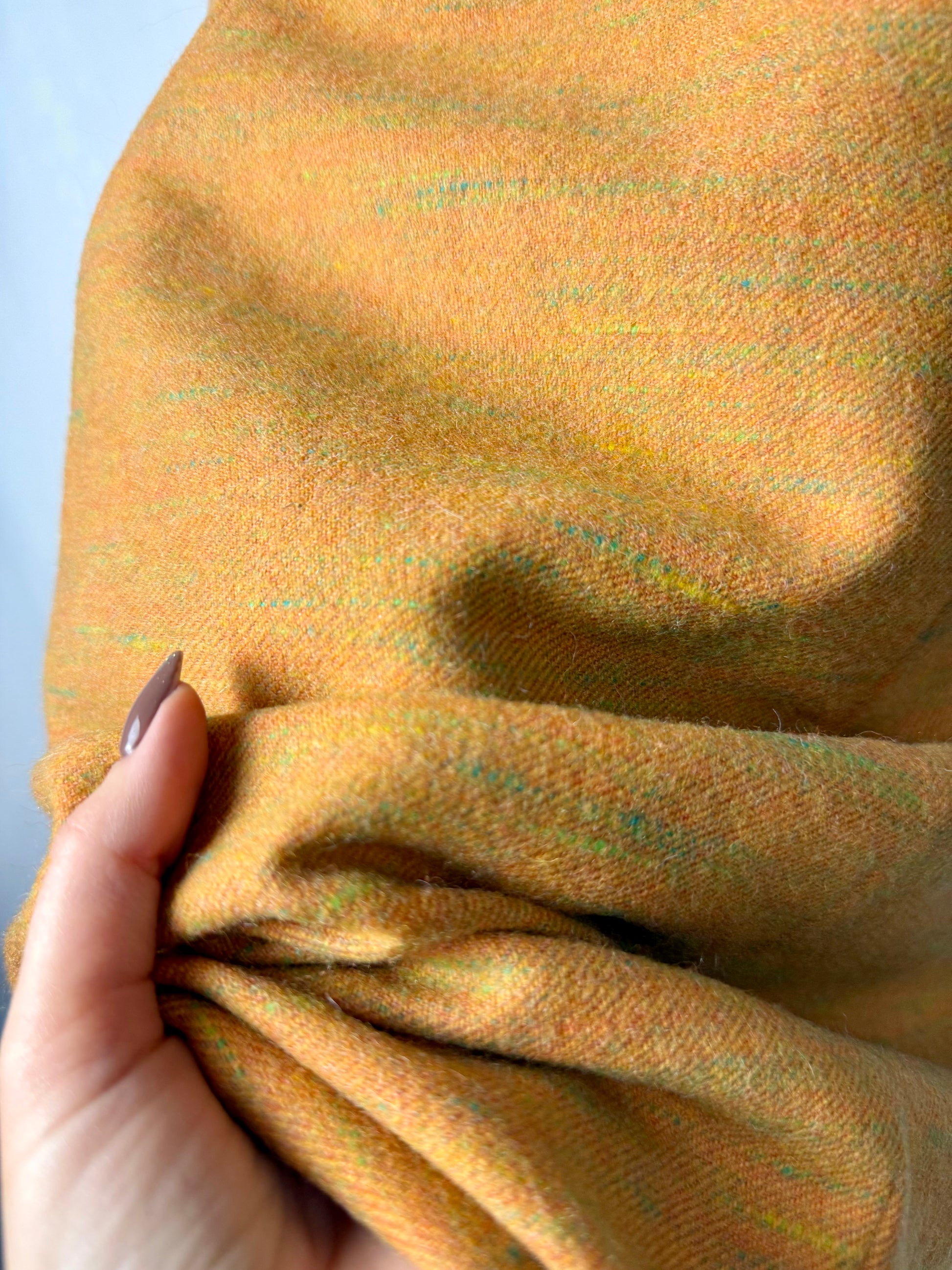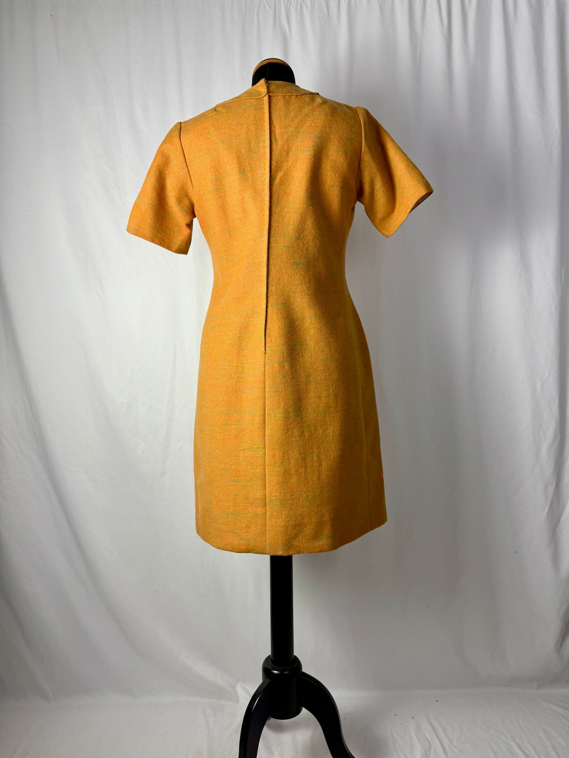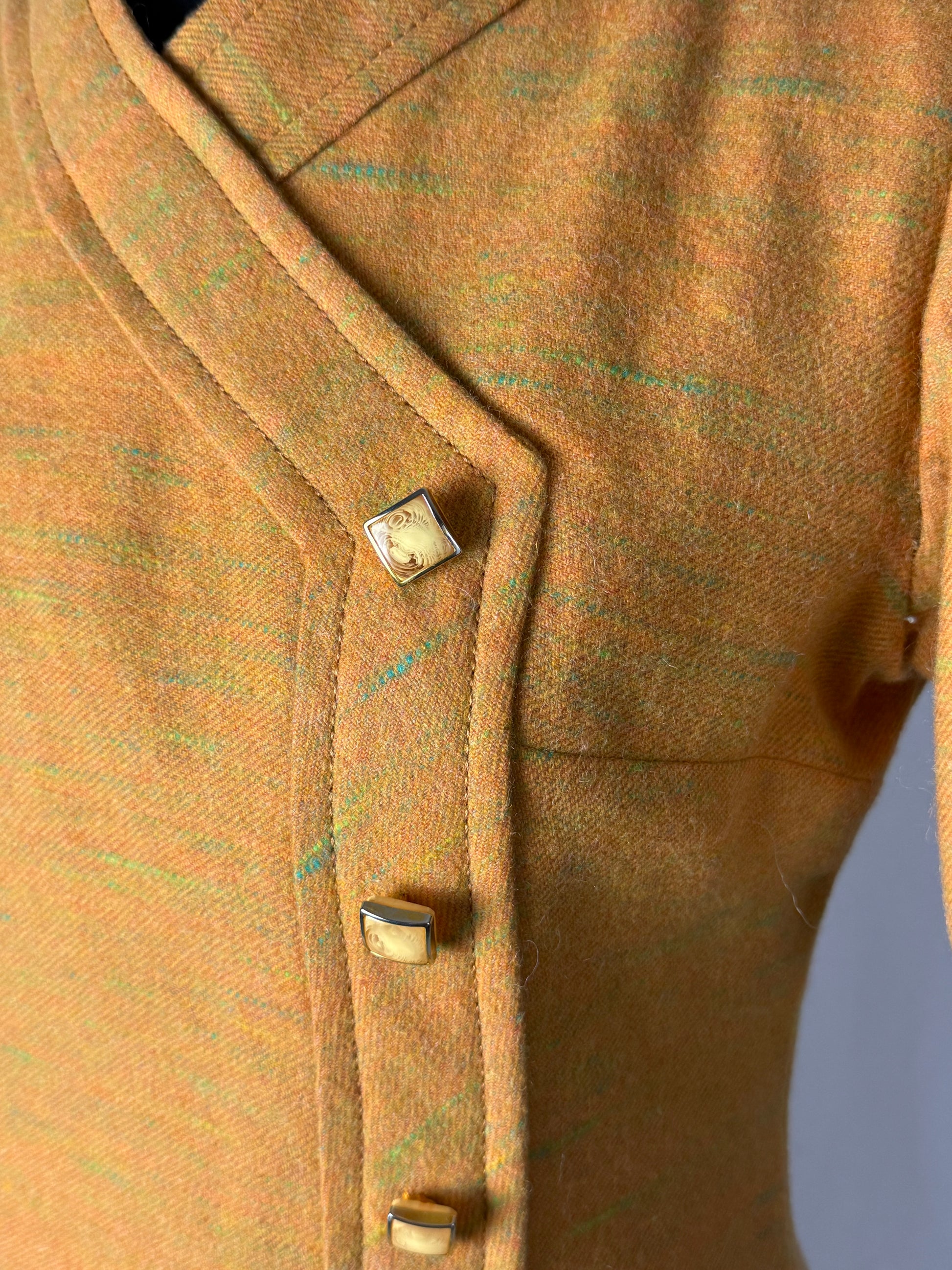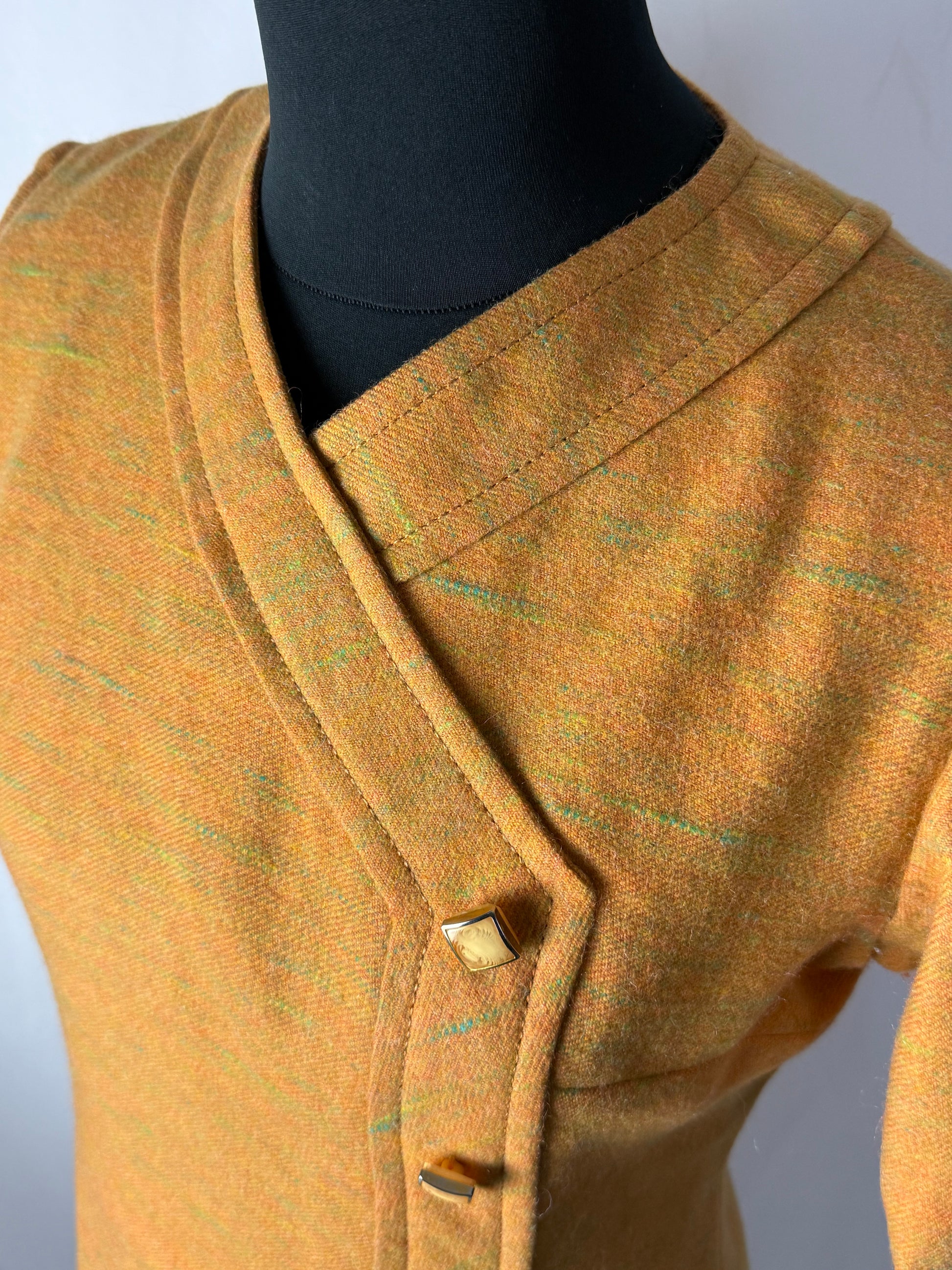 Abito sartoriale anni ‘70 in lana con linea svasata e manica corta, caratterizzato da scollo incrociato rifinito con doppia profilatura e chiusura laterale decorativa con bottoni dorati. Il tessuto, tipico degli anni ’70, presenta una mano compatta e una tinta mélange nei toni del senape con leggere punte di verde. Silhouette pulita e costruzione sartoriale, per un capo essenziale ma ricercato.